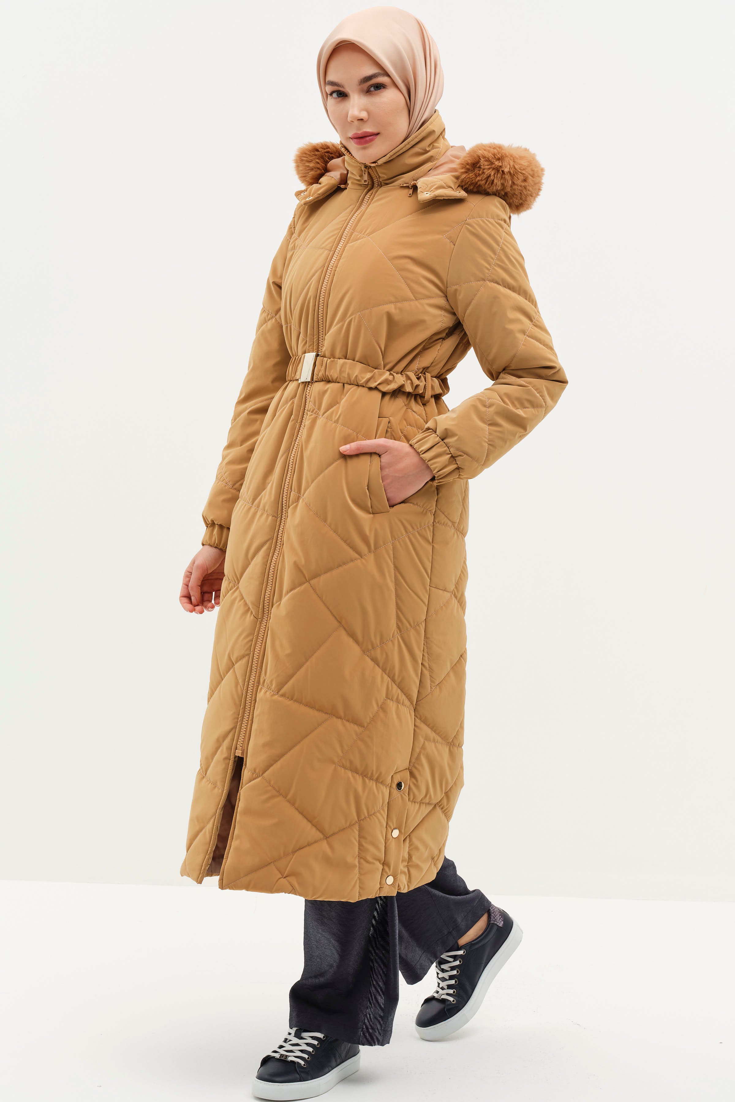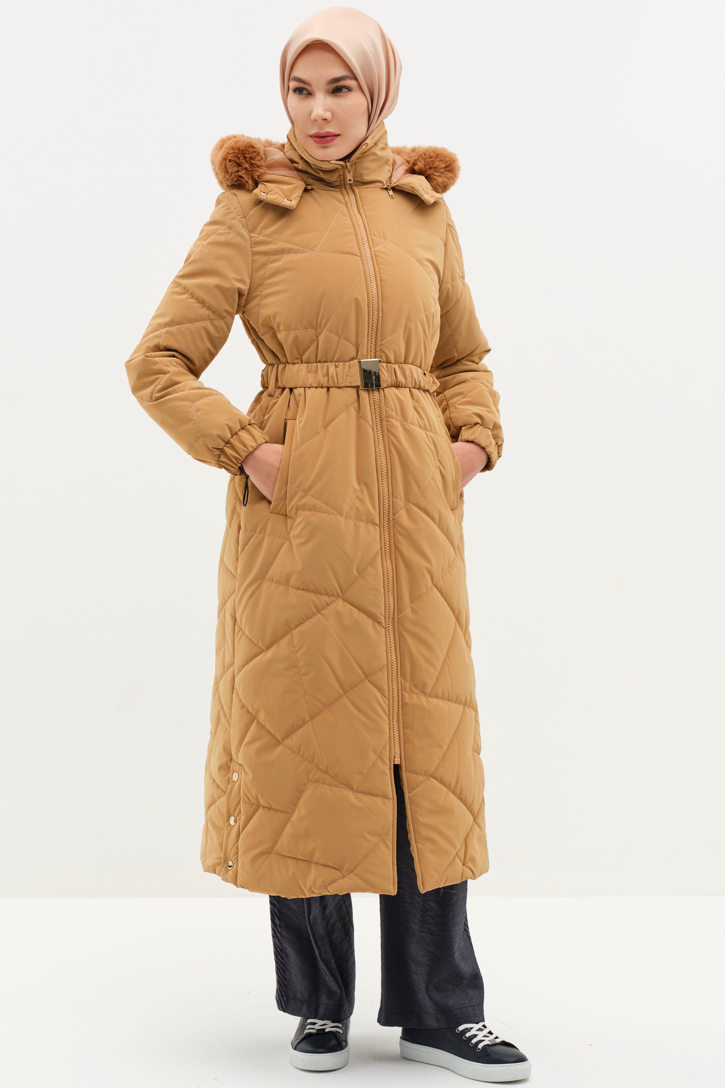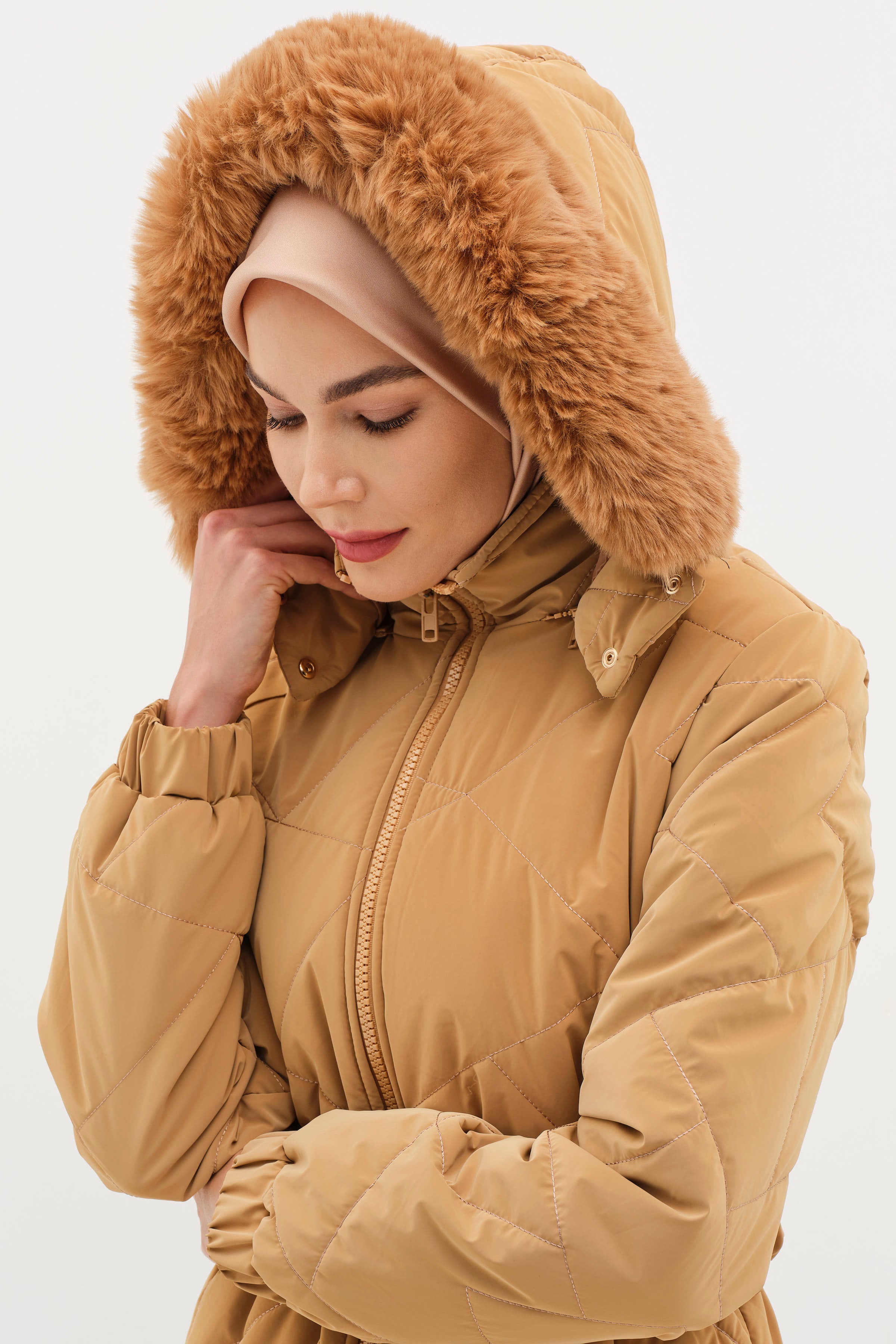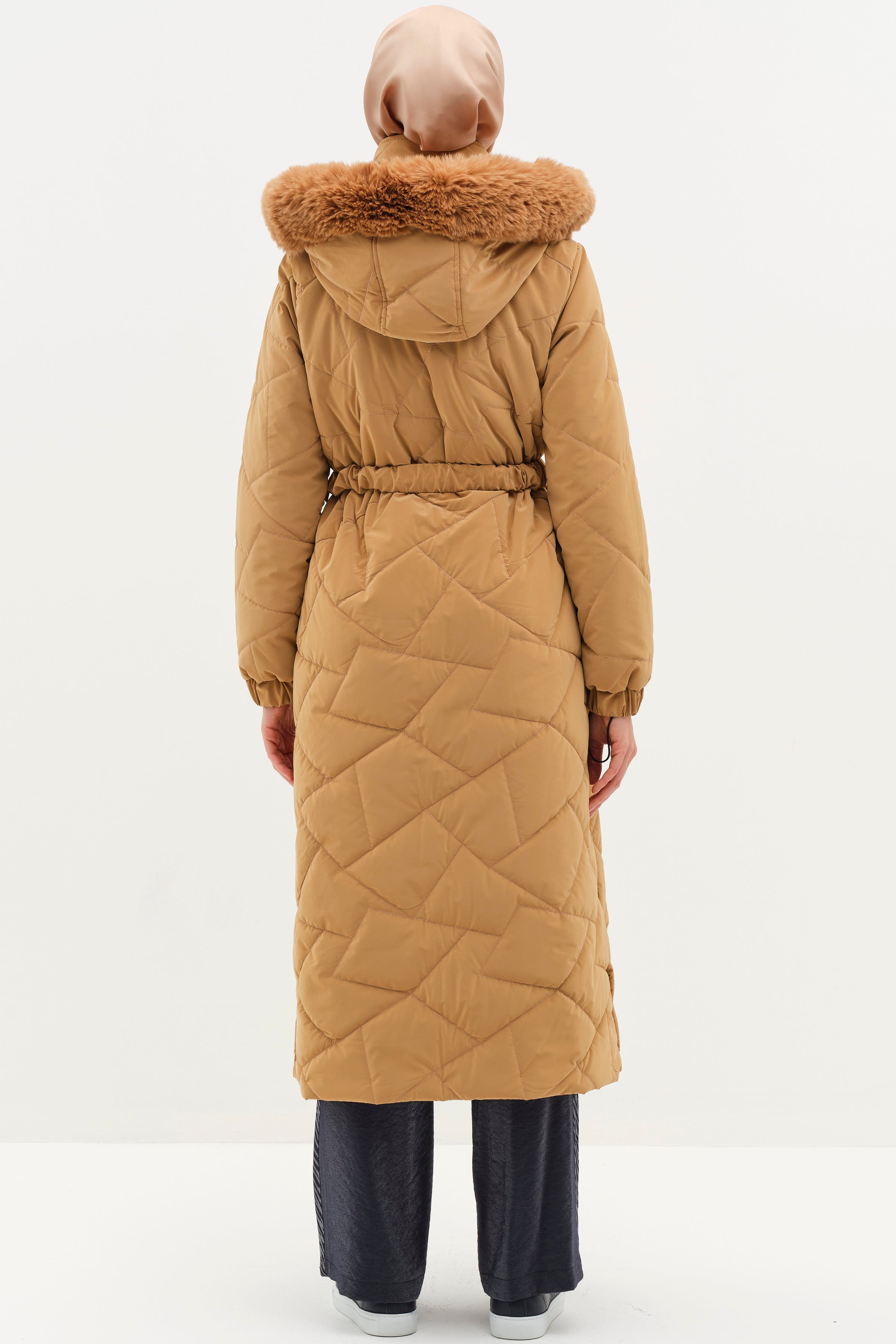 Abrigo acolchado con capucha y detalle de abertura - Camel