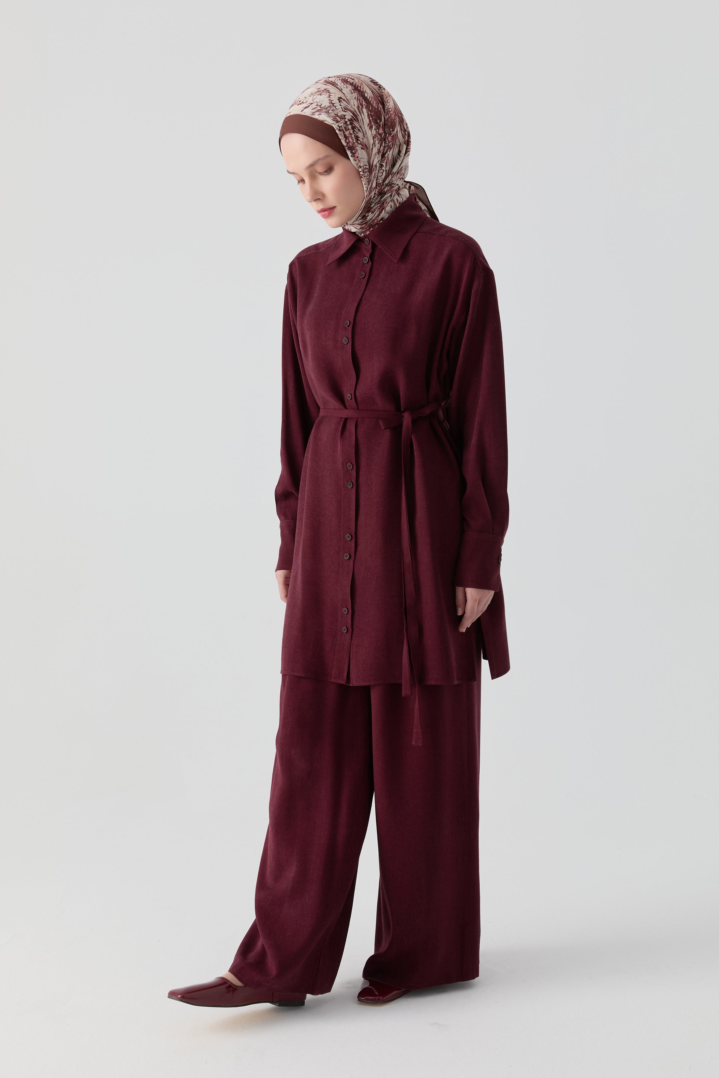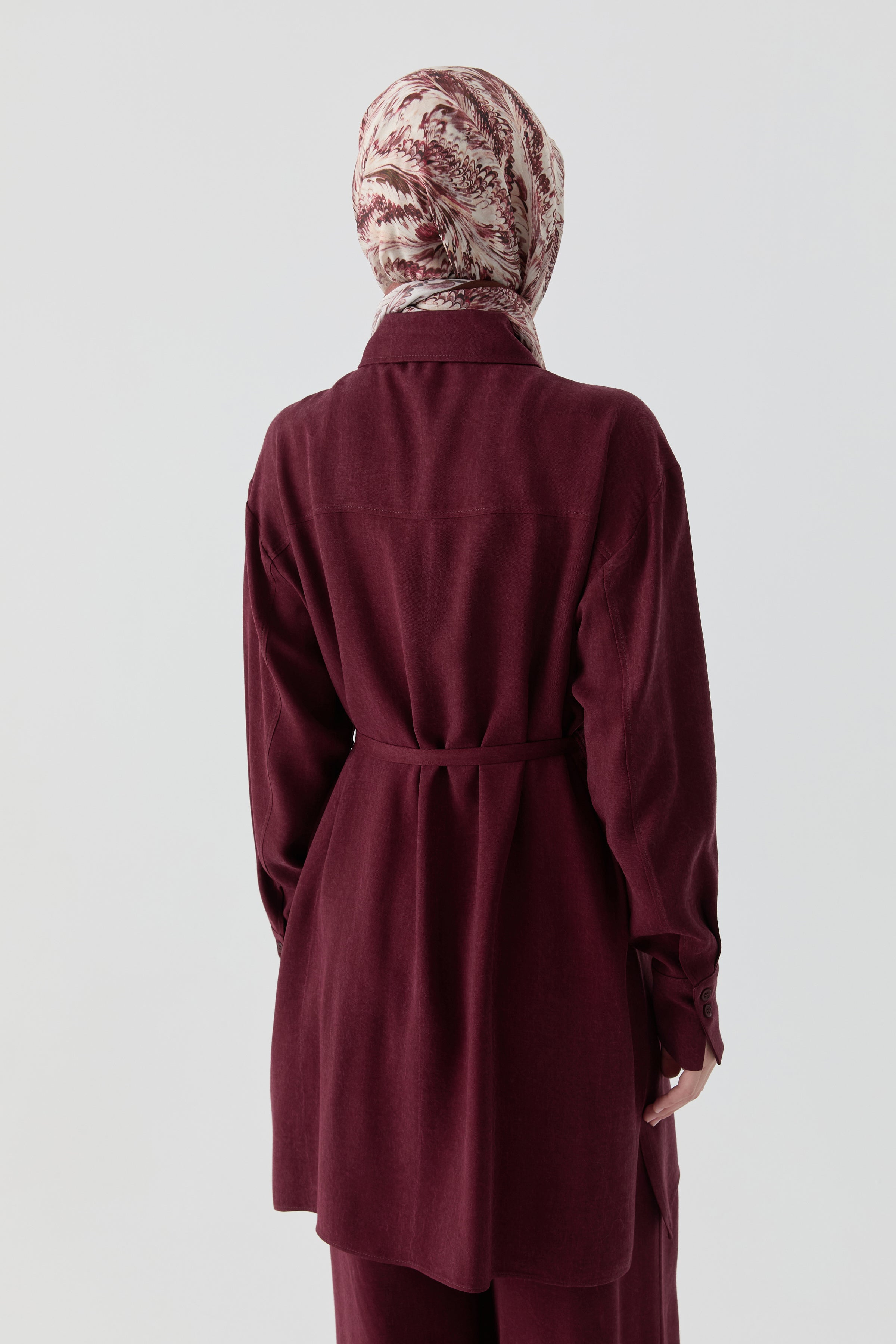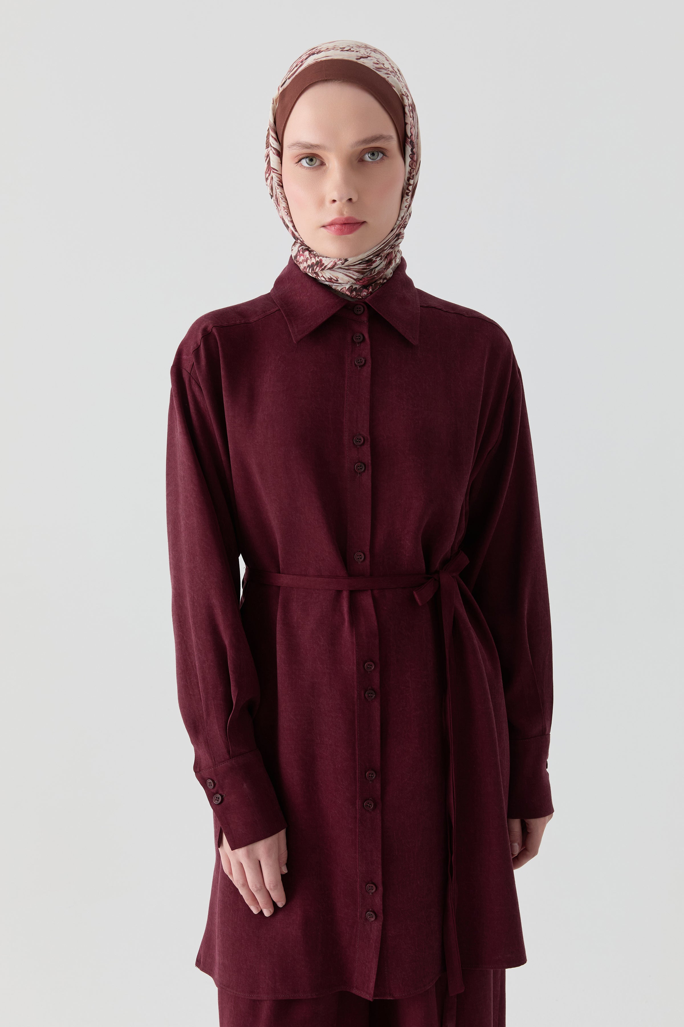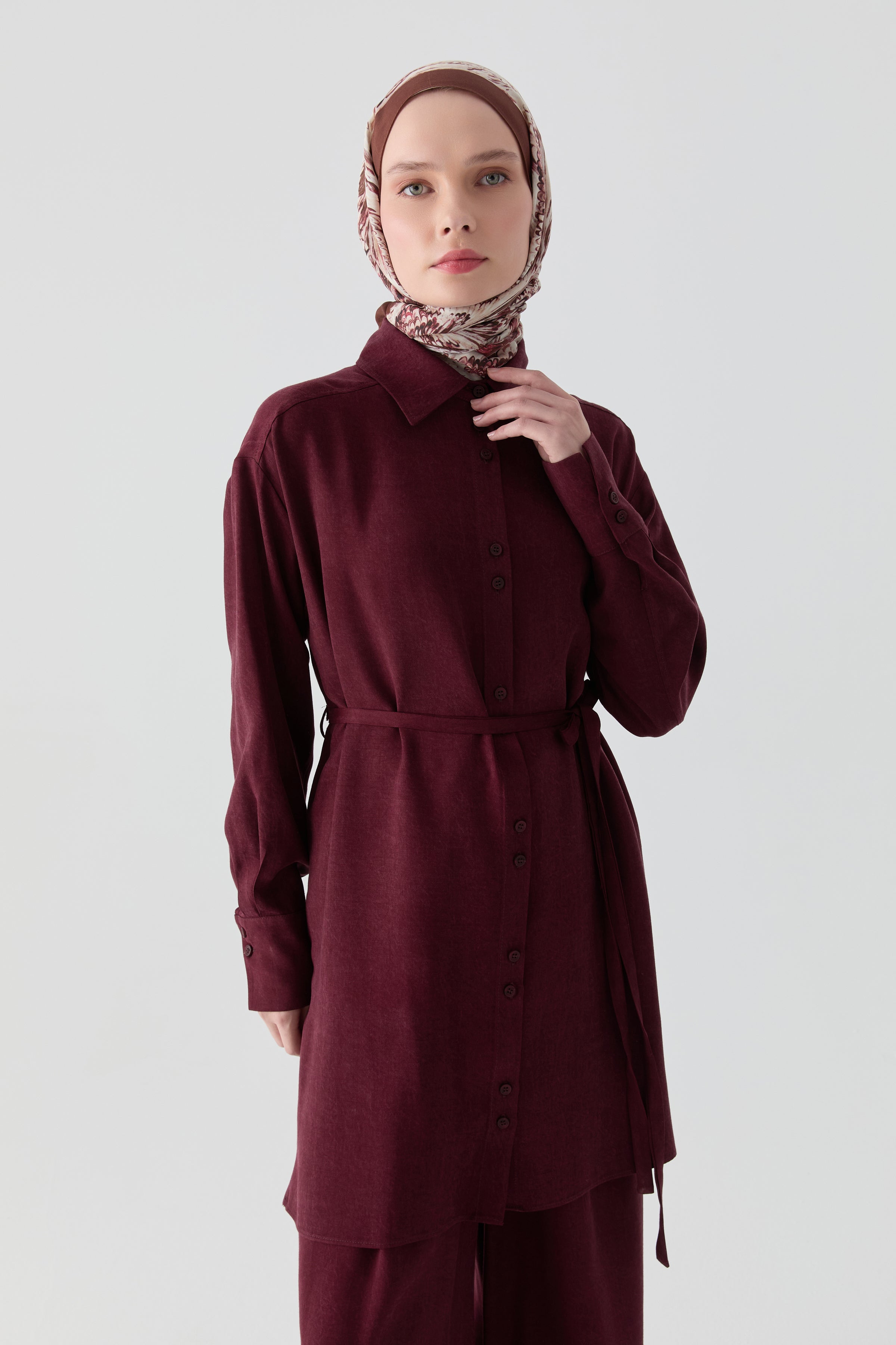 Esta túnica, con su corte en el canesú, se ajusta suavemente a la figura, mientras que un cinturón fino acentúa con elegancia la cintura. La fluidez del tejido crea un movimiento natural con cada paso, y sus líneas sencillas ofrecen una elegancia moderna.