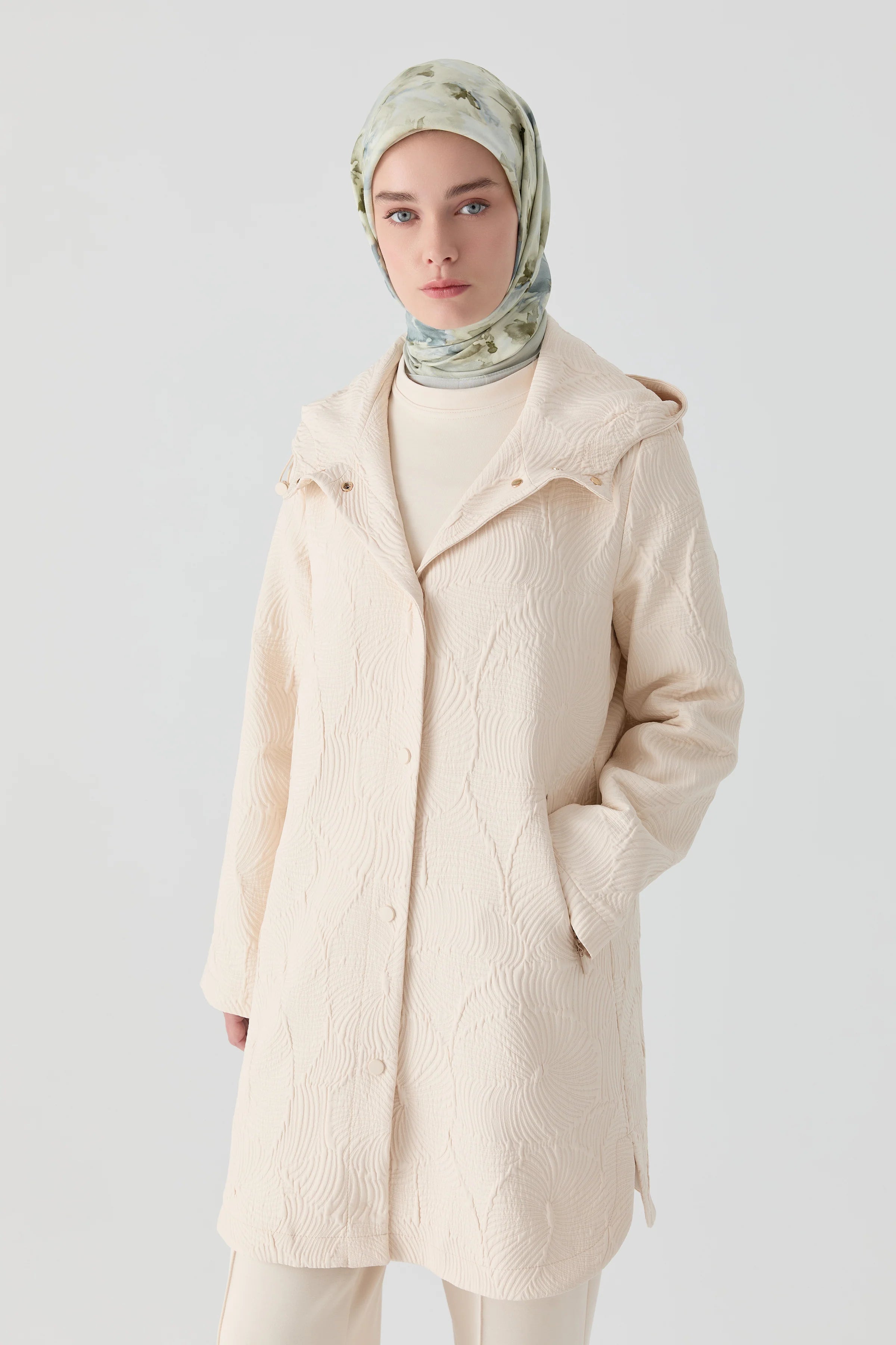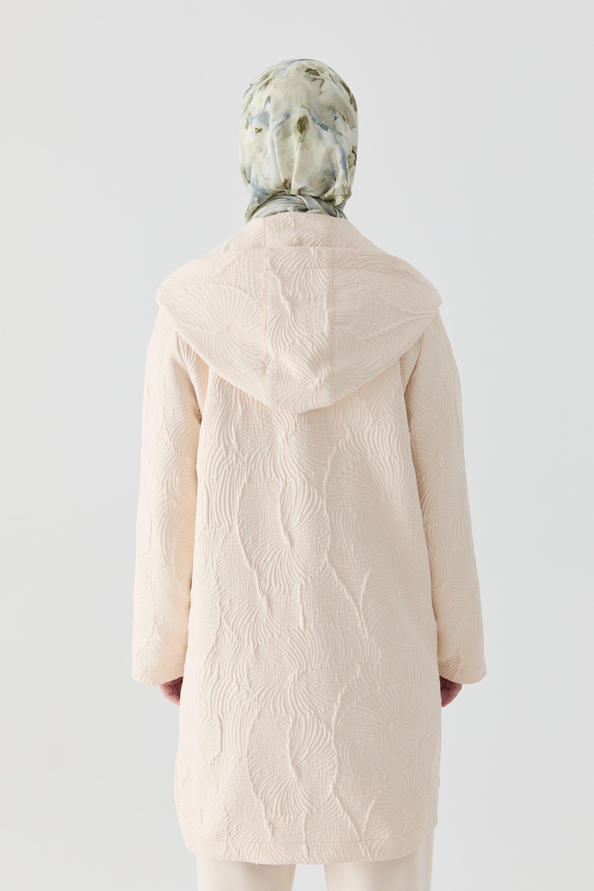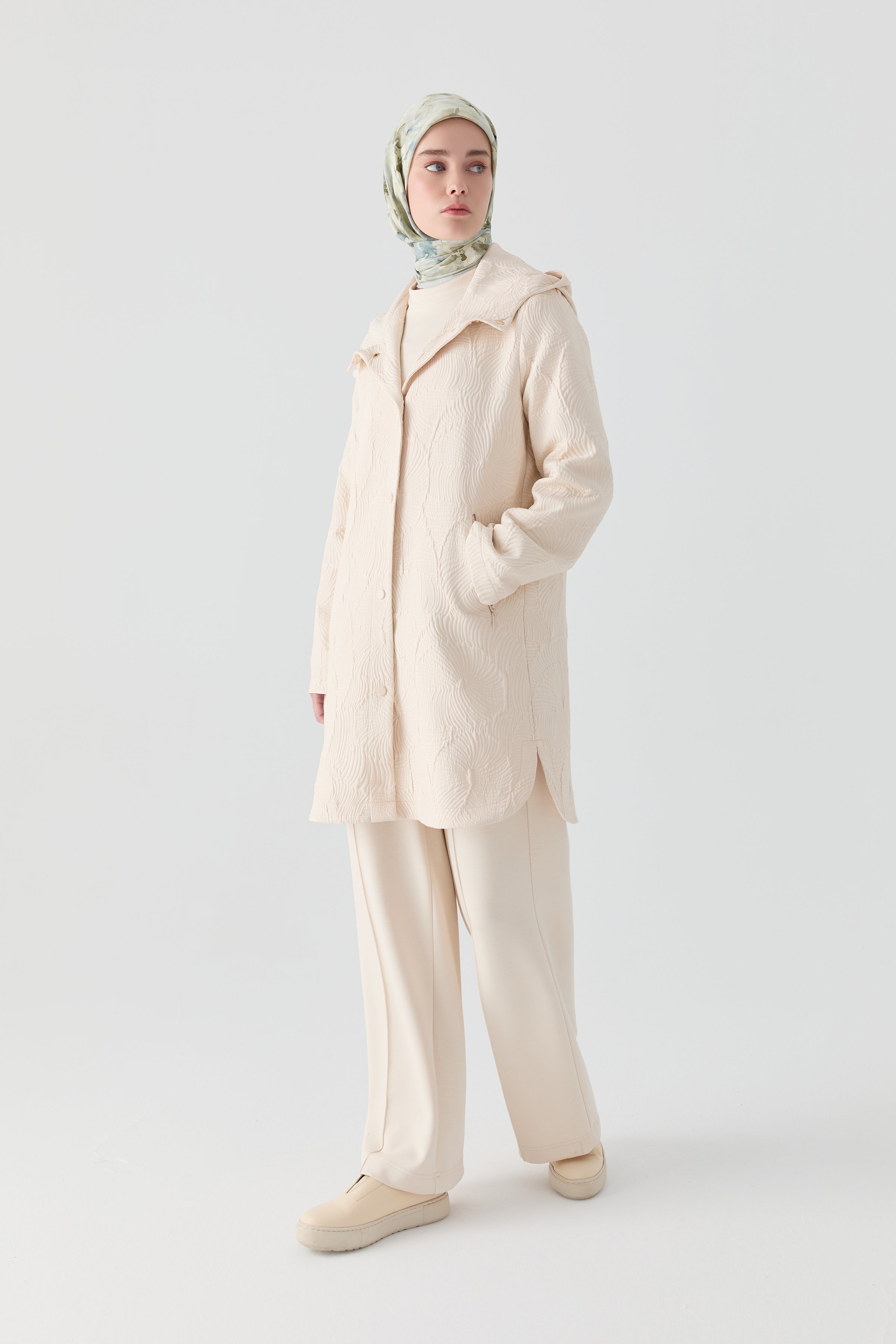 Este abrigo, con su textura acolchada y silueta voluminosa, ofrece una sencillez moderna gracias a su elegante cierre a presión. Las aberturas laterales permiten libertad de movimiento, mientras que su forma fluida combina un estilo urbano chic con comodidad.