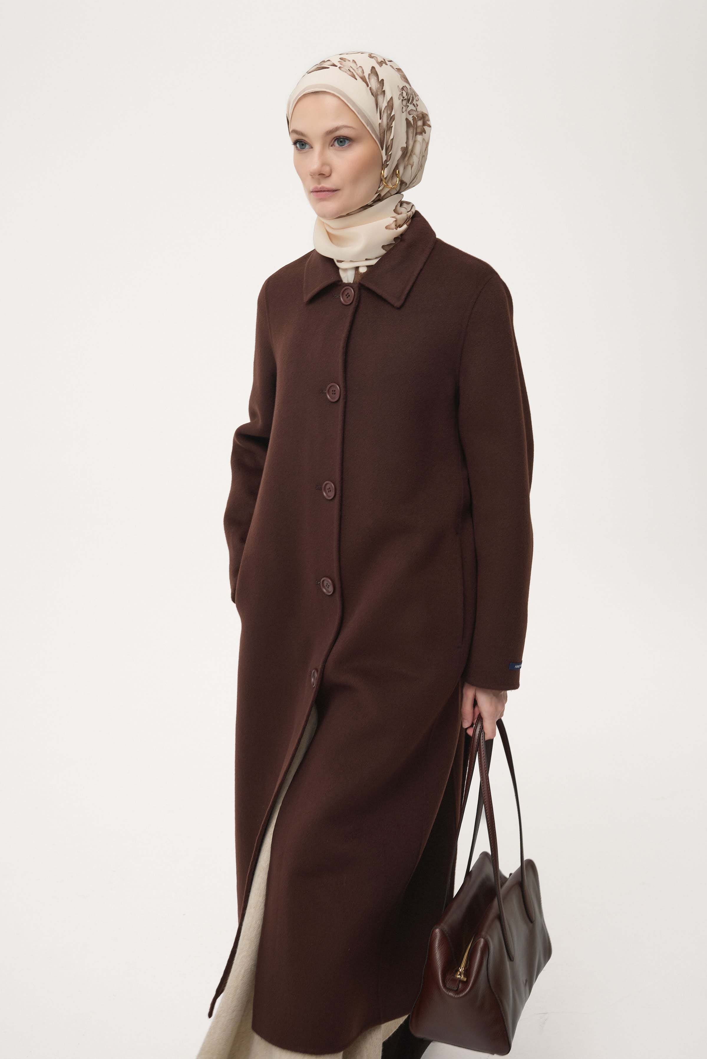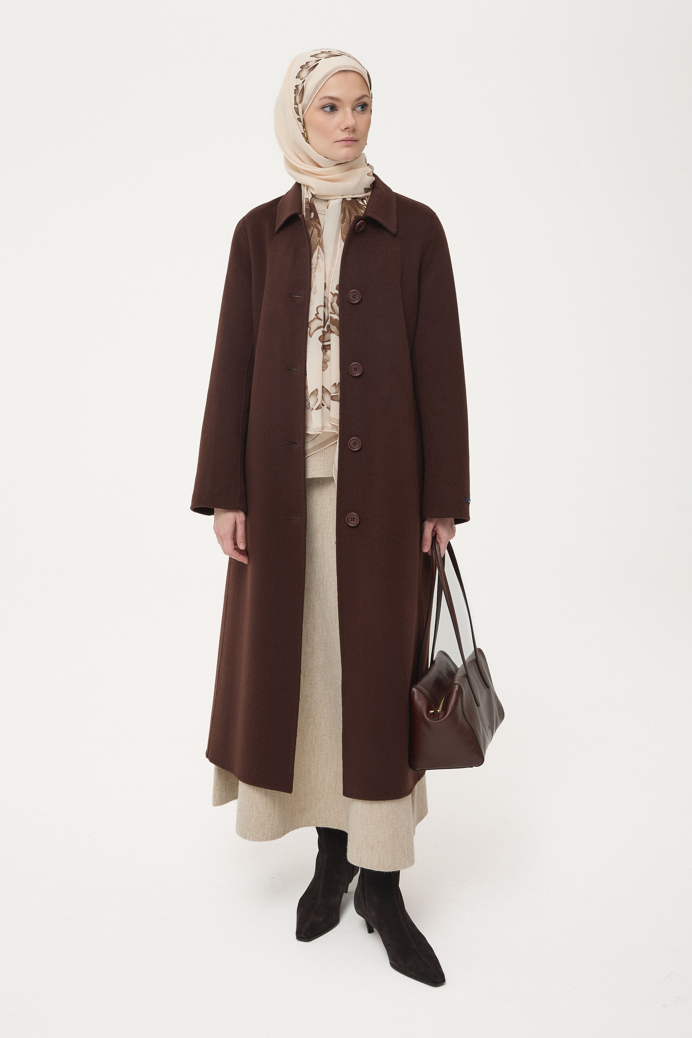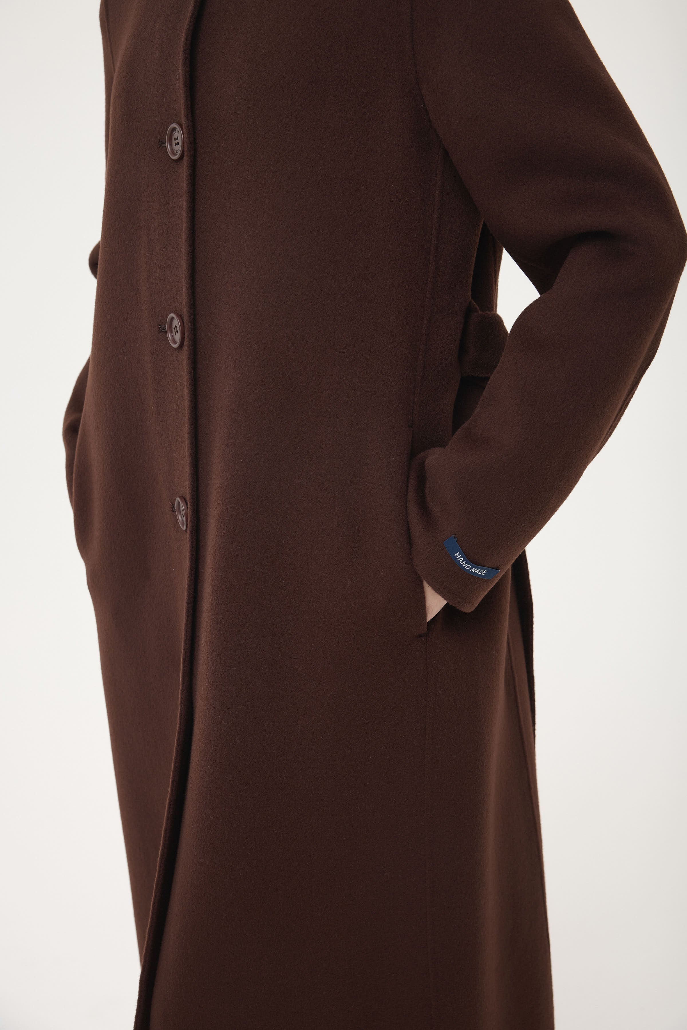Este abrigo 100 % lana, confeccionado íntegramente a mano, combina la calidez y durabilidad de la lana natural con una silueta atemporal. Su diseño de cuello redondo aporta un toque moderno y refinado a las prendas de abrigo clásicas, mientras que los meticulosos detalles de las costuras revelan la elegancia de una artesanía magistral.