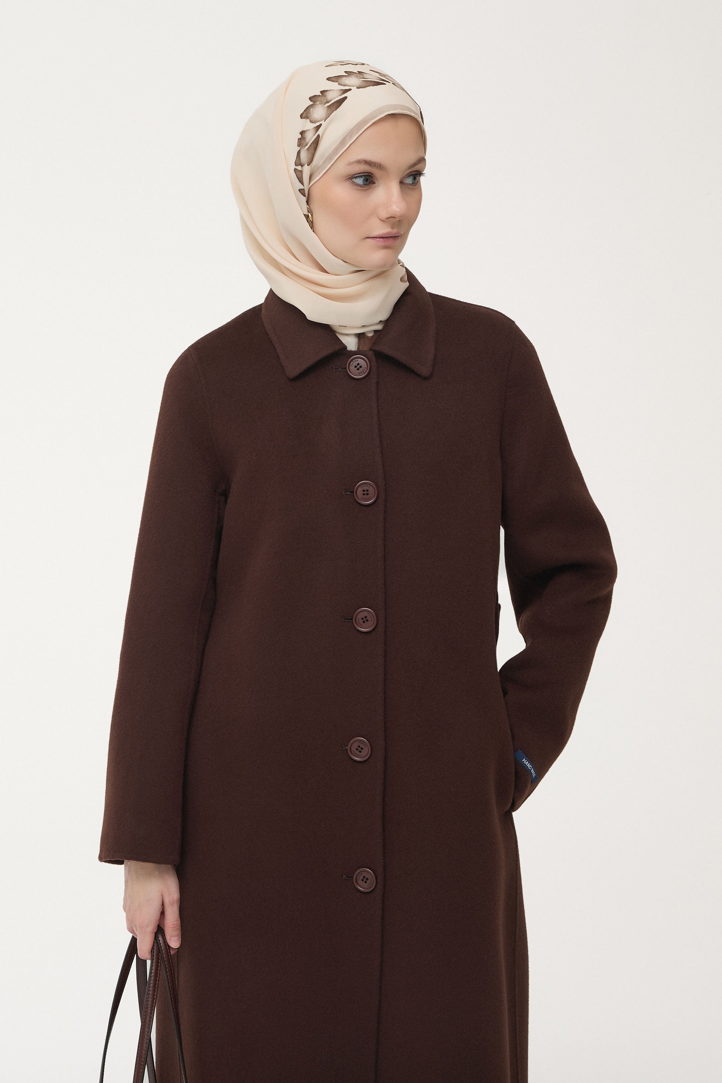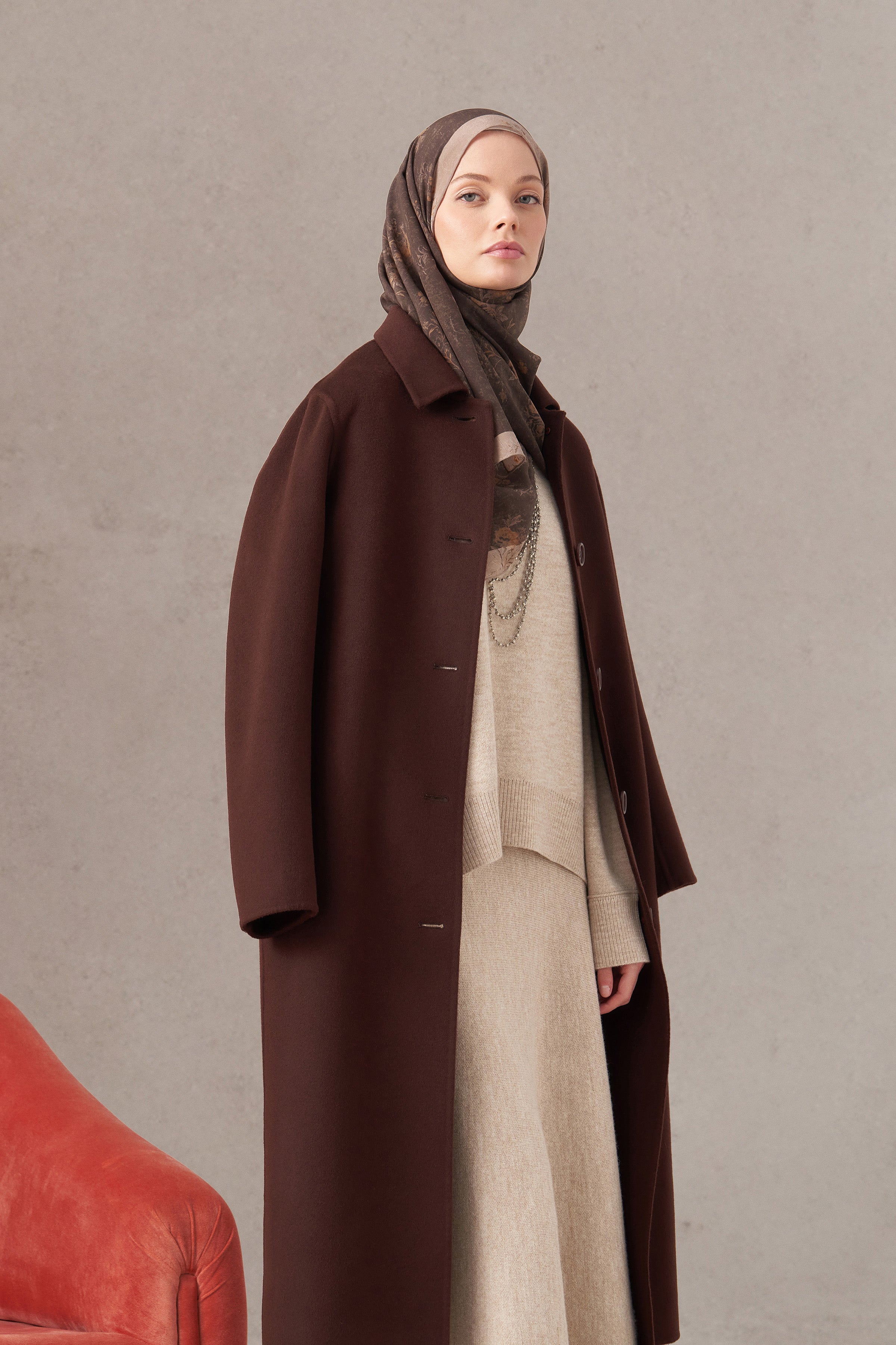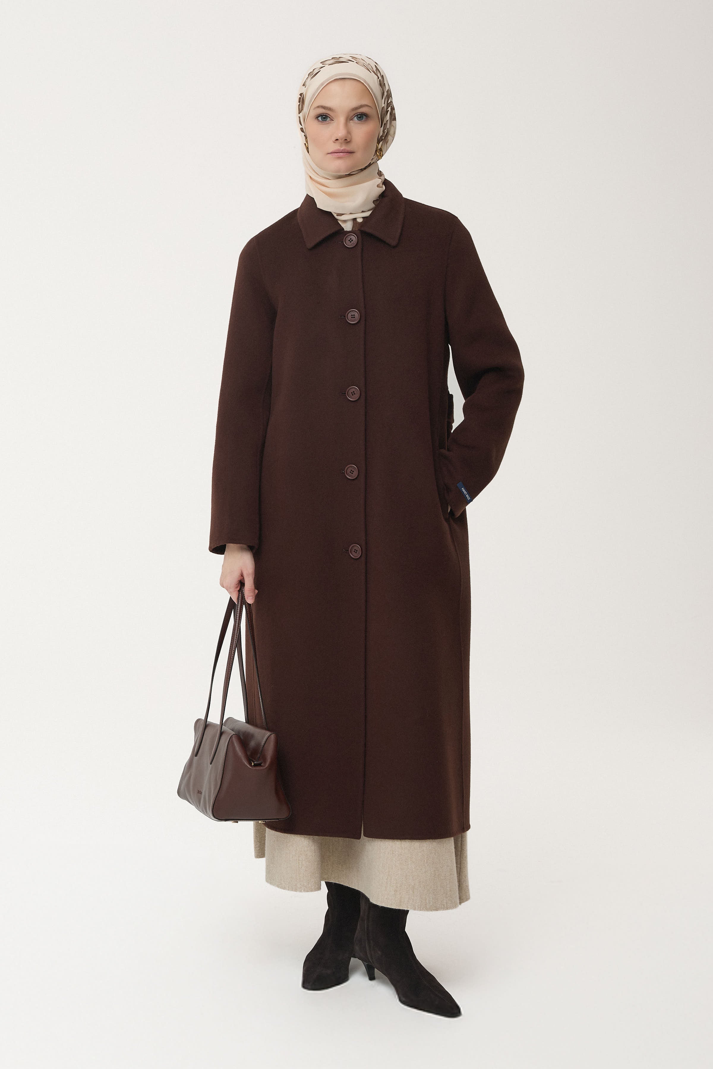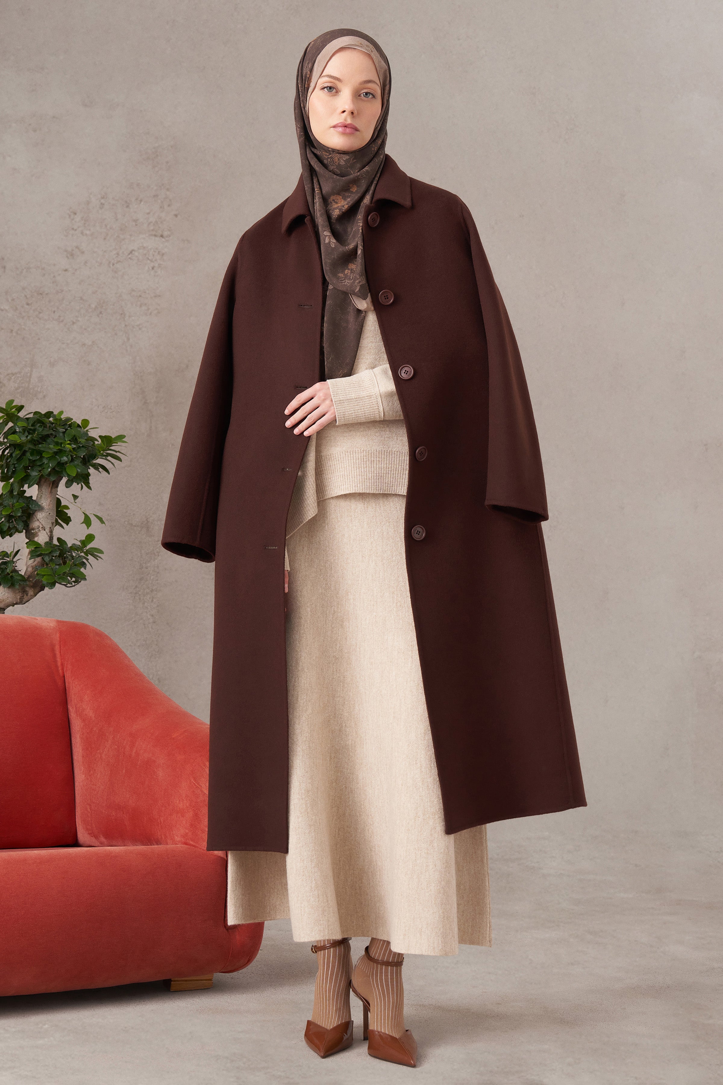 Este abrigo 100 % lana, confeccionado íntegramente a mano, combina la calidez y durabilidad de la lana natural con una silueta atemporal. Su diseño de cuello redondo aporta un toque moderno y refinado a las prendas de abrigo clásicas, mientras que los meticulosos detalles de las costuras revelan la elegancia de una artesanía magistral.