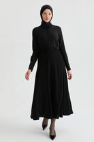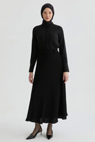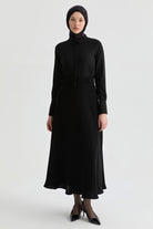 La falda, que realza la feminidad con su forma acampanada, gana dinamismo gracias al detalle del cinturón.