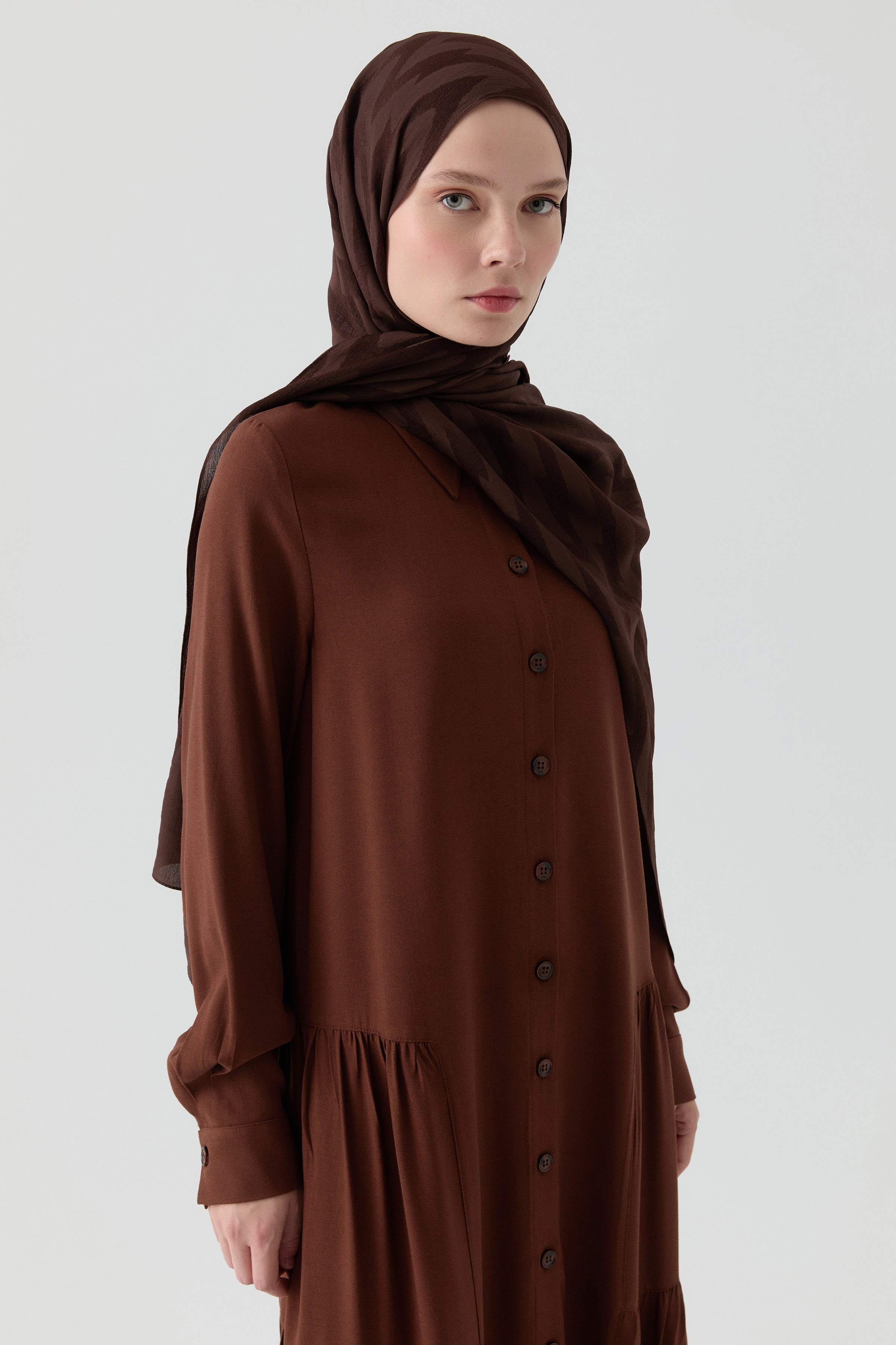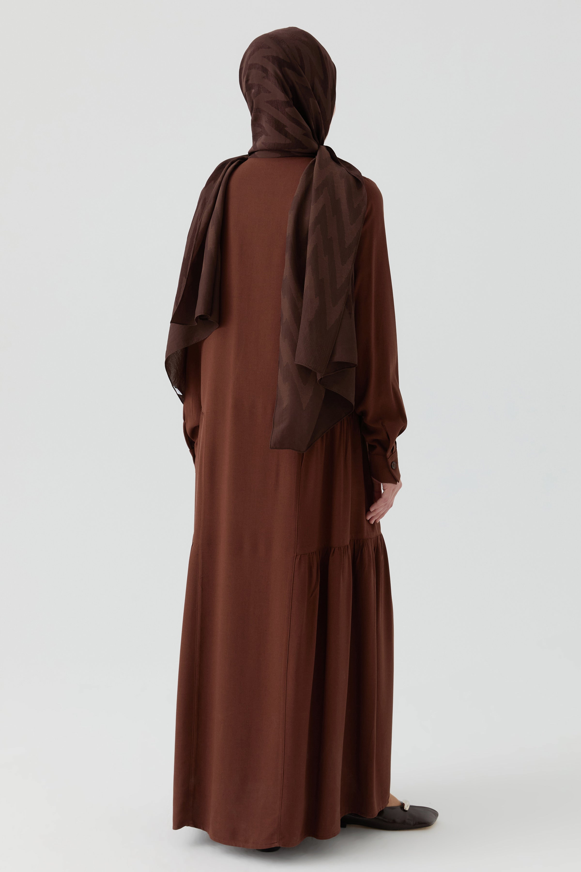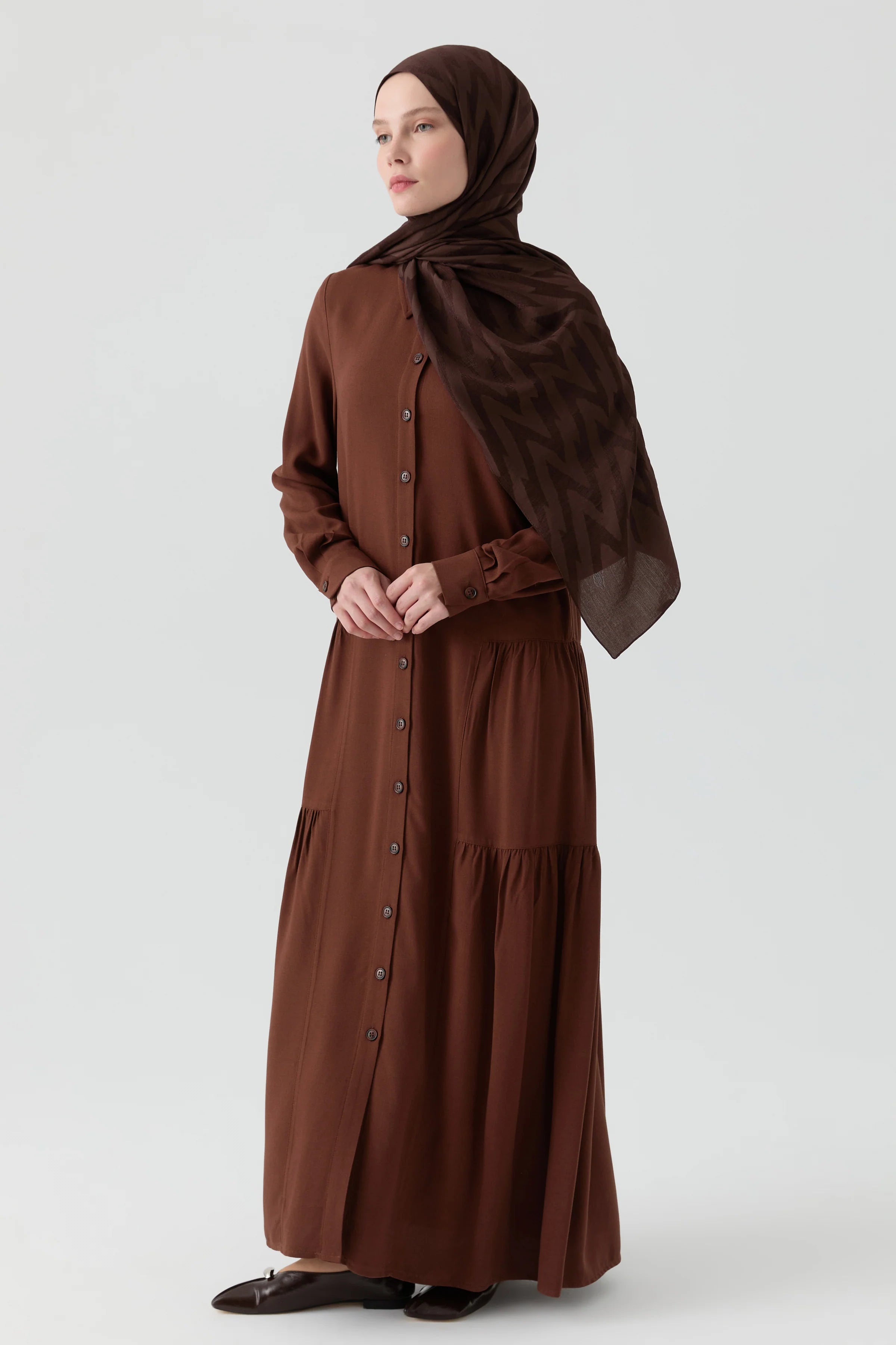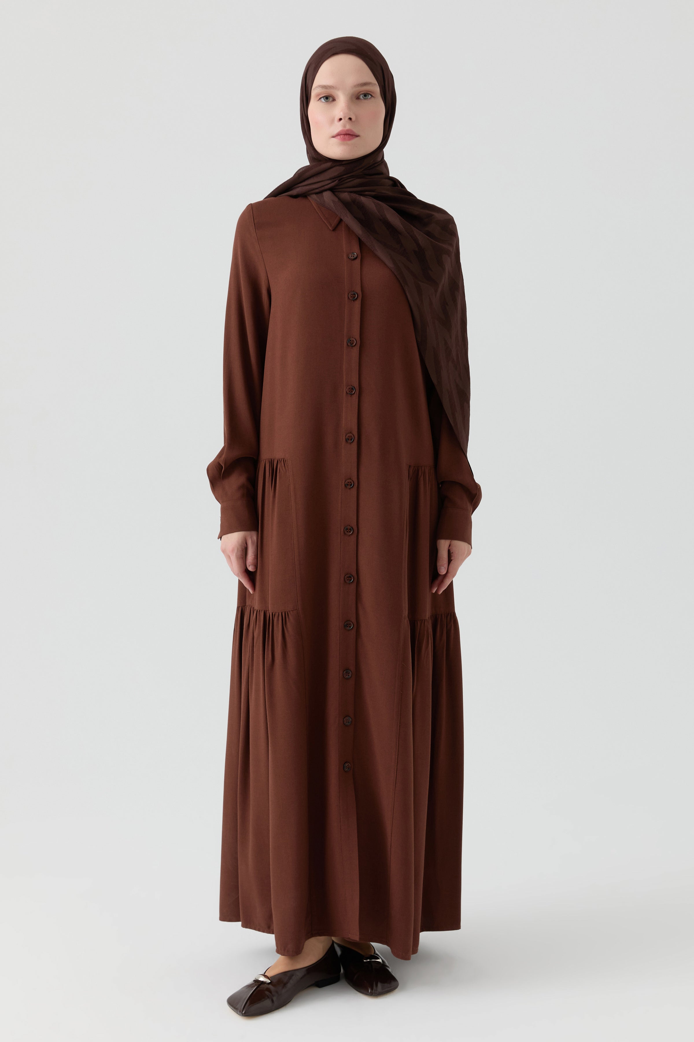Con frunces en la cintura y el pecho, este vestido ofrece un look moderno y femenino. Su tejido fluido y su corte holgado garantizan comodidad durante todo el día, mientras que su elegante diseño lo hace ideal para una gran variedad de conjuntos, desde ocasiones especiales hasta looks de diario.