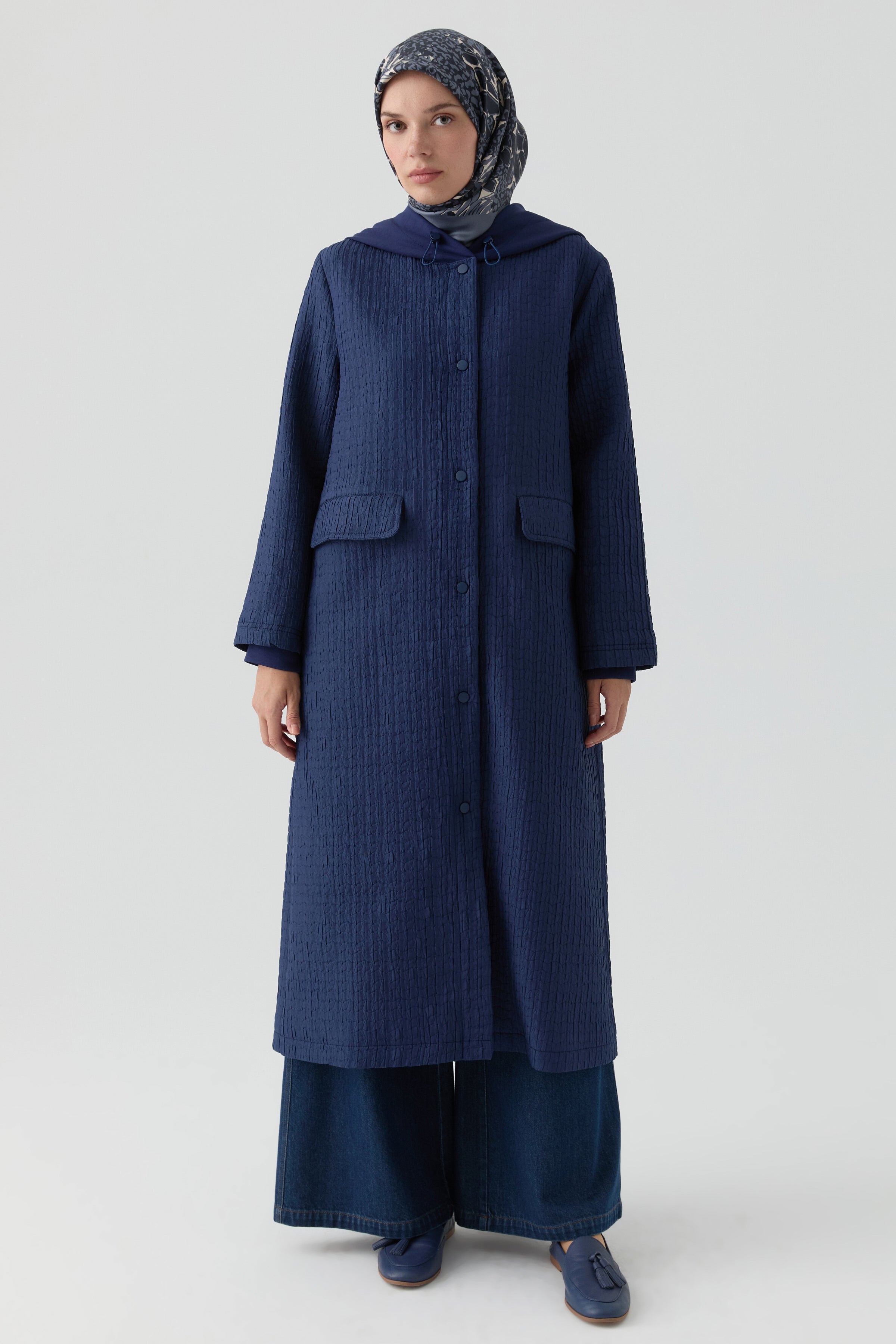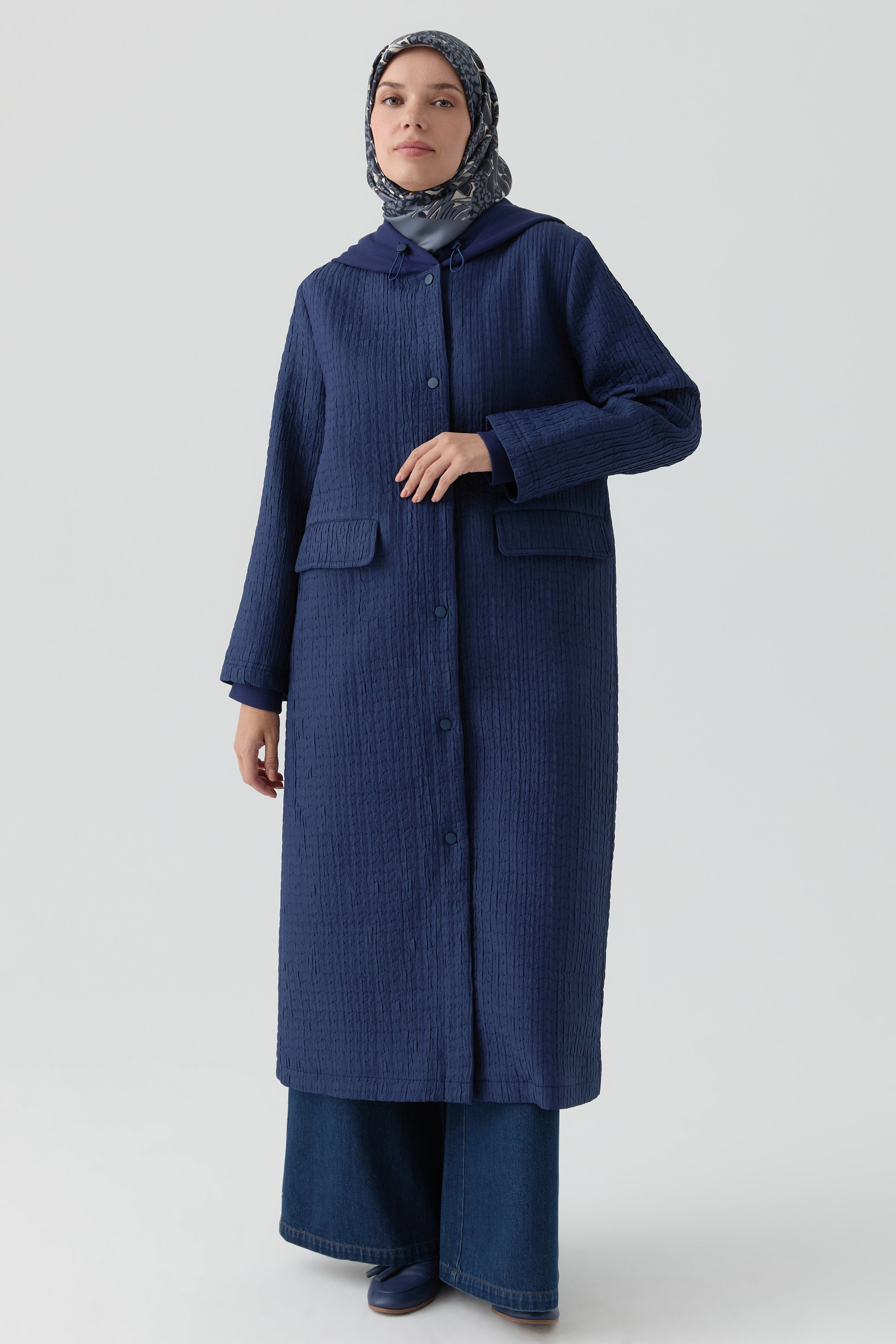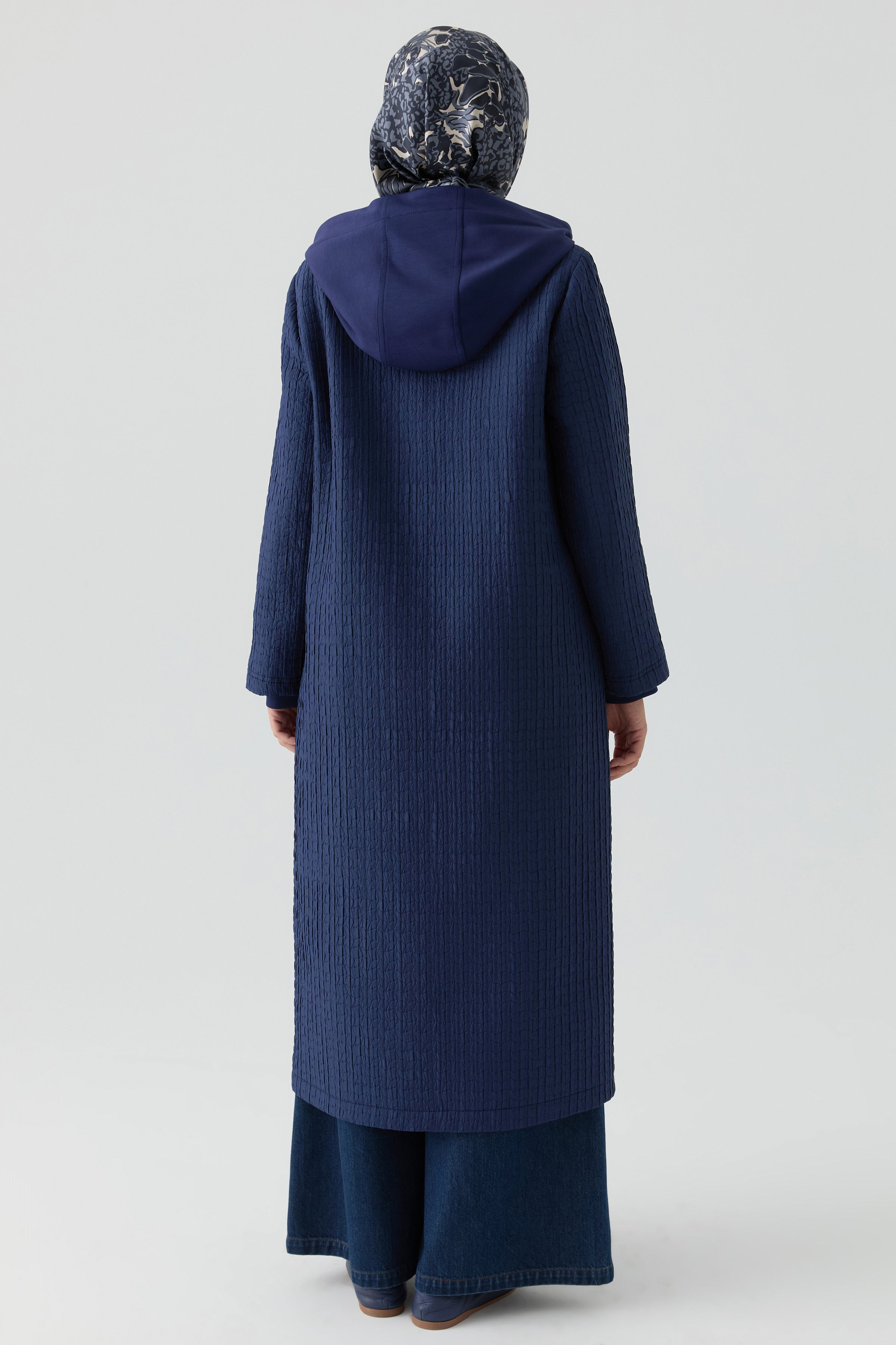 Enriquecida con detalles de tejido de punto, esta capa midi se adapta al cuerpo gracias al detalle elástico en la cintura, ofreciendo un look cómodo y moderno.