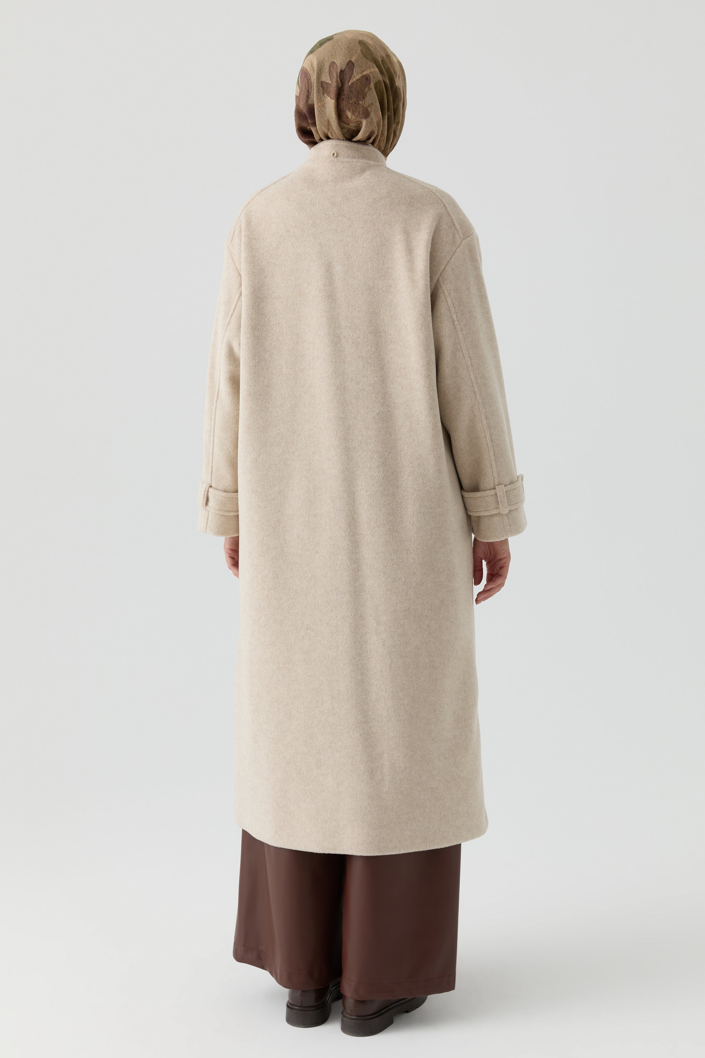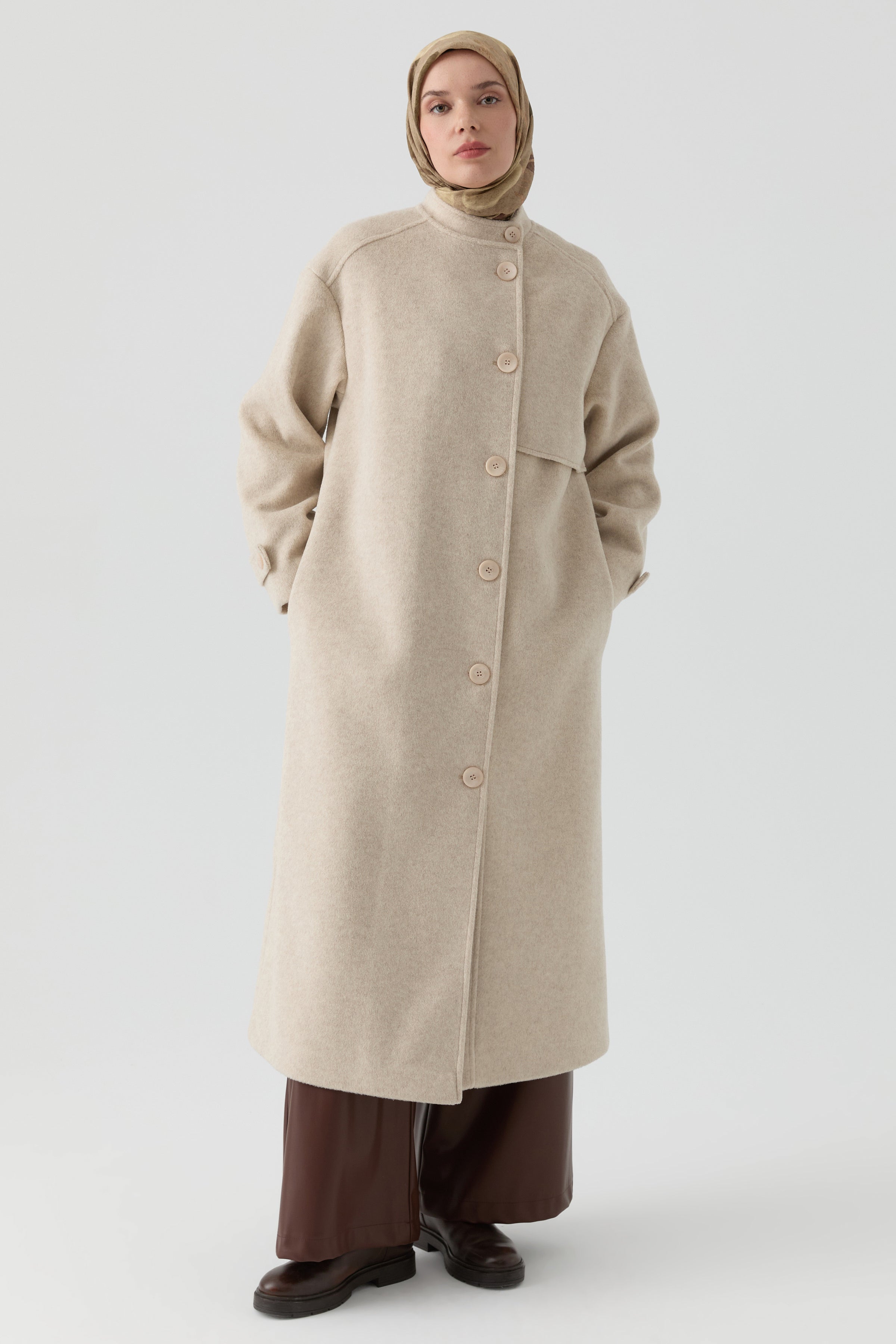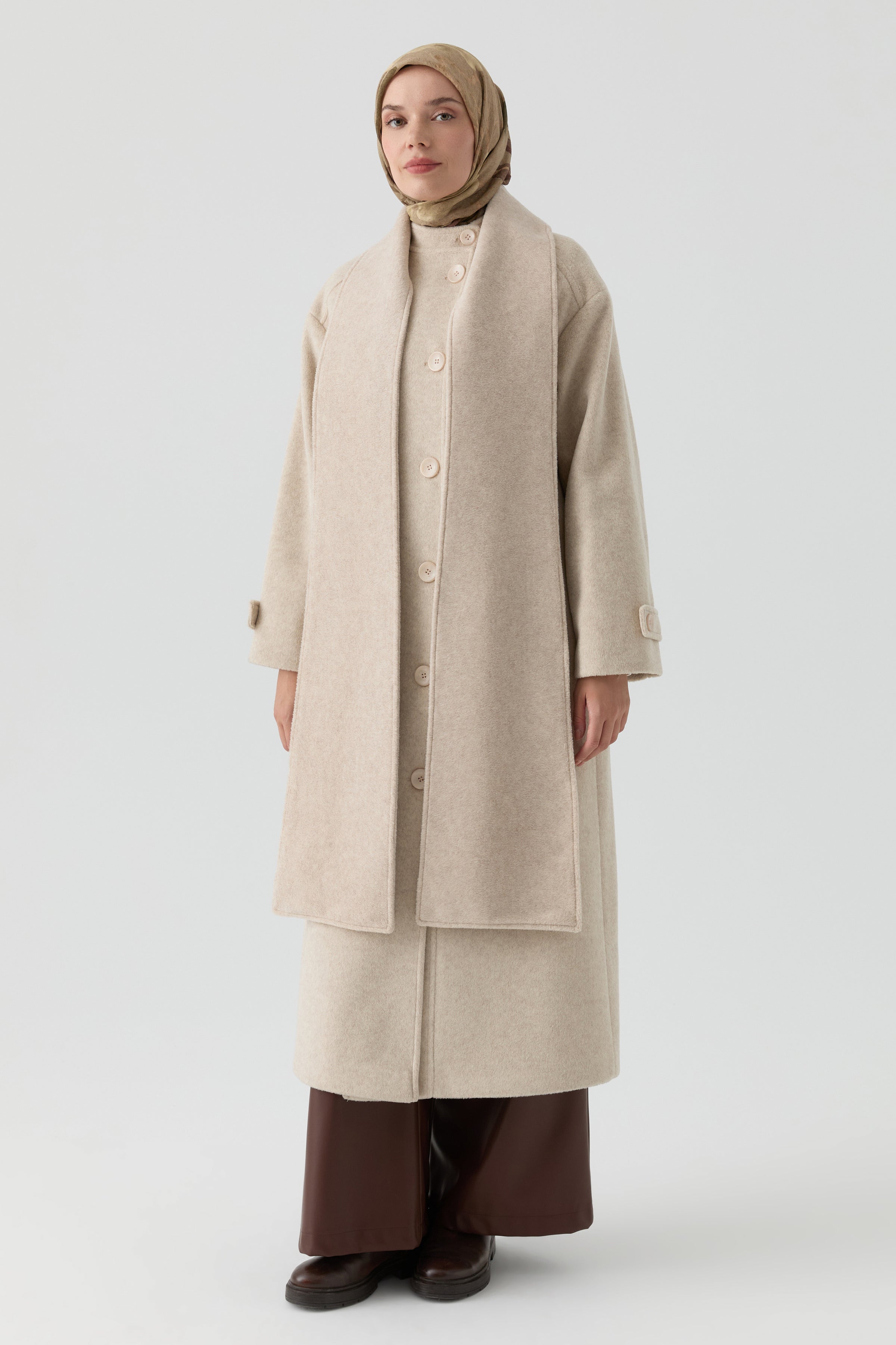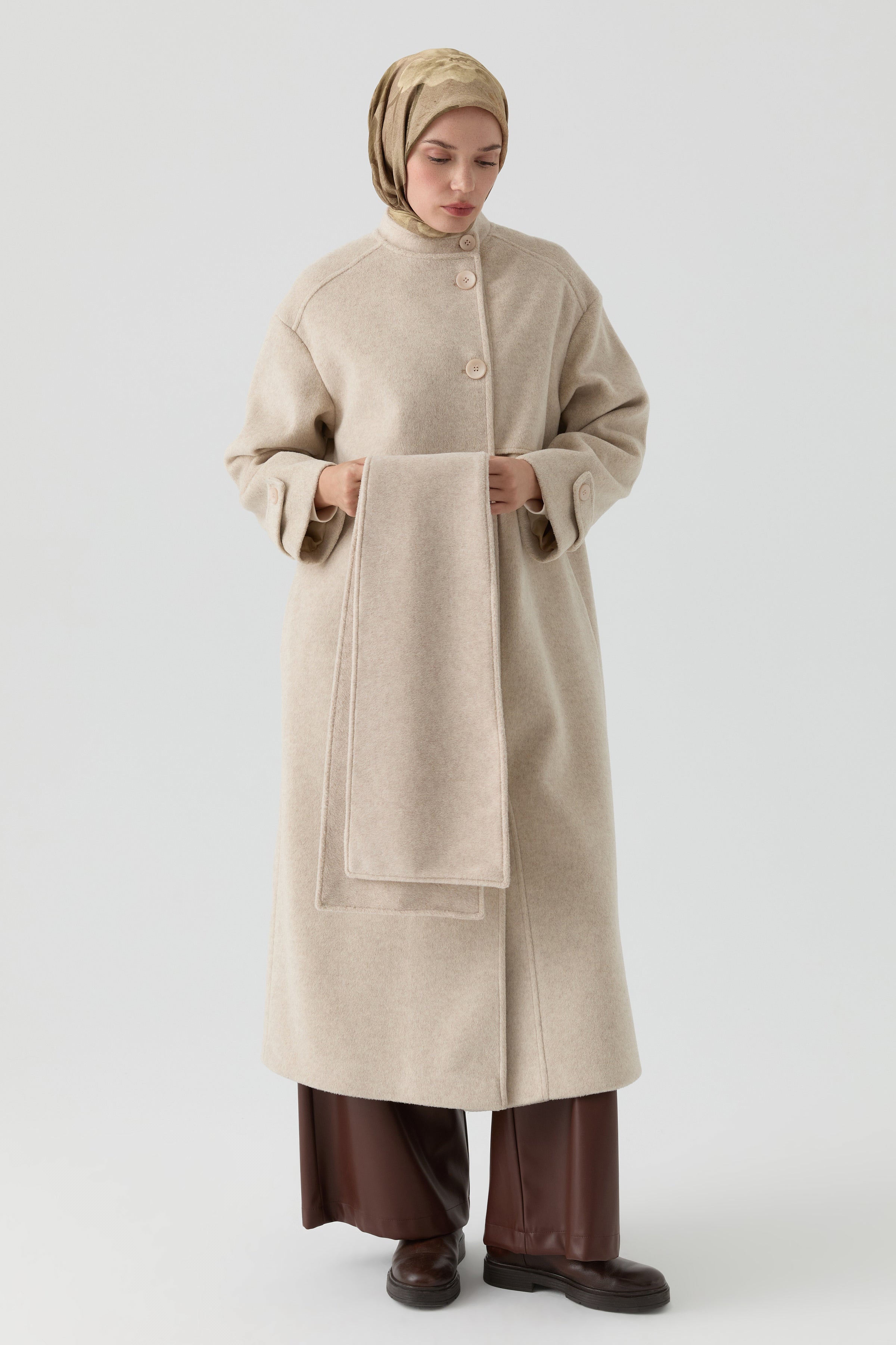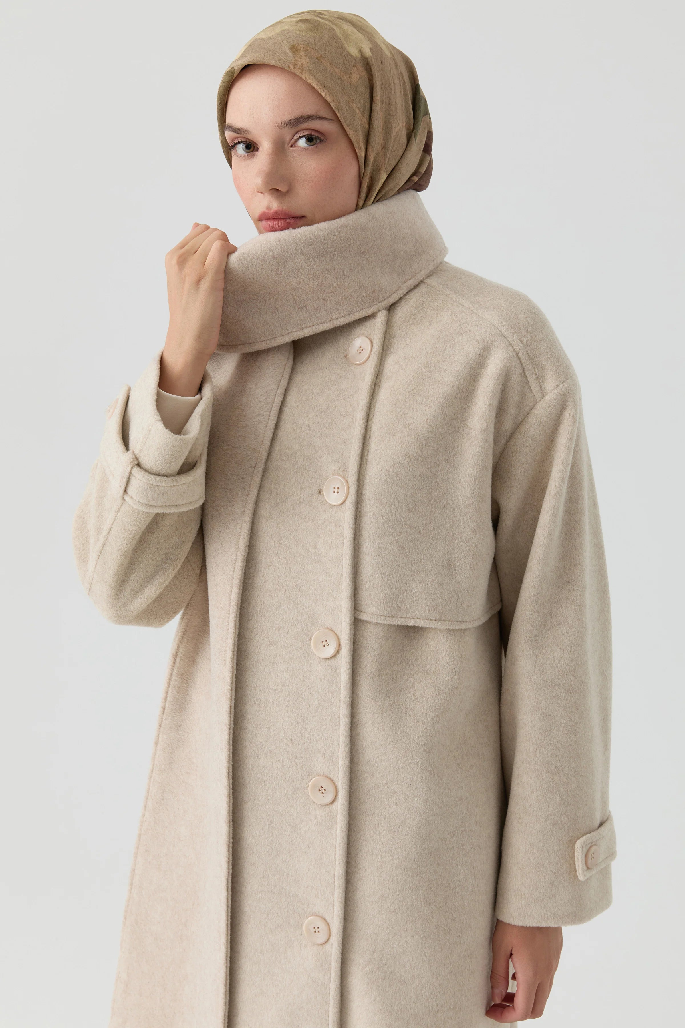 Abrigo cruzado con bufanda desmontable - Beige