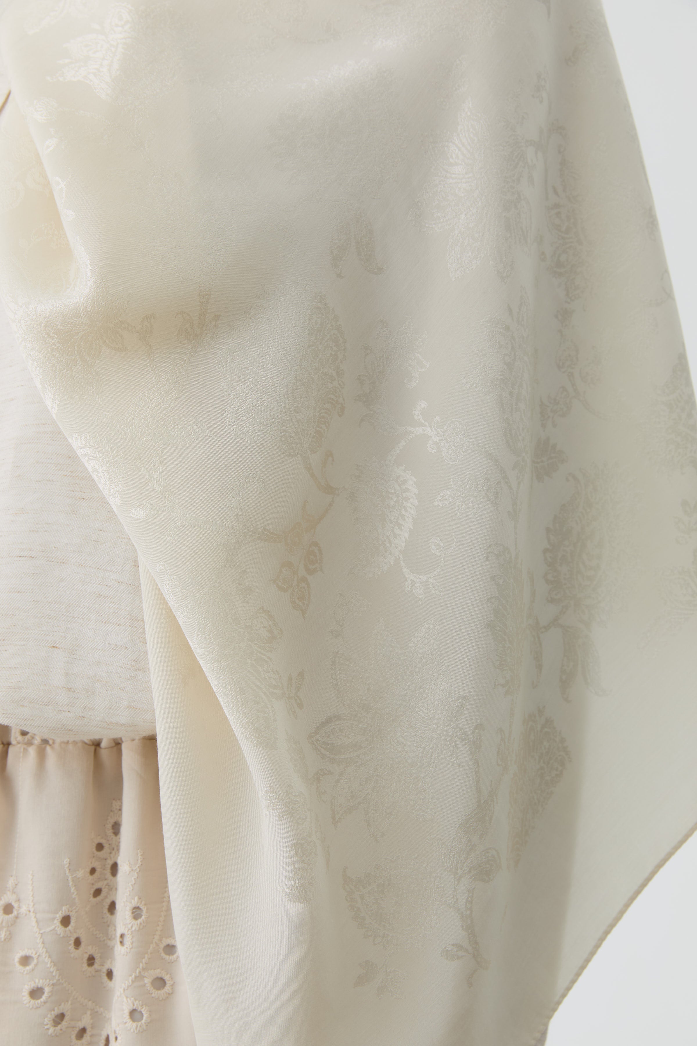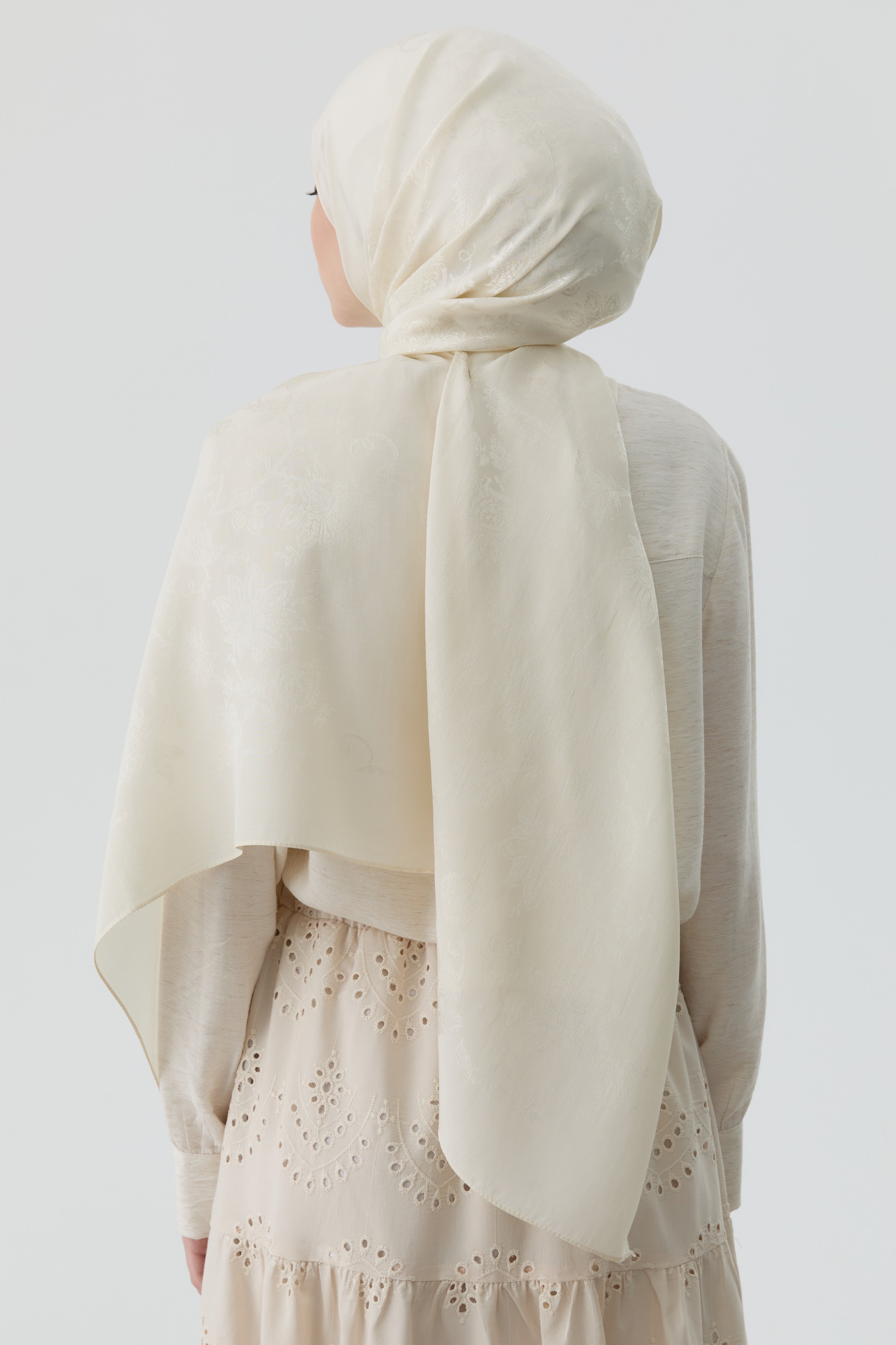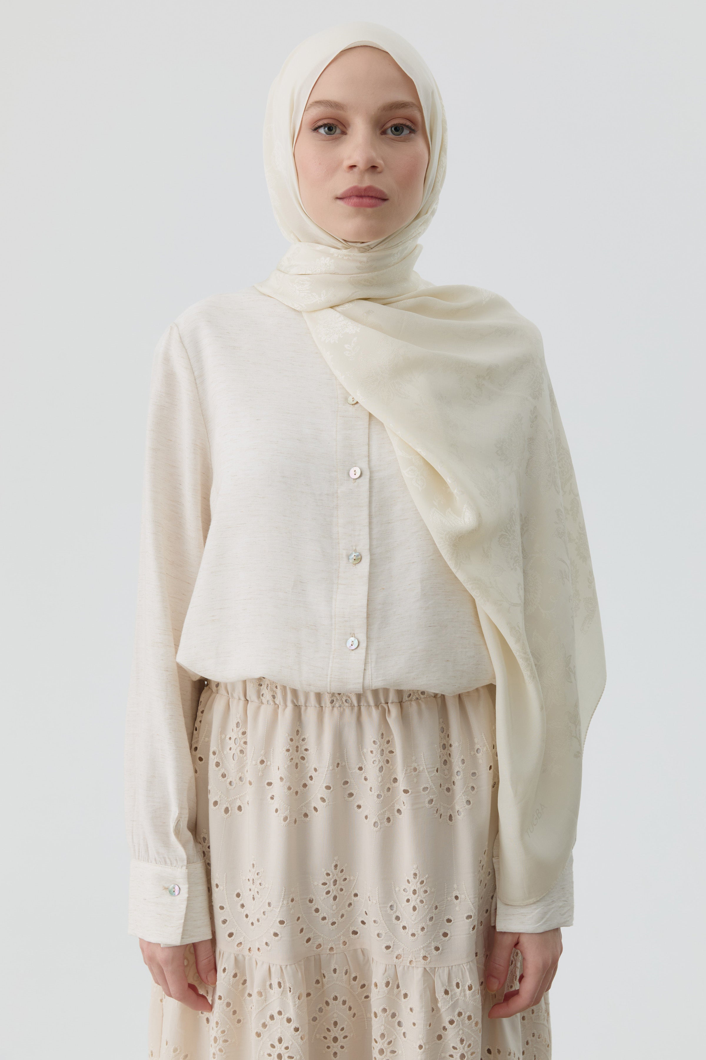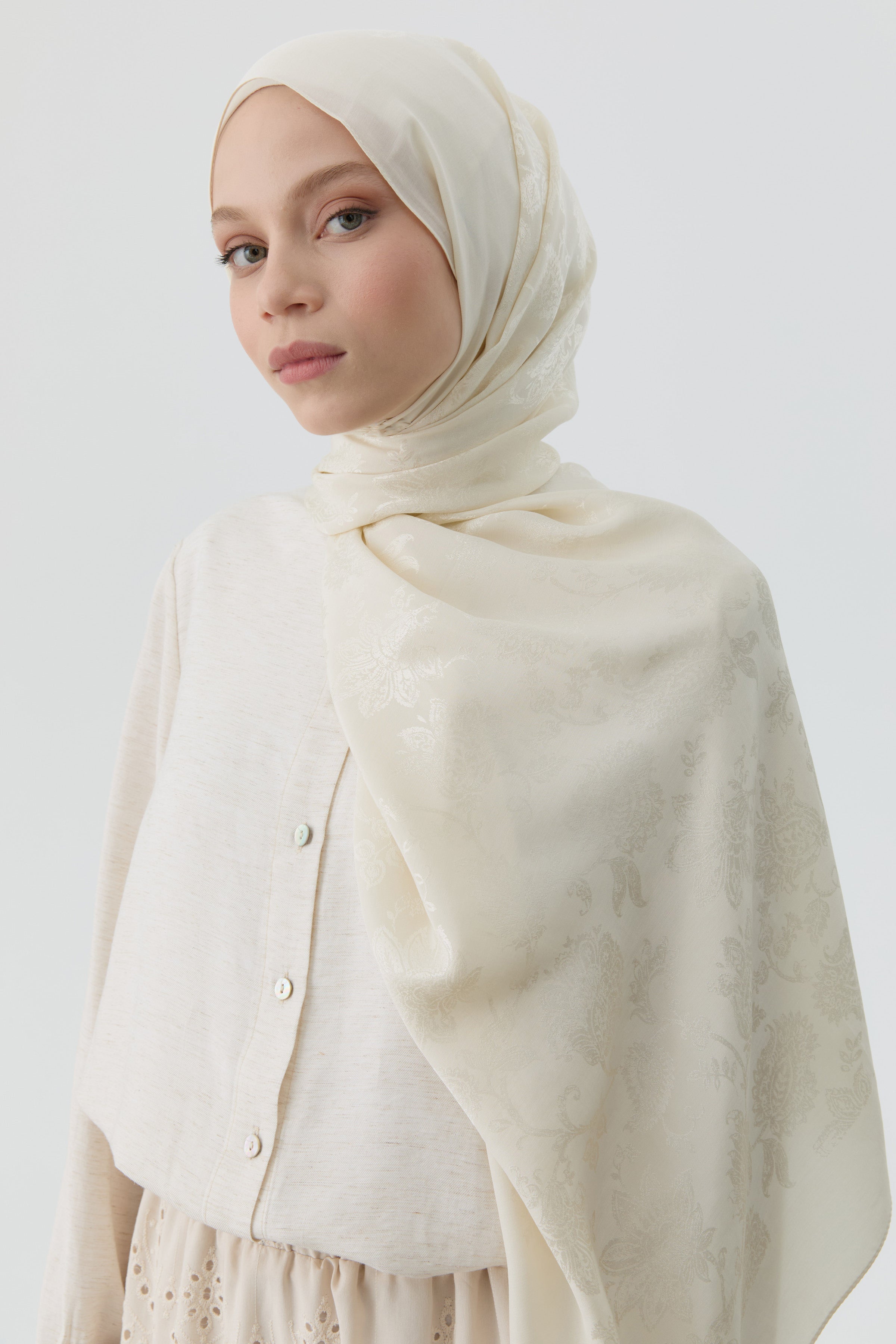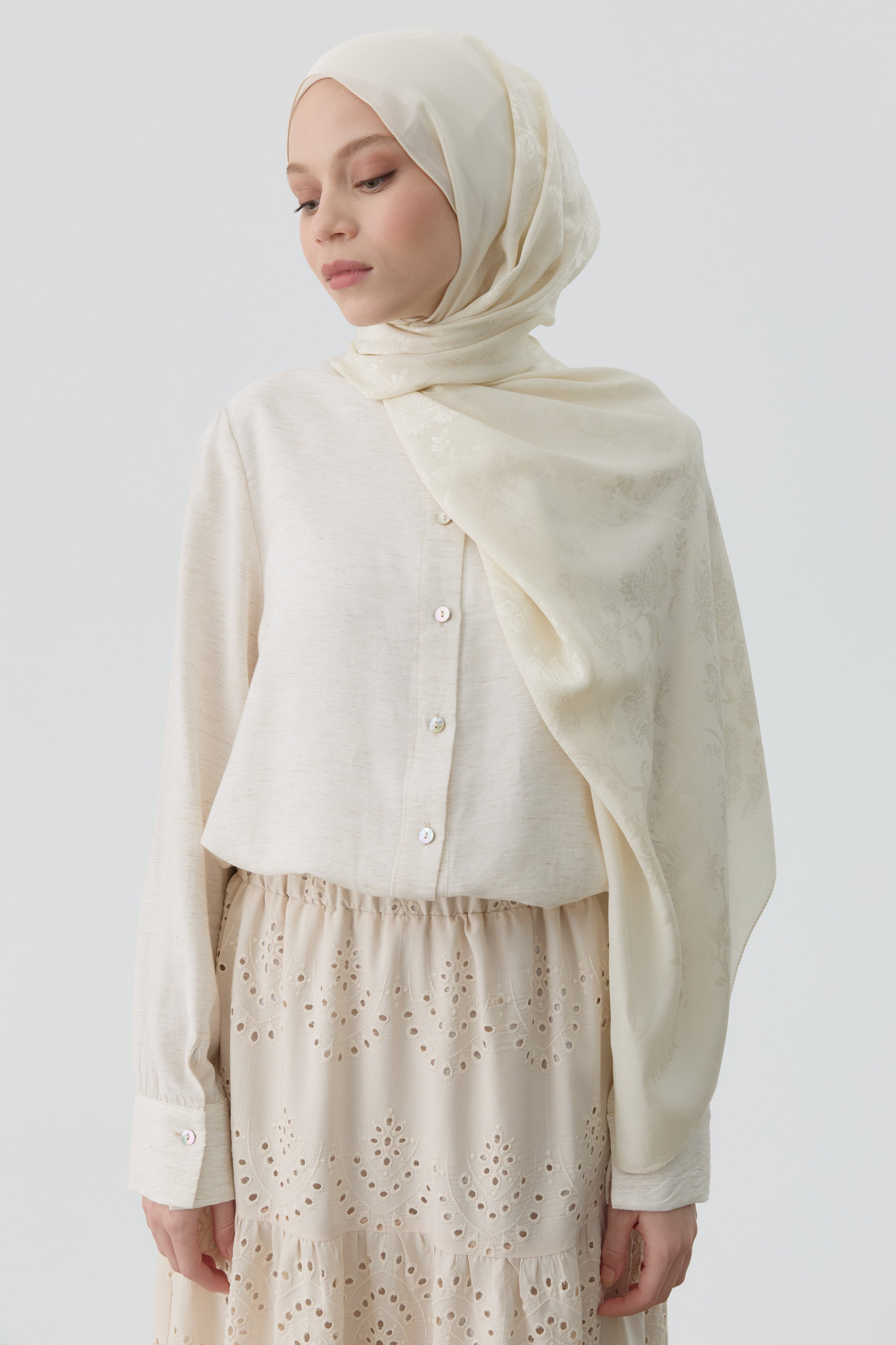 El chal natural Nevgül, con su elegante textura jacquard, ofrece ligereza y comodidad gracias a su textura natural. Es una prenda atemporal que complementa tu estilo sencillo y elegante.
