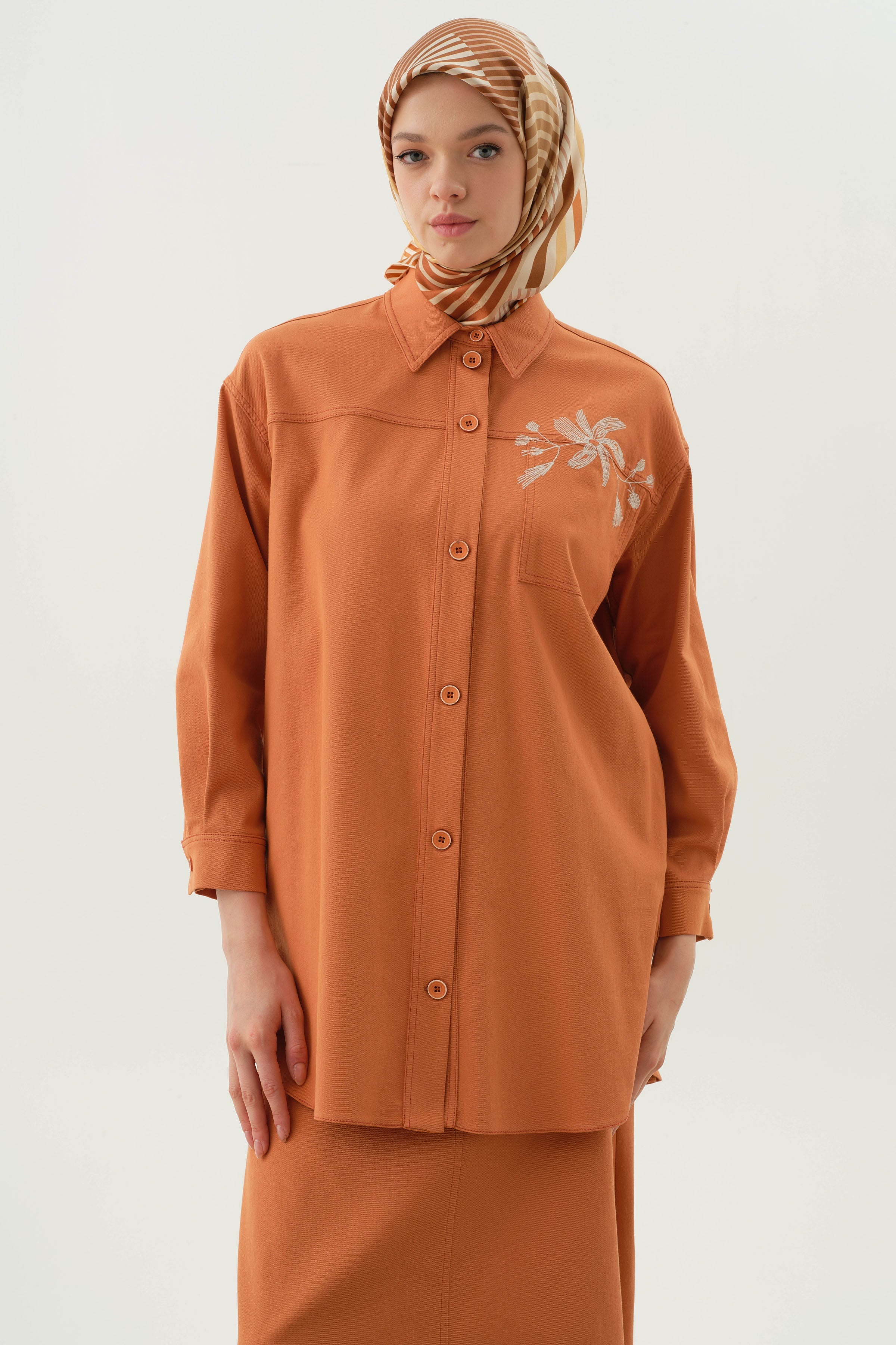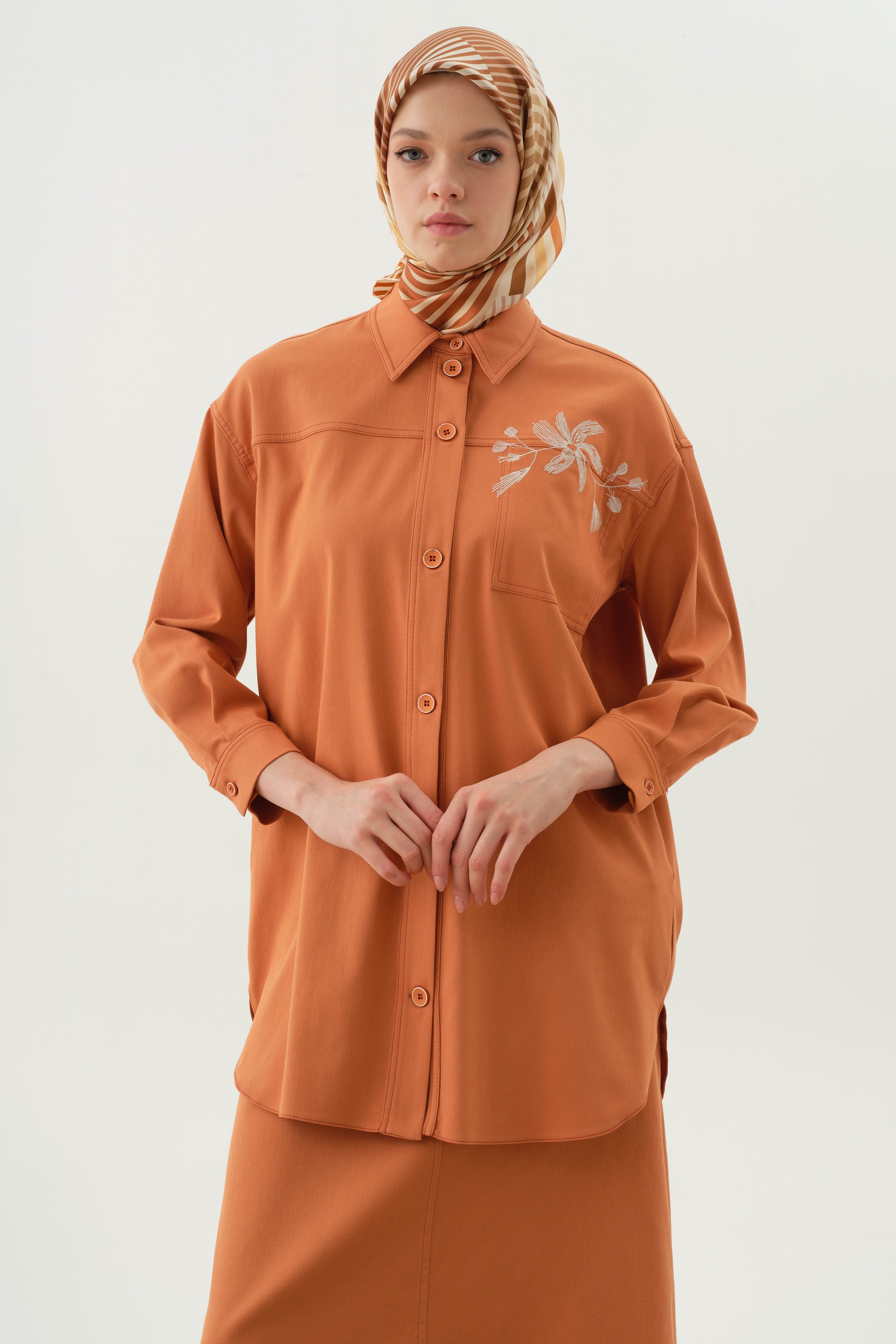 Esta camisa, que gana un aire femenino con sus elegantes detalles de bordado, combina la elegancia sencilla con la funcionalidad con su diseño de bolsillo oculto. Proporciona comodidad durante todo el día con su textura ligera. Se adapta tanto al estilo diario como al de oficina.
