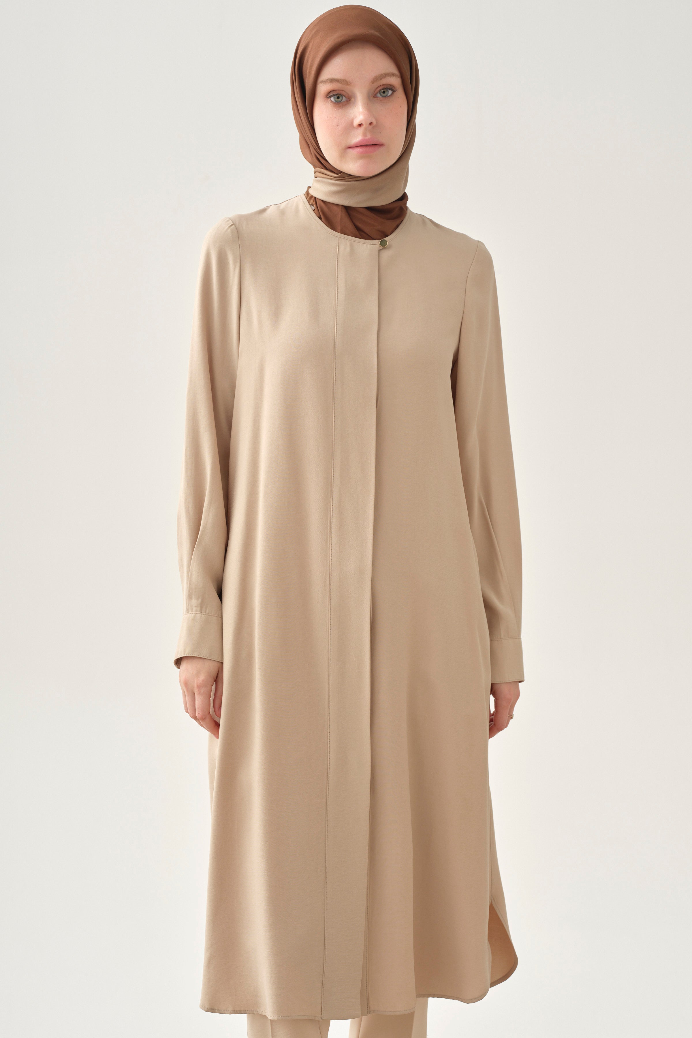 Este abrigo, con su detalle de canesú y cierre oculto, ofrece un look sencillo y elegante. Su estructura fluida garantiza una prenda cómoda y con estilo. Es el complemento perfecto tanto para conjuntos informales como clásicos.