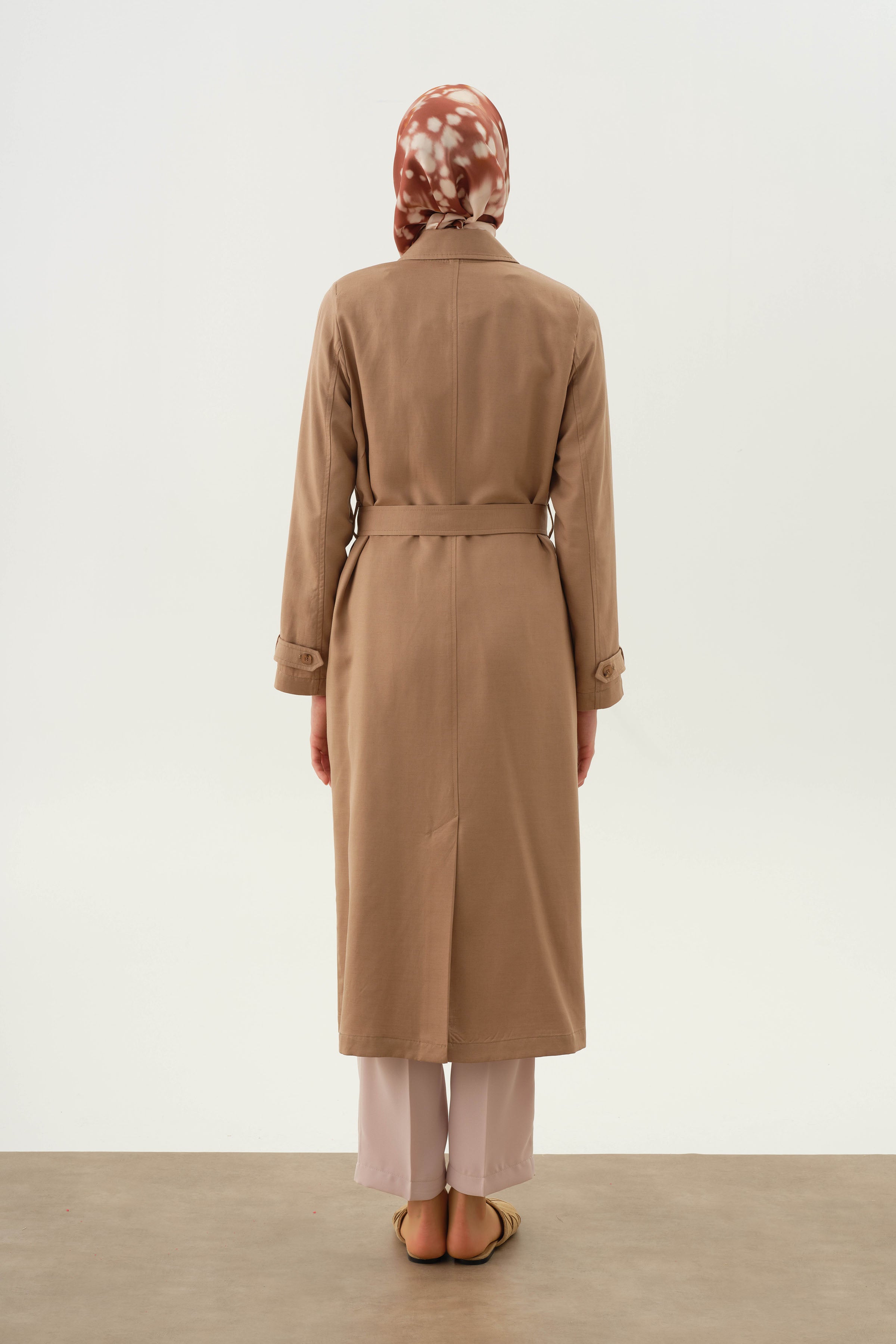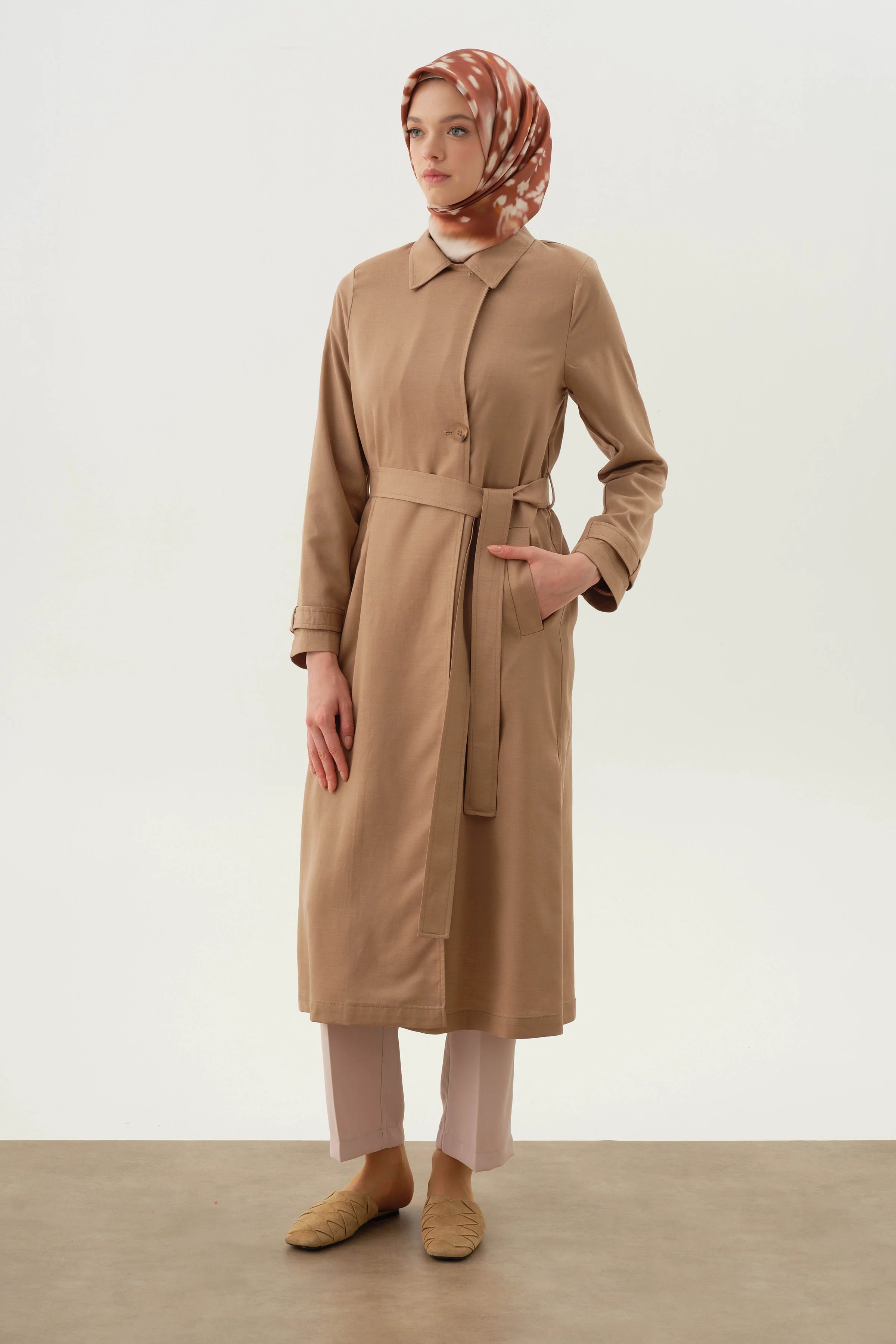 Esta gabardina combina la elegancia clásica con una línea moderna con su cuello polo y corte cruzado, ofreciendo una silueta fuerte. Con su corte cómodo, proporciona un uso cómodo durante las transiciones estacionales. Se adapta fácilmente a cualquier combinación con su estilo atemporal.
