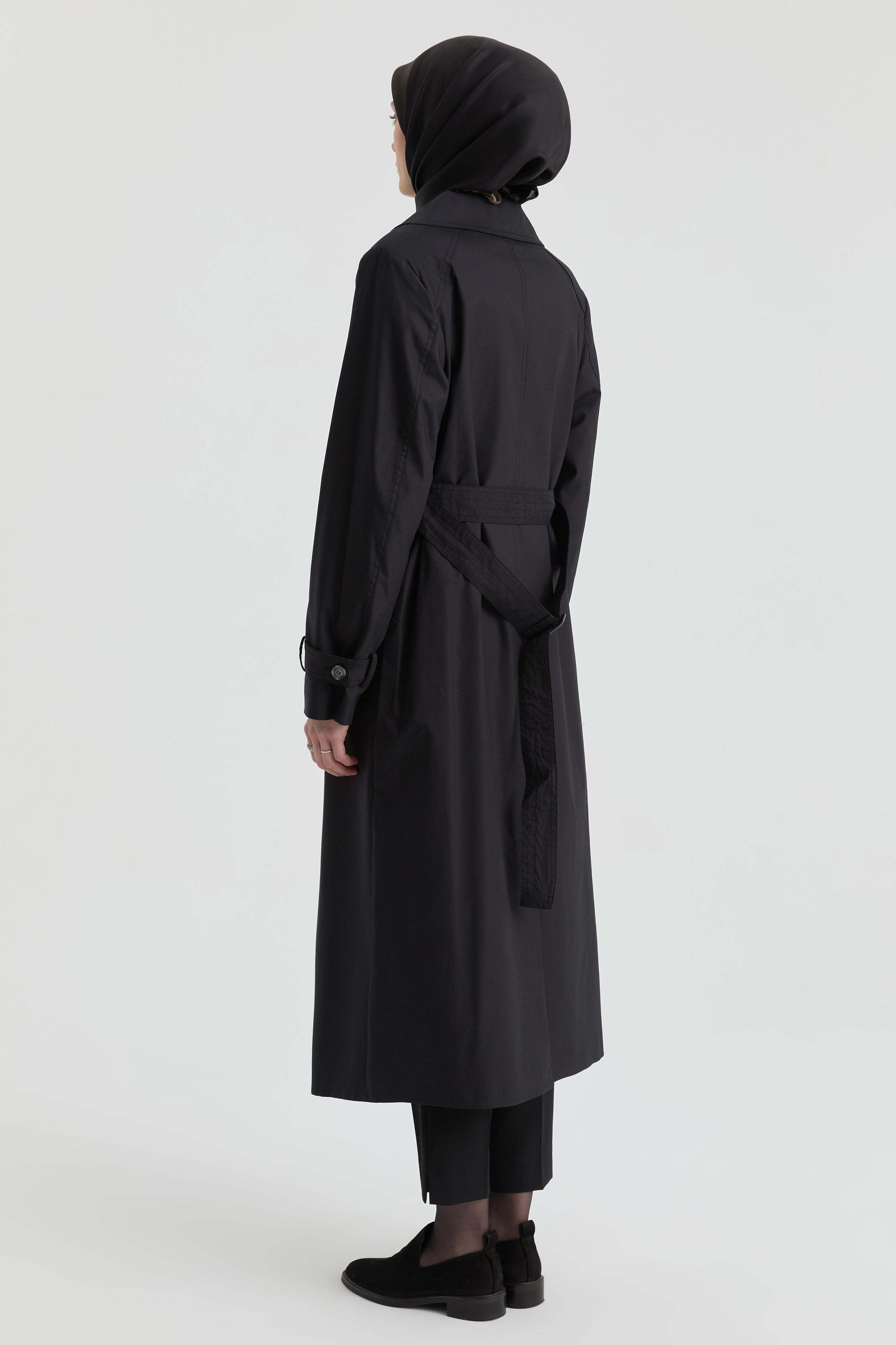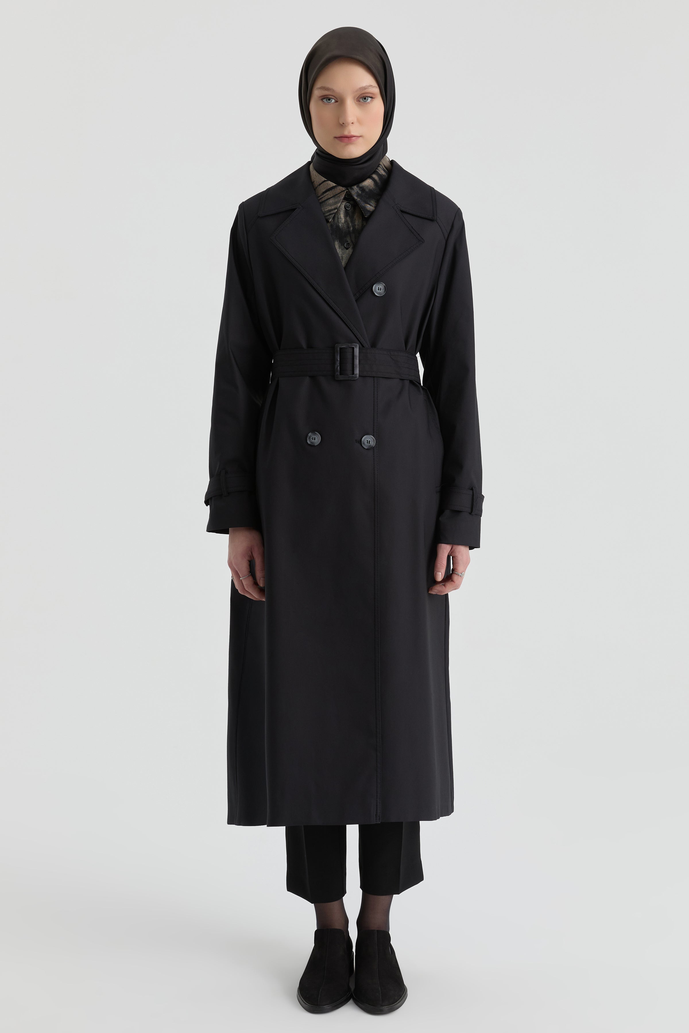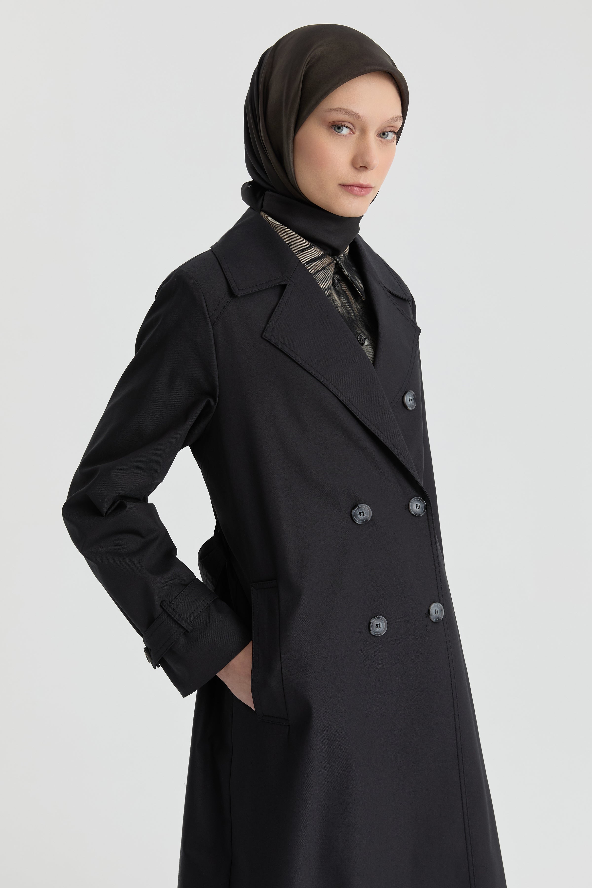 Ofreciendo una elegancia sofisticada con su diseño clásico de cuello cruzado, esta gabardina también presenta un detalle cortavientos en la parte delantera y trasera, lo que le da un aspecto funcional pero moderno.