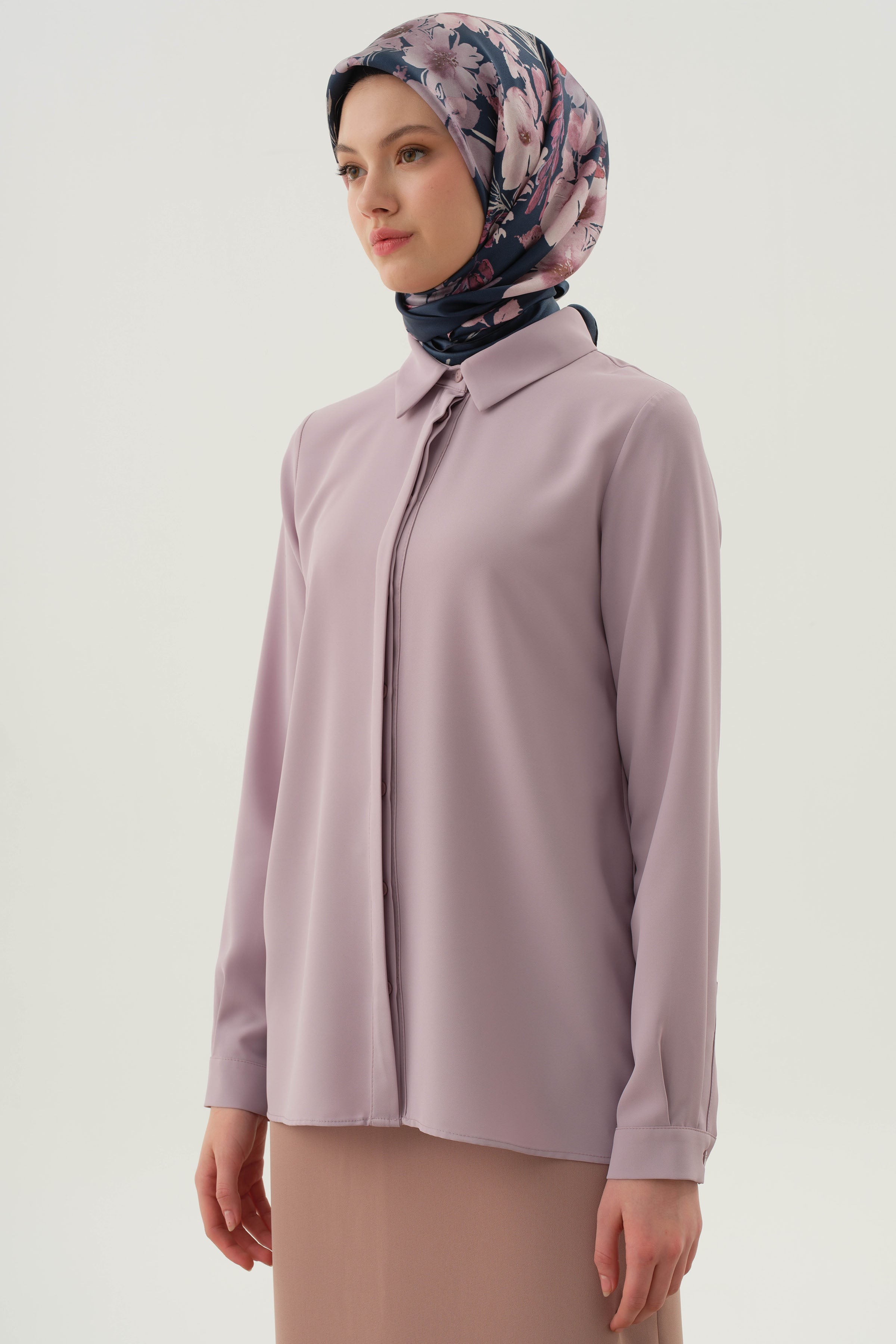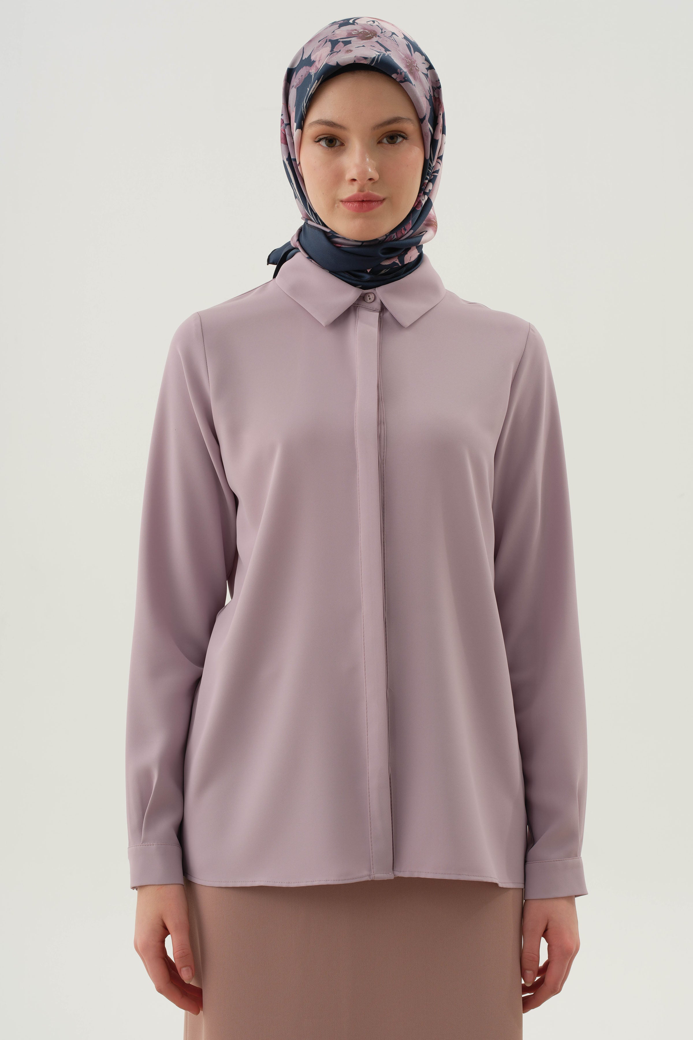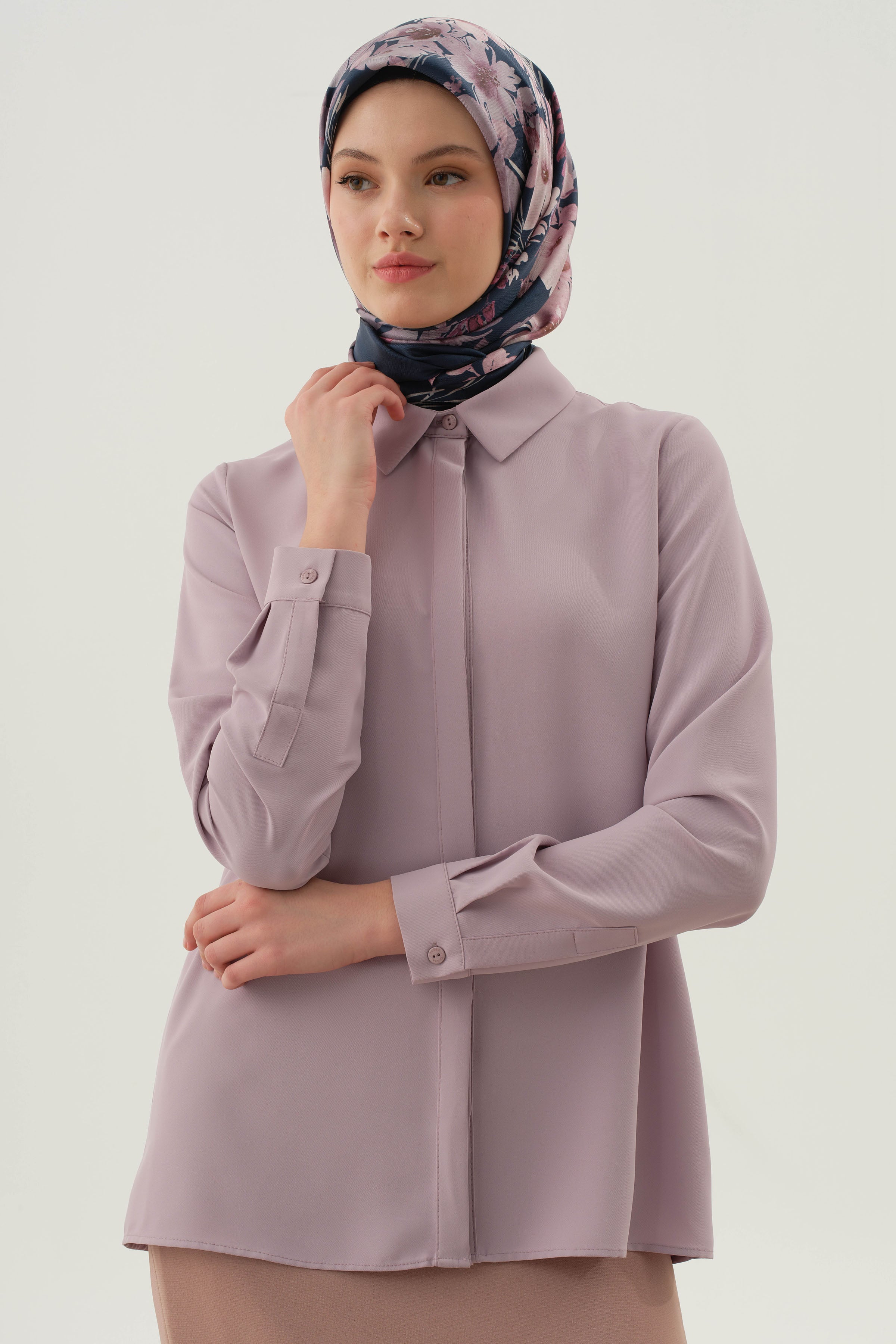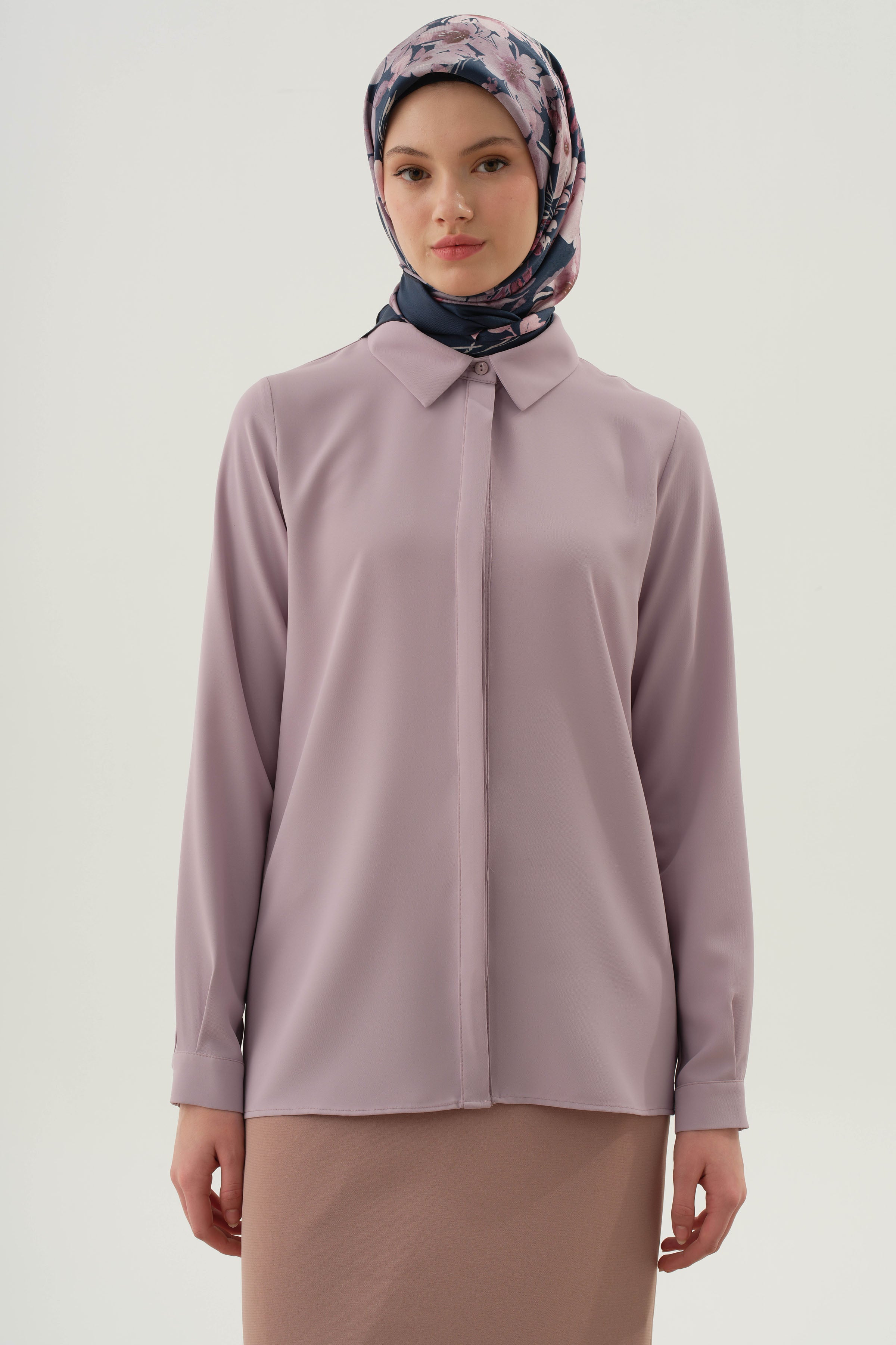 La camisa básica con tapeta oculta es una prenda versátil con un diseño simple y elegante. El detalle de tapeta oculta le da a la camisa un aspecto limpio y minimalista, resaltando su elegancia.