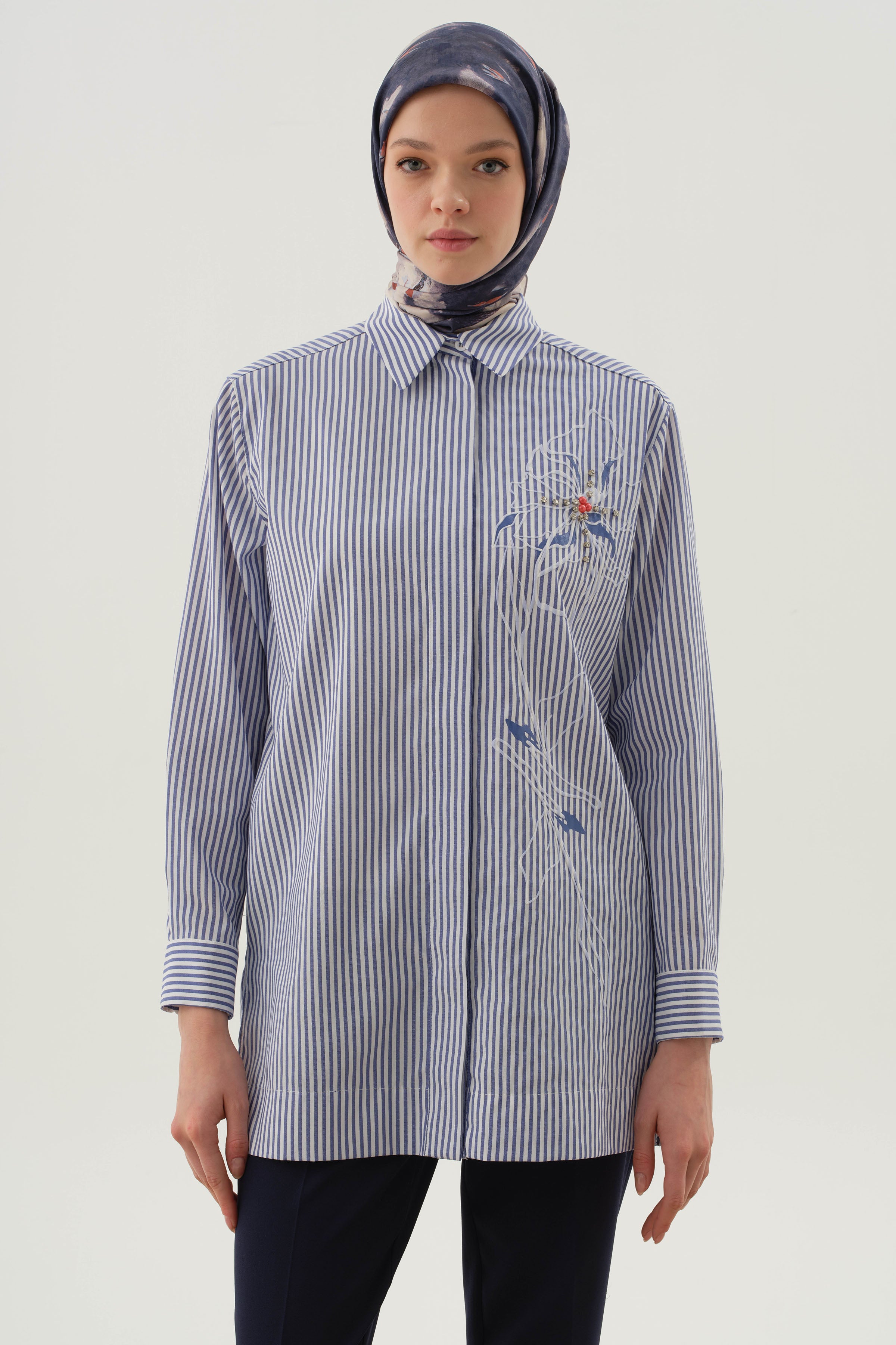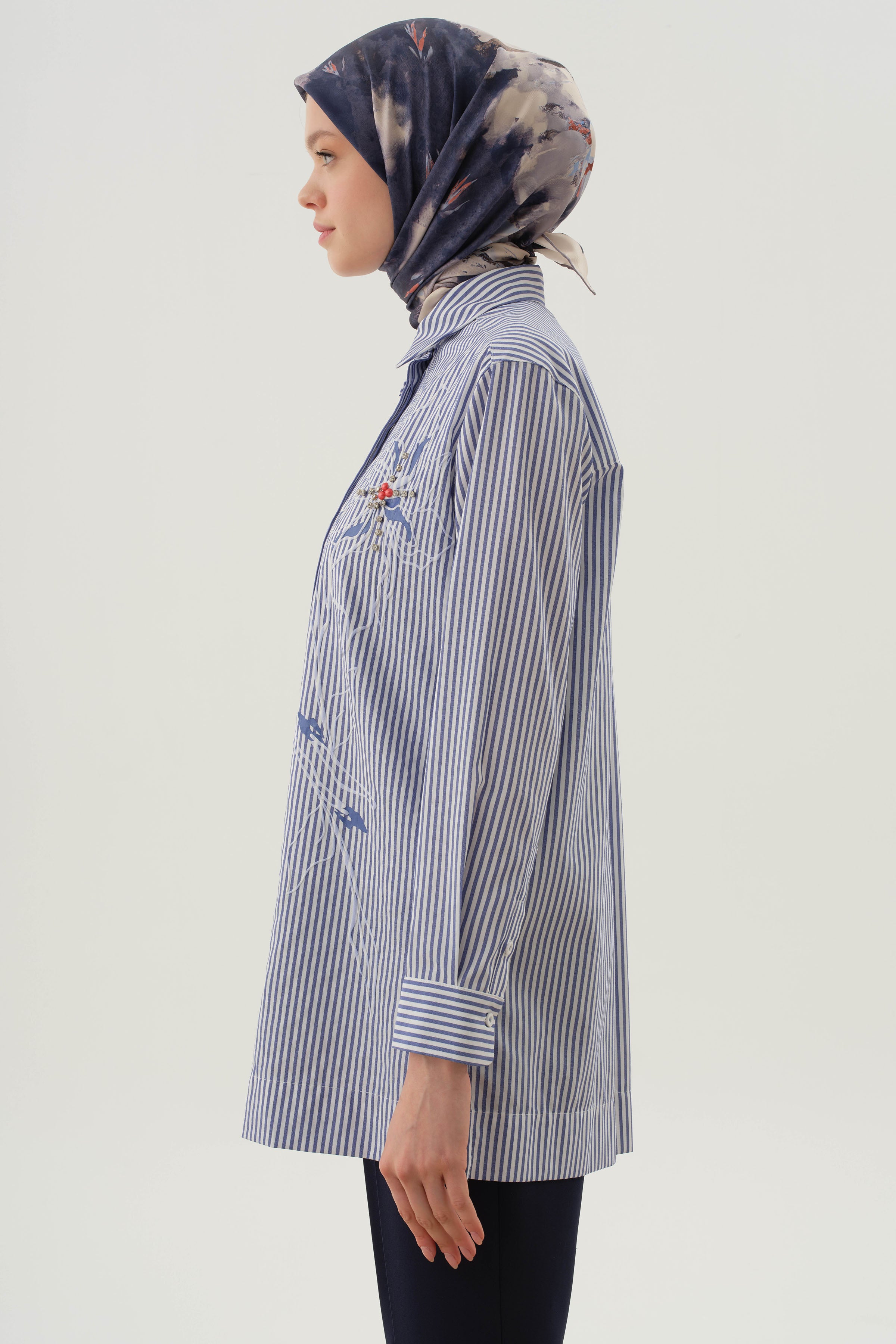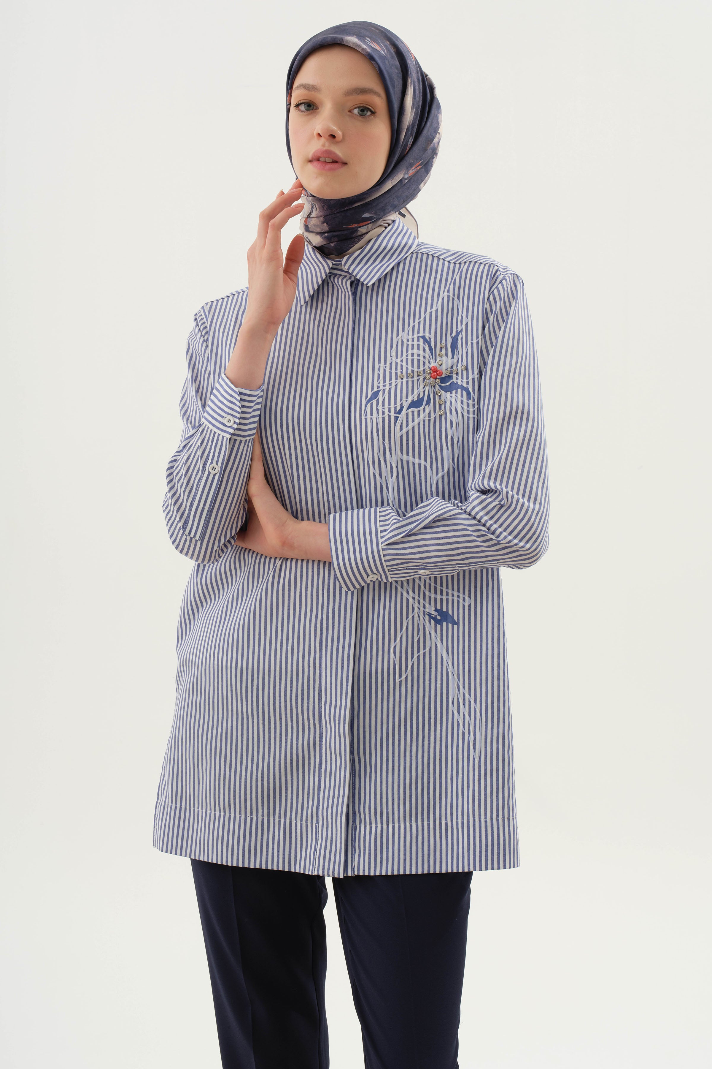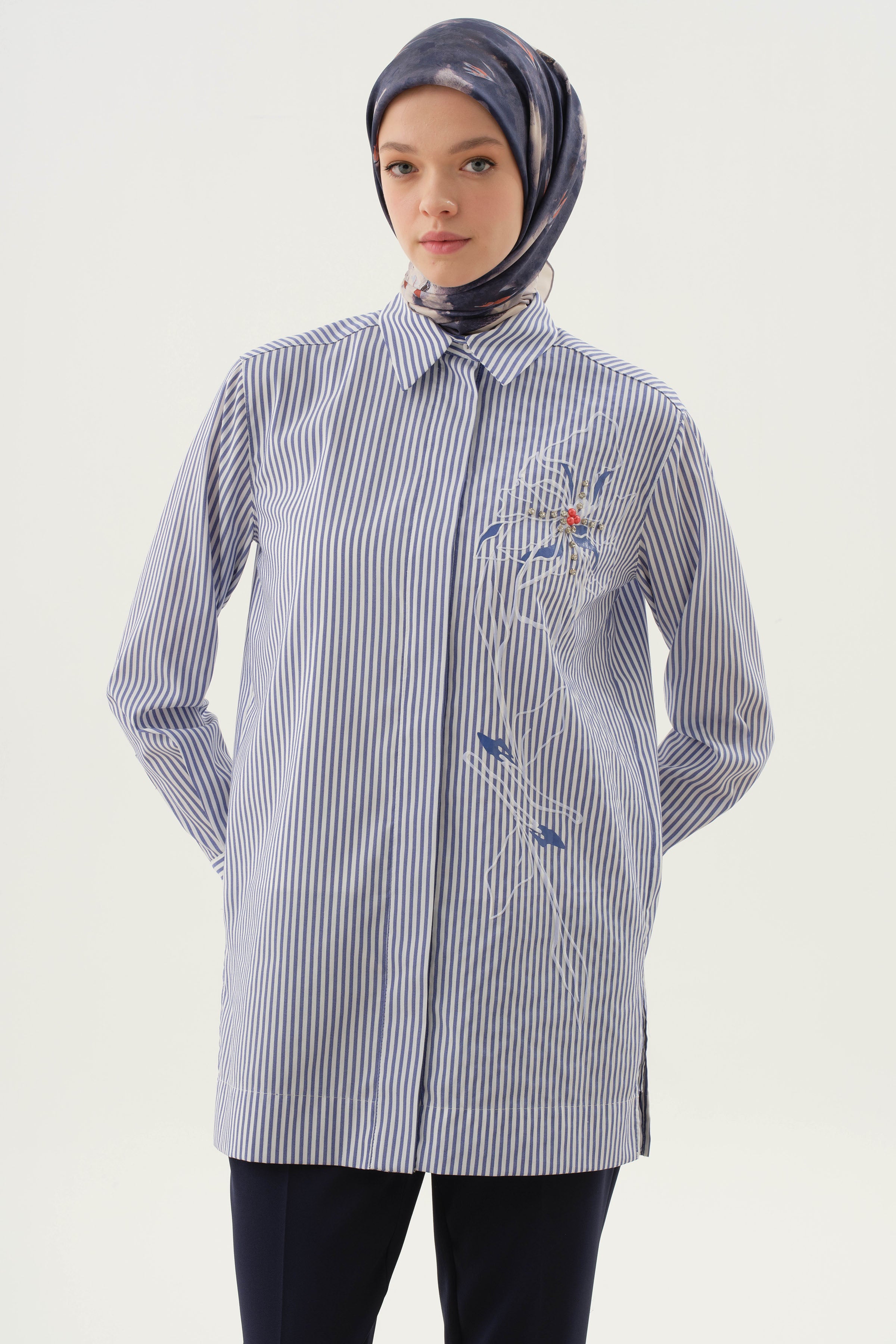 Llamando la atención con sus elegantes detalles en piedras y su patrón de rayas, esta camisa completa la elegancia clásica con toques brillantes. Proporciona comodidad durante todo el día gracias a su tejido ligero. Es una opción ideal tanto para combinaciones casuales como elegantes.