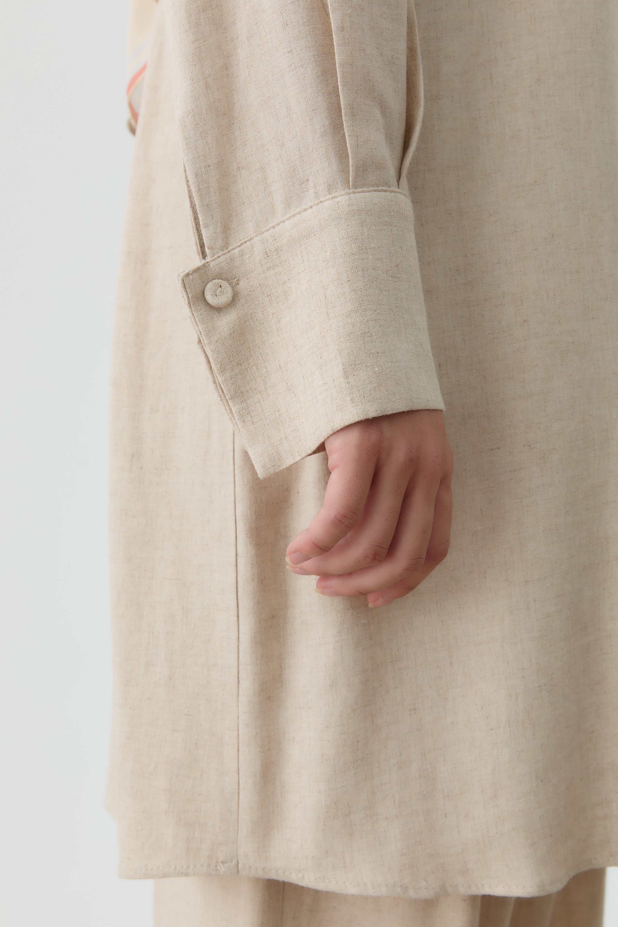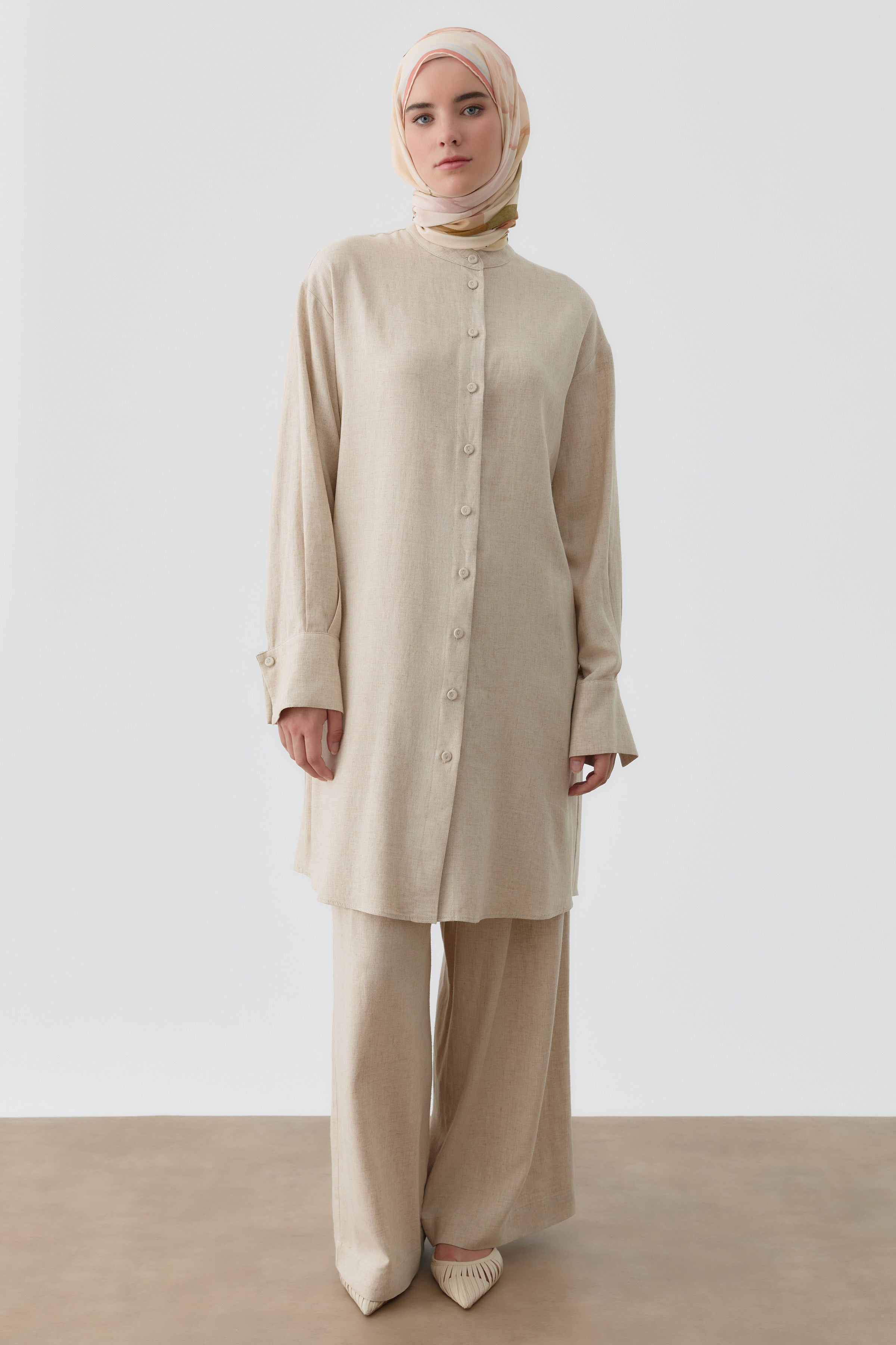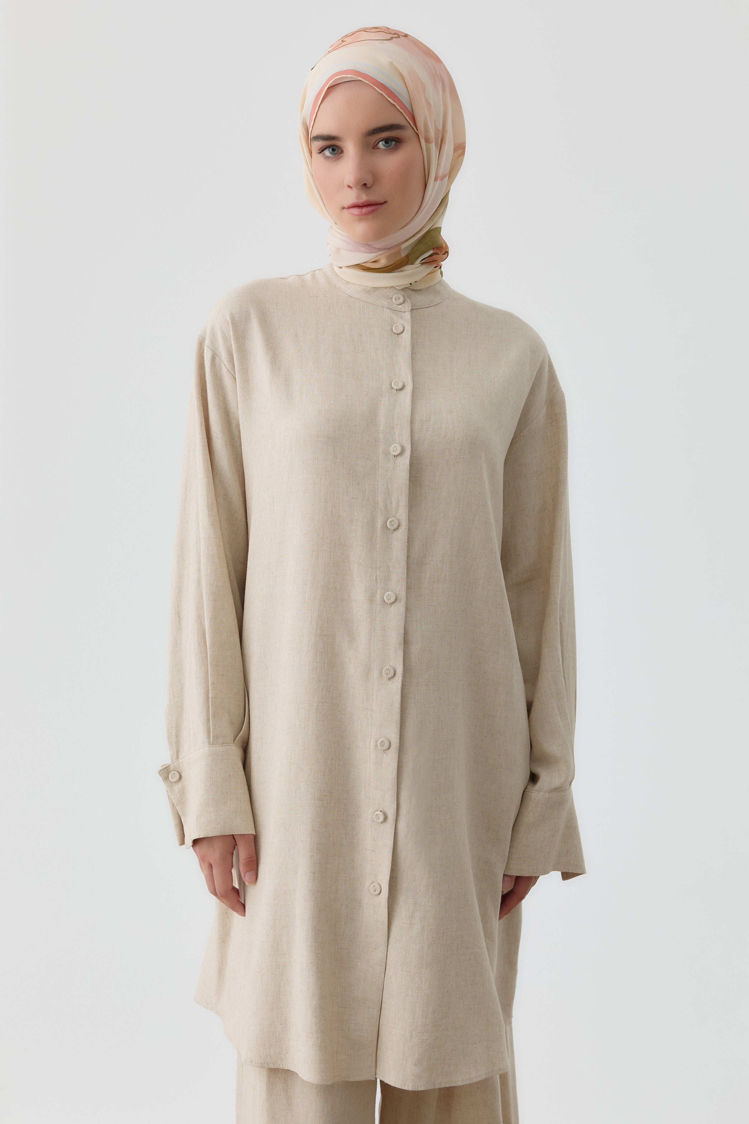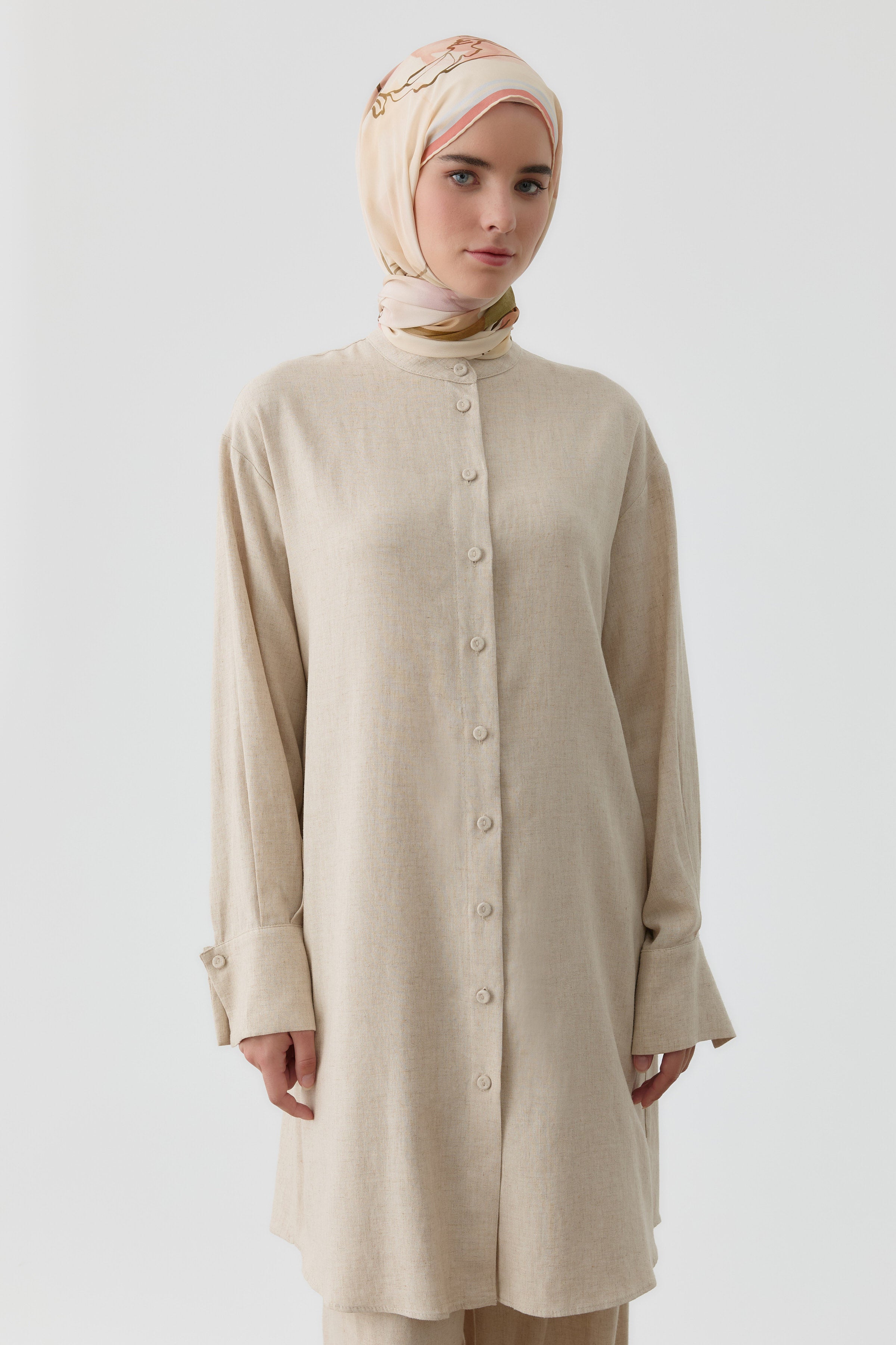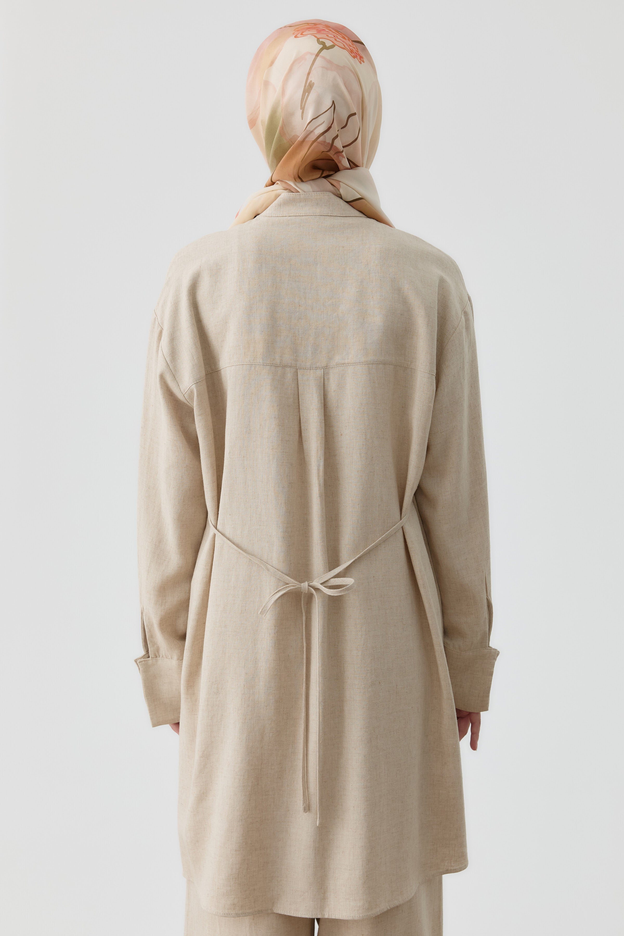 Esta túnica, con su detalle de lazo en la cintura, crea una silueta elegante y moderna, y ofrece un estilo femenino. Su tejido fluido garantiza comodidad durante todo el día, mientras que su diseño minimalista combina fácilmente con diferentes conjuntos.