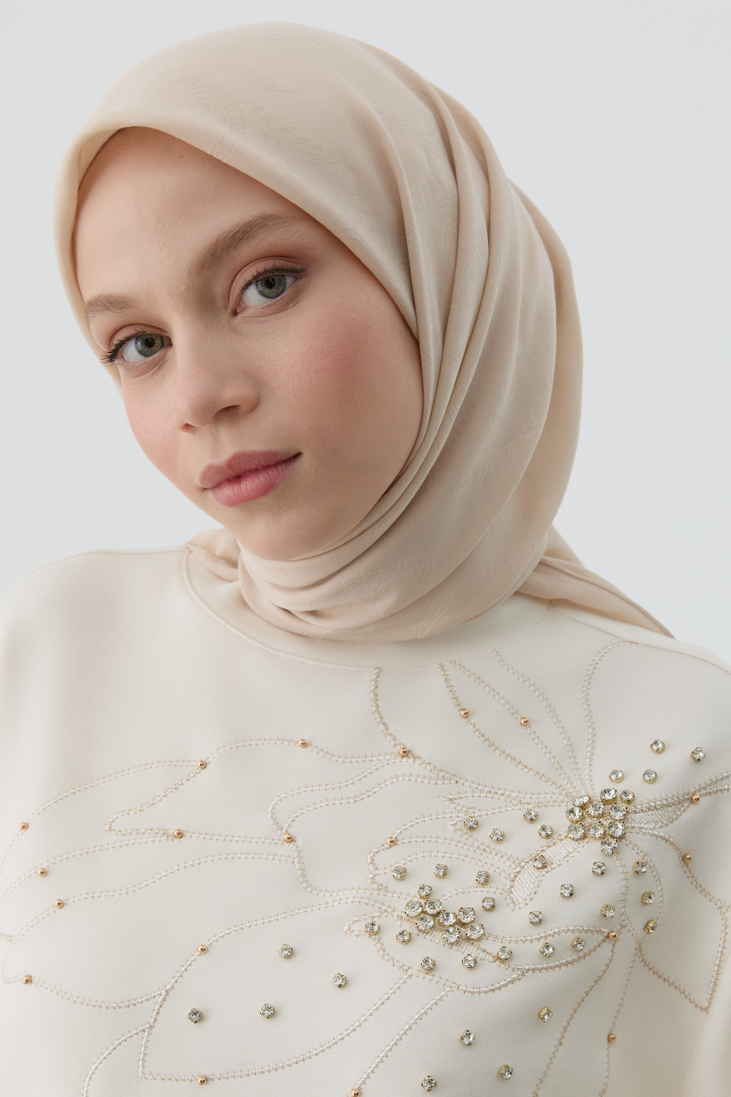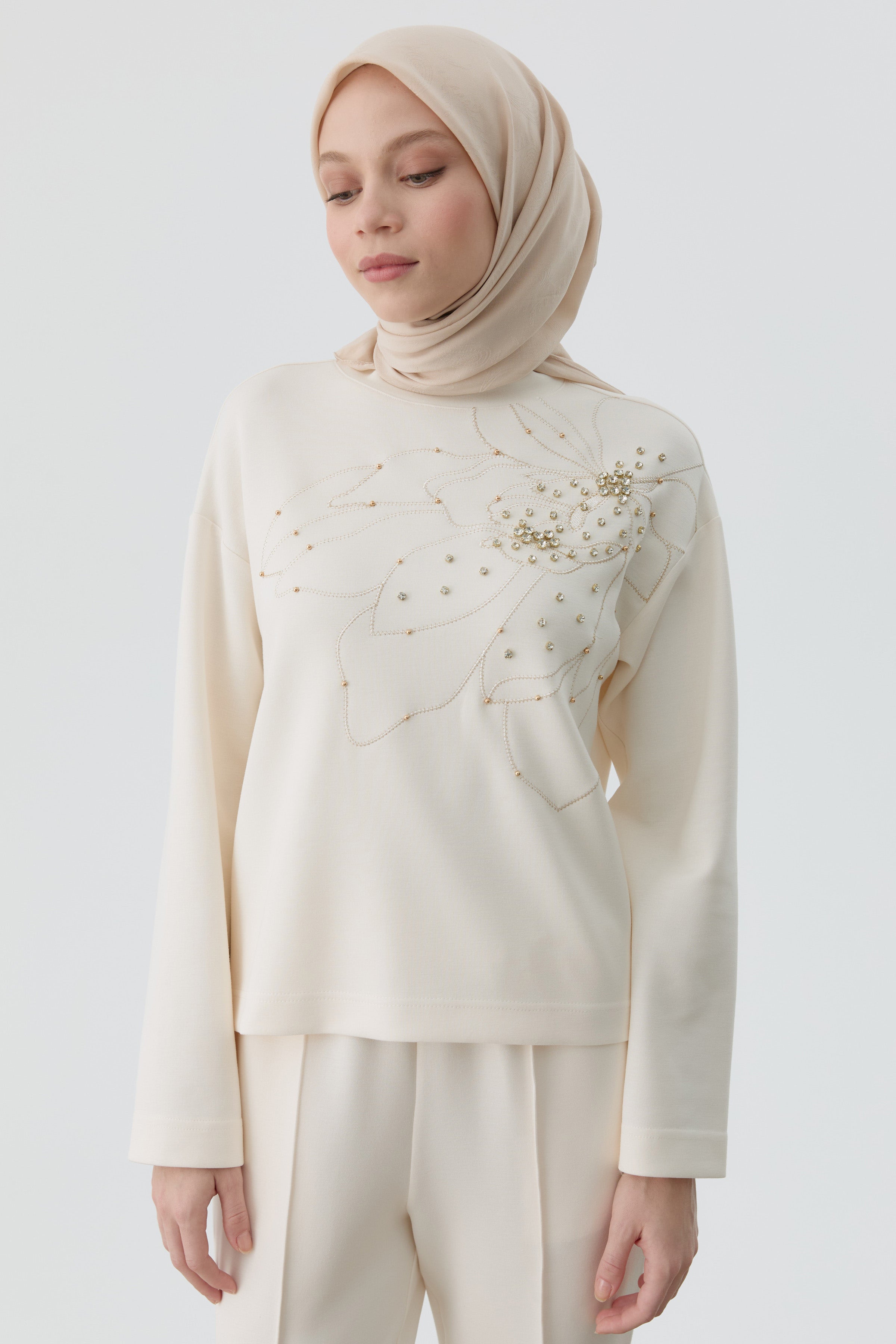 Si bien proporciona comodidad durante todo el día gracias a su suave tejido de punto, ofrece un aspecto llamativo con sus bordados y detalles de piedras cuidadosamente elaborados.