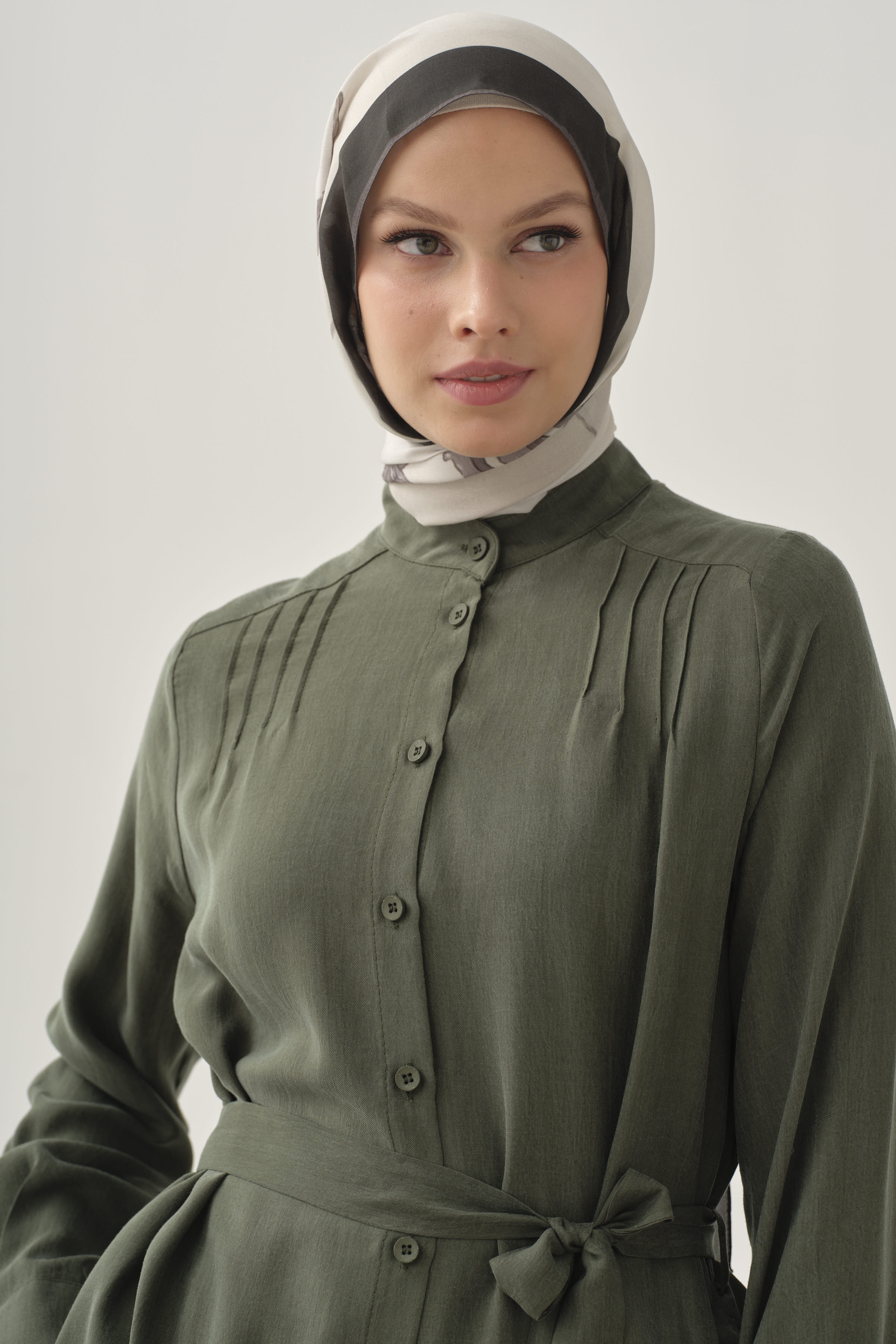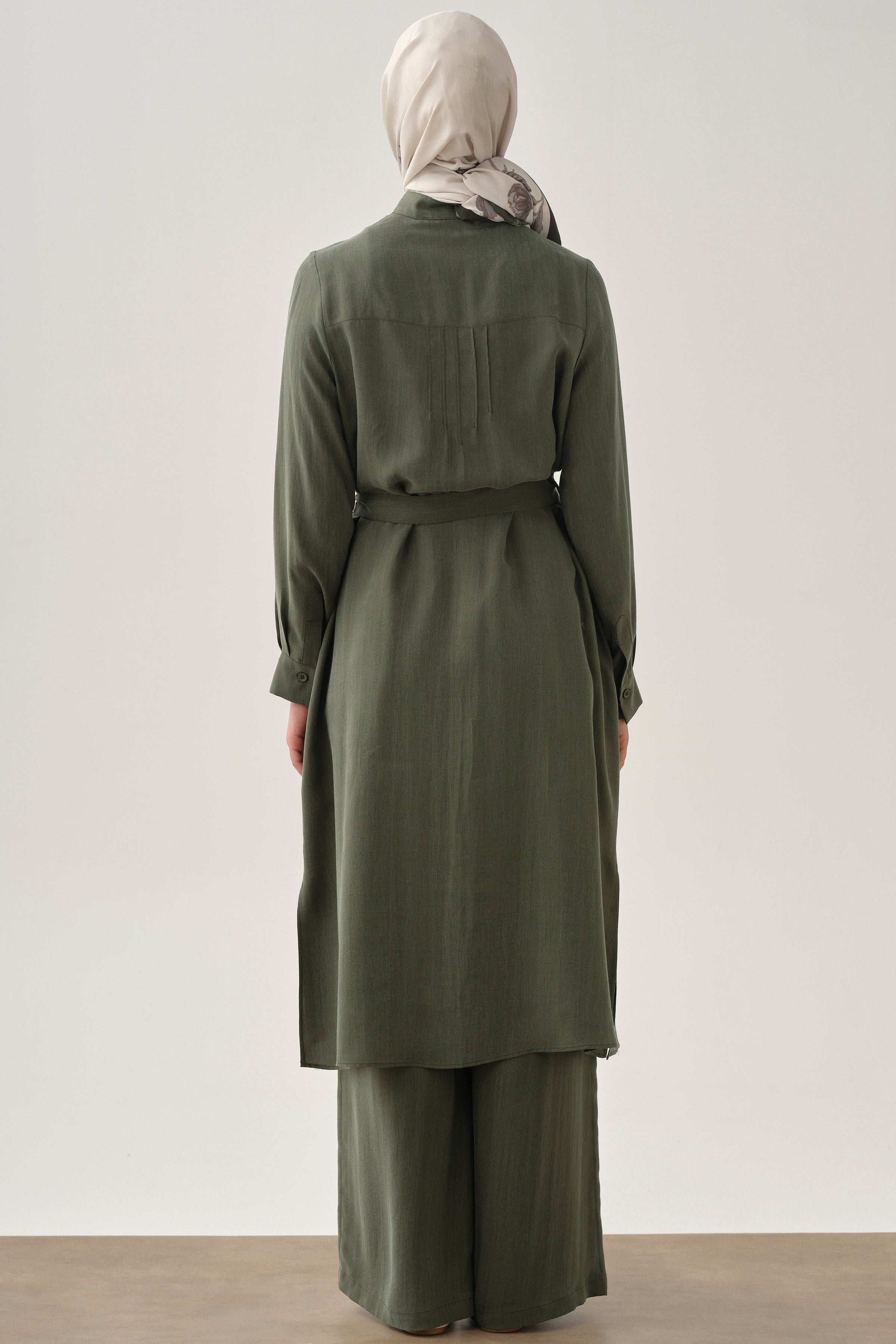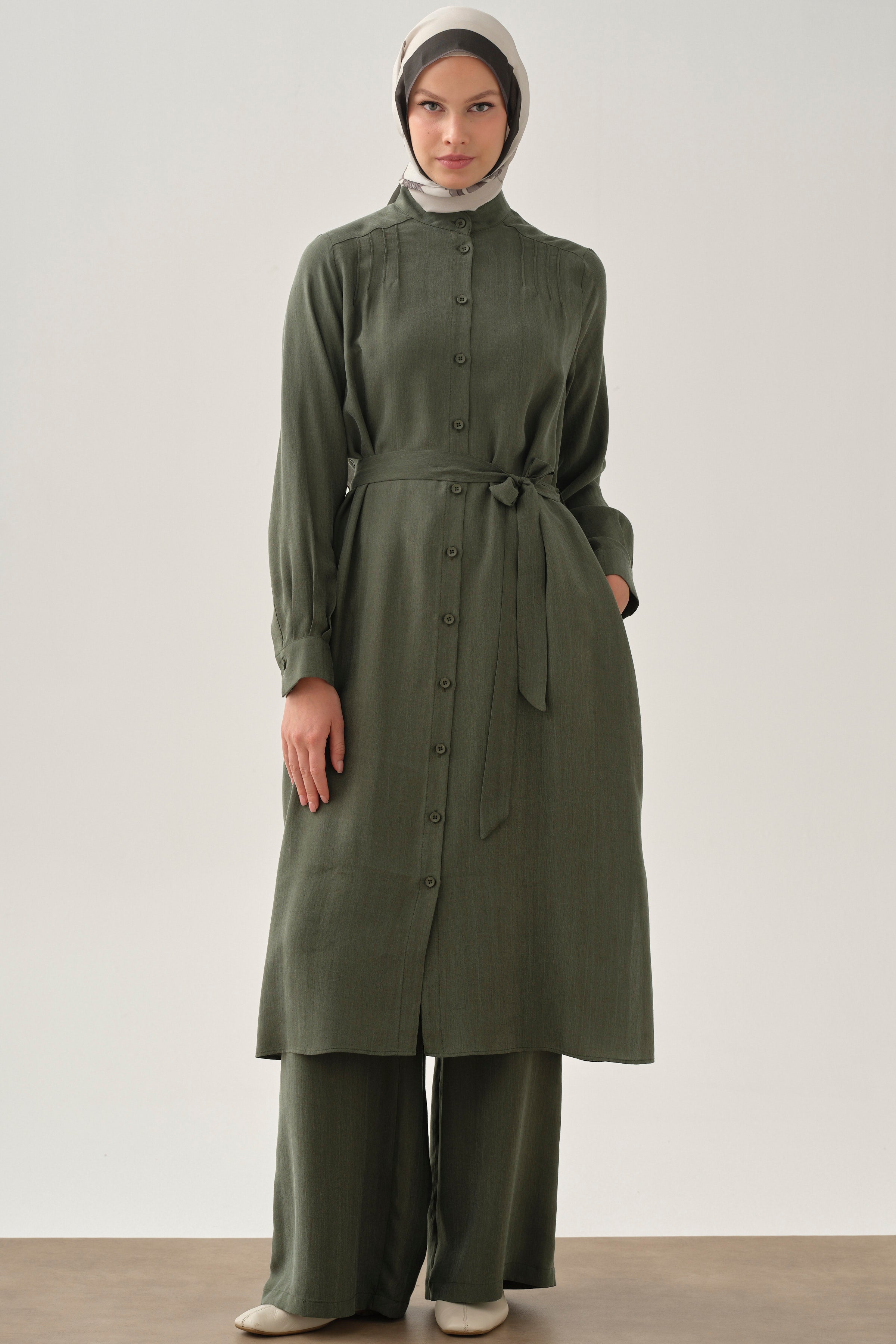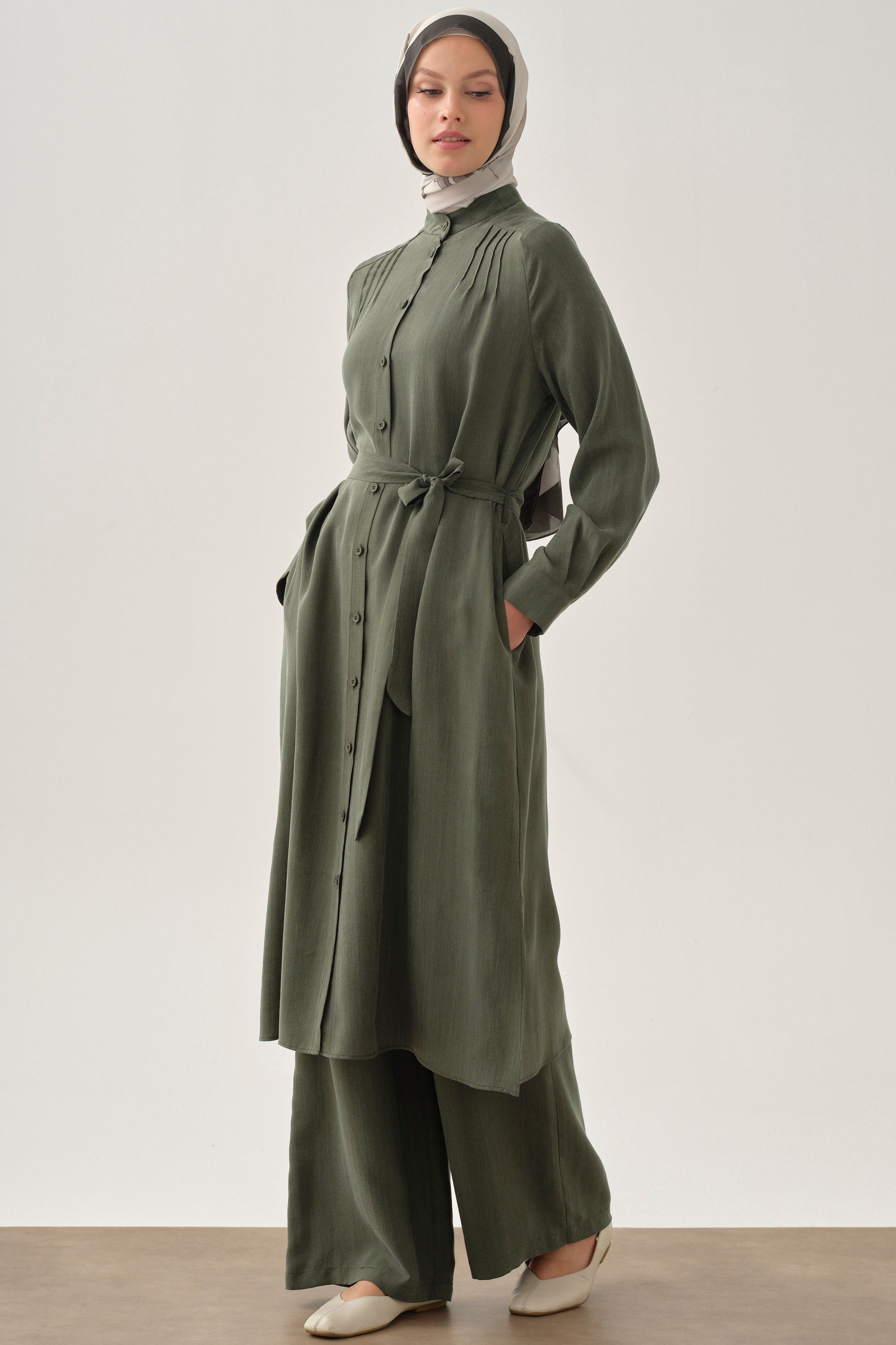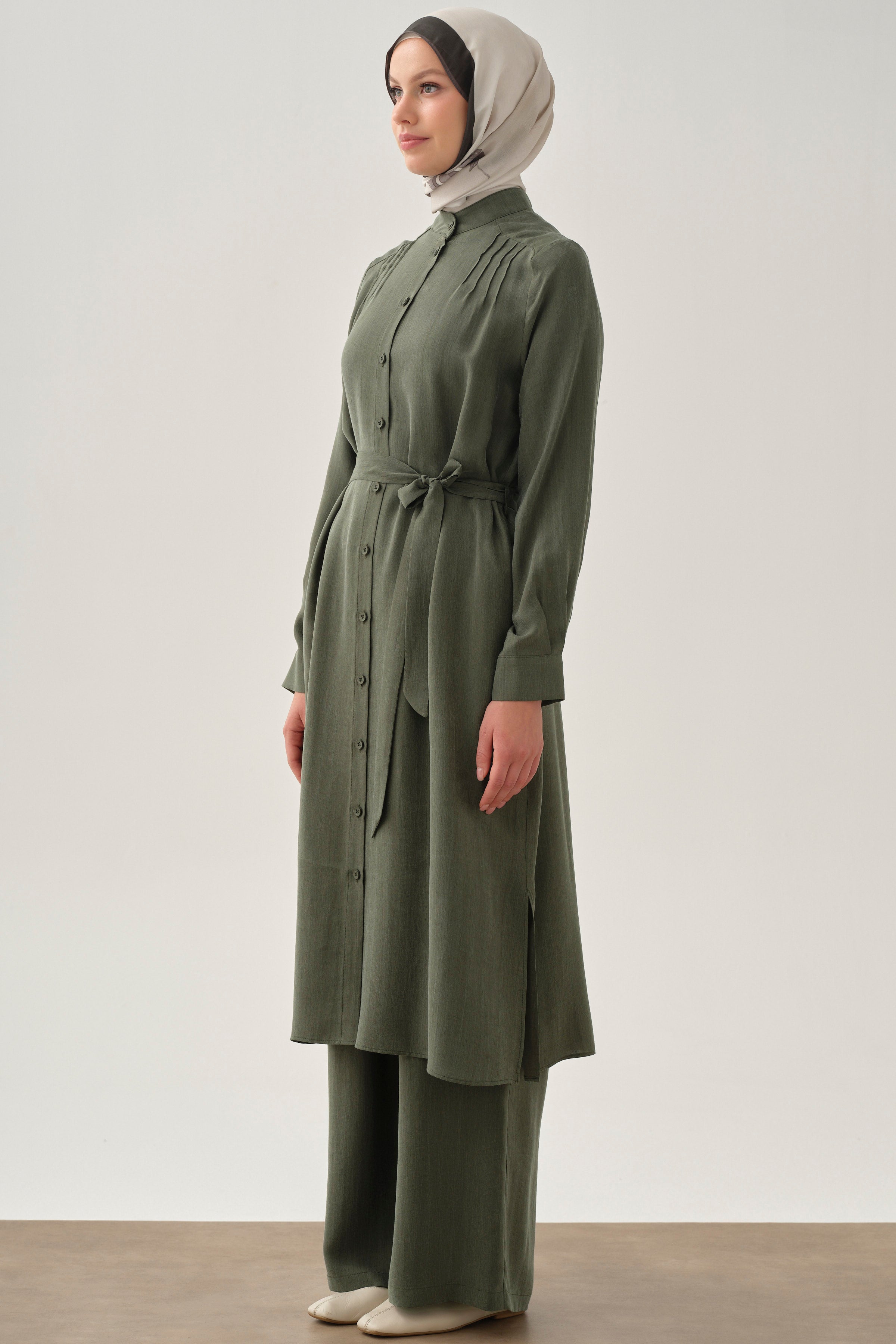 Esta túnica, que gana en movimiento gracias a las costuras acanaladas a lo largo del cuerpo delantero, ofrece un aspecto cómodo y elegante con su forma larga y estructura fluida.