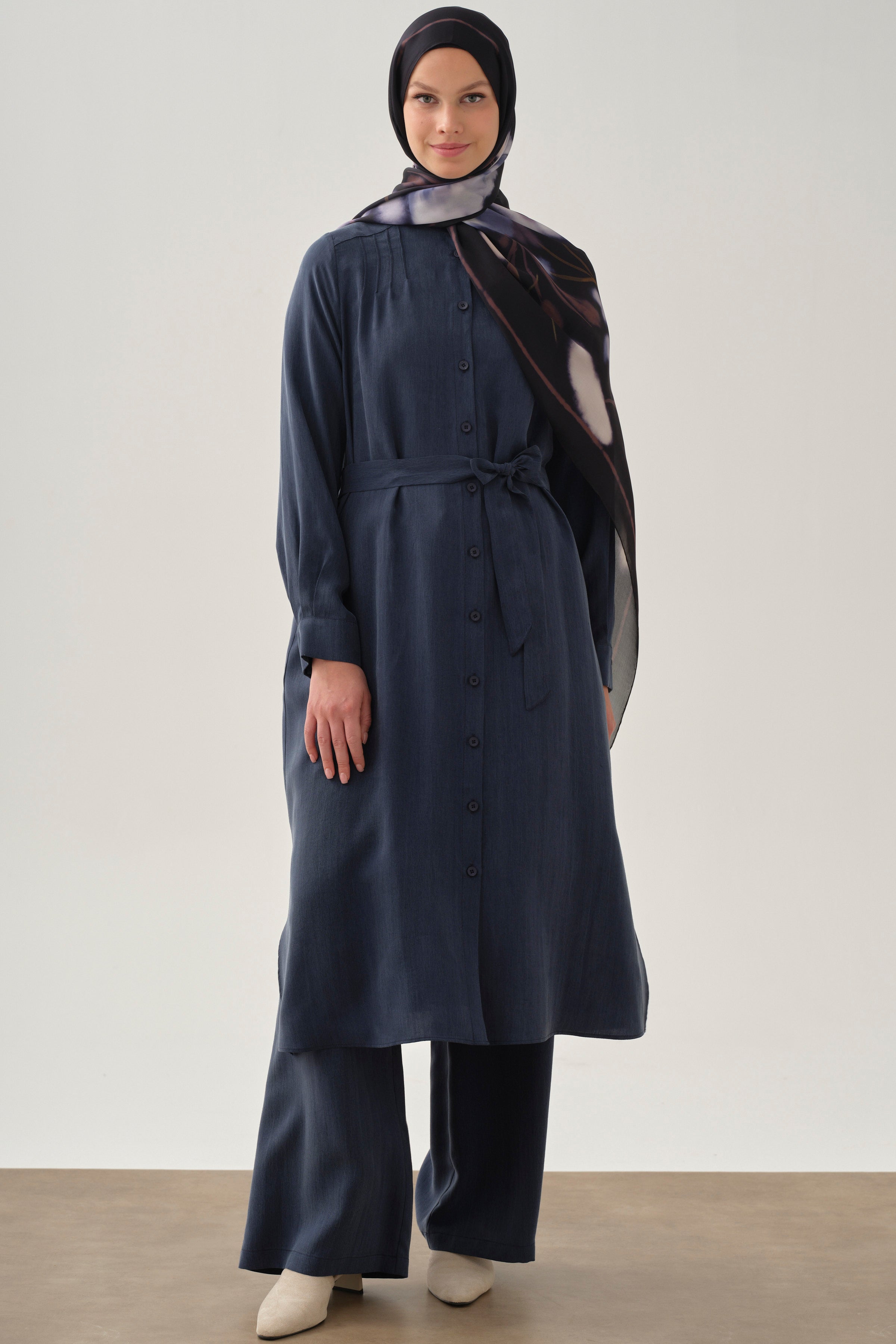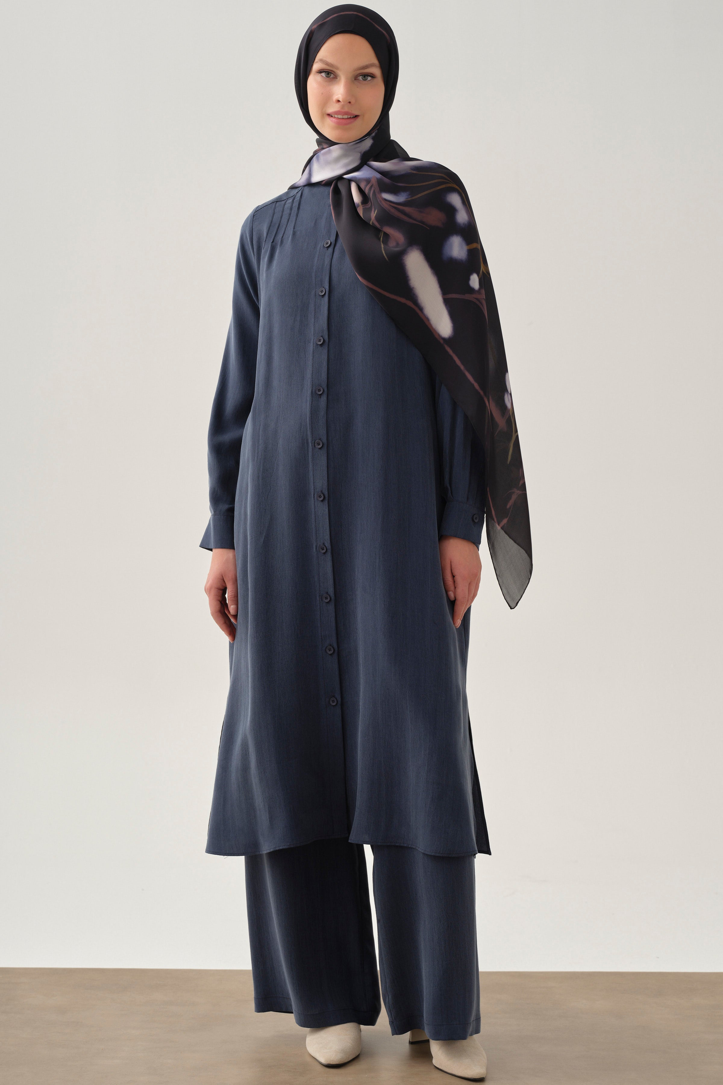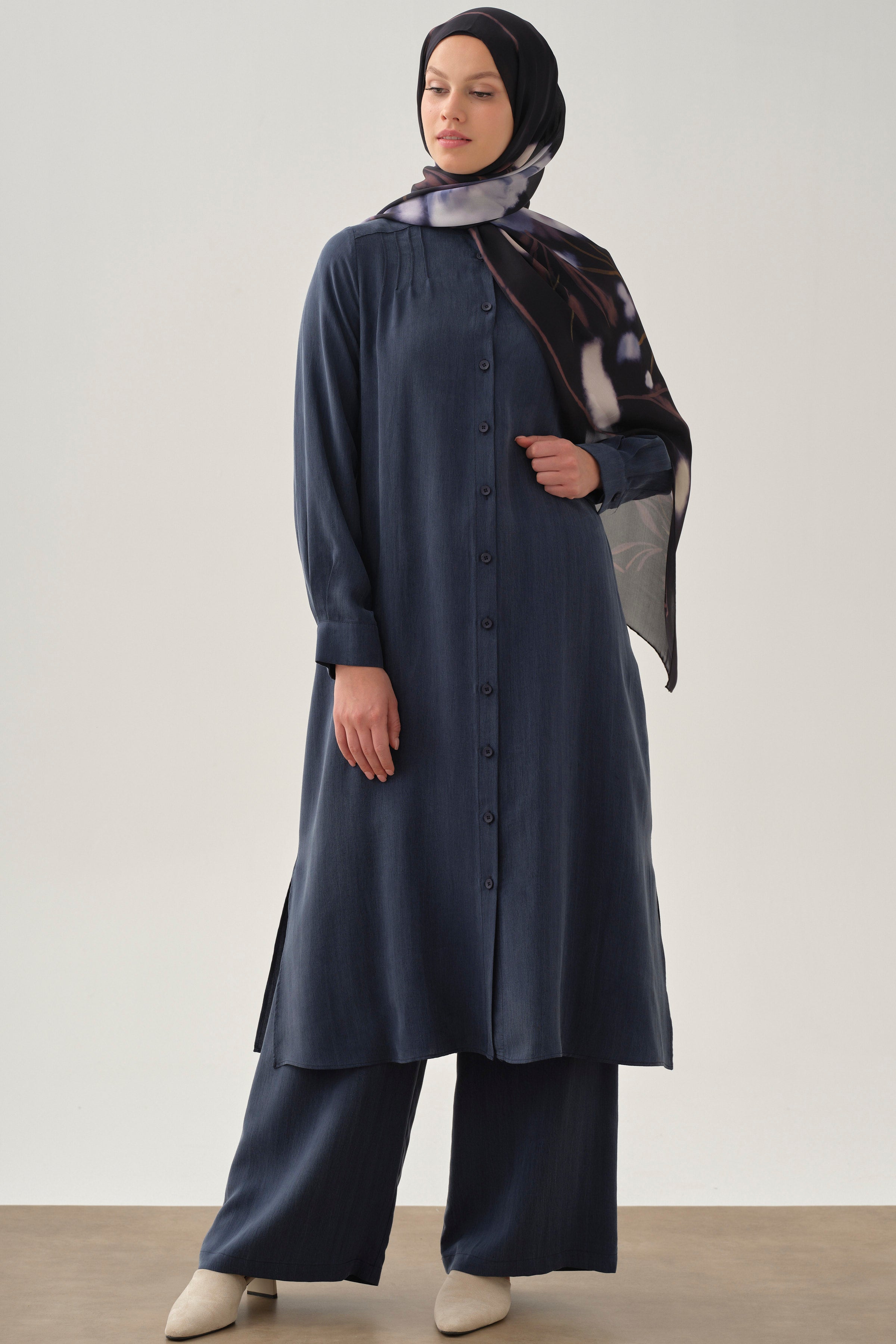 Esta túnica, que gana en movimiento gracias a las costuras acanaladas a lo largo del cuerpo delantero, ofrece un aspecto cómodo y elegante con su forma larga y estructura fluida.