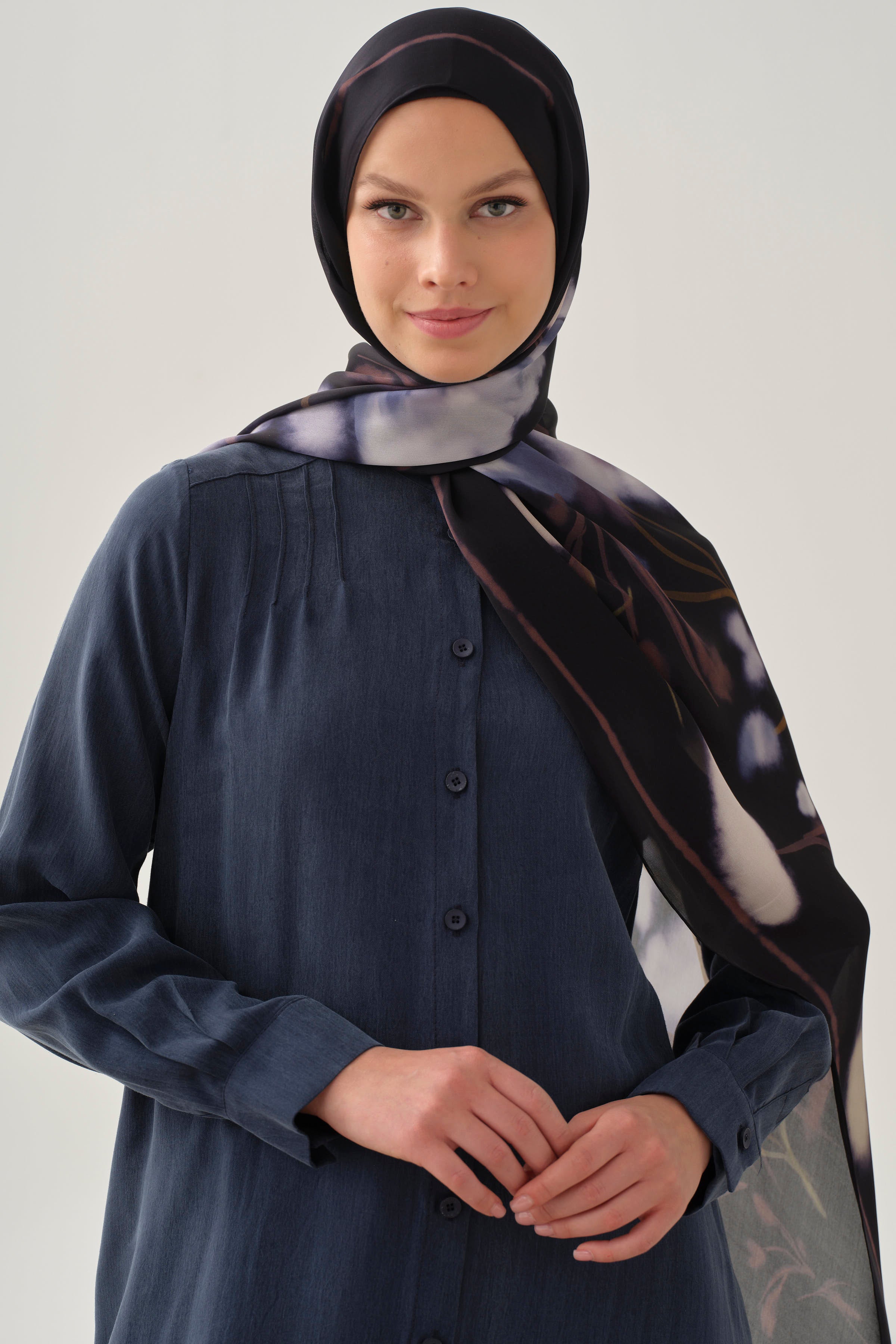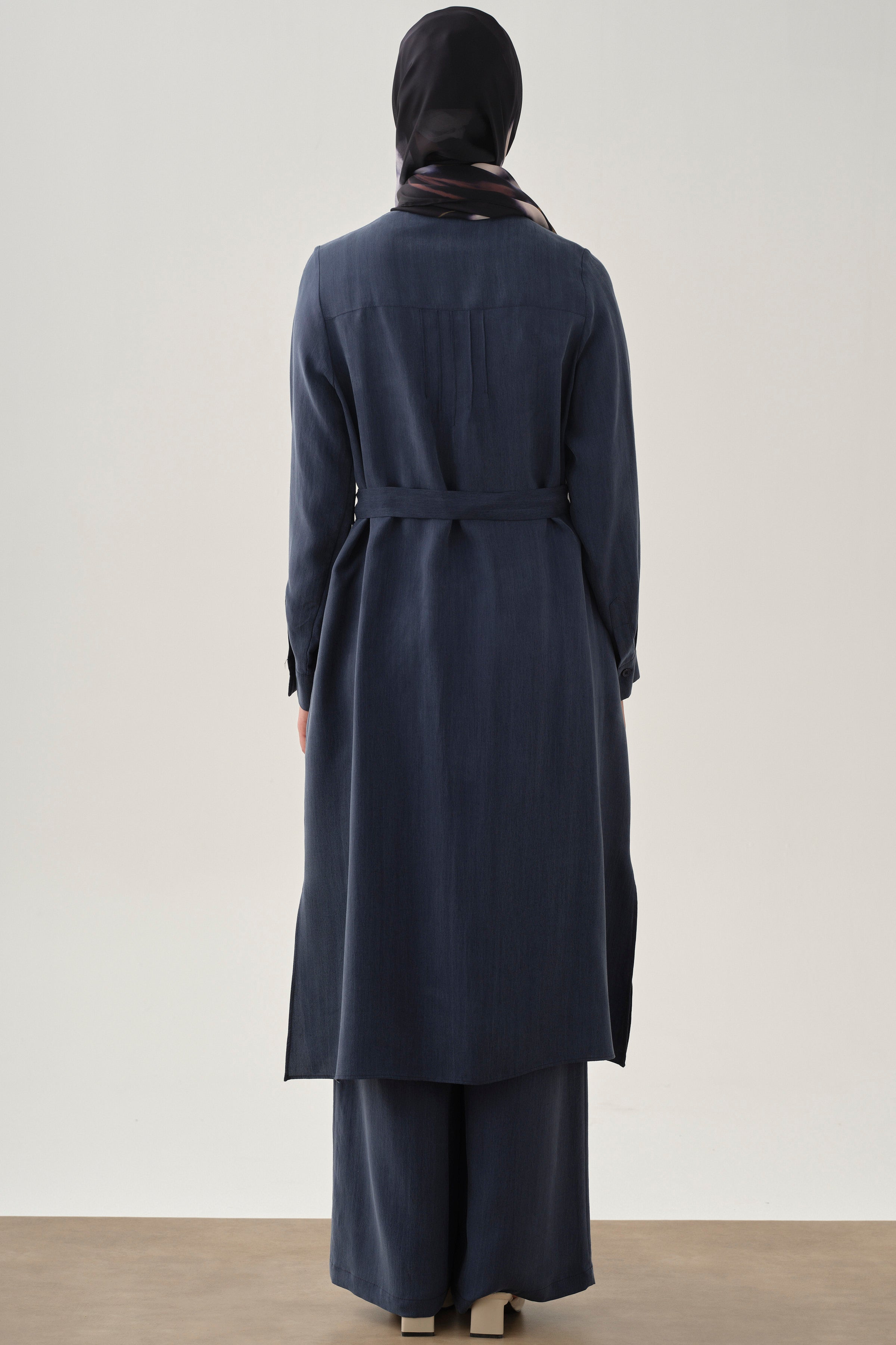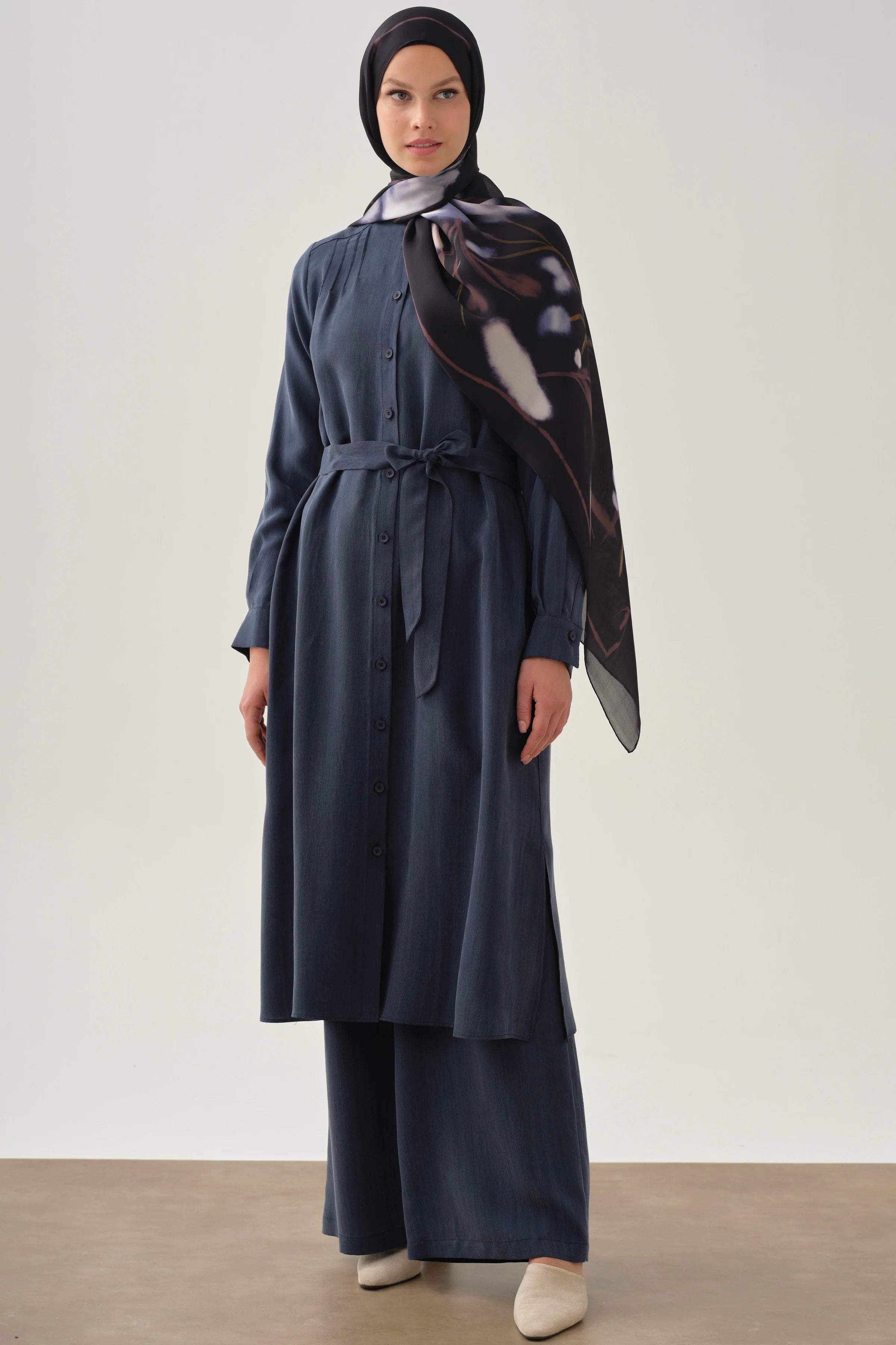Esta túnica, que gana en movimiento gracias a las costuras acanaladas a lo largo del cuerpo delantero, ofrece un aspecto cómodo y elegante con su forma larga y estructura fluida.