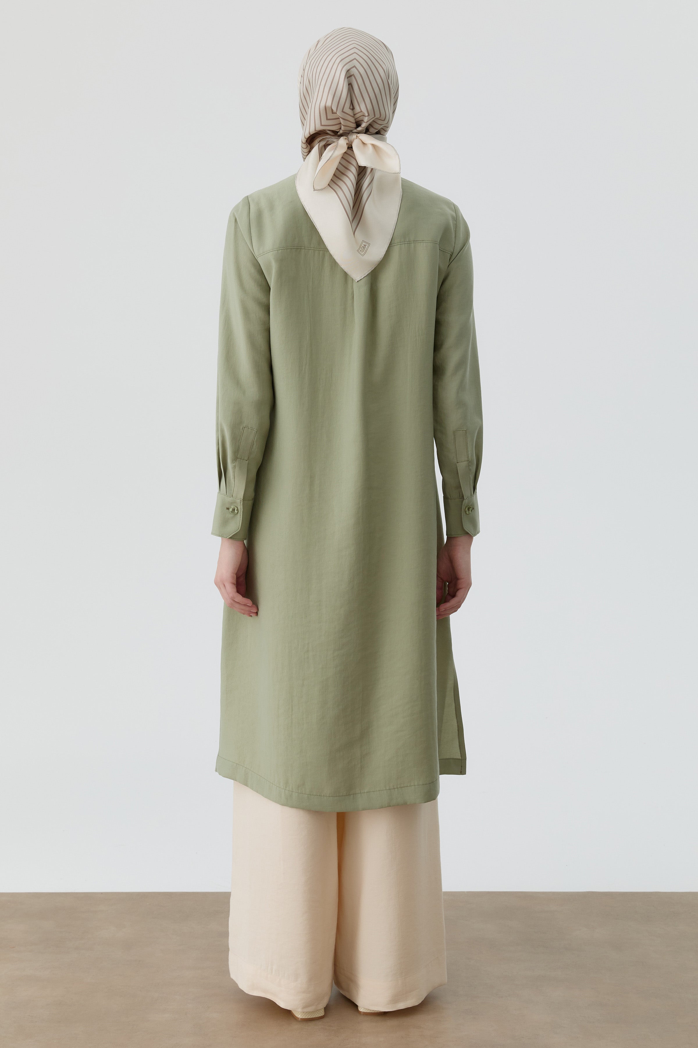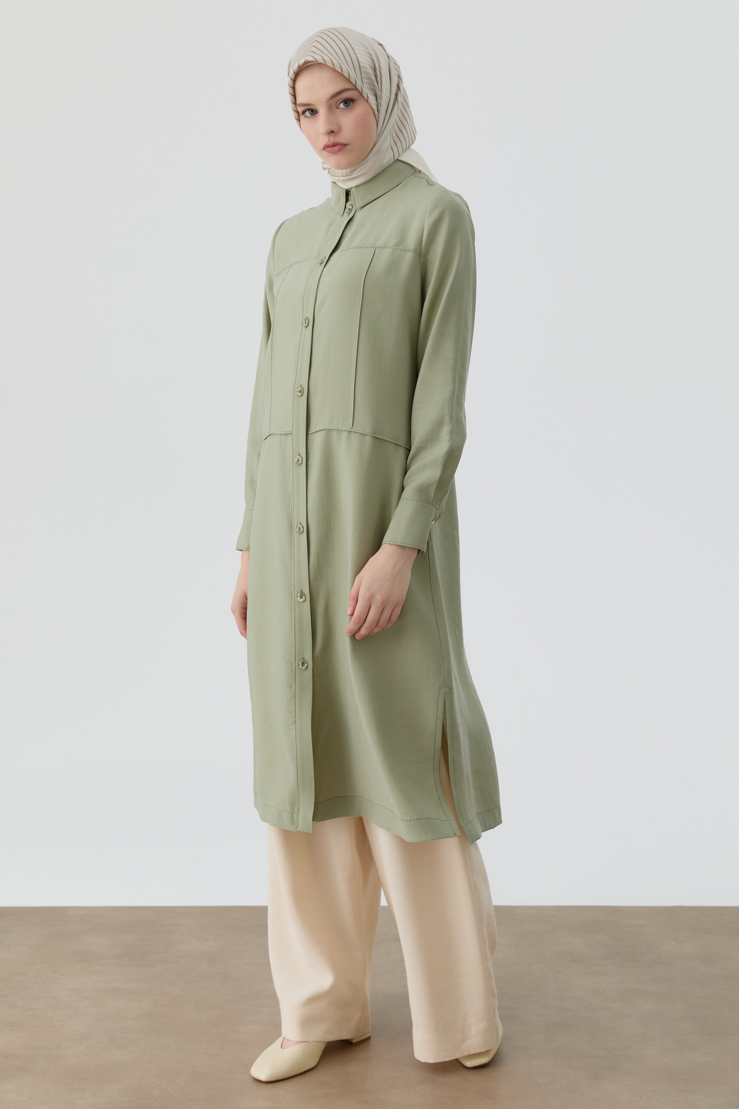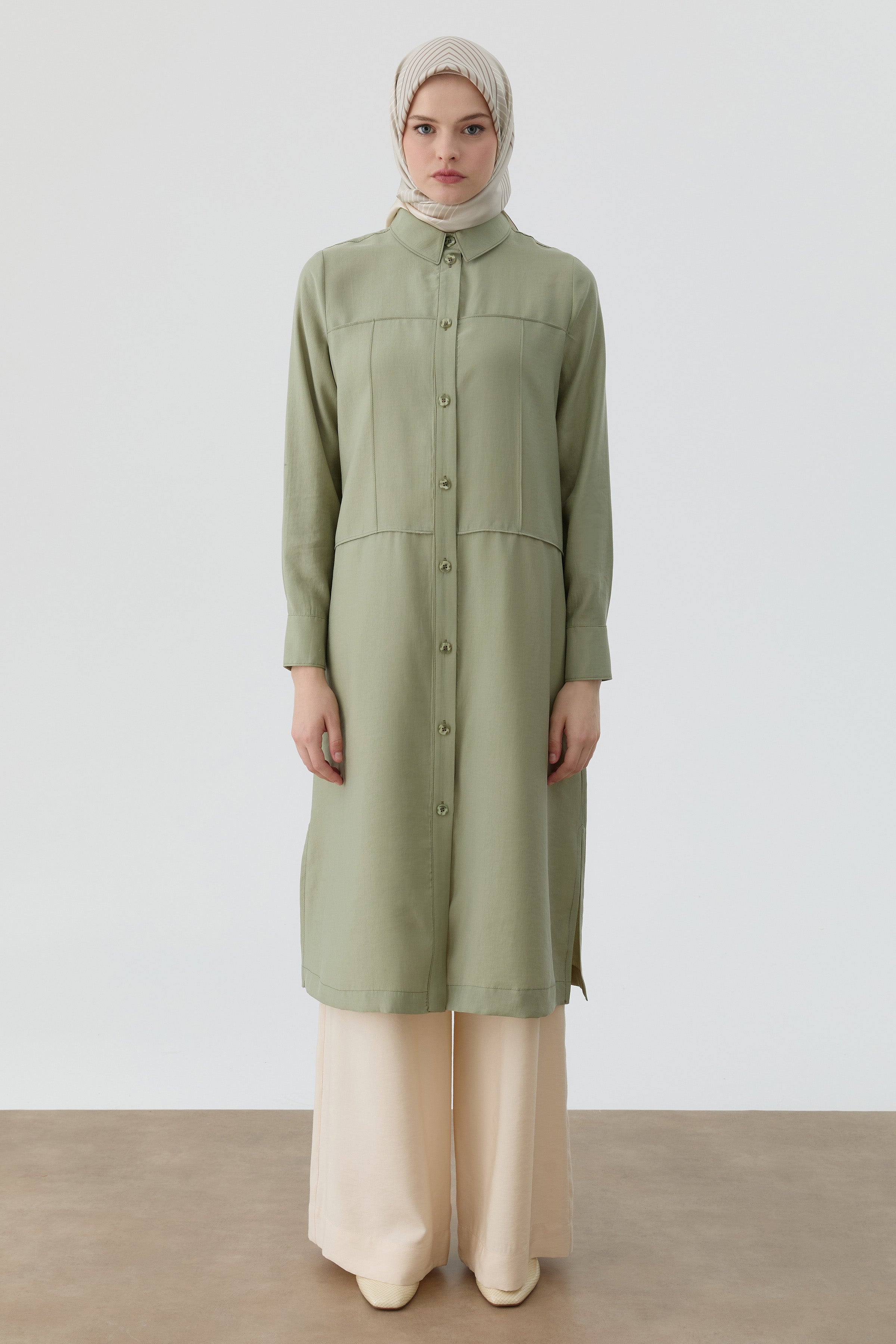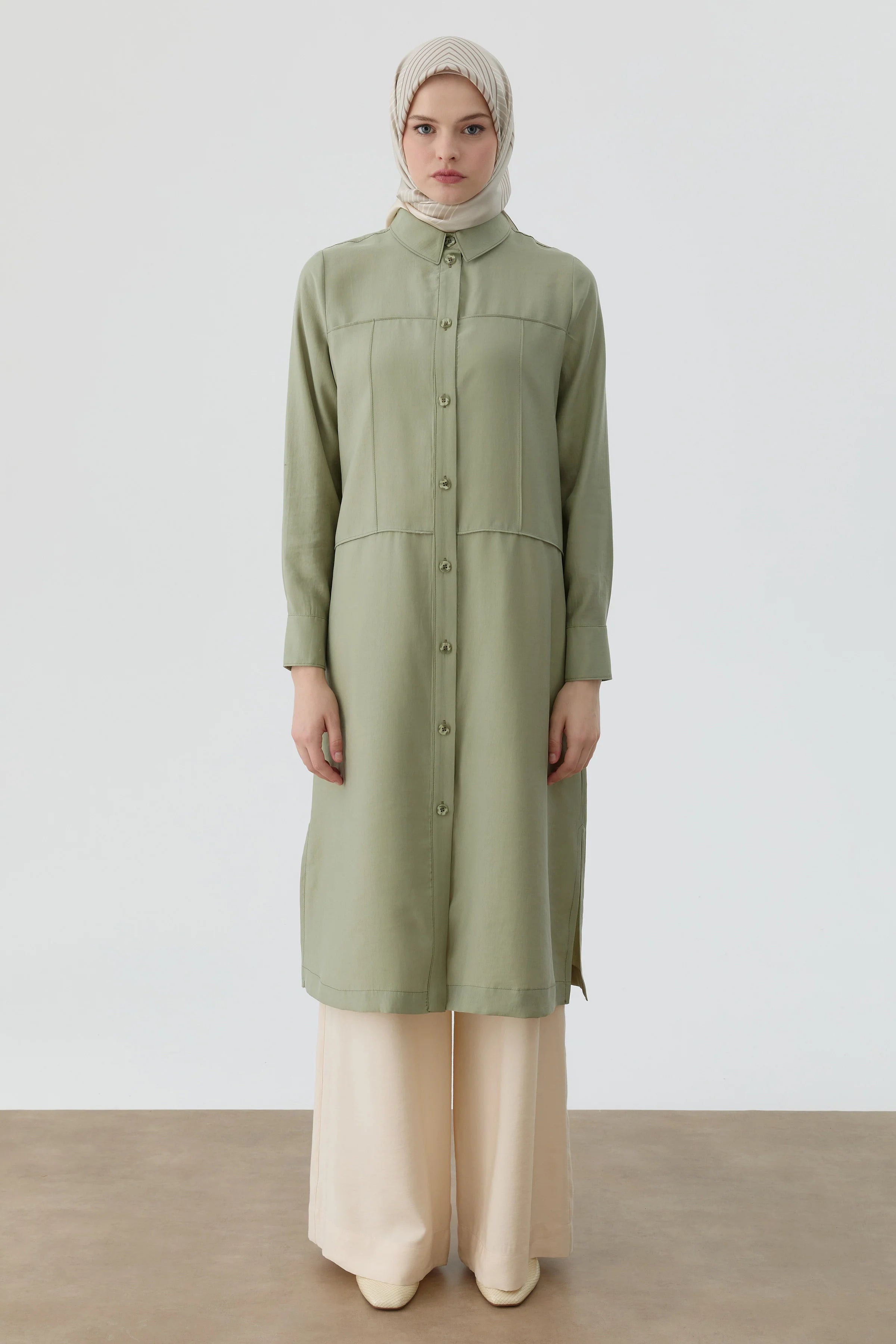 Los detalles de corte acanalado en la parte delantera del cuerpo añaden un toque moderno y único a la forma de la túnica.