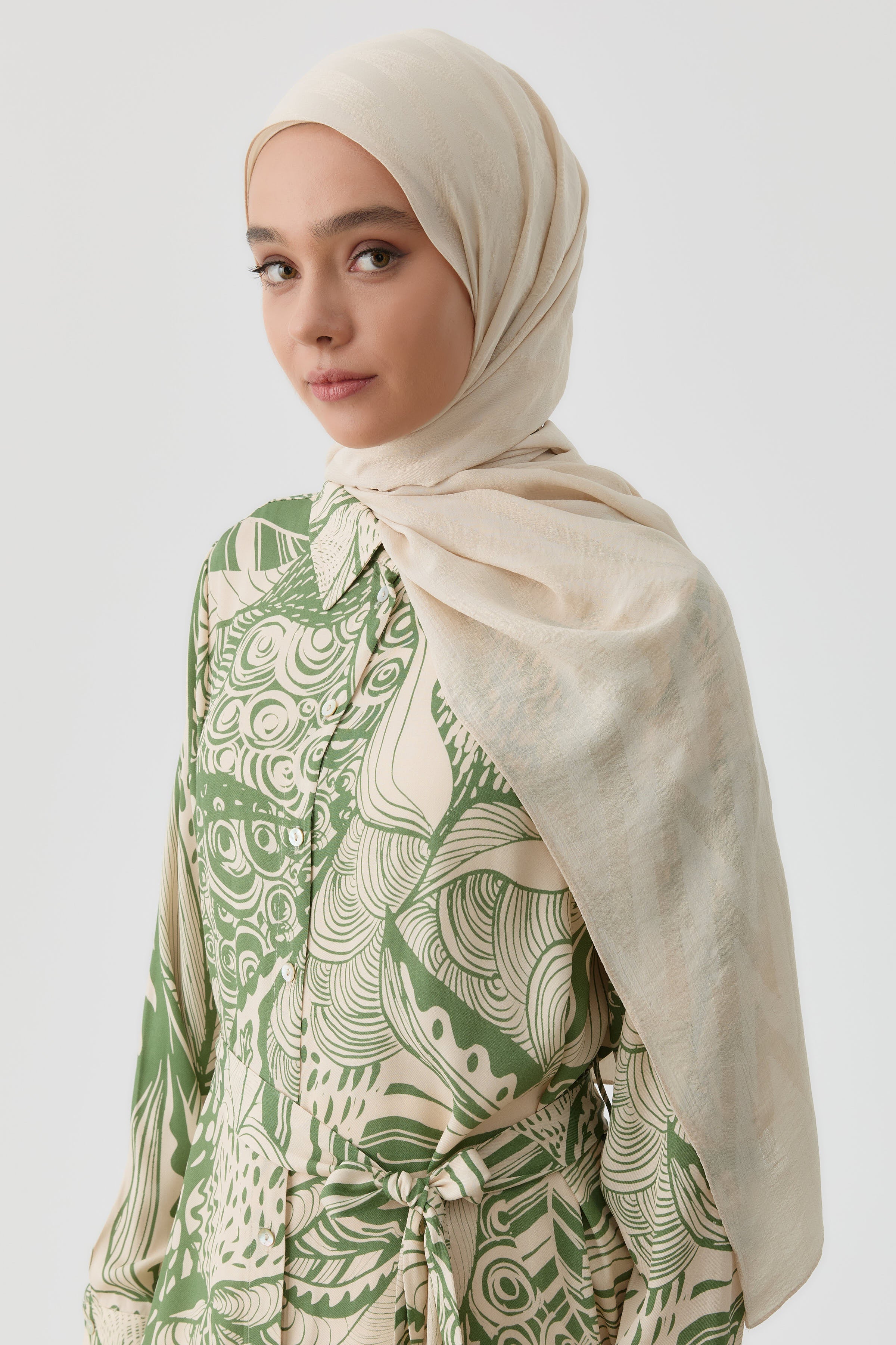 Este chal jacquard, con un moderno estampado en zigzag, aporta un toque de dinamismo y sofisticación a cualquier atuendo. Su textura ligera y fluida garantiza comodidad durante todo el día, mientras que su elegante diseño complementa tu estilo en diversas ocasiones, desde el día a día hasta eventos especiales.