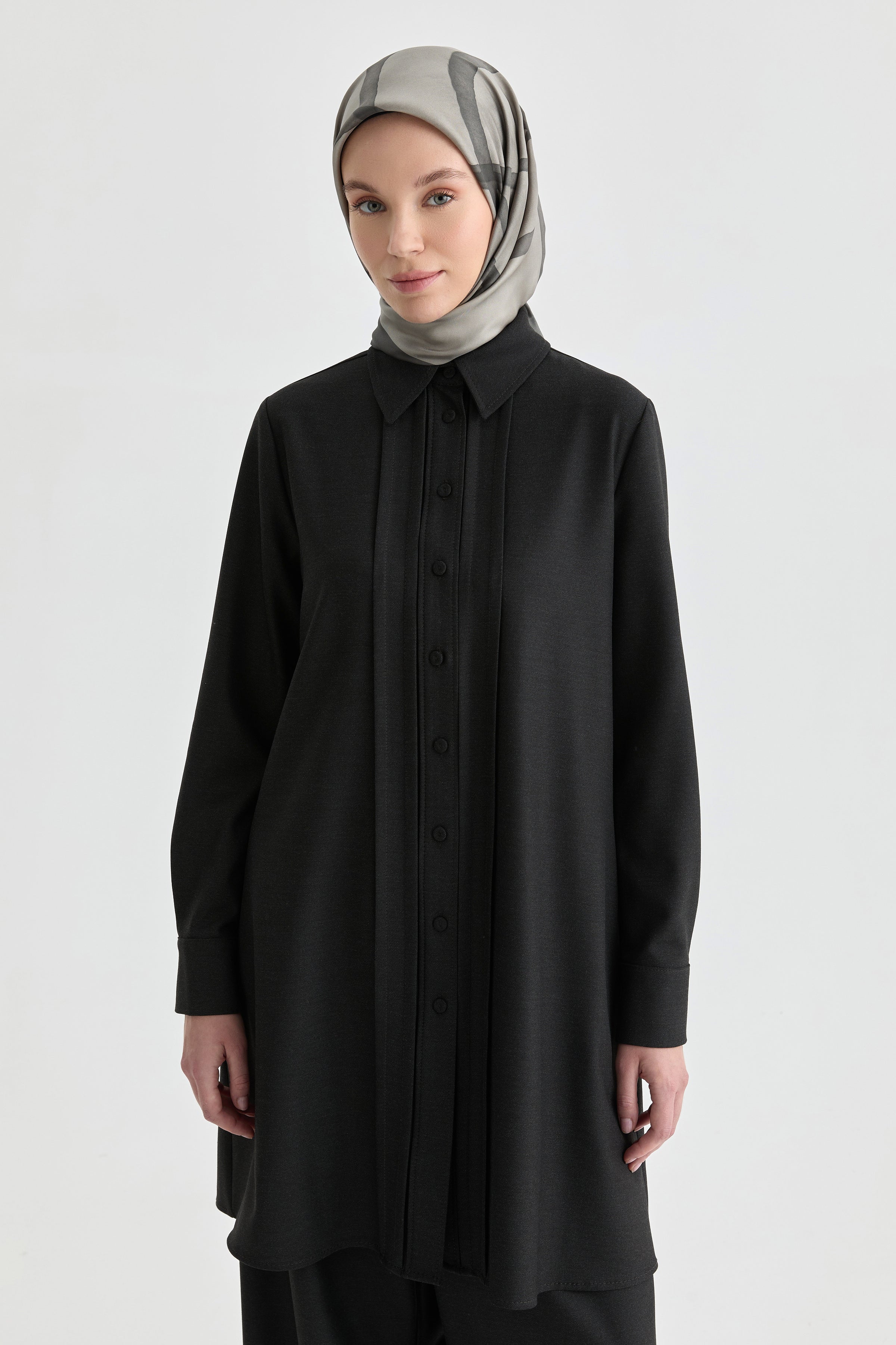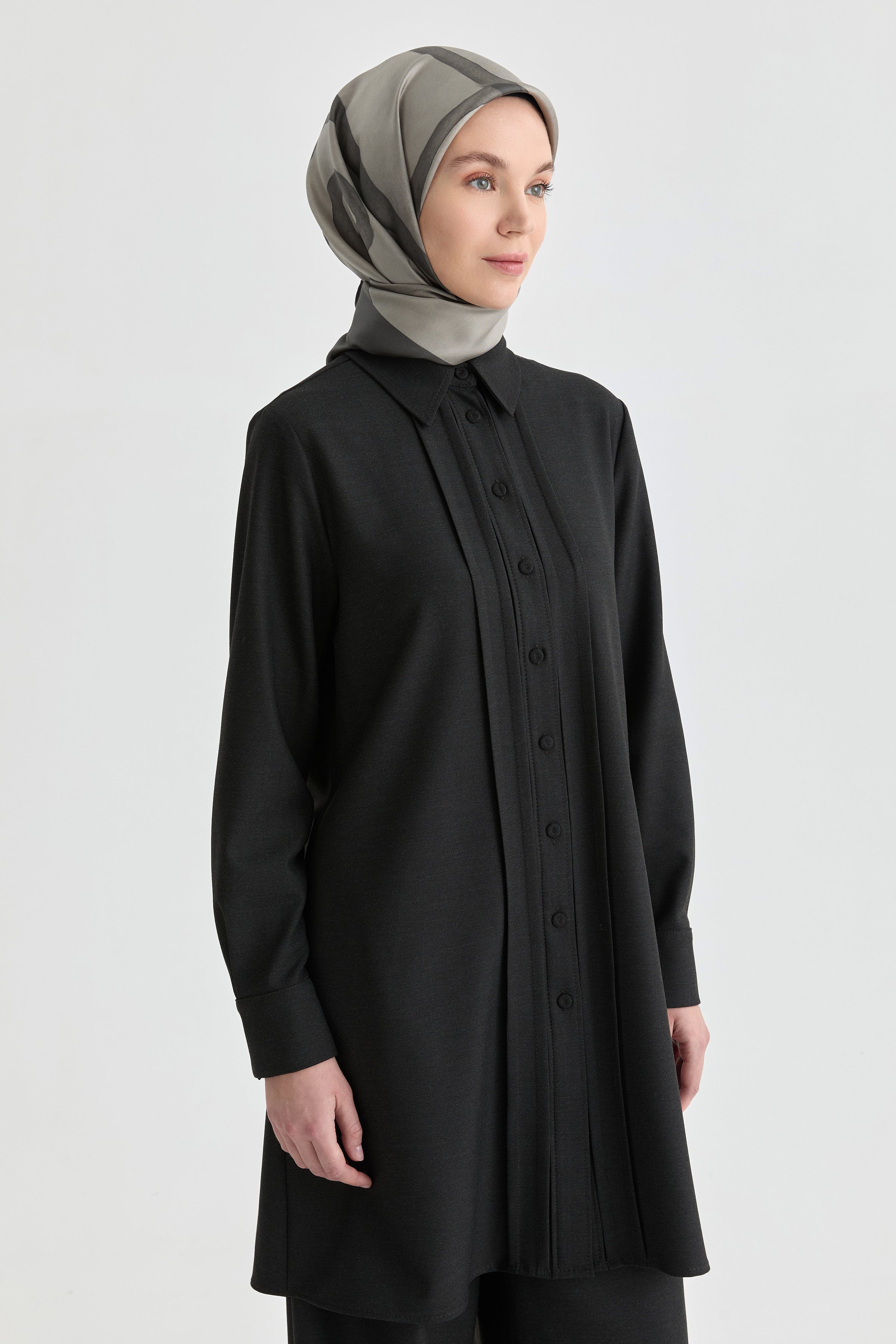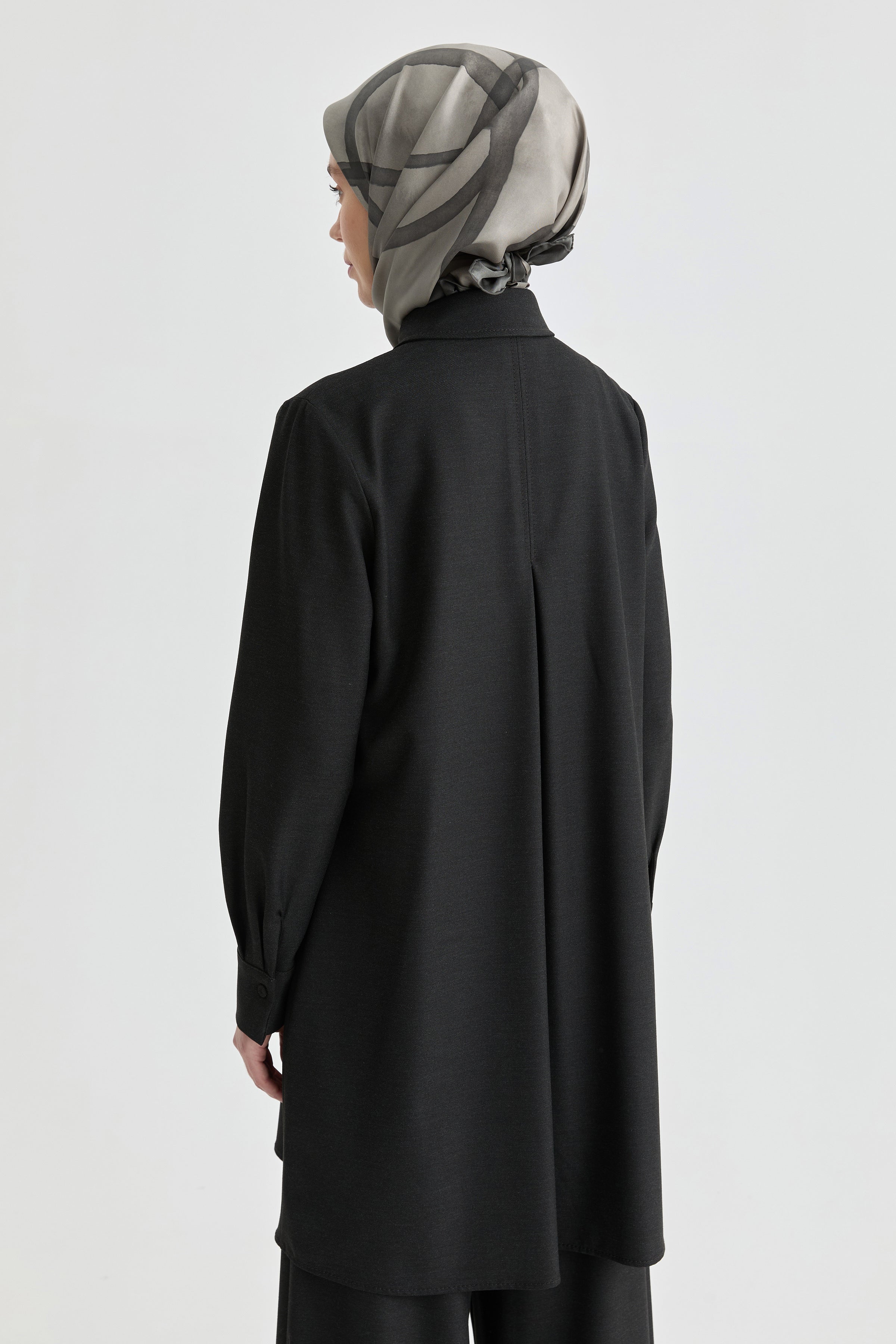 Aller dokusuyla hareket kazanan bu tunik, sade çizgisini incelikli detaylarla zenginleştiriyor.
