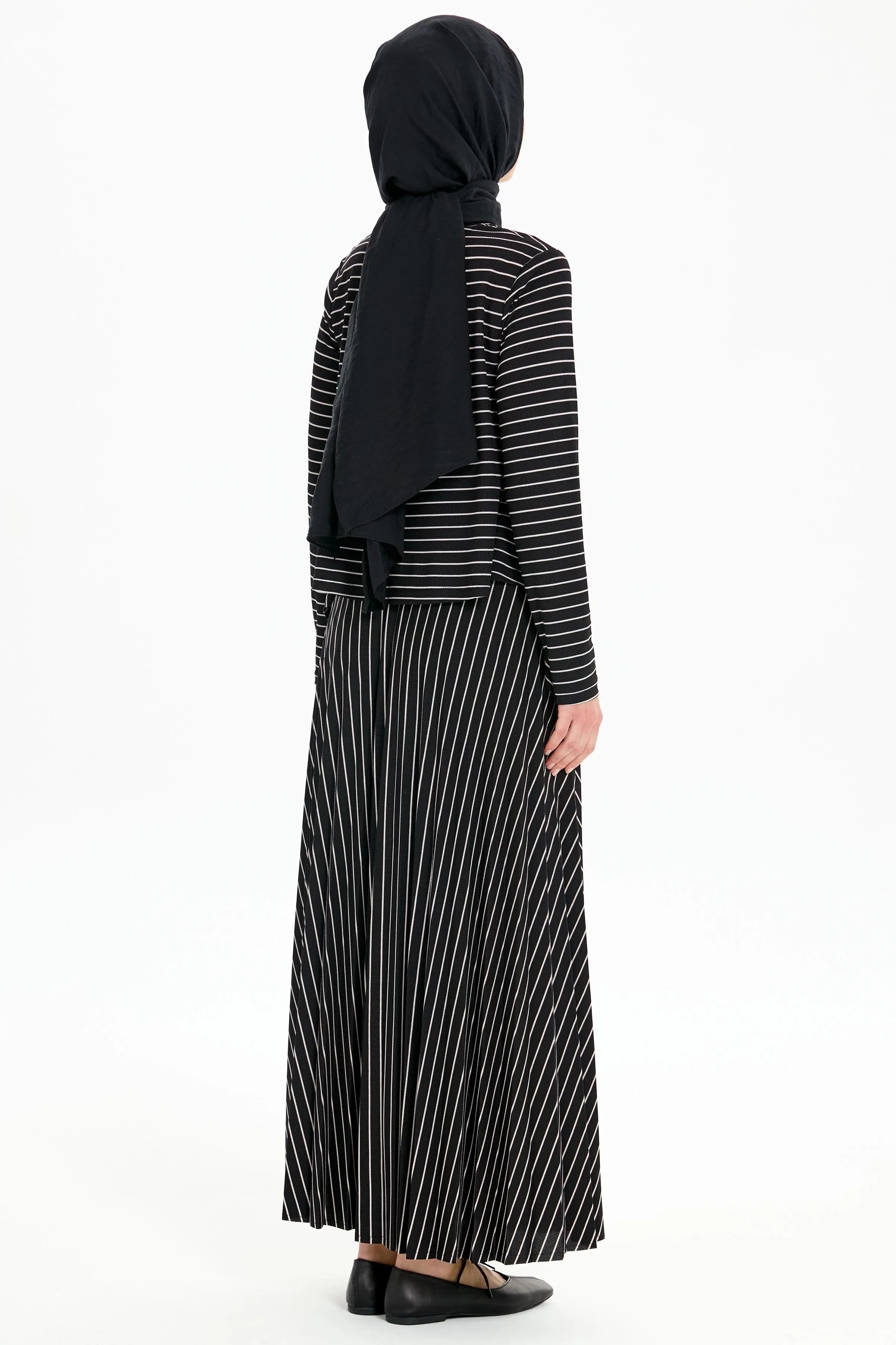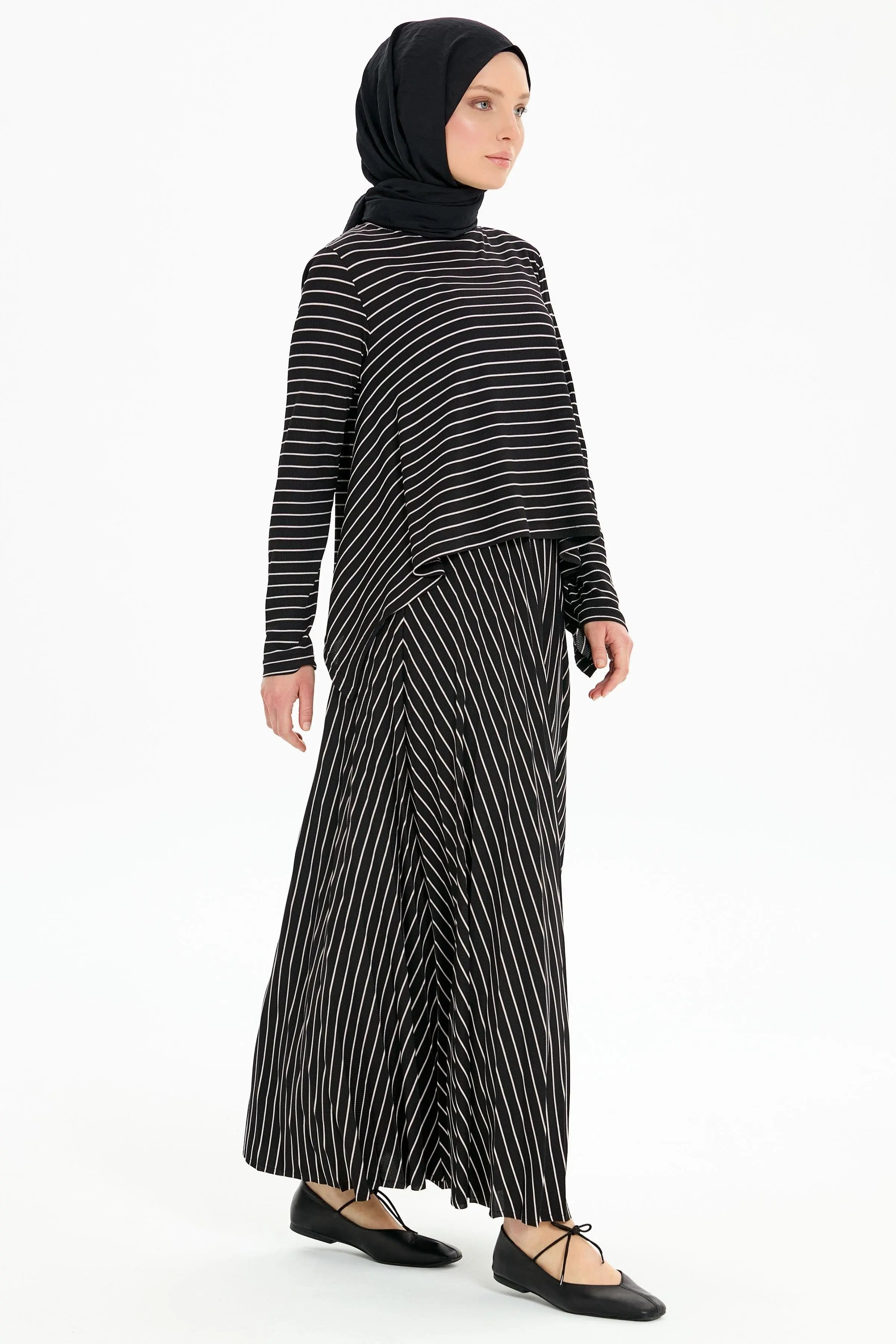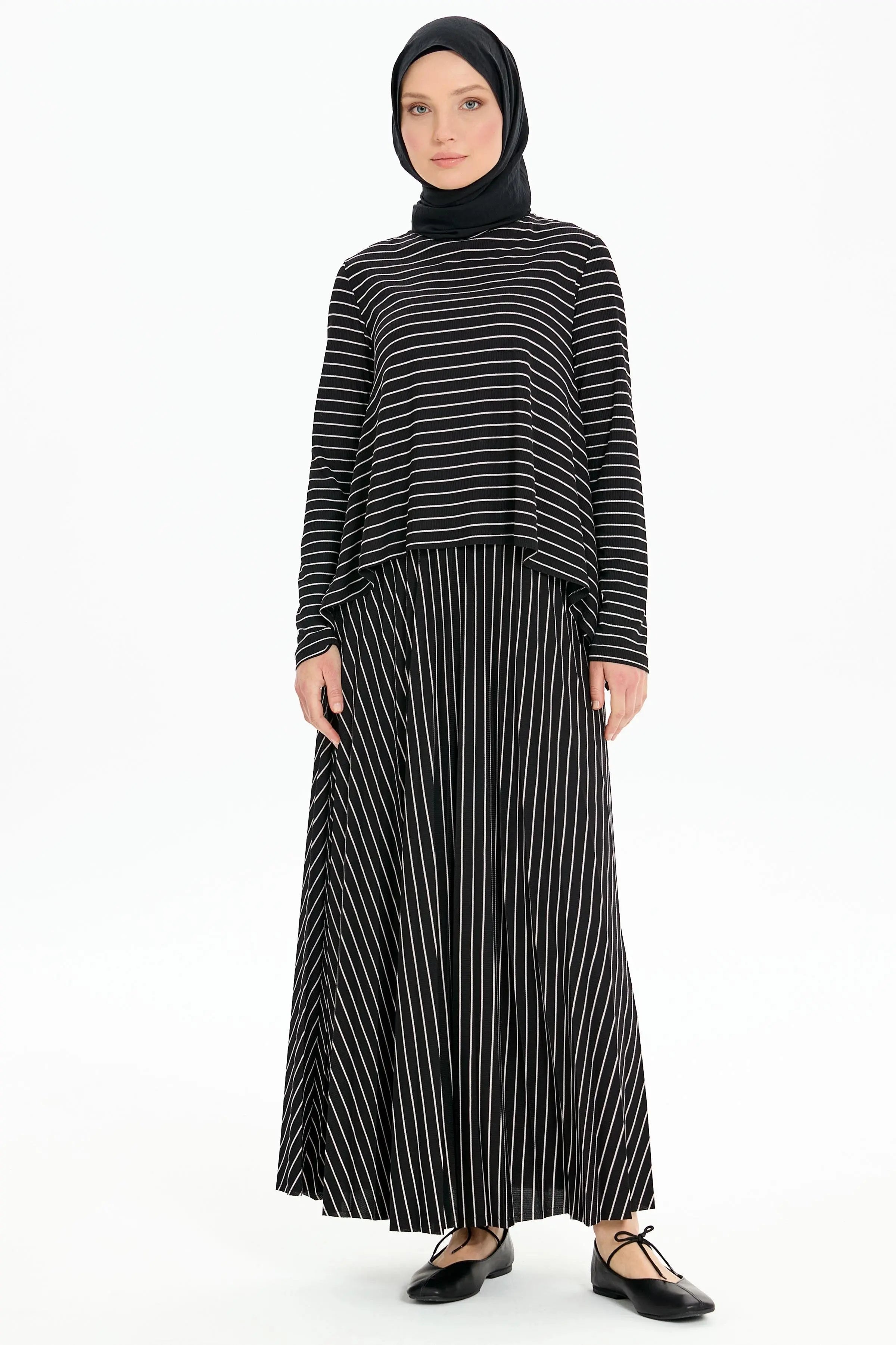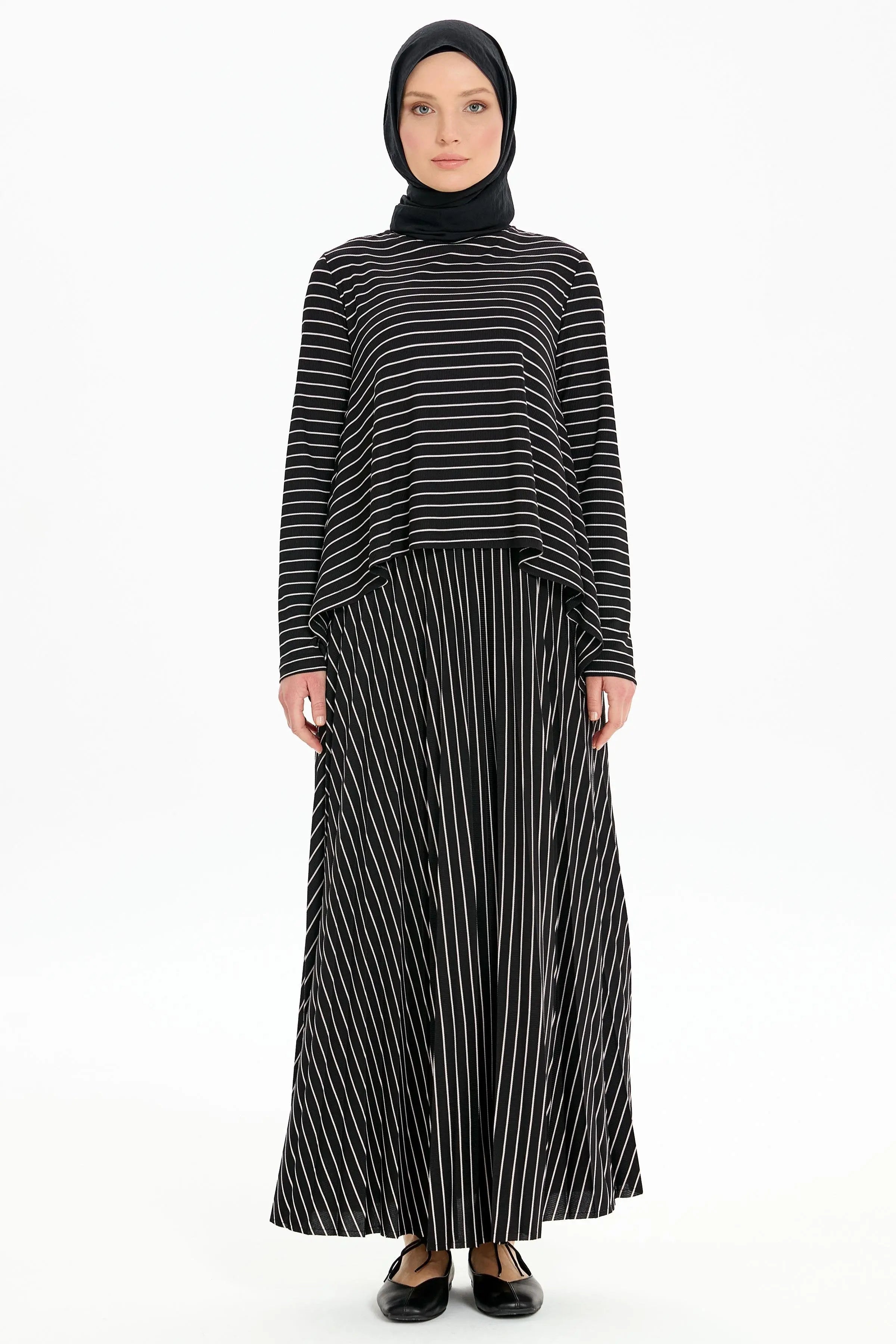Asimetrik Kesim Bluz Plisoley Etekli Çizgili Takım - Siyah