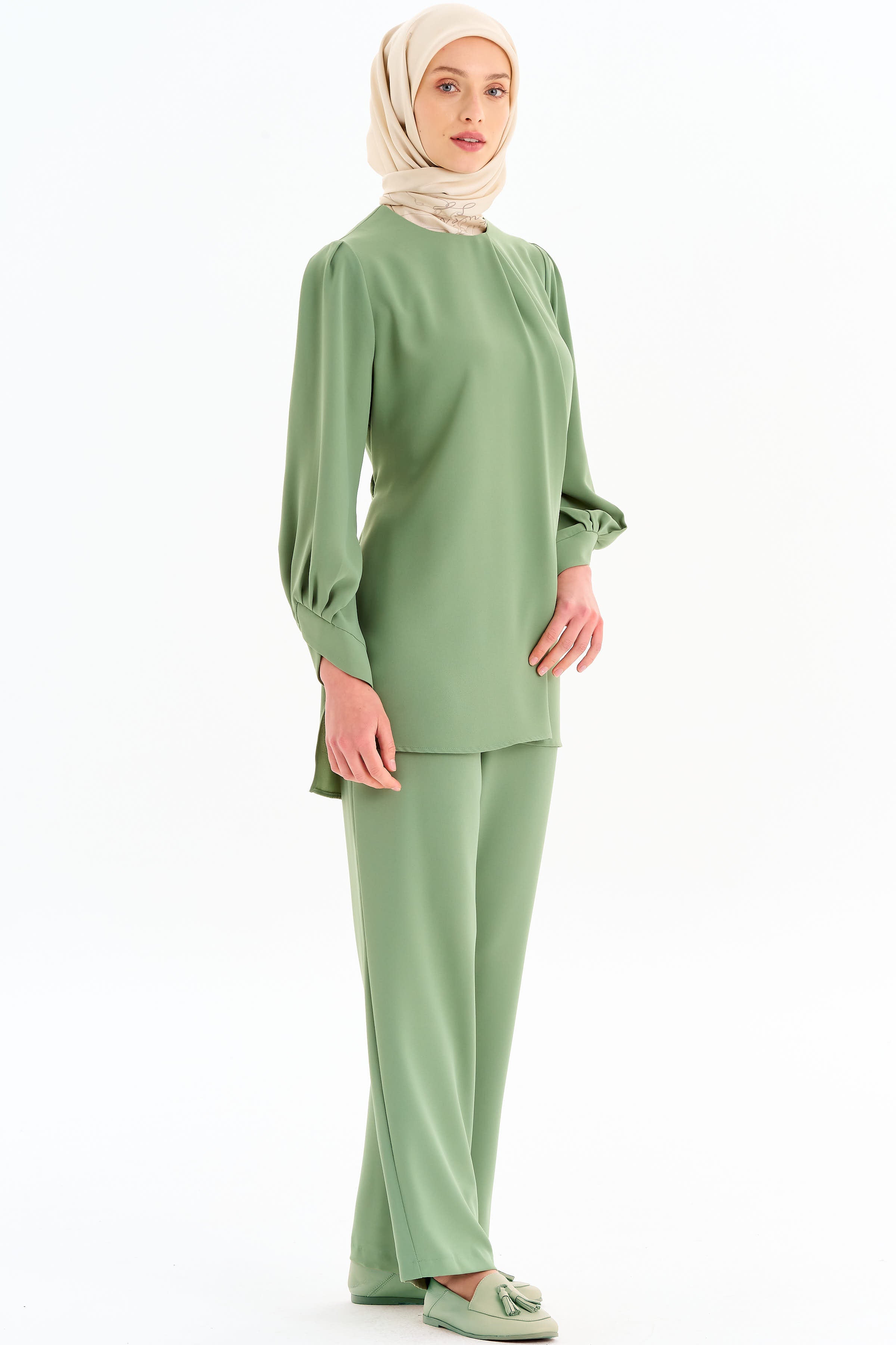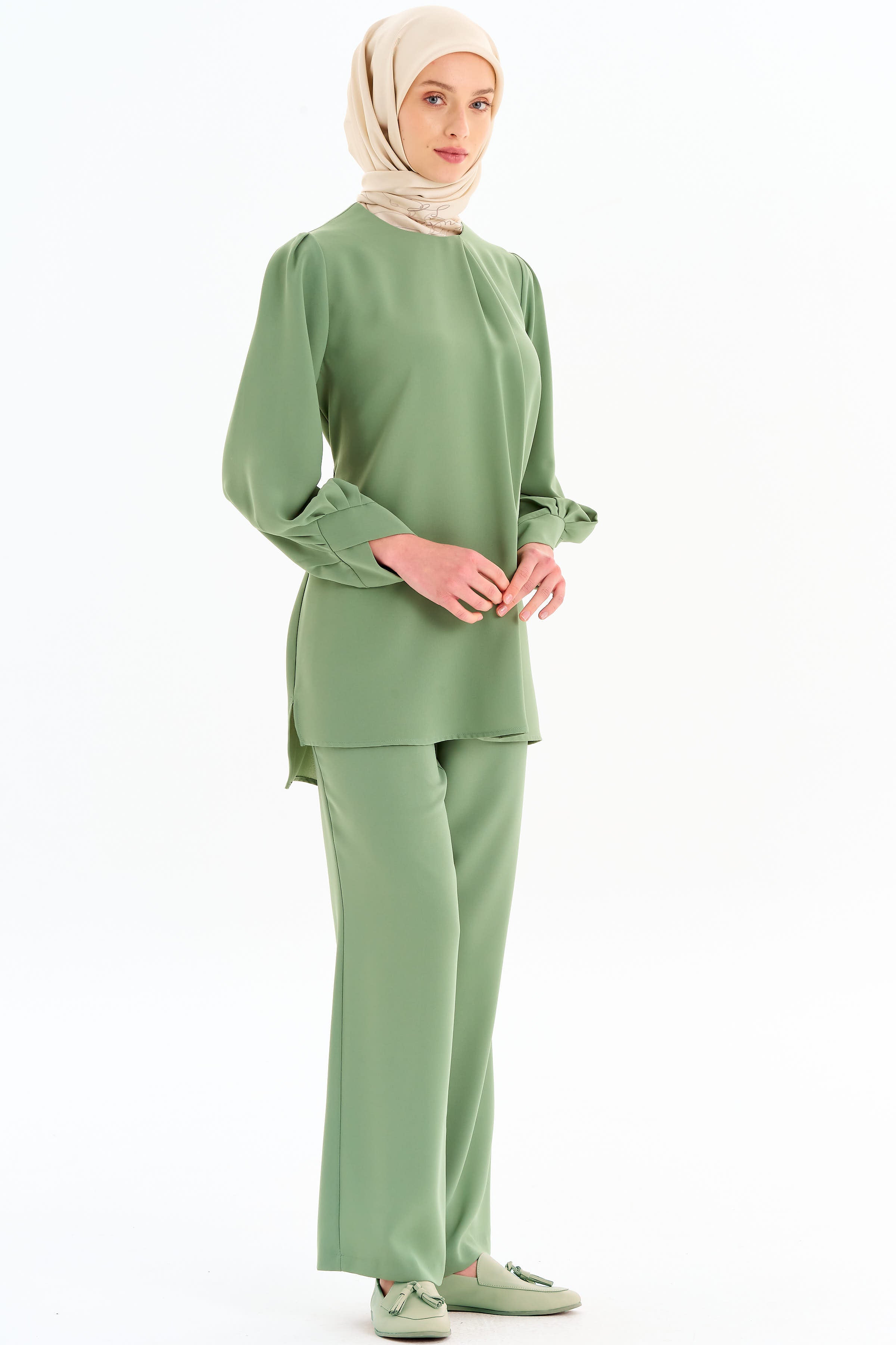 Asimetrik Kol Detaylı Tunik Takım - Mint