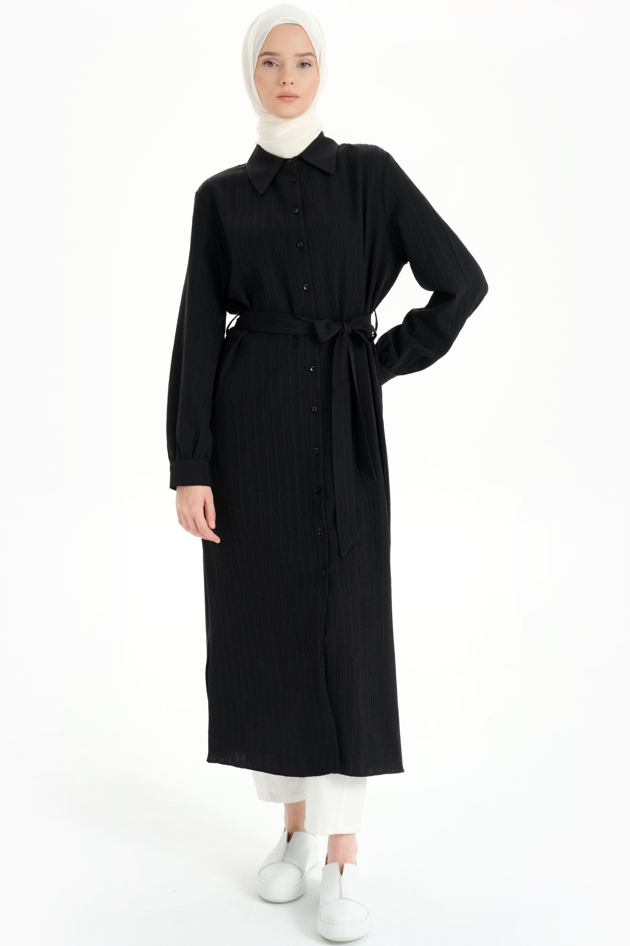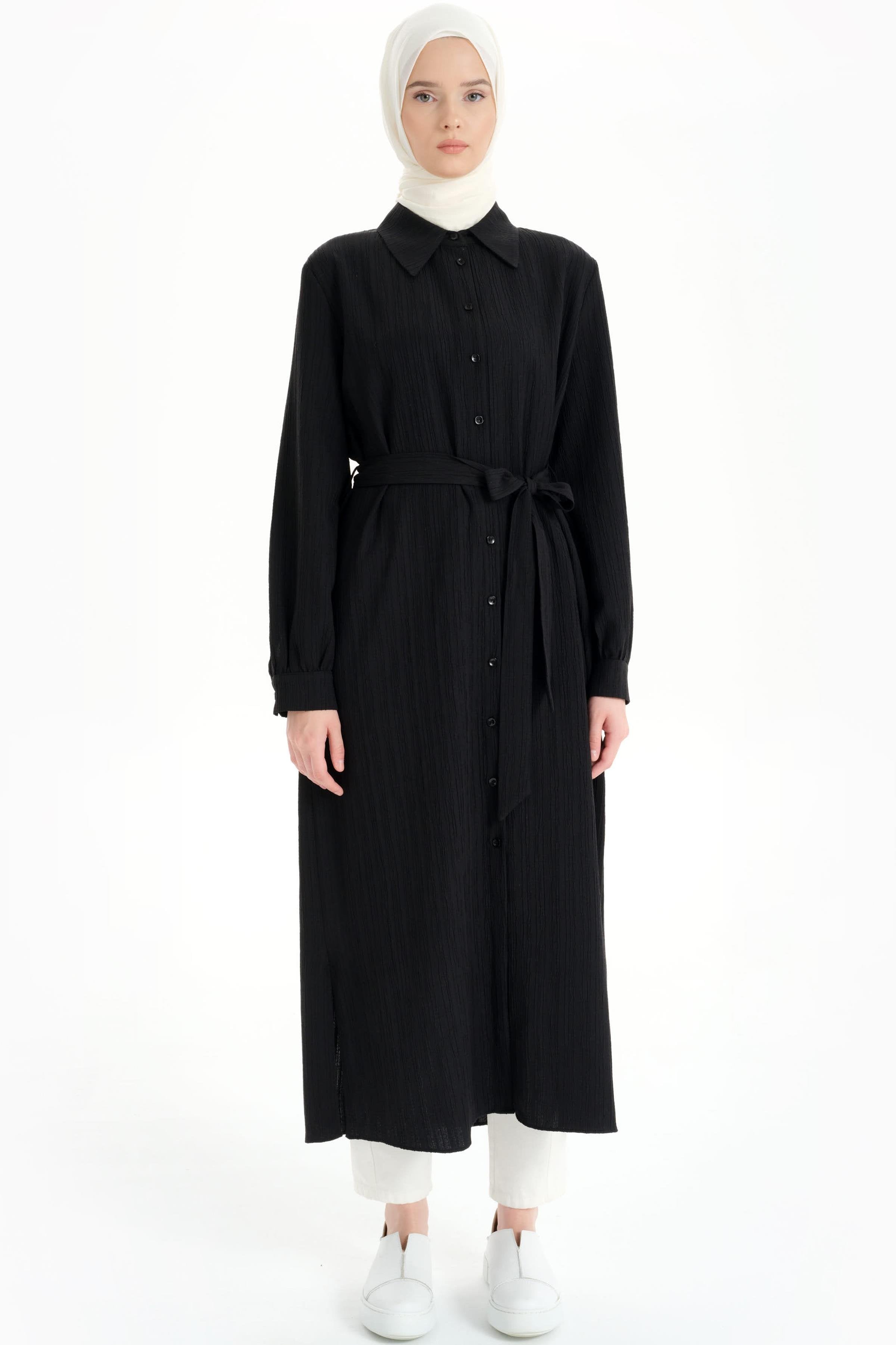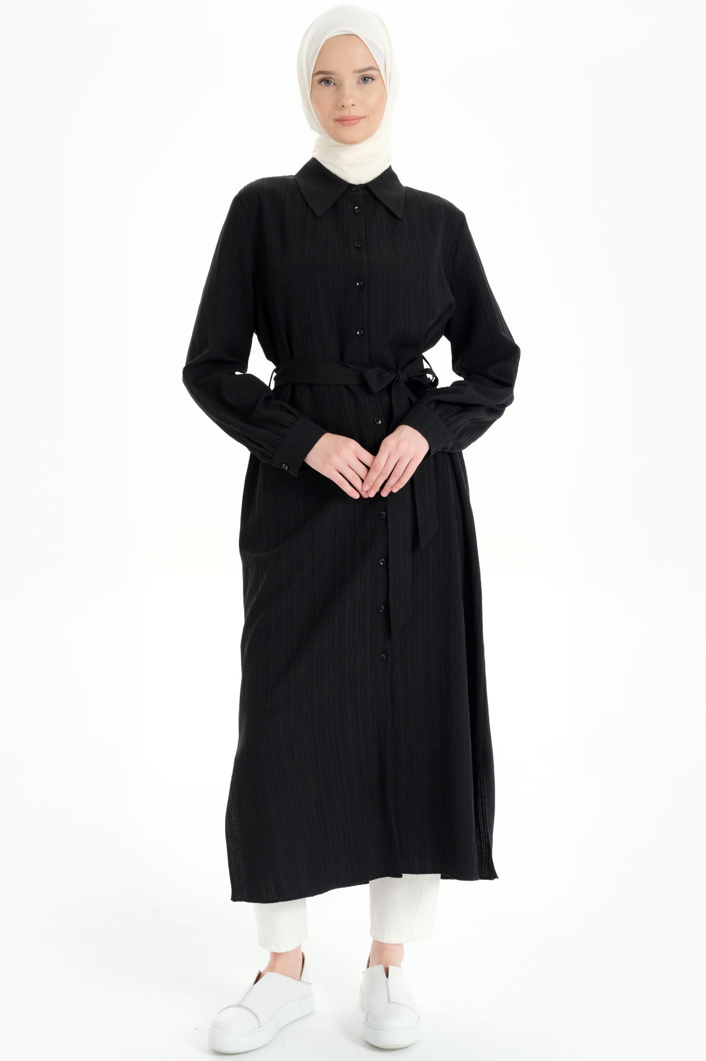 Bel kuşaklı uzun tunik, zarif ve modern tasarımıyla öne çıkar. Bel kısmındaki kuşak detayı, tunikte şık bir siluet oluştururken, uzun kesimi sayesinde hem rahat hem de şık bir görünüm sunar. Yumuşak ve hafif kumaşıyla gün boyu konfor sağlar.
