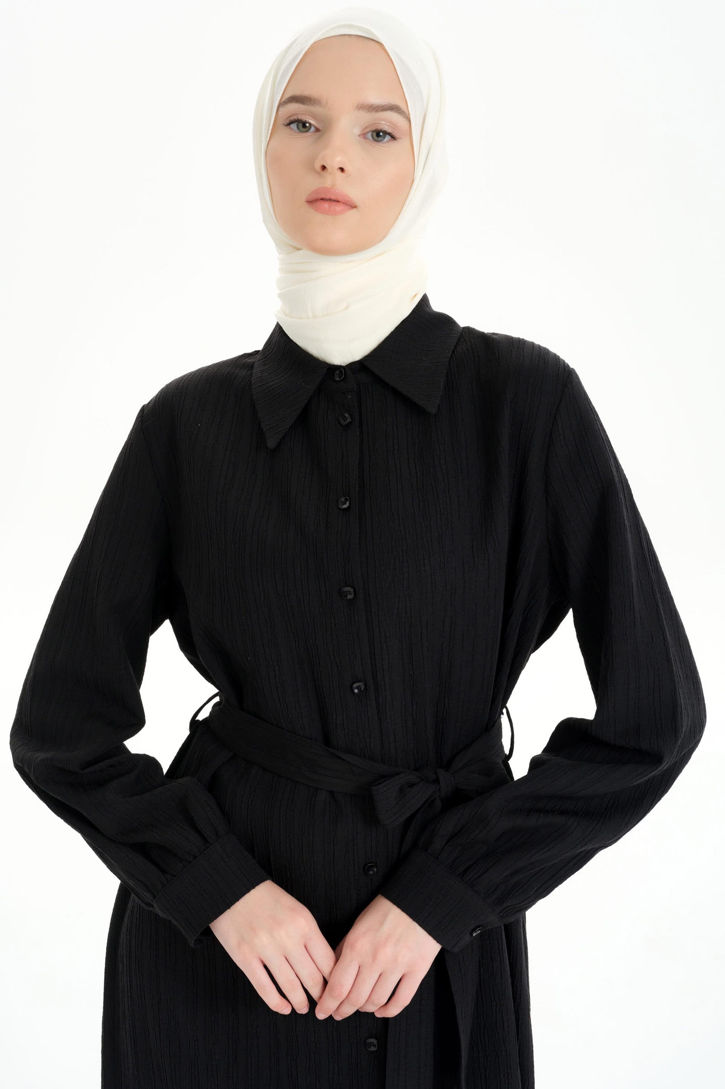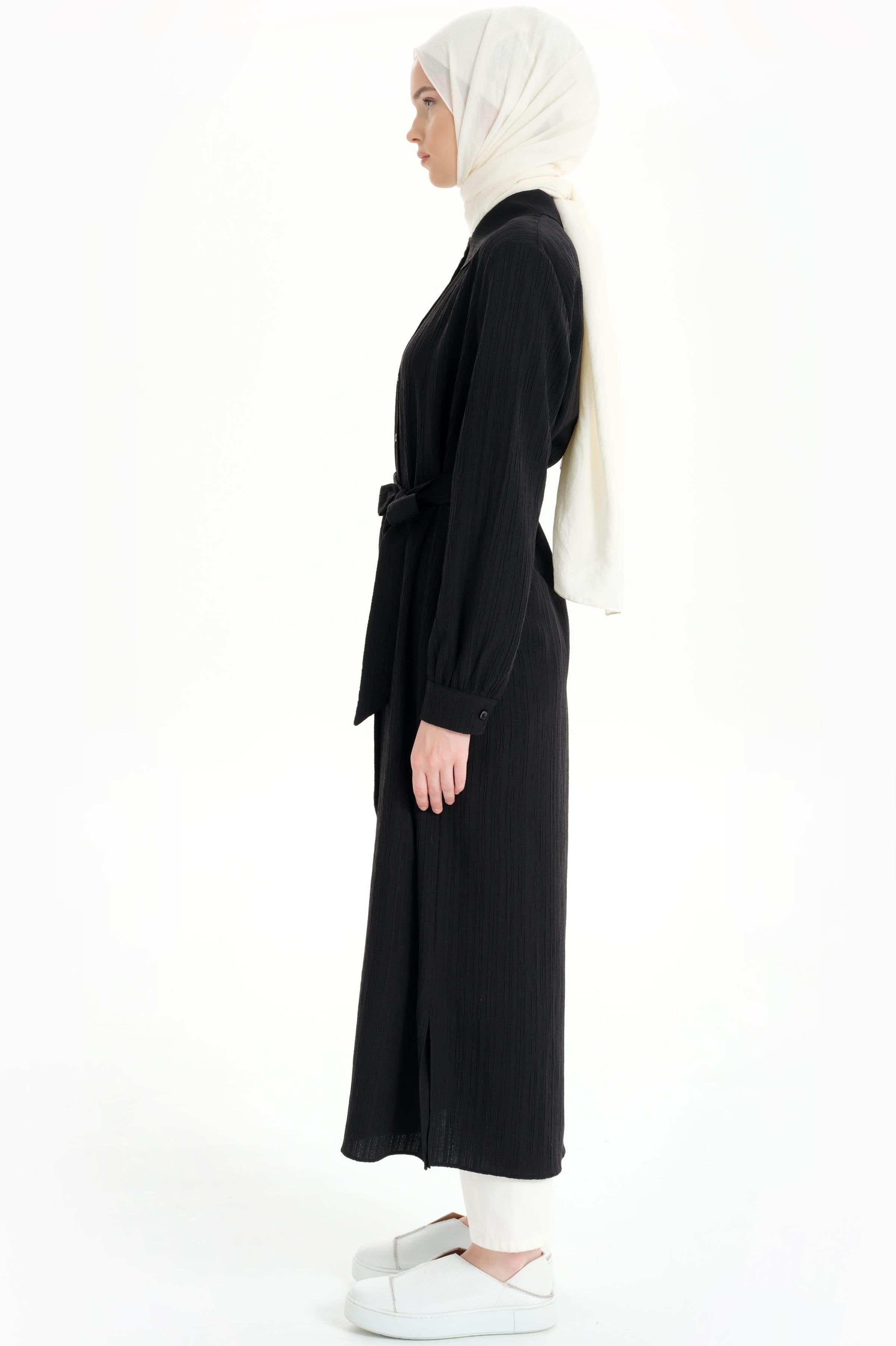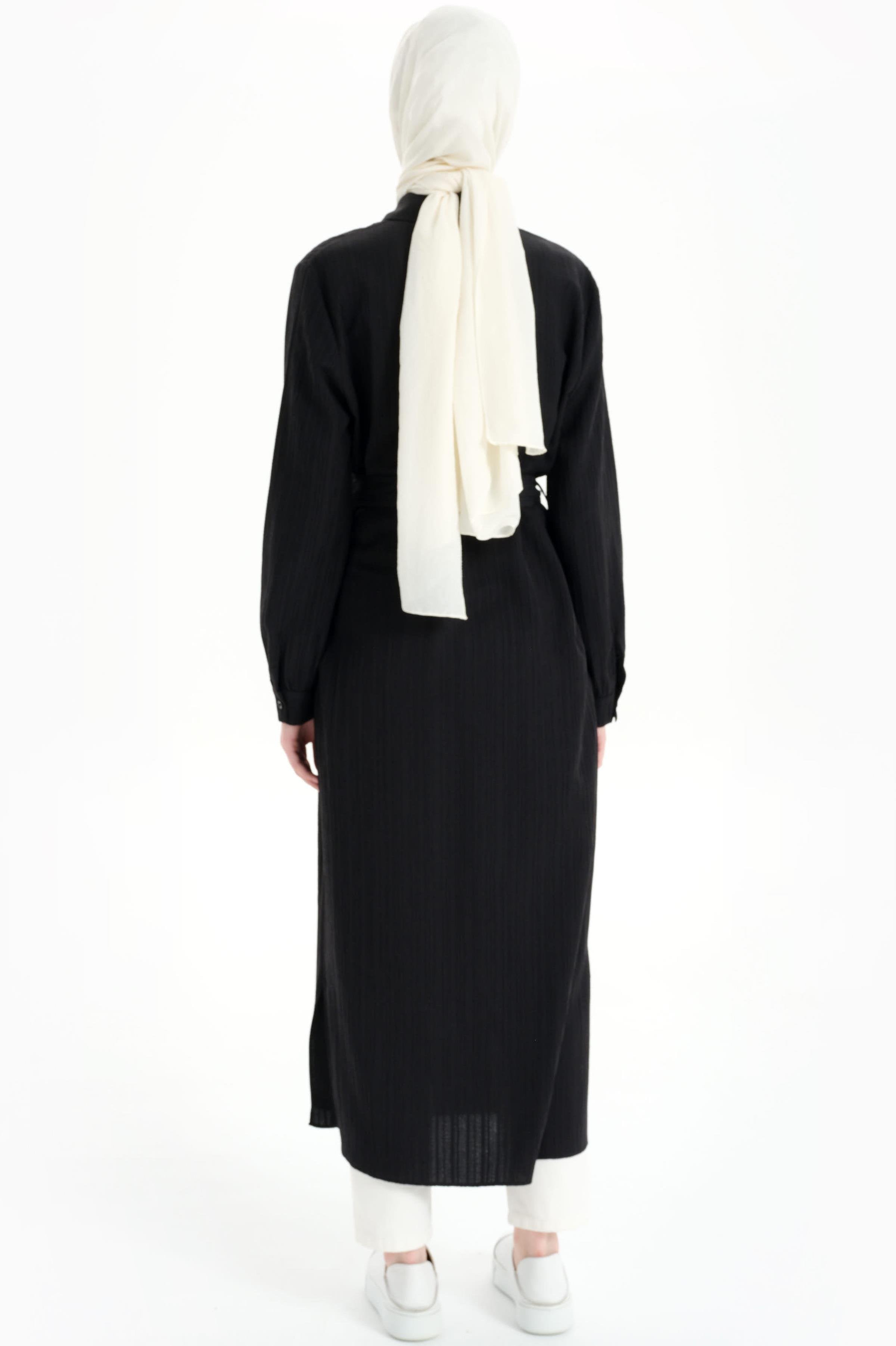 Bel kuşaklı uzun tunik, zarif ve modern tasarımıyla öne çıkar. Bel kısmındaki kuşak detayı, tunikte şık bir siluet oluştururken, uzun kesimi sayesinde hem rahat hem de şık bir görünüm sunar. Yumuşak ve hafif kumaşıyla gün boyu konfor sağlar.