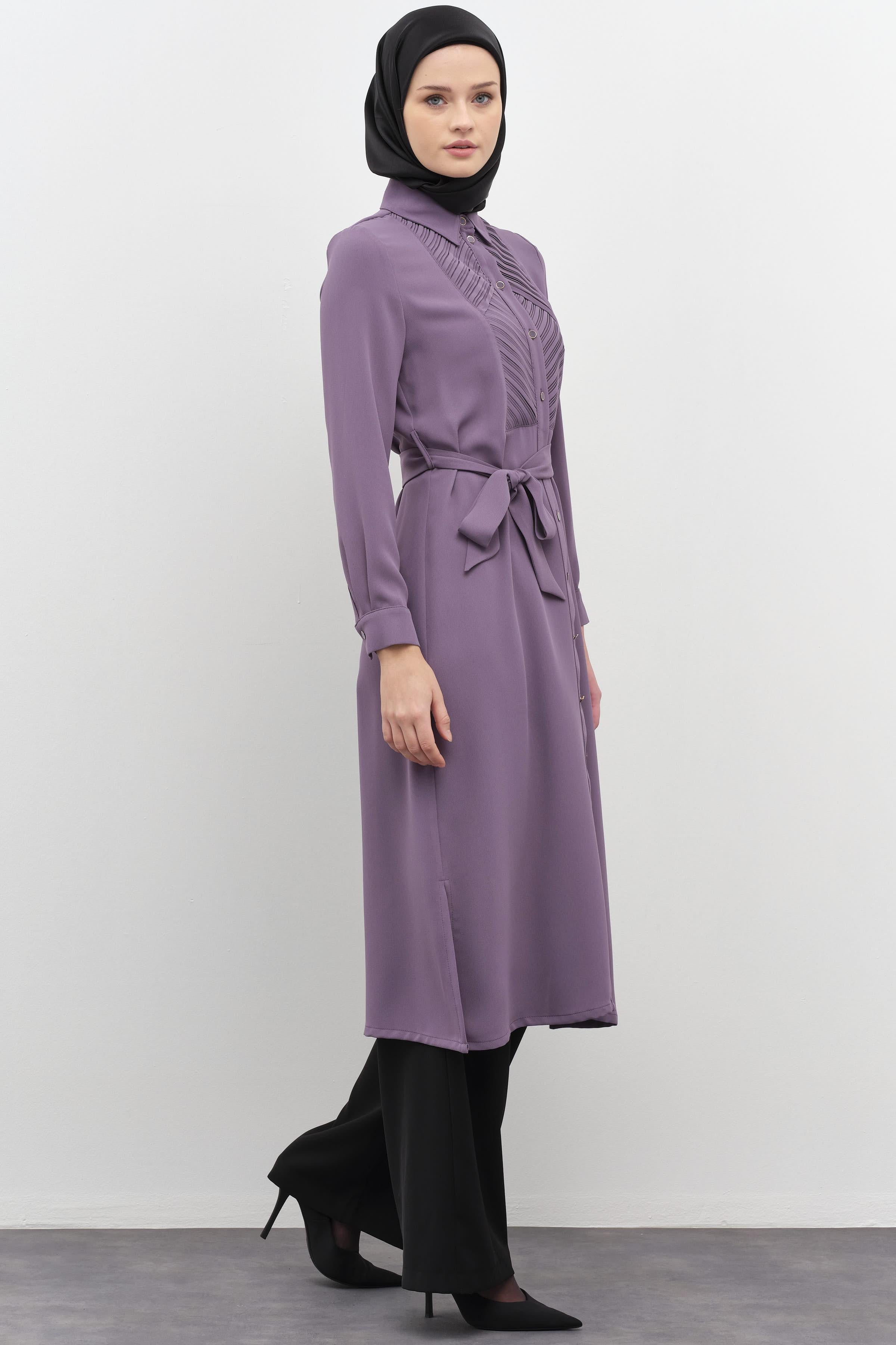 Beli Kuşaklı Plise Detaylı Tunik - Lila