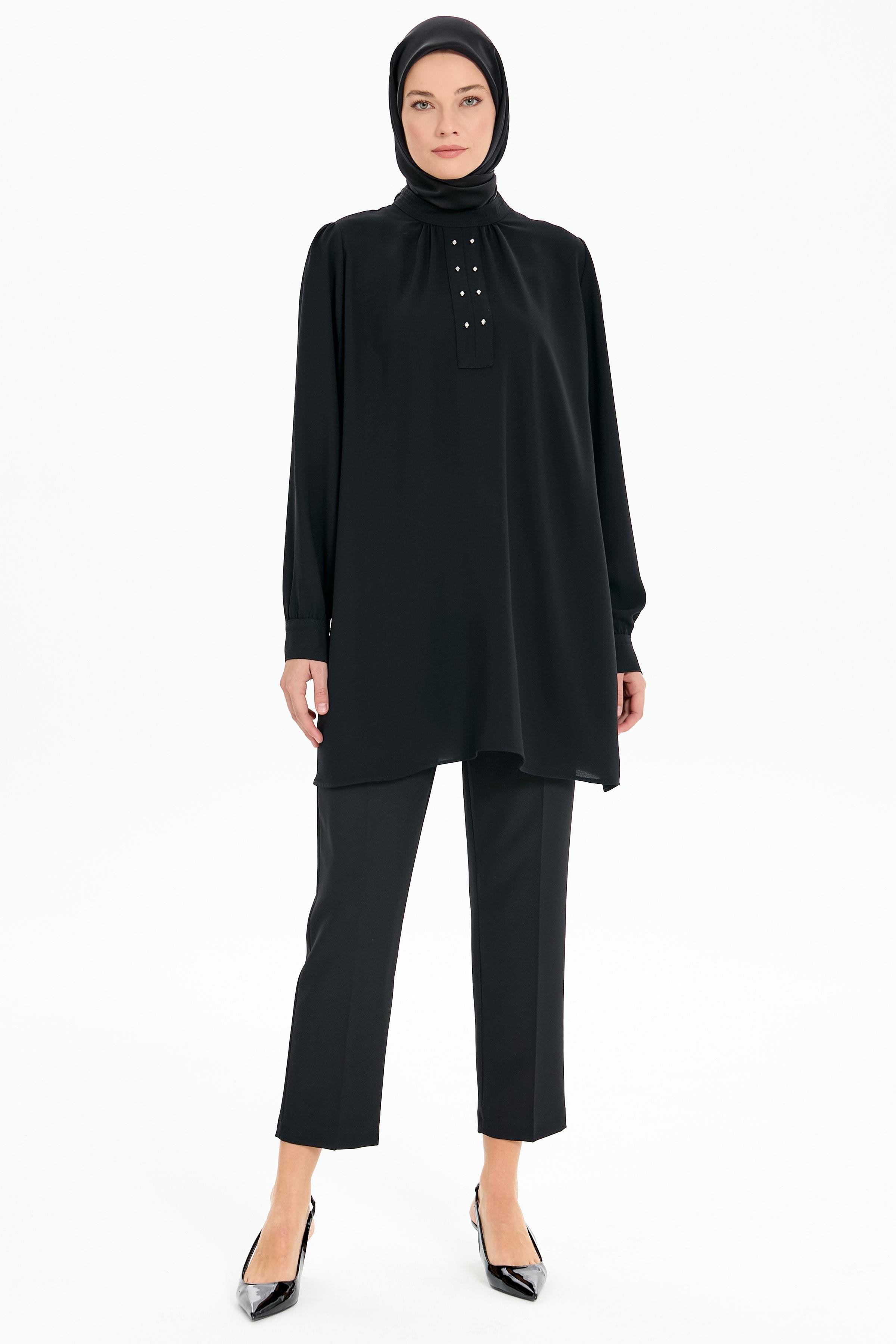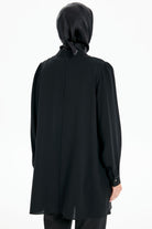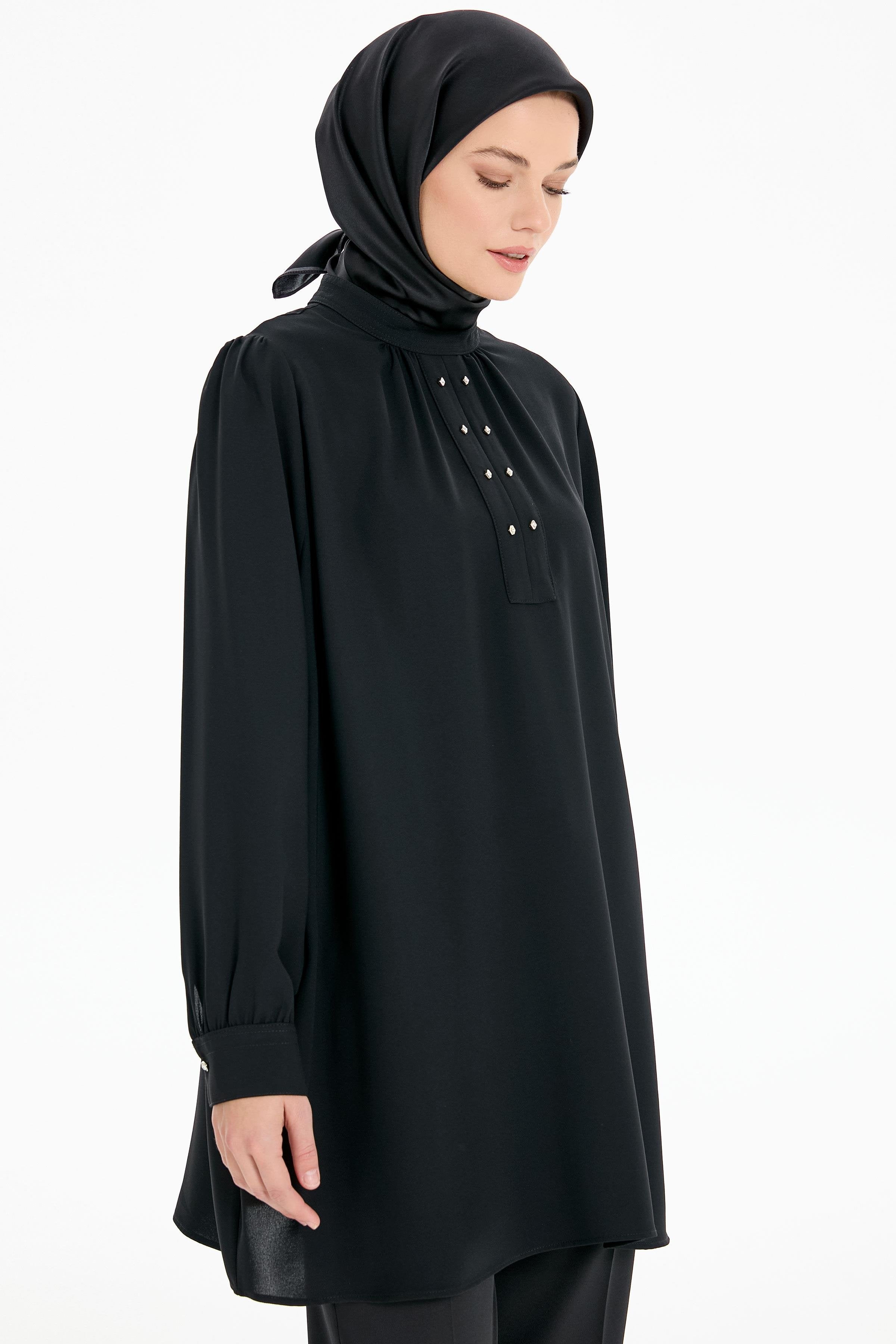 Büzgü Detaylı Yaka Dikişli Tunik - Siyah