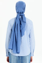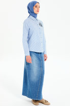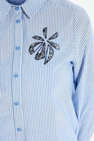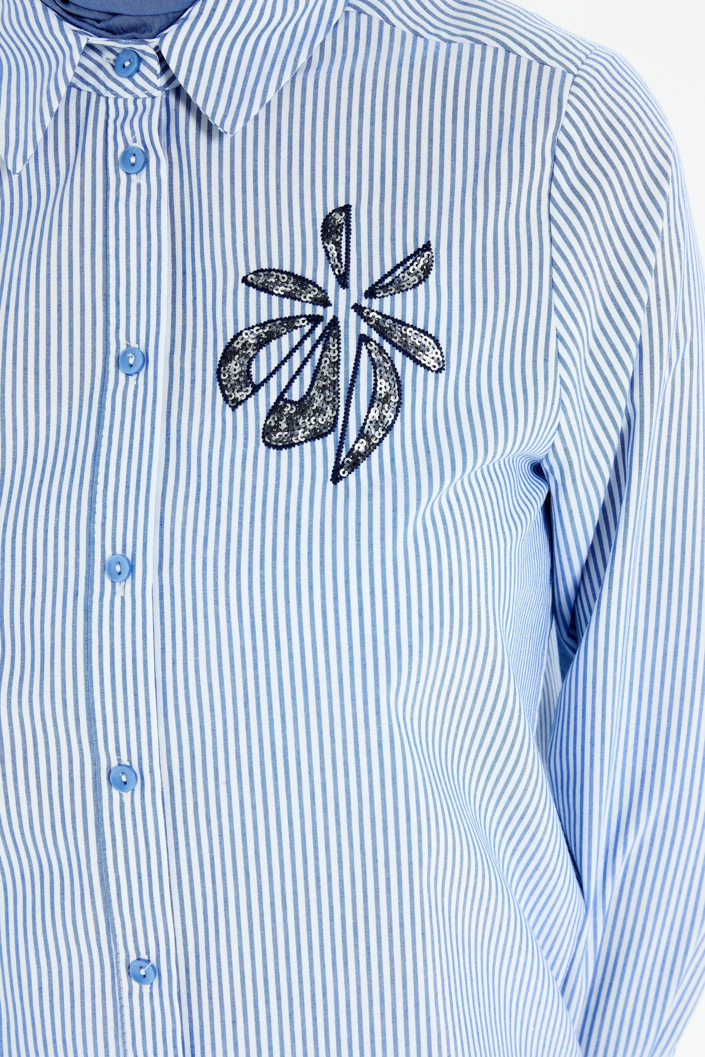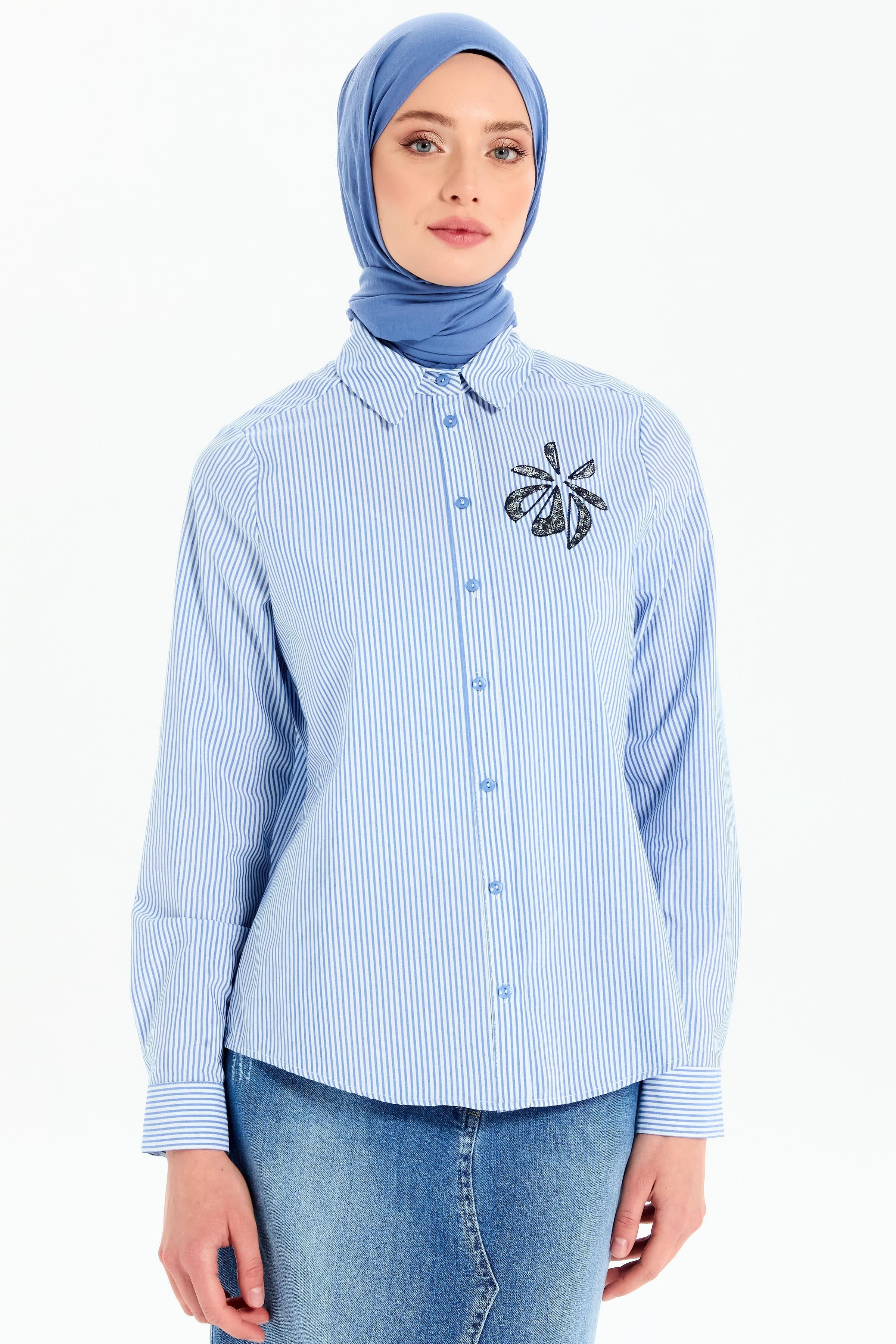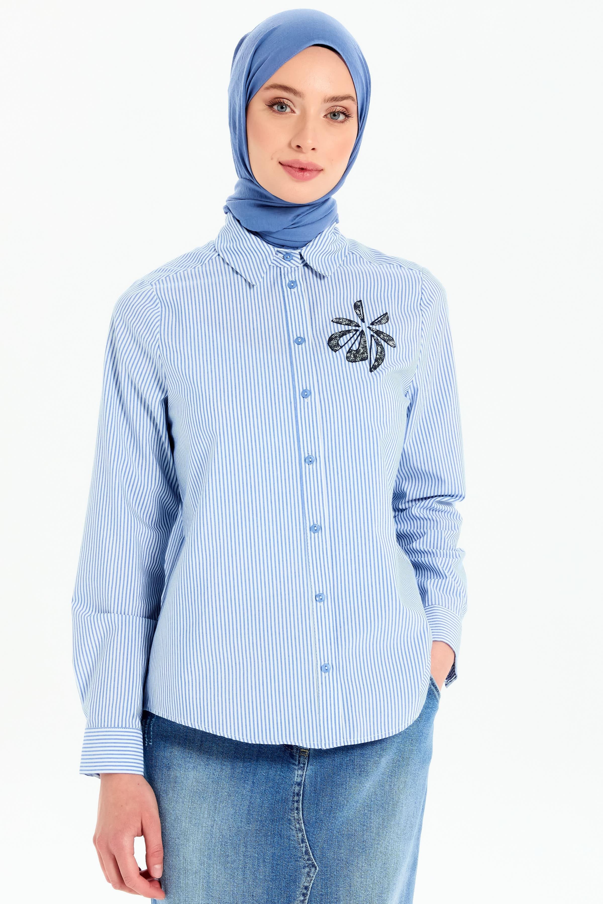 Çiçek Nakışlı Çizgili Gömlek - Mavi