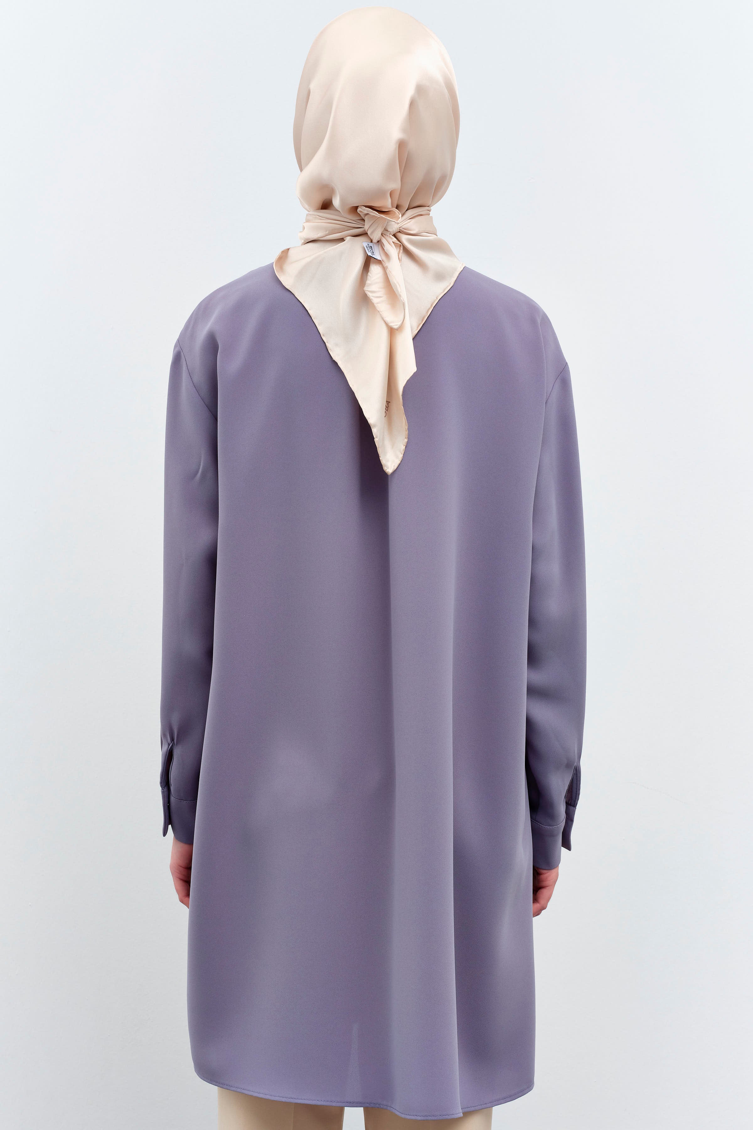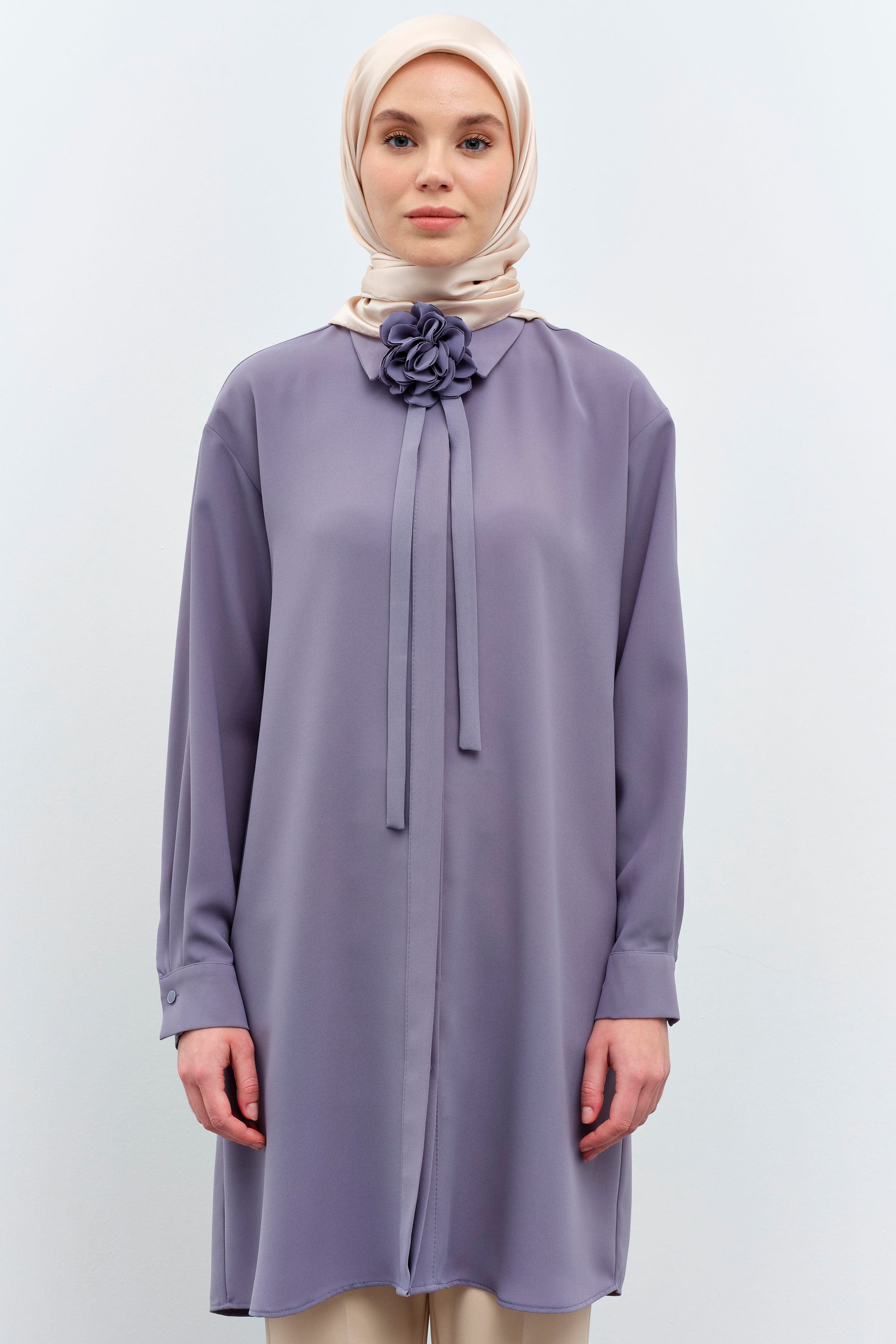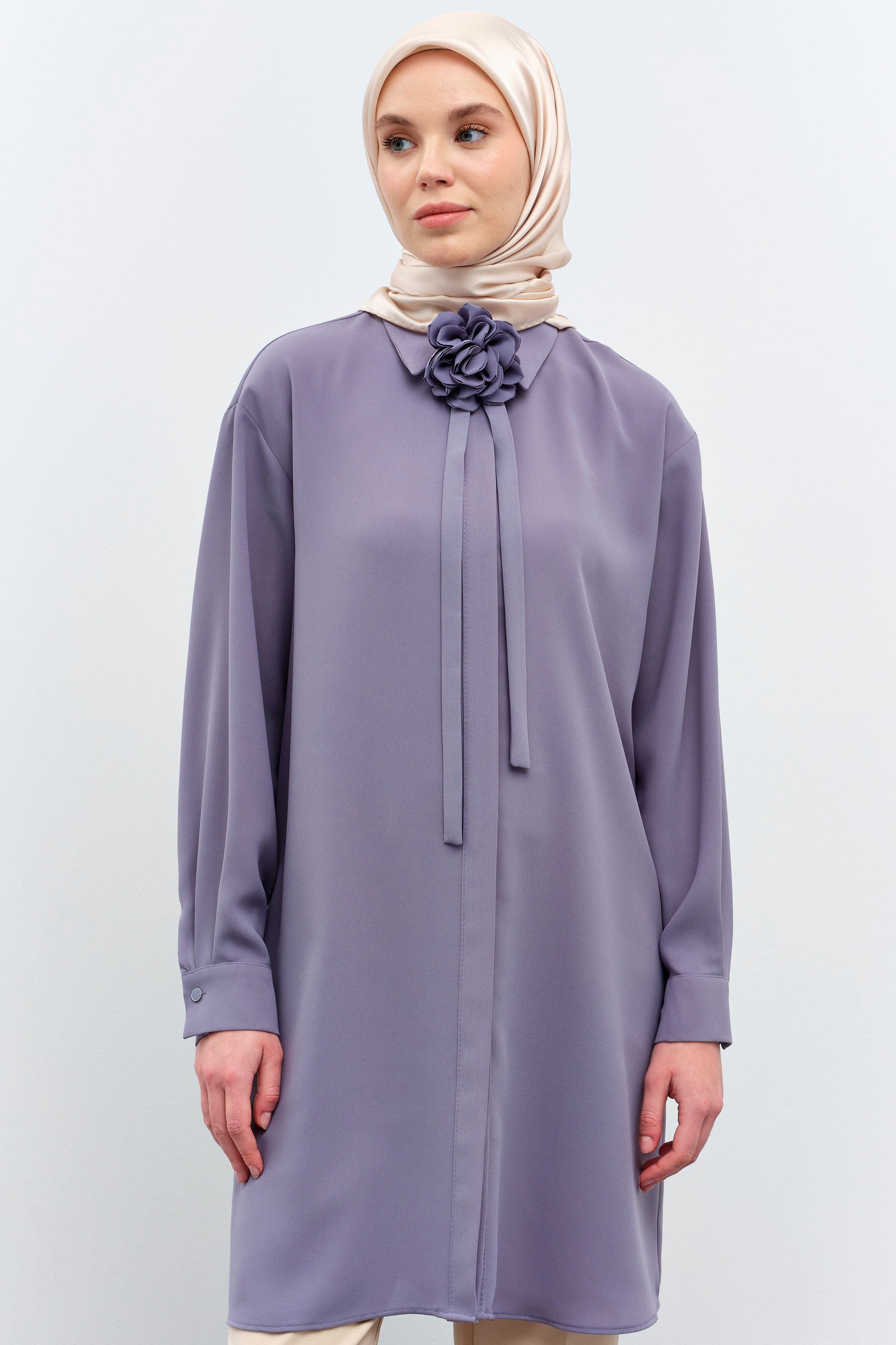 Tuniğin yaka kısmında yer alan bağlanabilir kravat detayı, sofistike bir dokunuş katarken kullanım esnekliği sağlar. İster sade bir fiyonkla bağlayarak klasik bir görünüm oluşturun, ister serbest bırakıp daha rahat bir tarz yaratın.