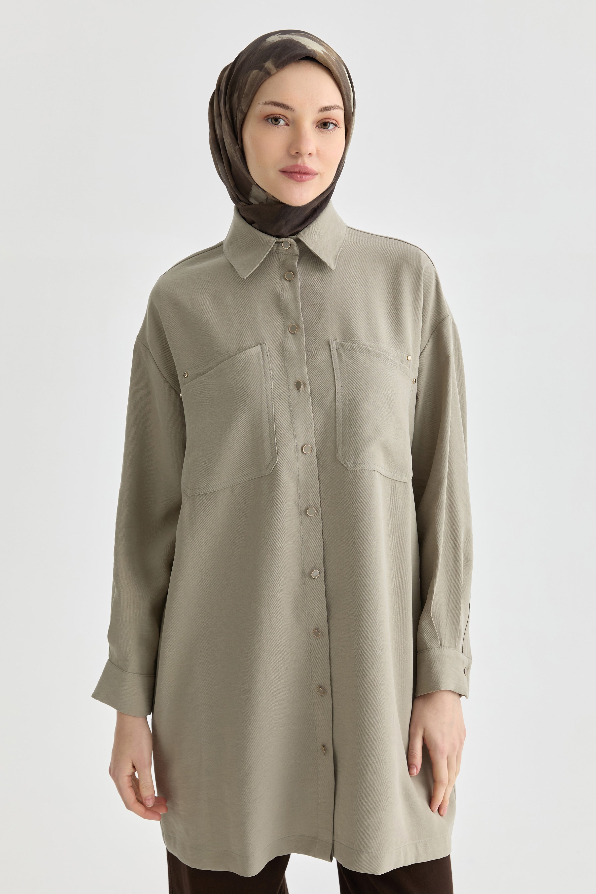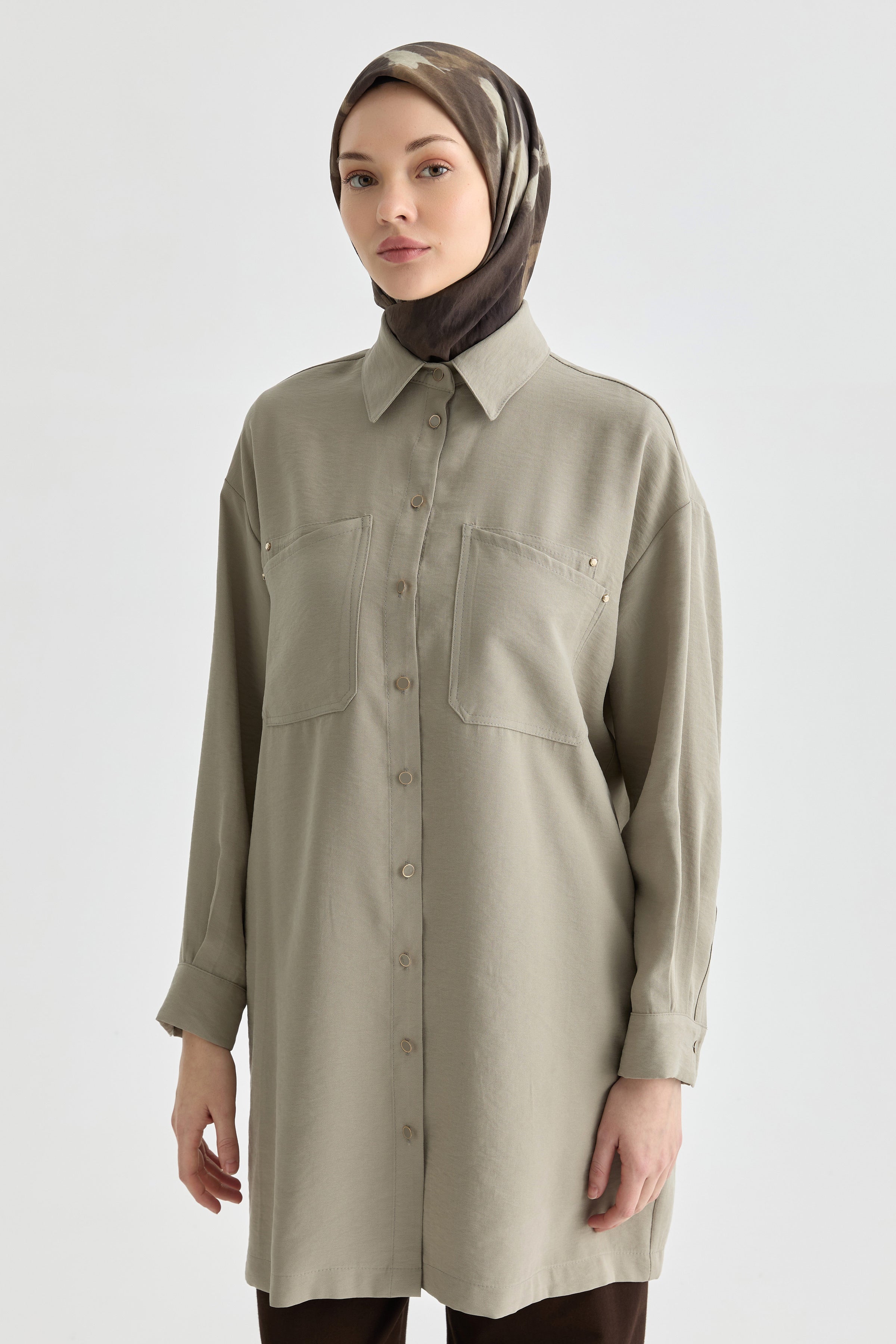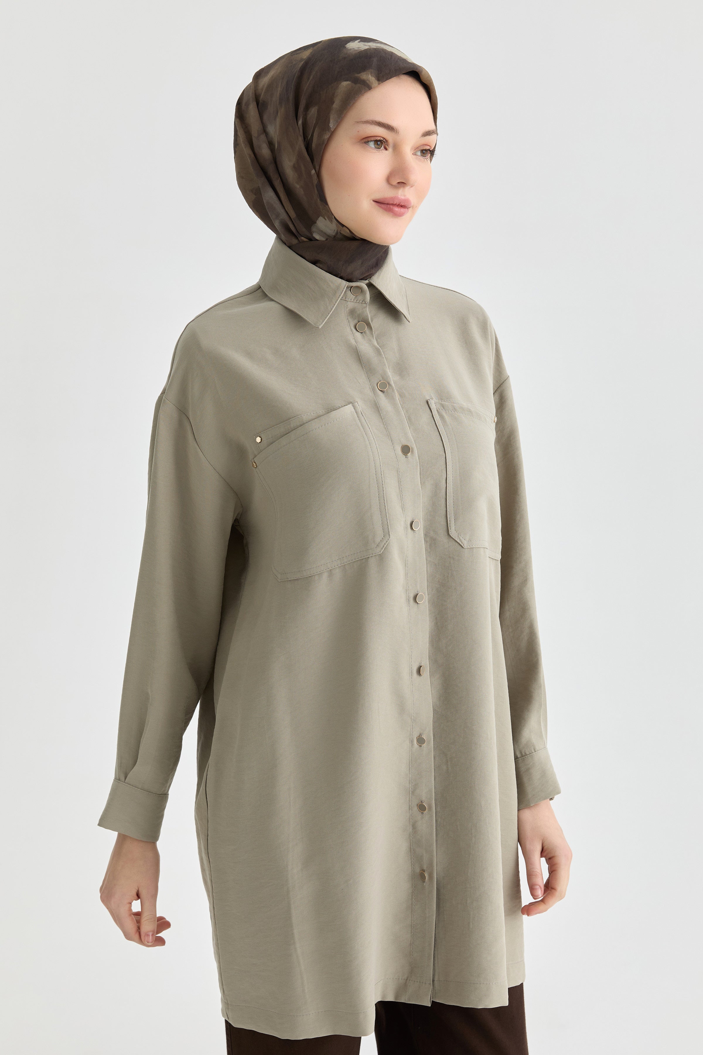 Ön kısmındaki iki cep detayıyla hareket kazanan bu tunik, sade tasarımını işlevsel bir dokunuşla tamamlar. Cepler modele doğal bir canlılık katarken, rahat kesimi gün boyu konfor sunar.