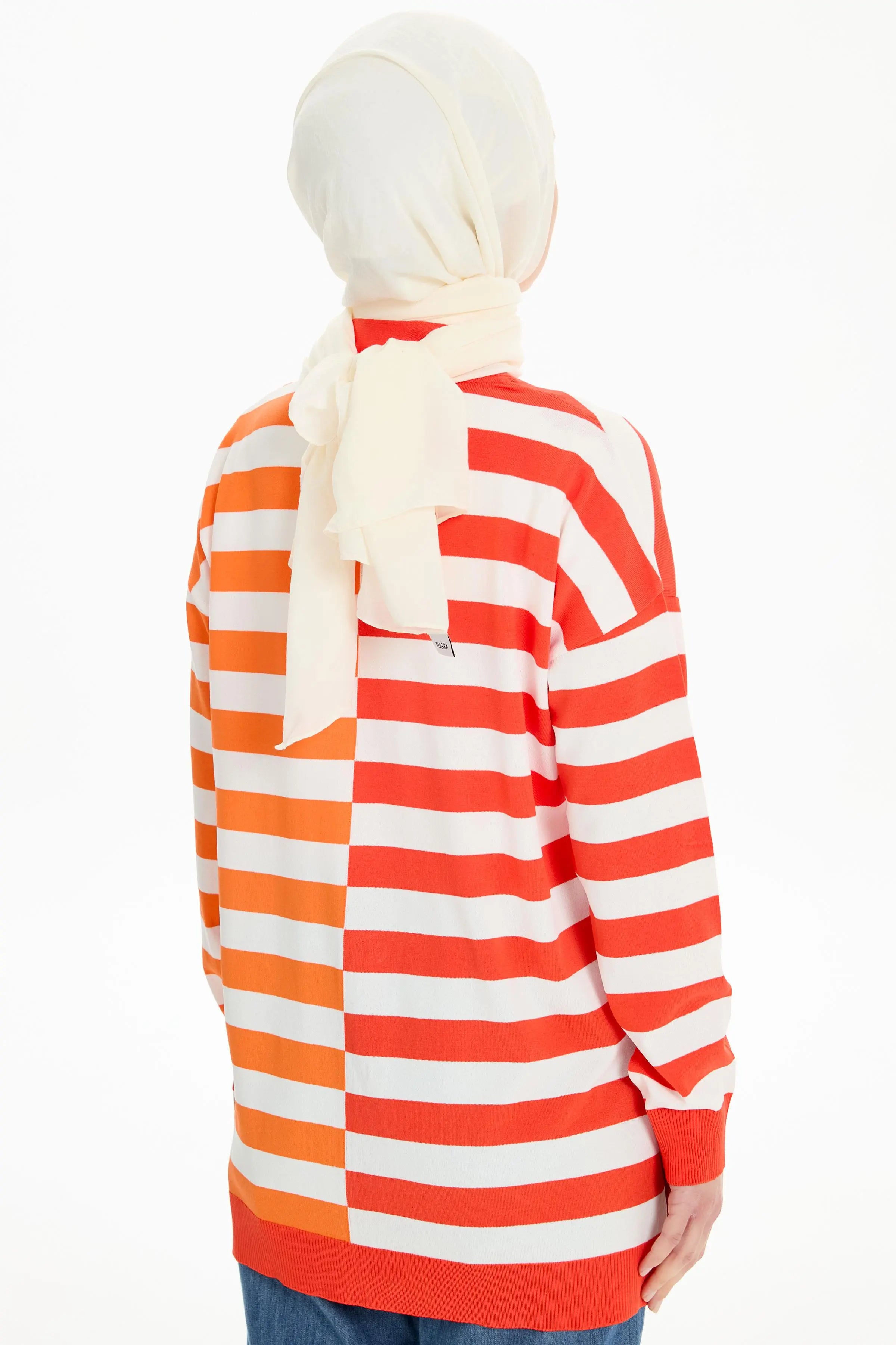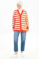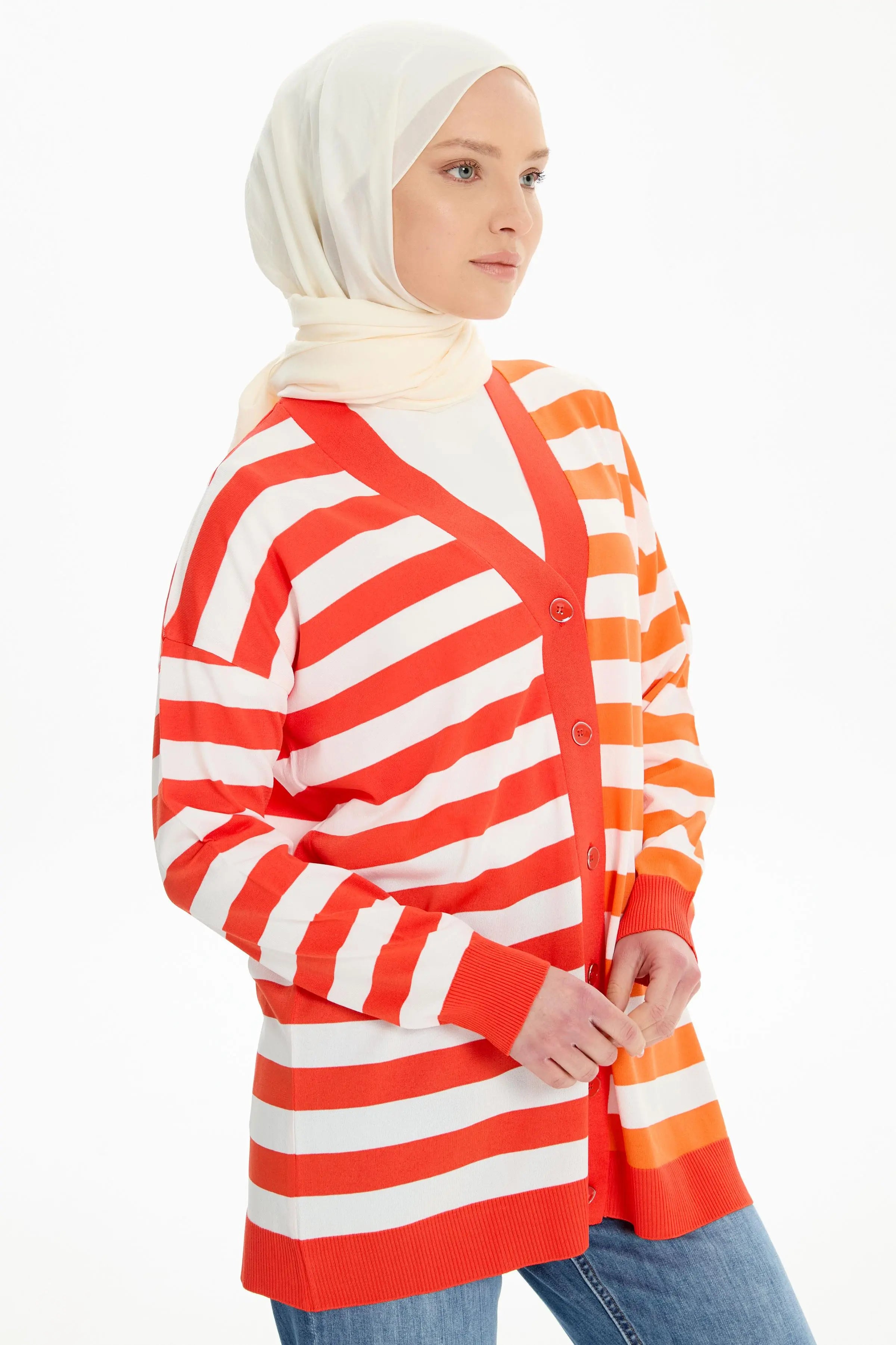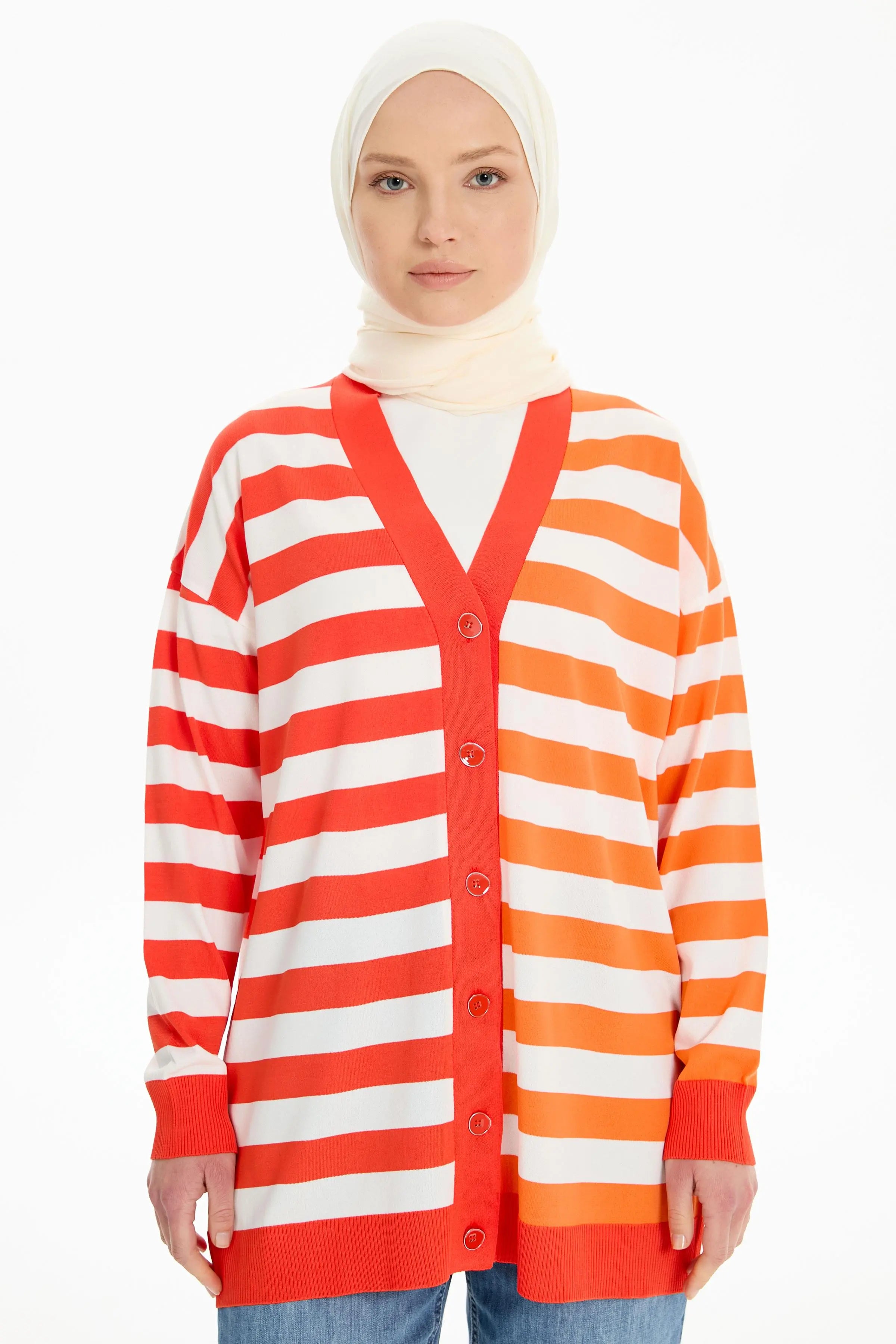 Çizgili Düğme Kapamalı Triko Hırka - Mercan