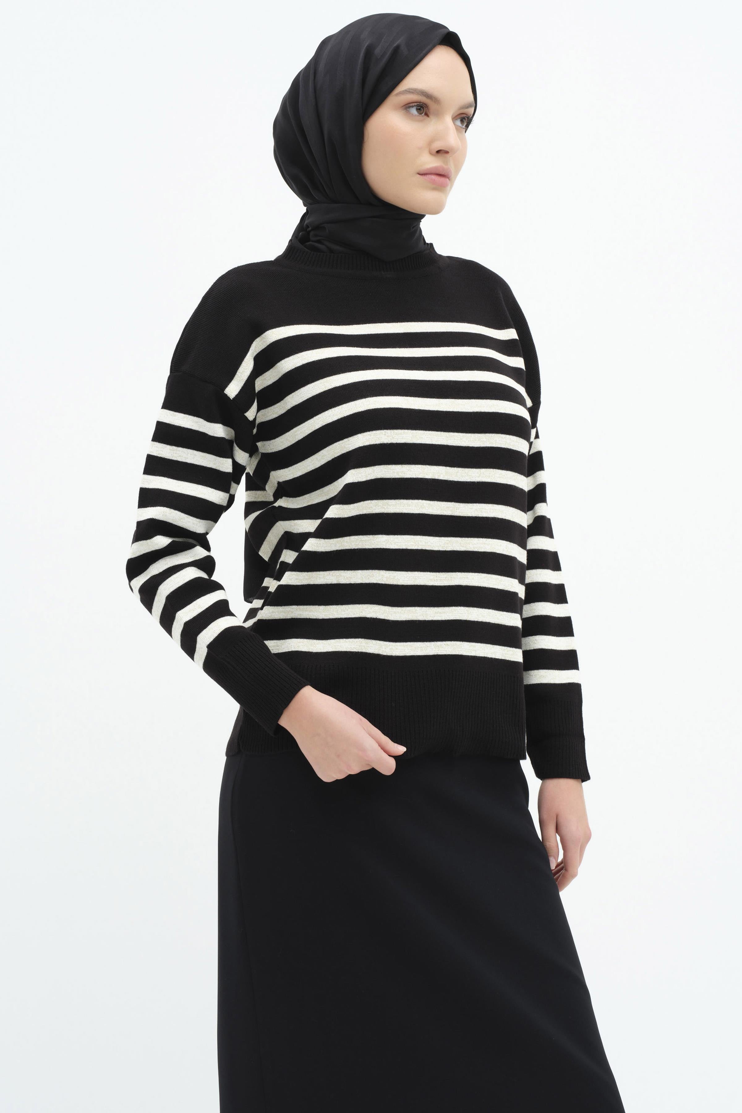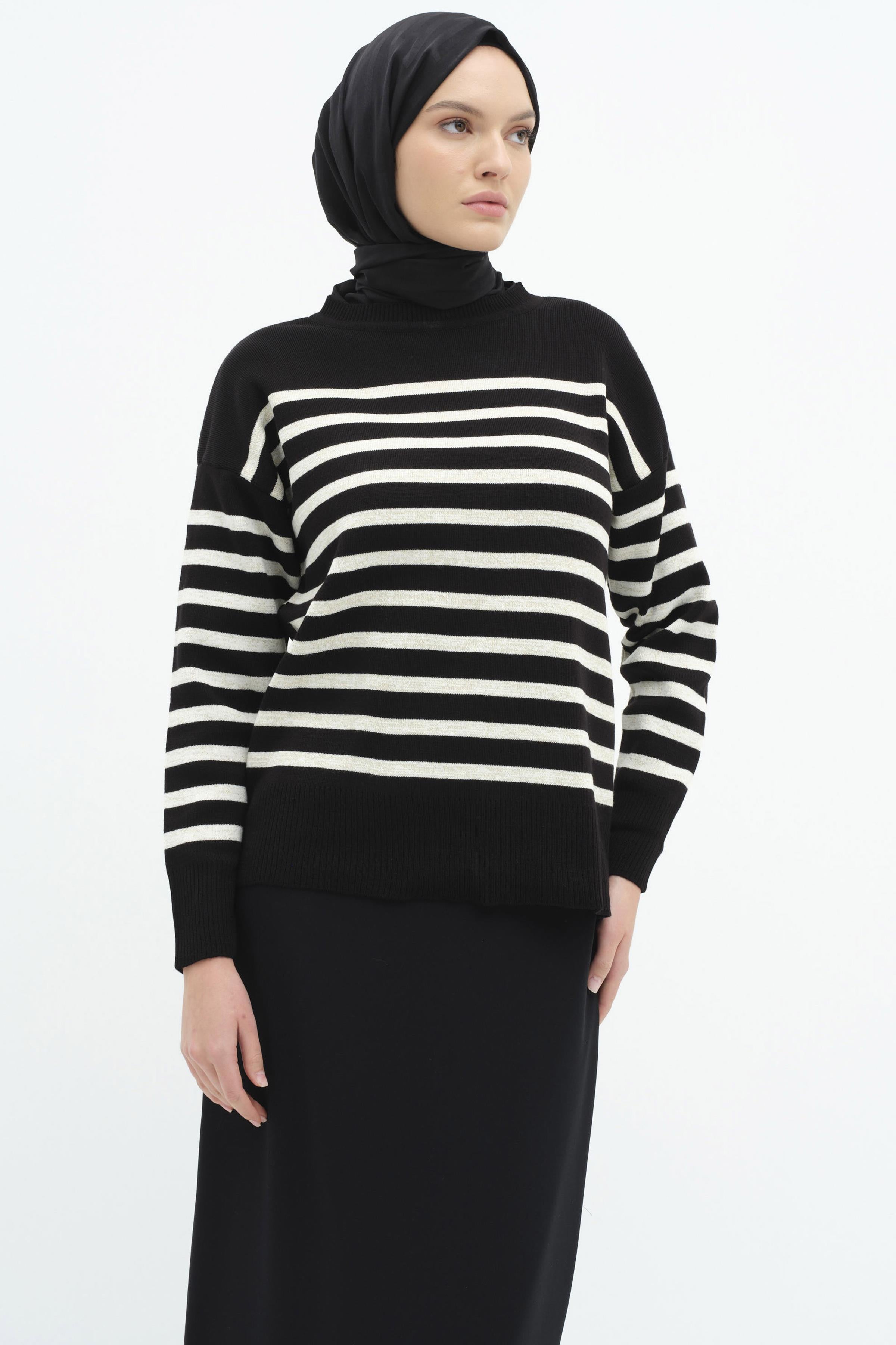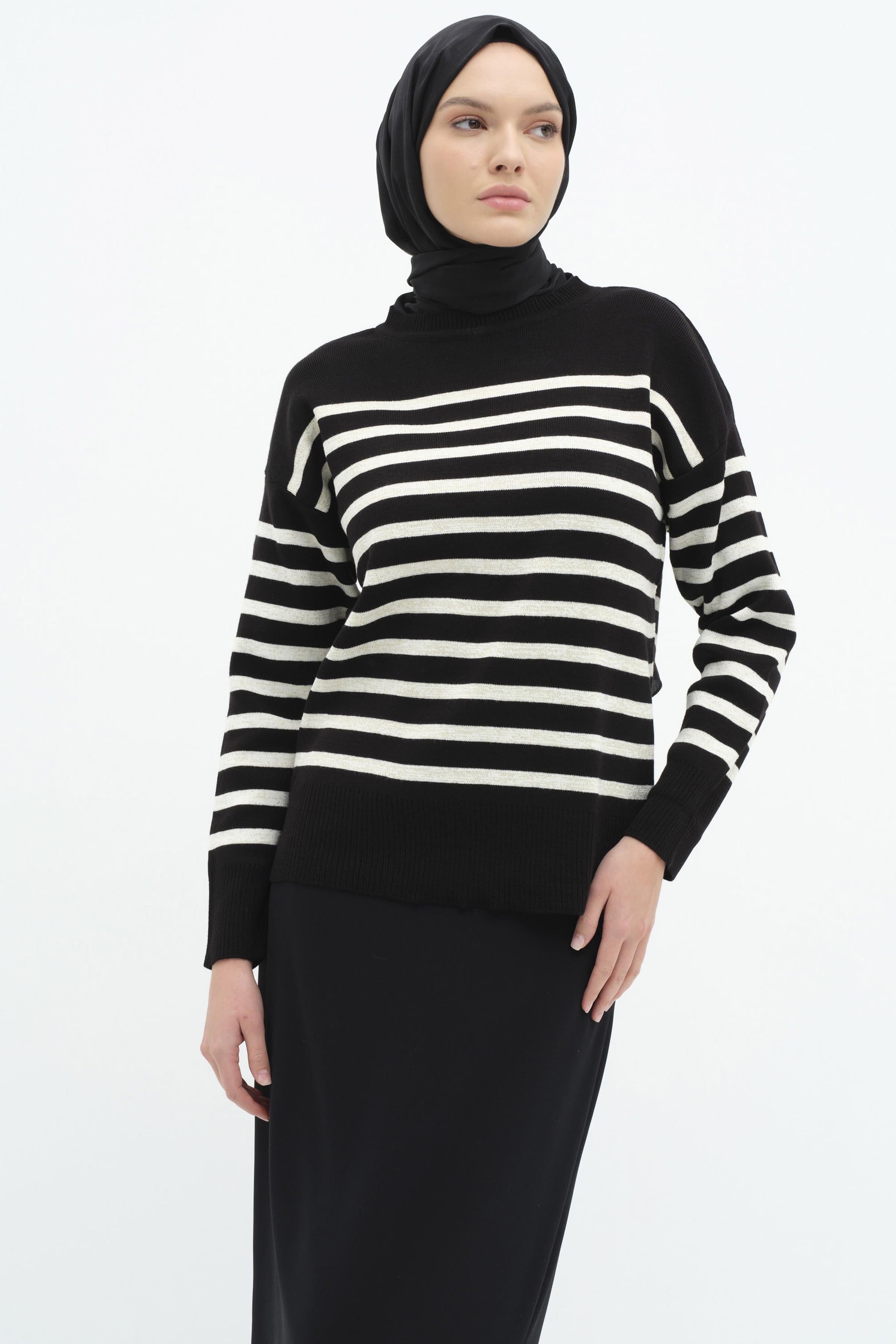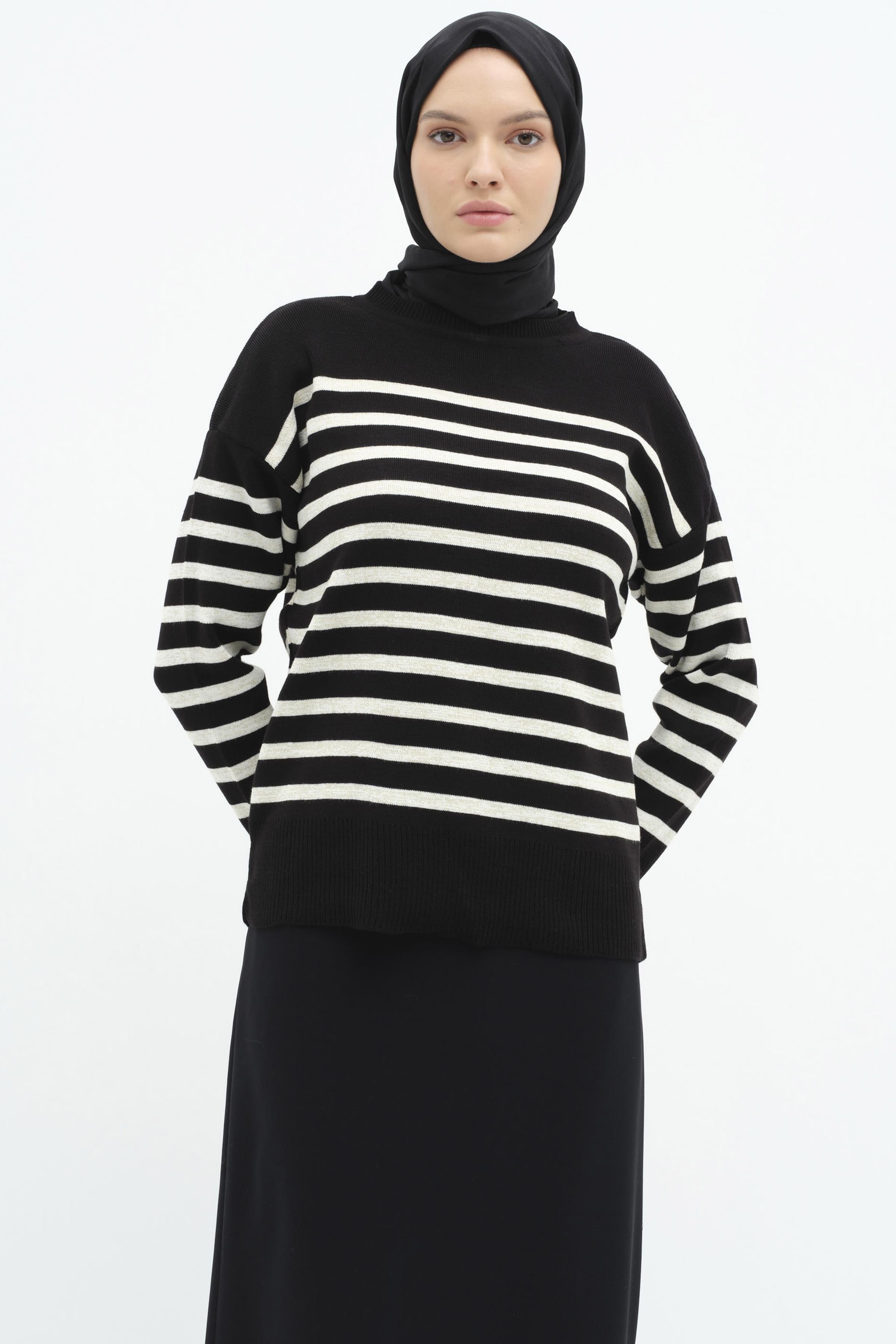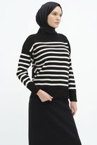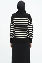 Çizgili Düşük Kol Triko Kazak - Siyah - Ekru