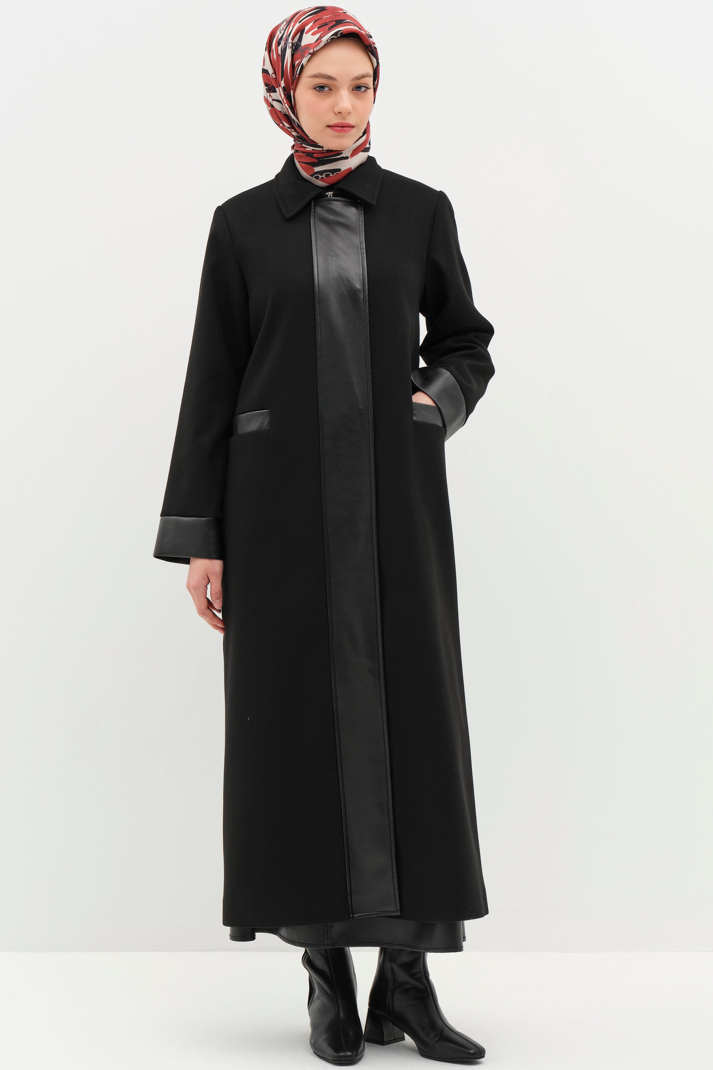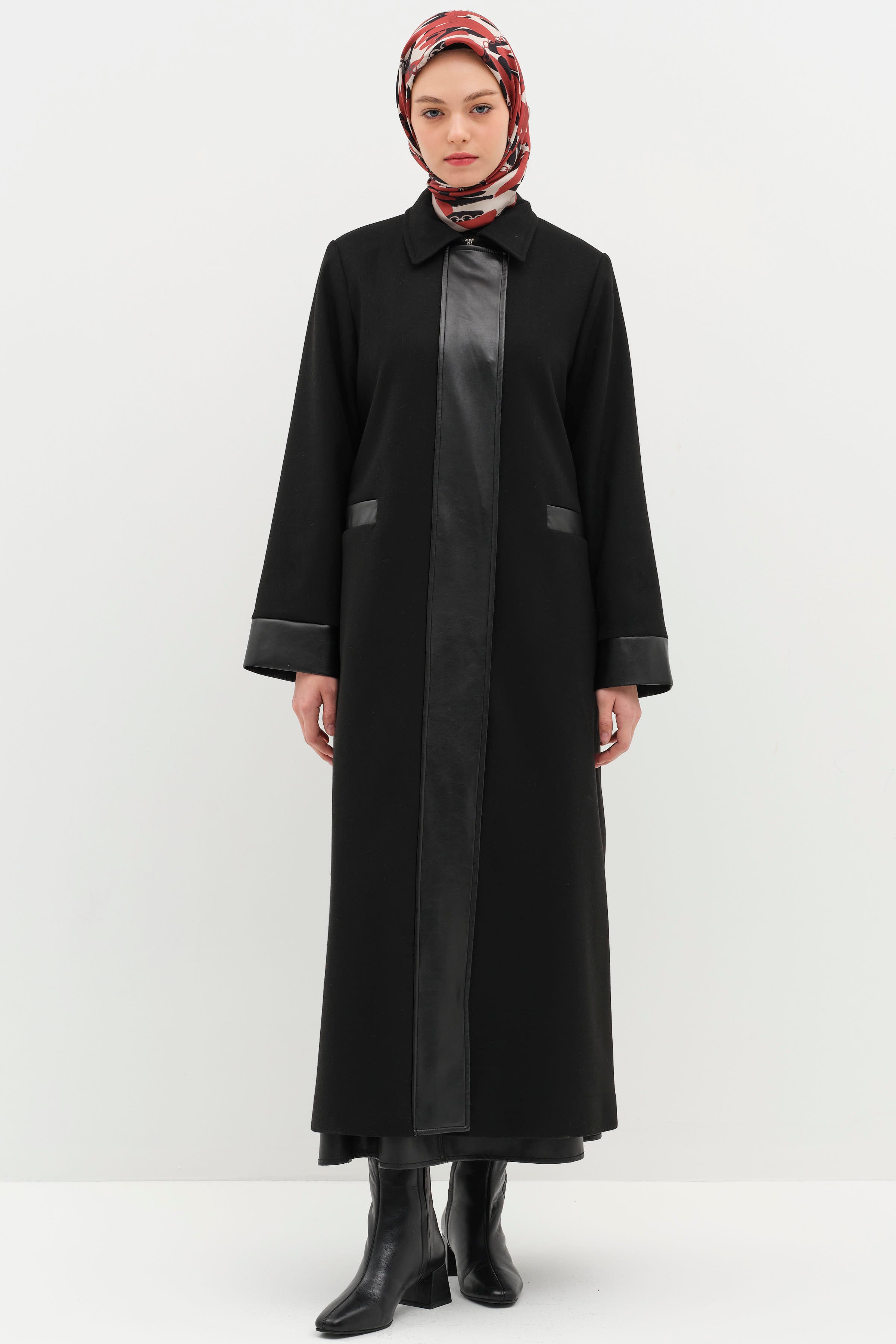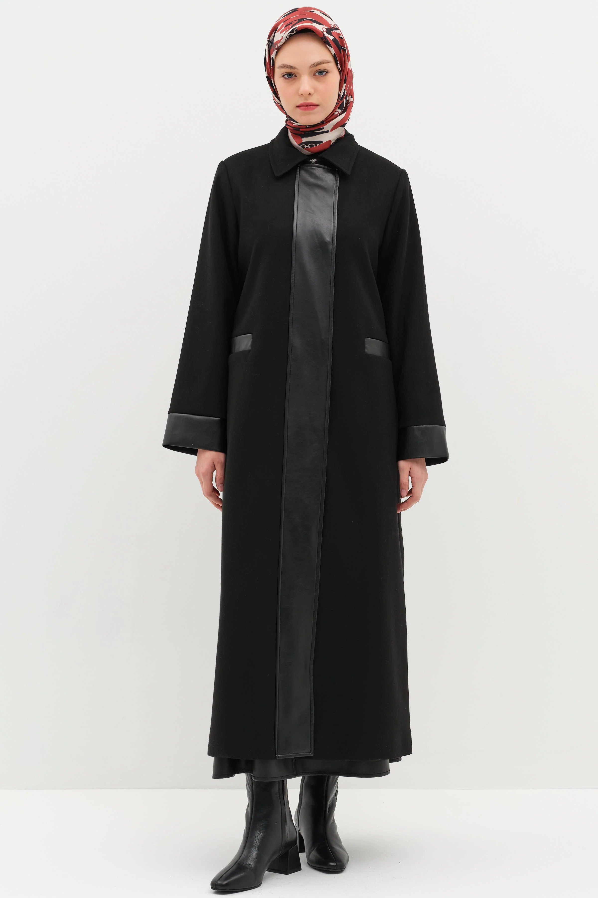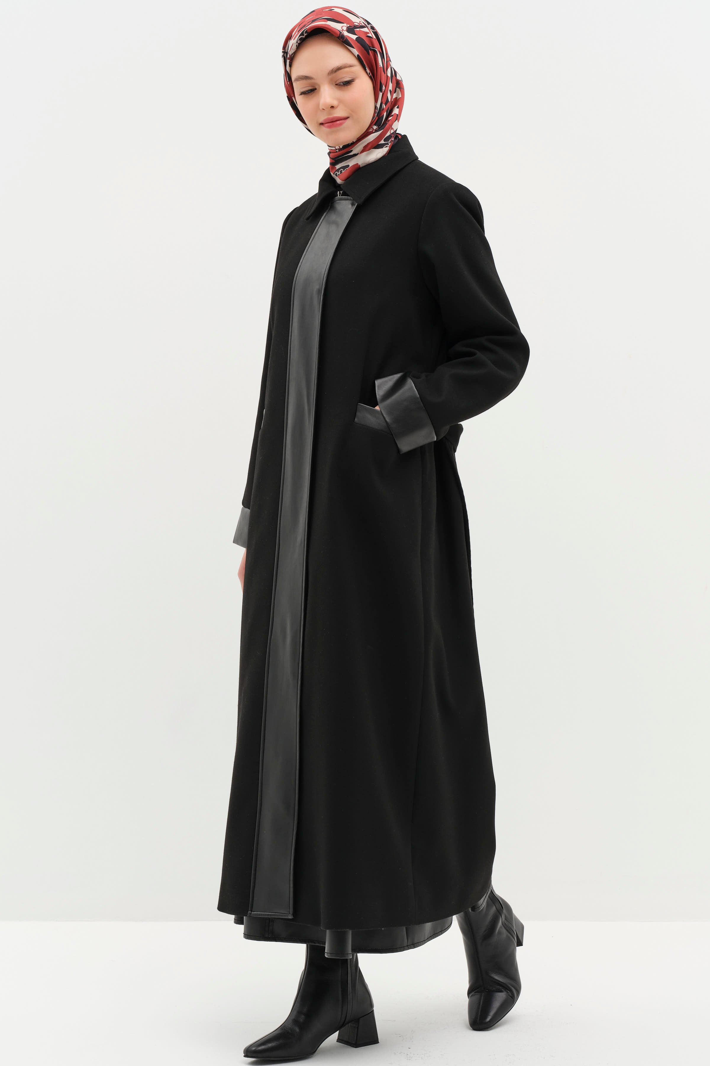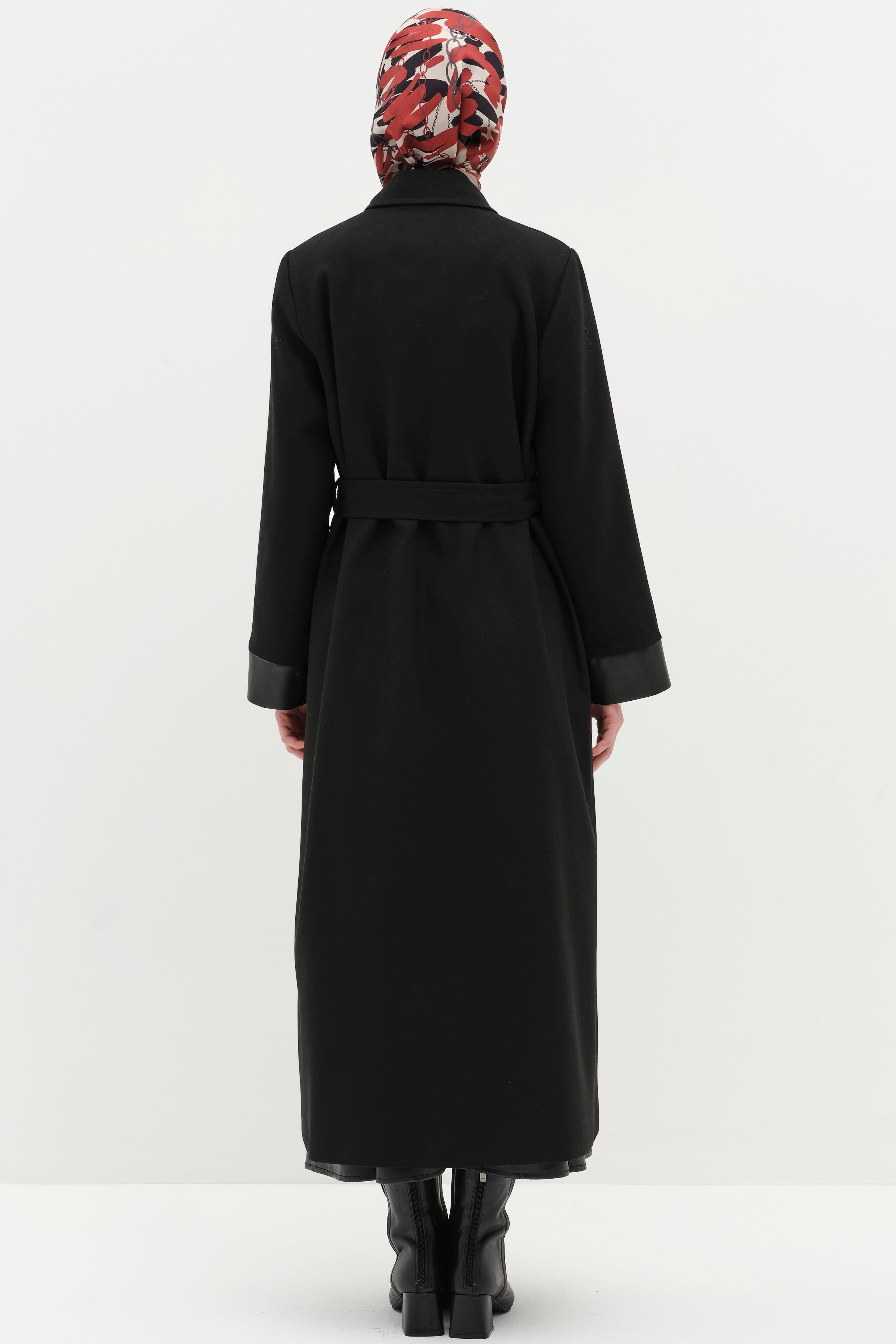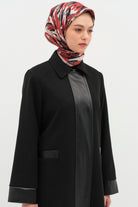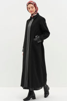 Deri Garnili Kuşaklı Manto - Siyah