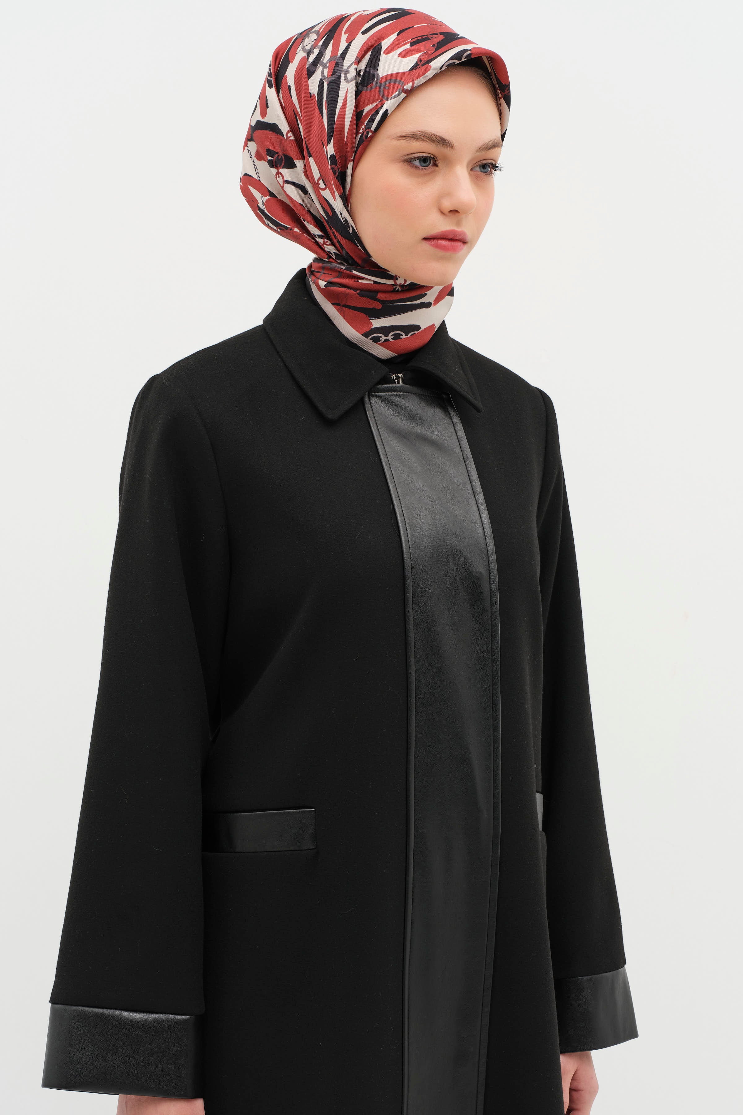 Deri garnili detayları ve kuşaklı tasarımıyla zarif bir görünüm sunan bu manto, modern ve şık bir seçenek. Akıcı kesimi sayesinde vücut hatlarını vurgularken deri dokunuşlar kombine sofistike bir hava katar.