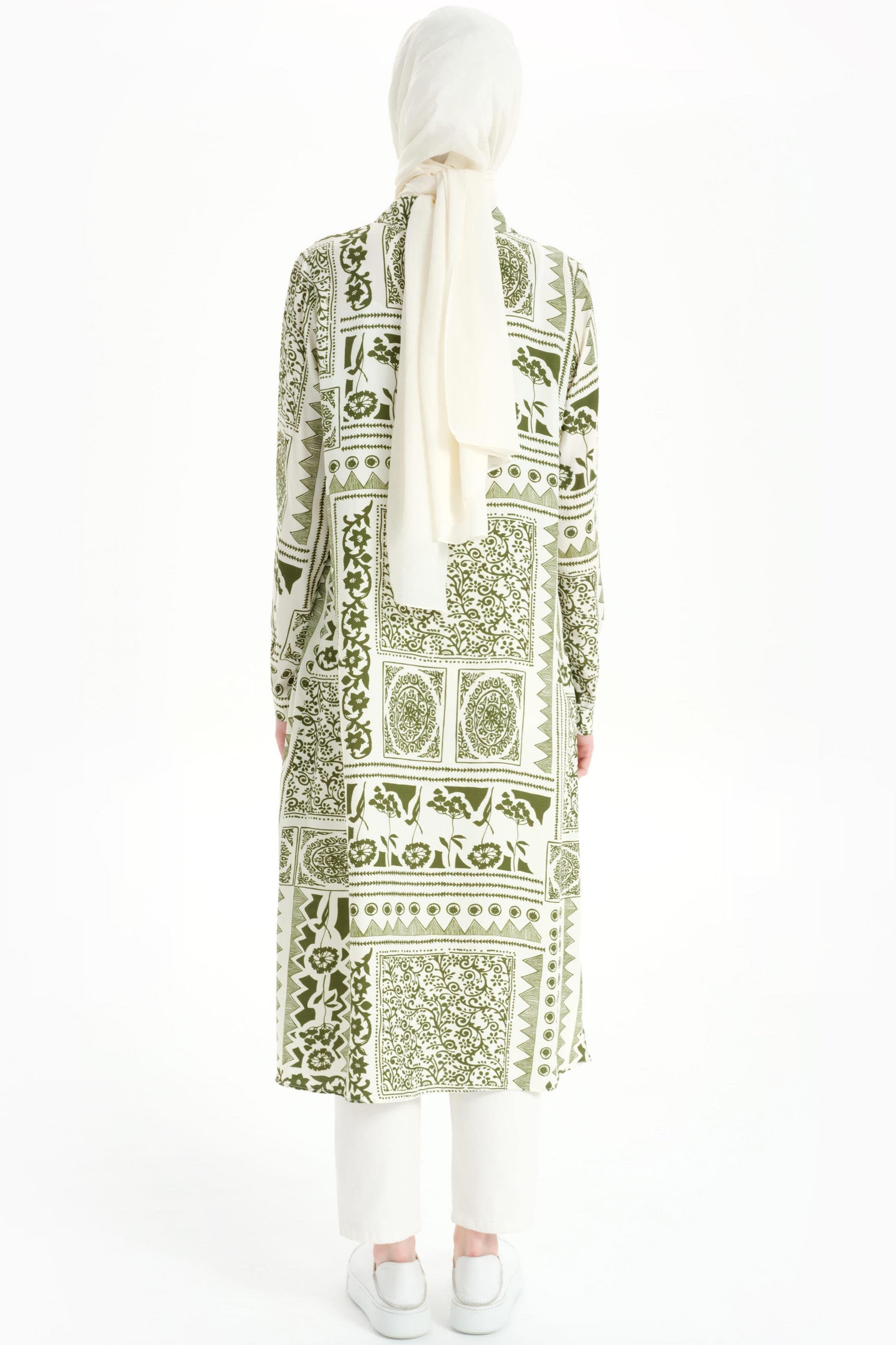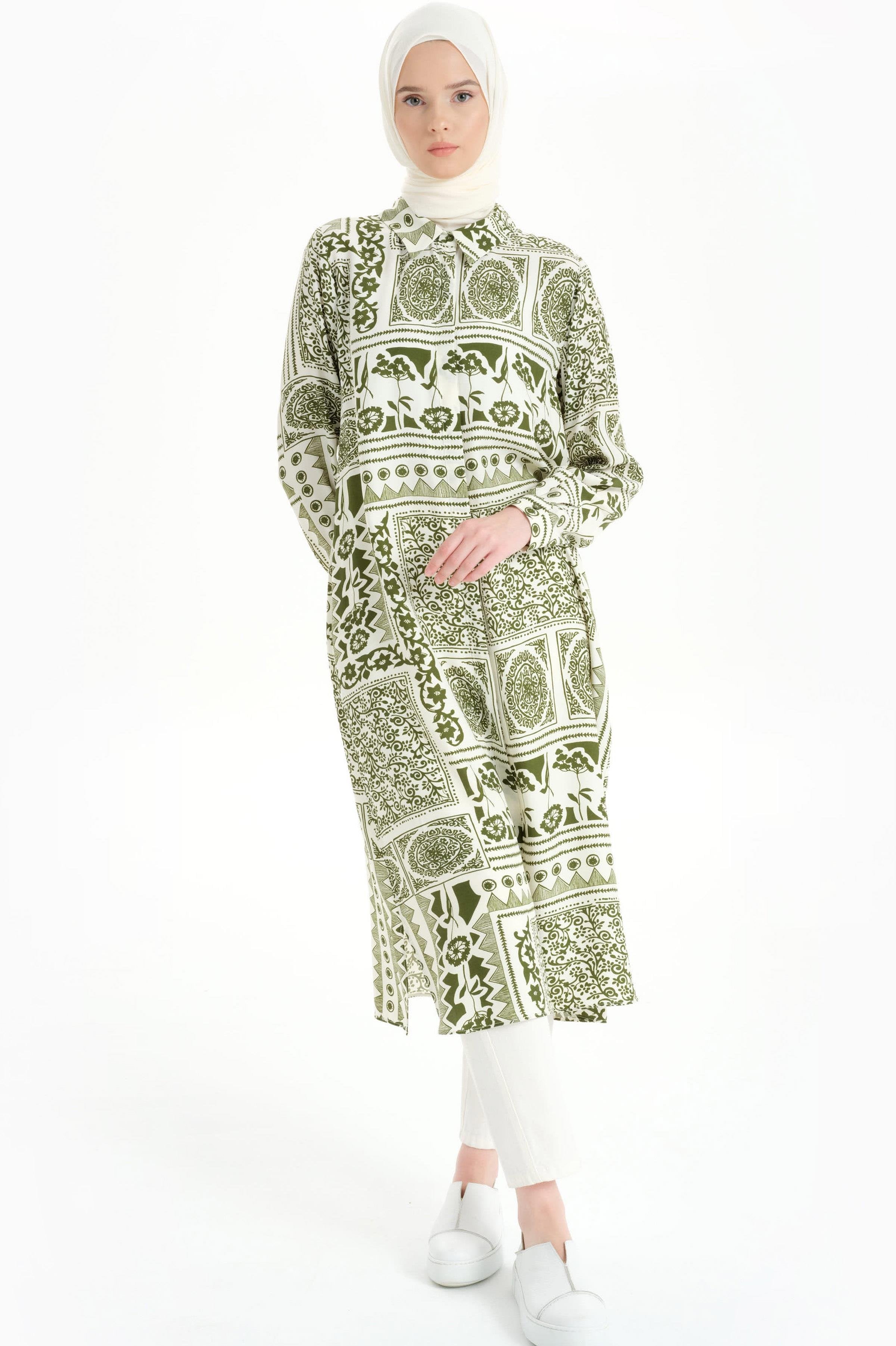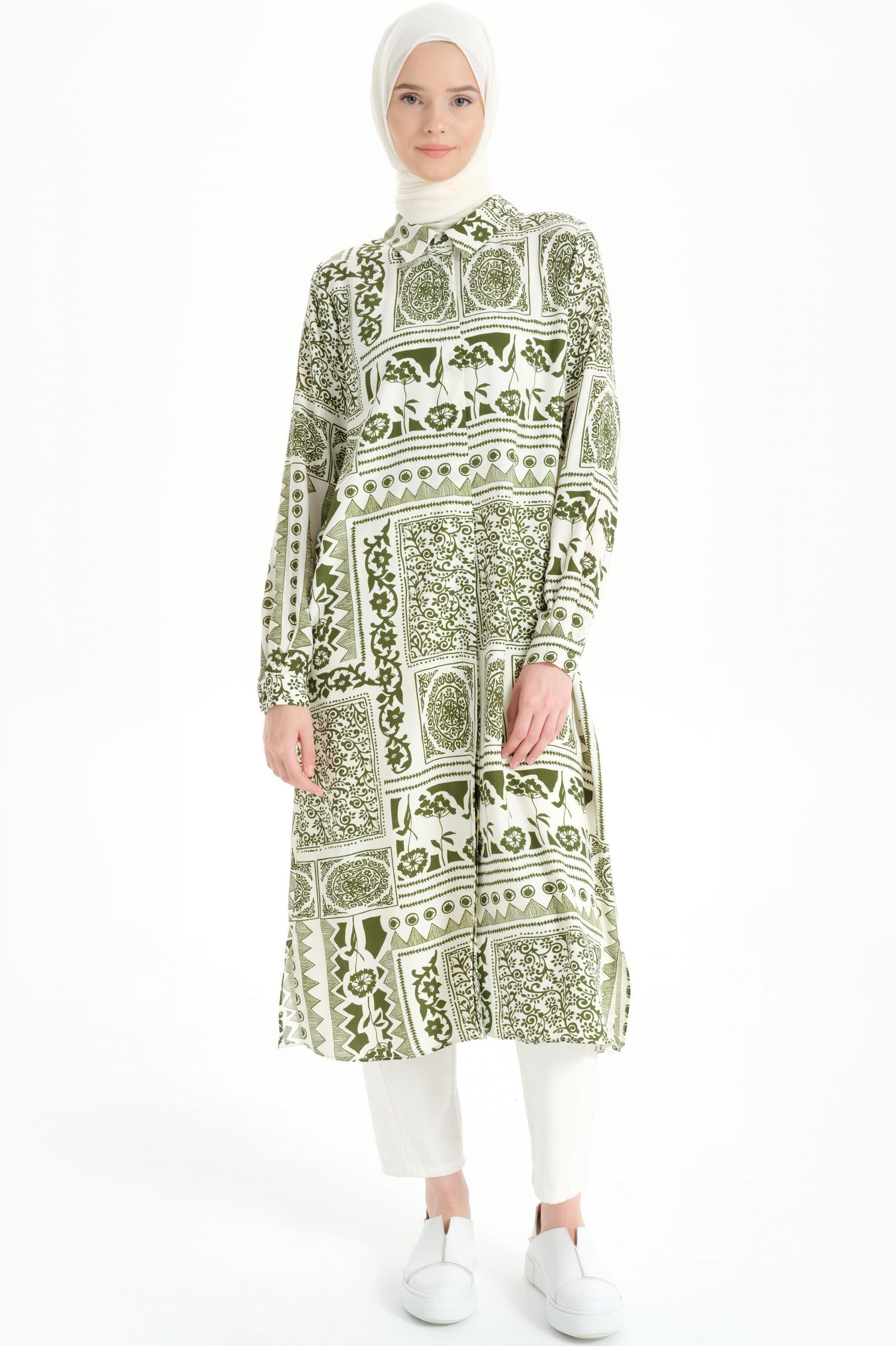 Etnik desenli uzun tunik, benzersiz desenleri ve rahat kesimiyle dikkat çeker. Etnik motiflerin zarif dokunuşları, tunikte özgün ve sofistike bir görünüm yaratır. Yumuşak ve hafif kumaşı sayesinde gün boyu konfor sunar.
