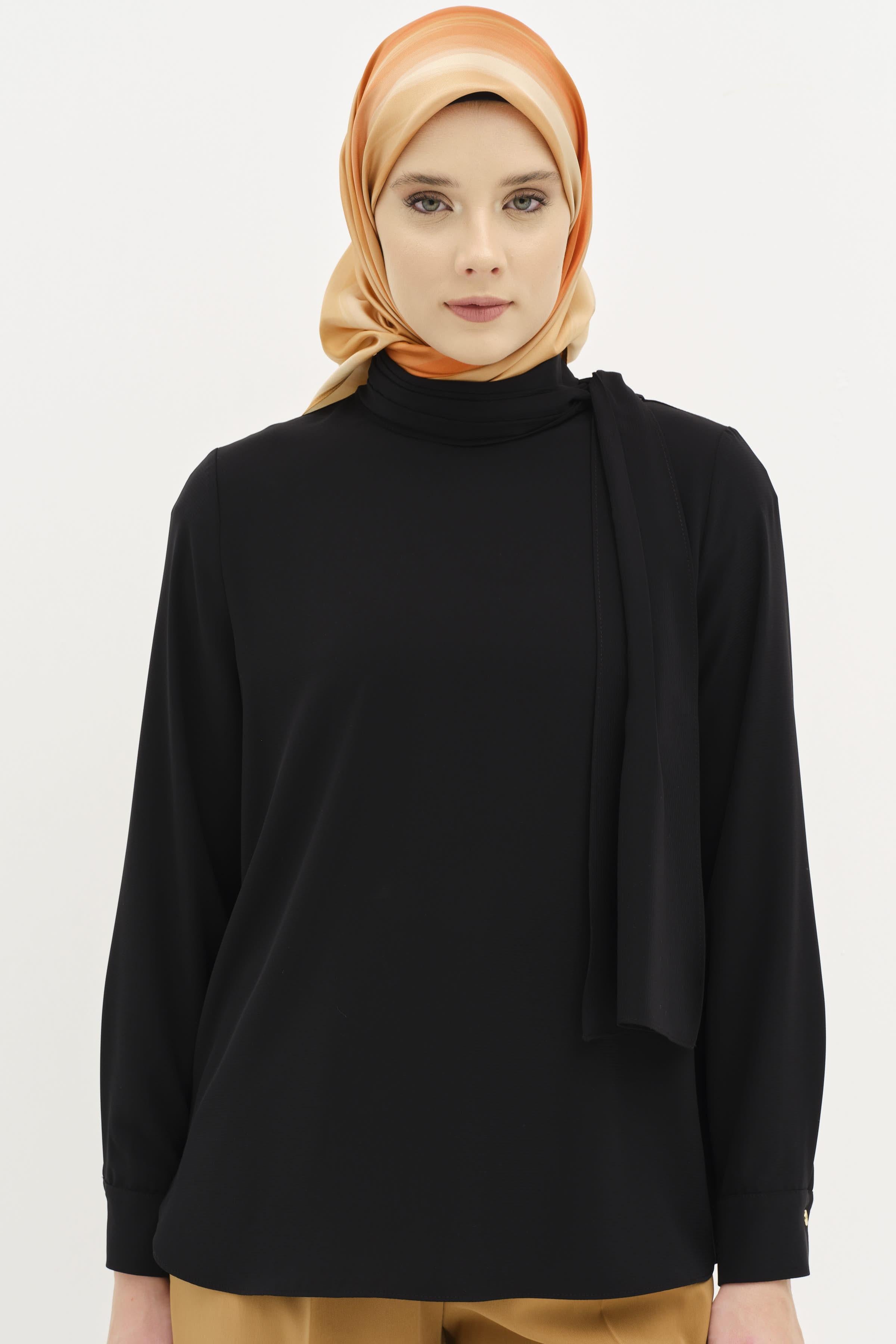 Fular Yaka Detaylı Bluz, şıklığı ve zarafeti bir araya getiren sofistike bir üst giyim parçasıdır.