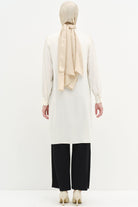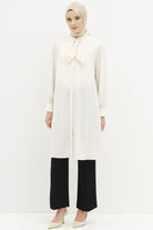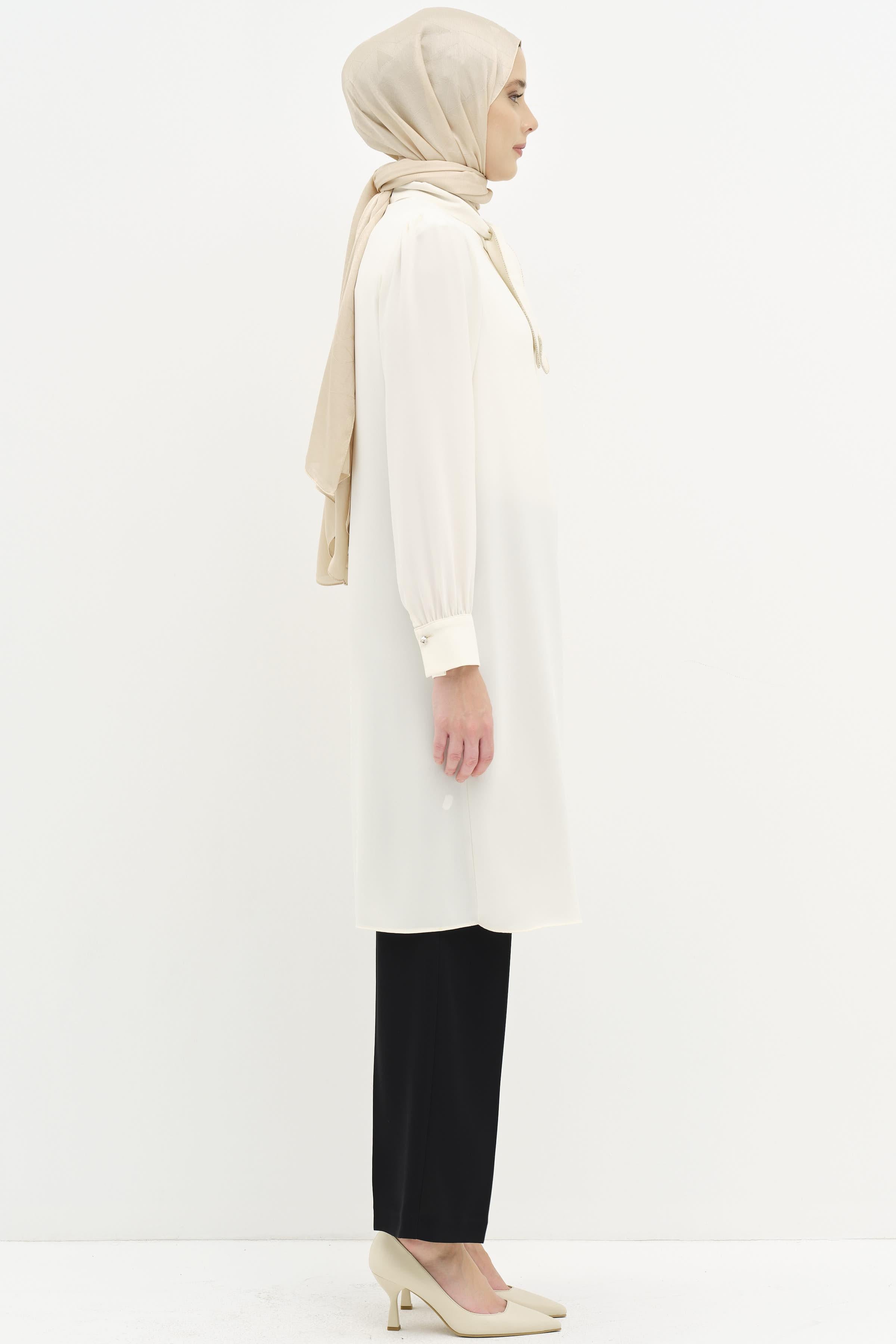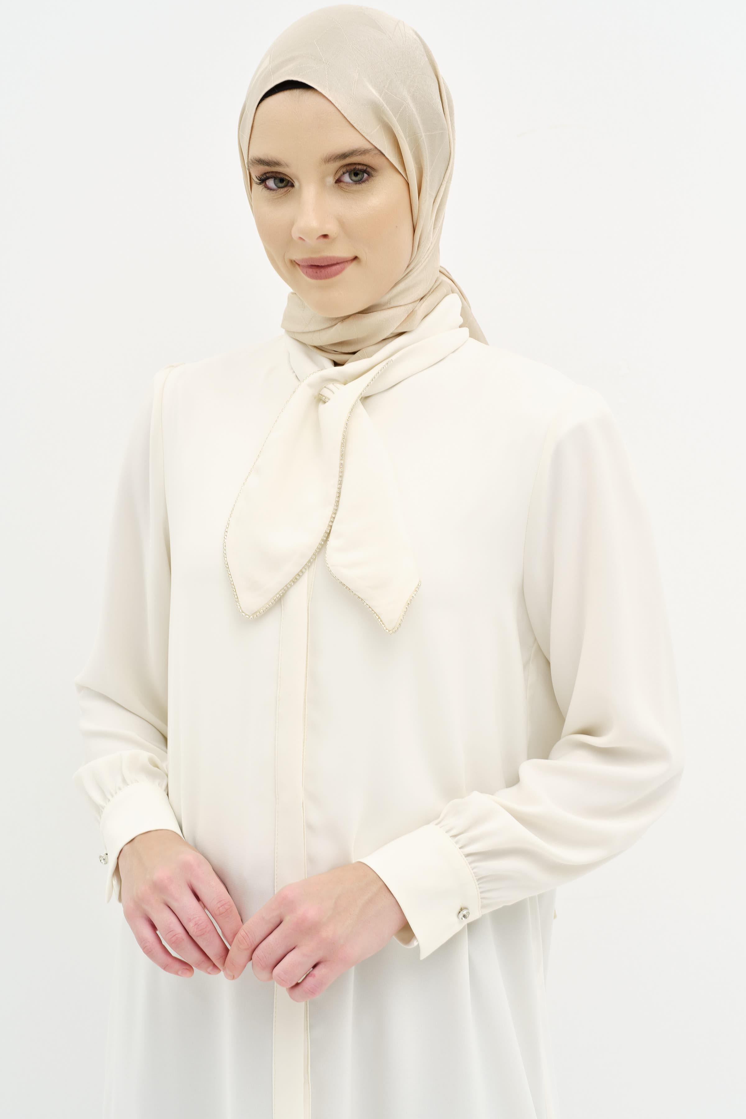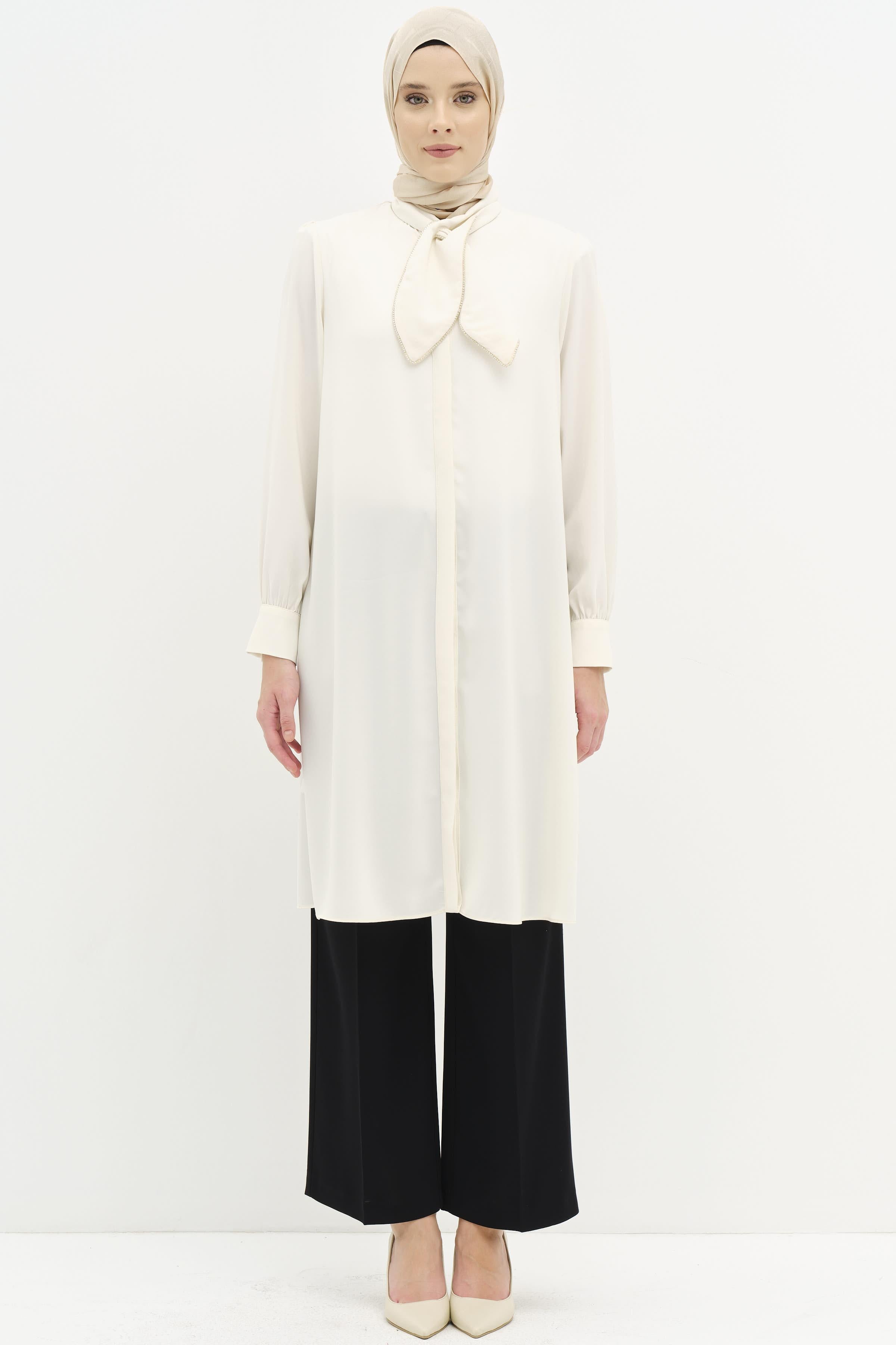 Fular Yaka Taş Detaylı Tunik - Ekru