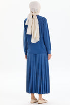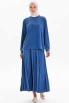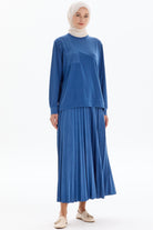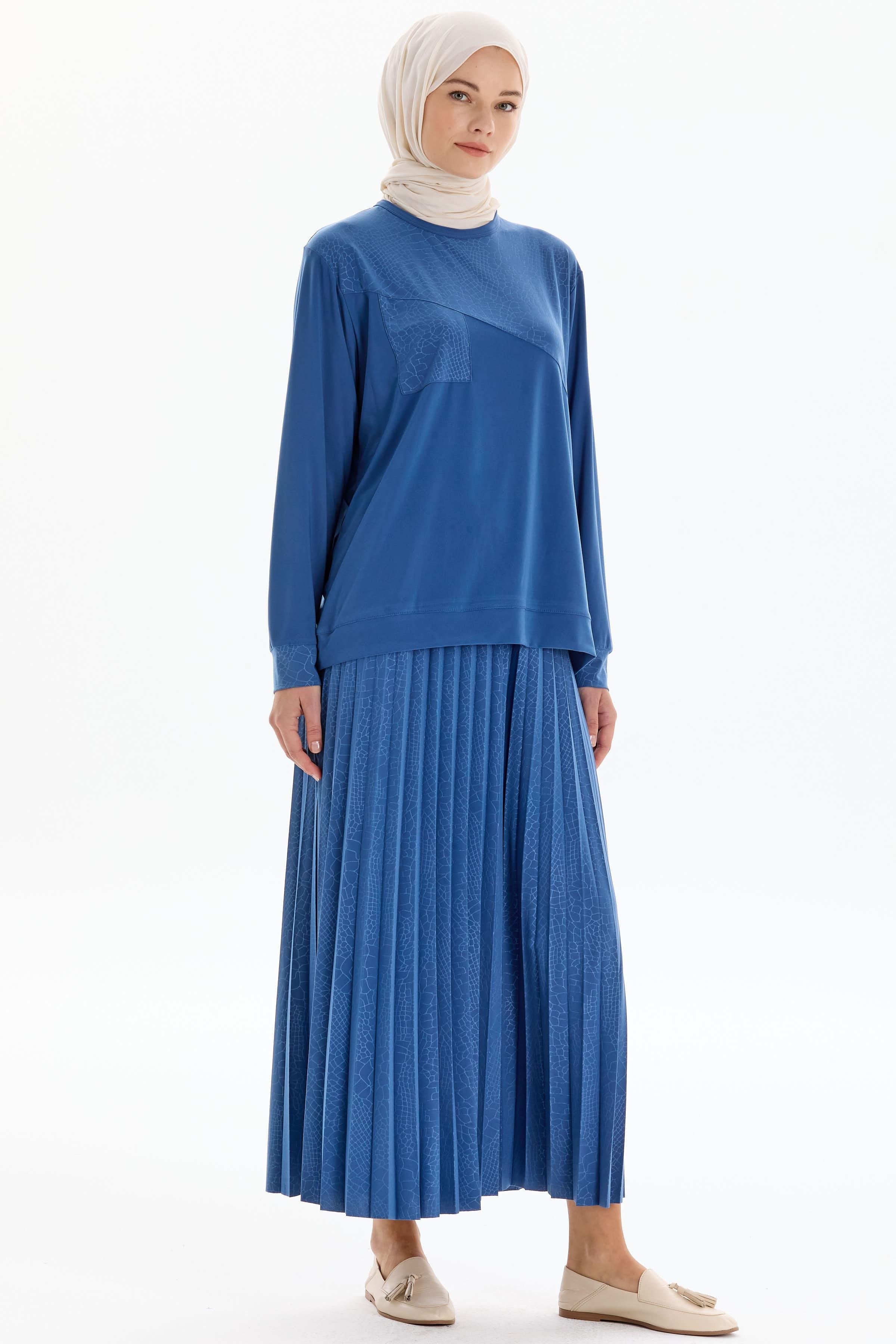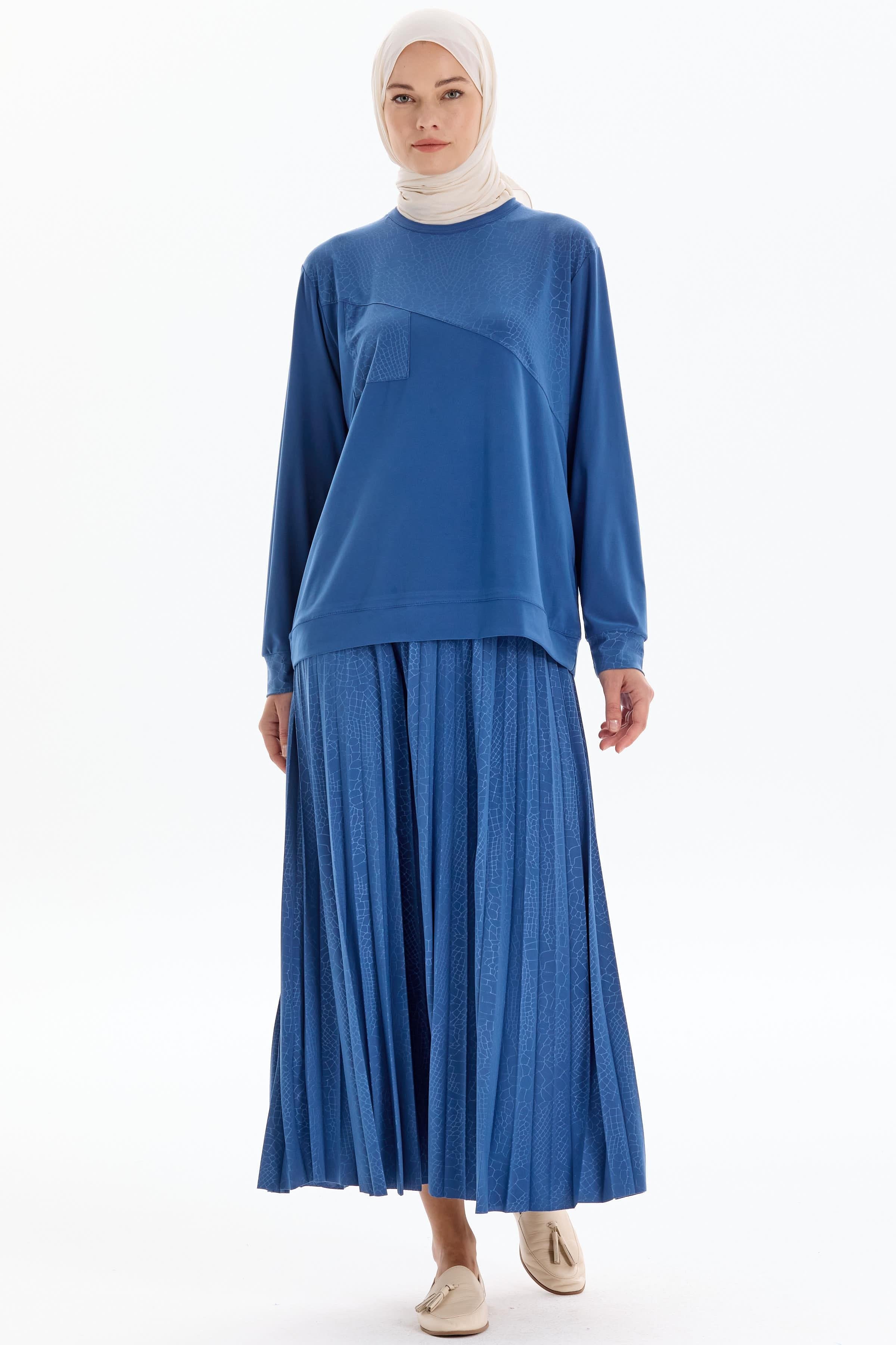 Bluz üzerindeki zarif garni işlemeleriyle zenginleştirilmiş bu takım, modern ve trend bir görünüm sunar.