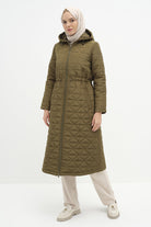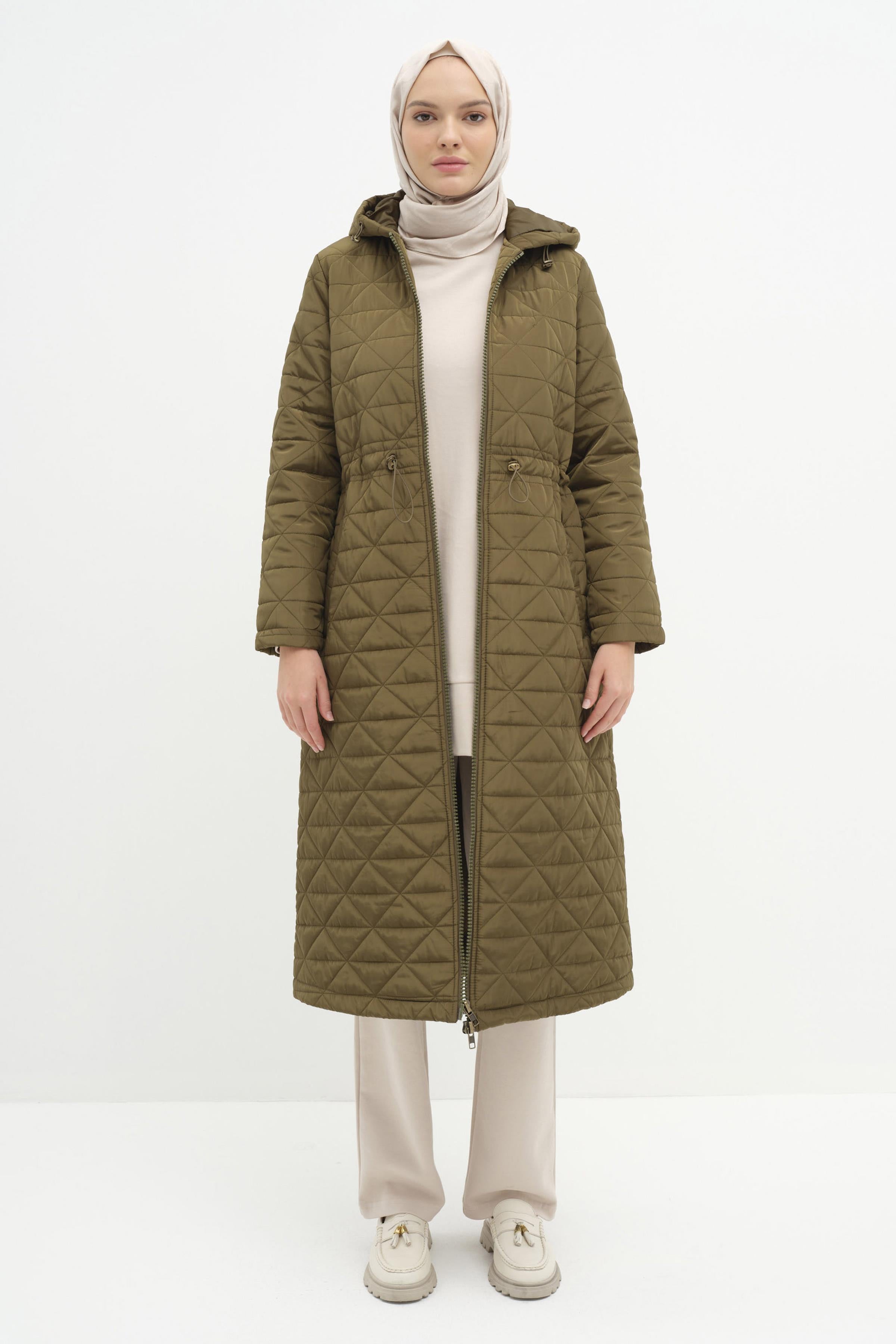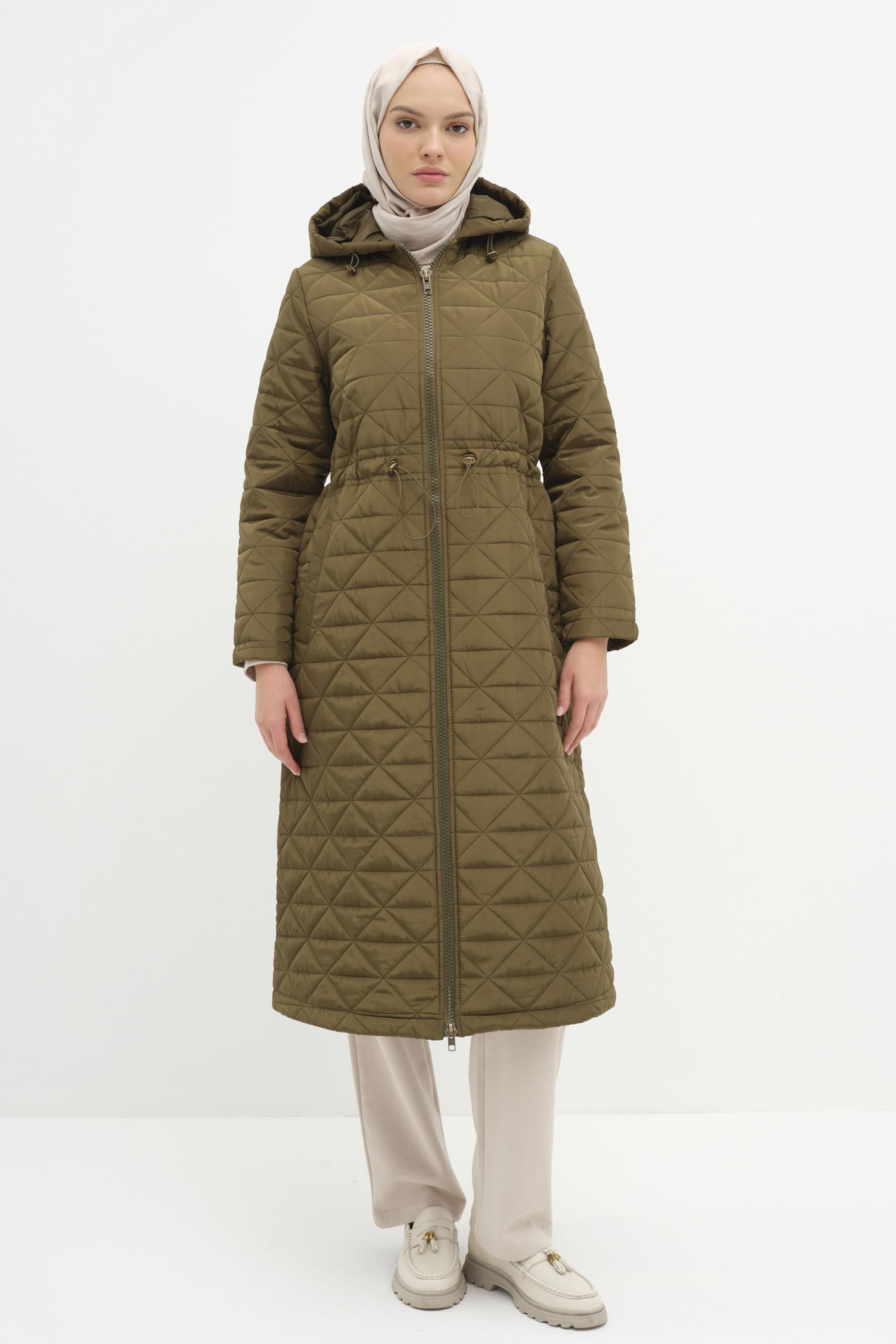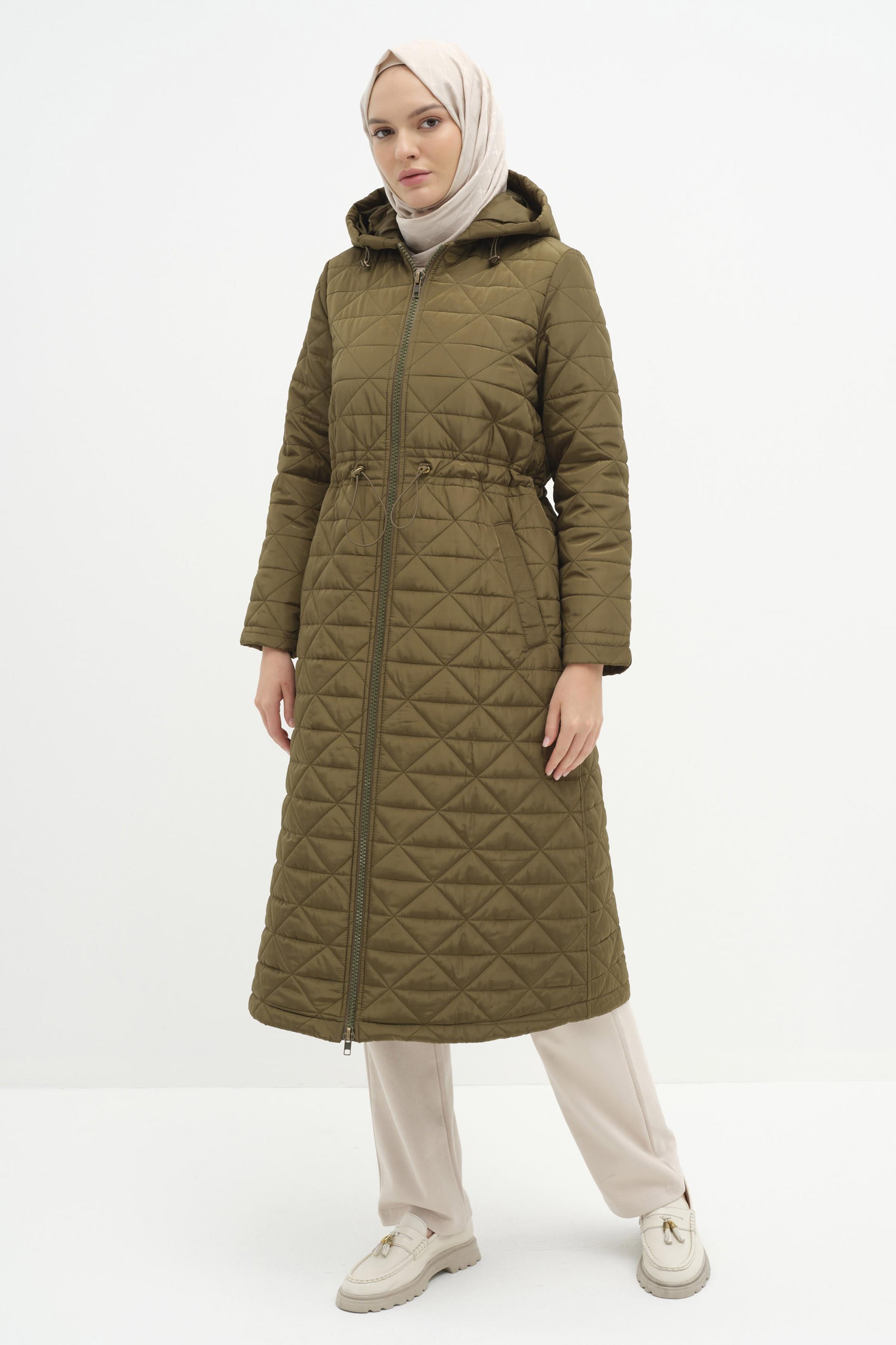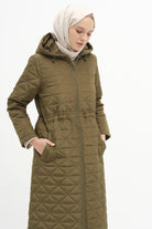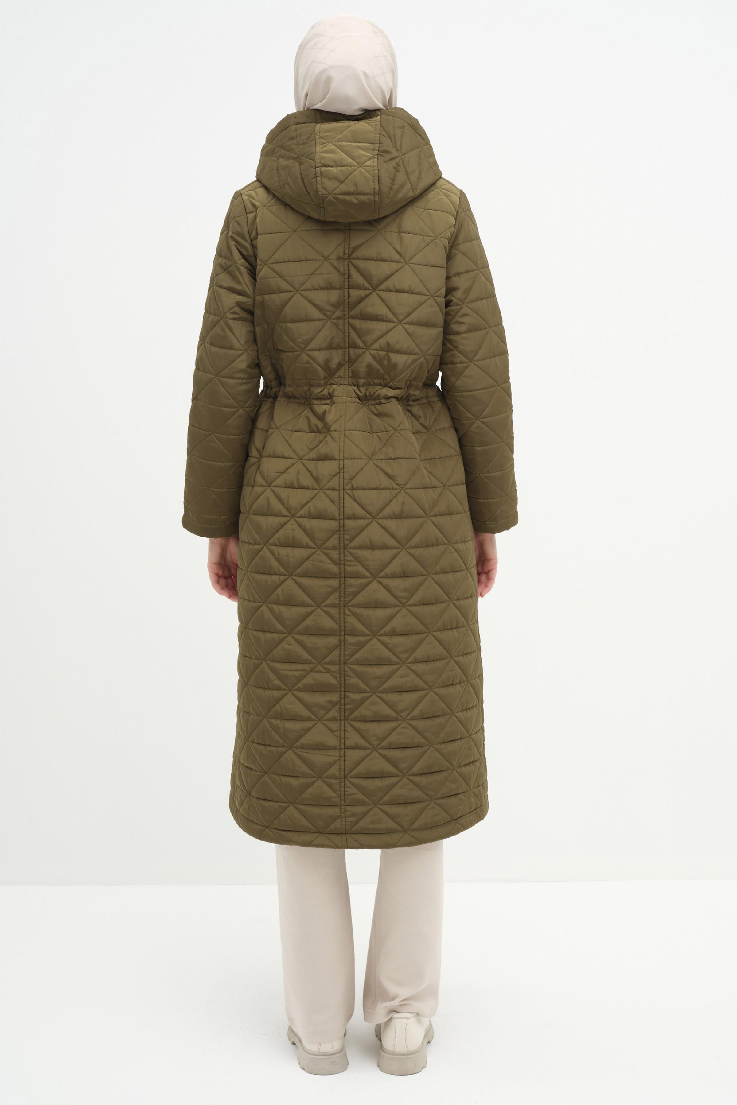 Kapüşonlu Altıgen Desenli Kapitone Kaban - Haki