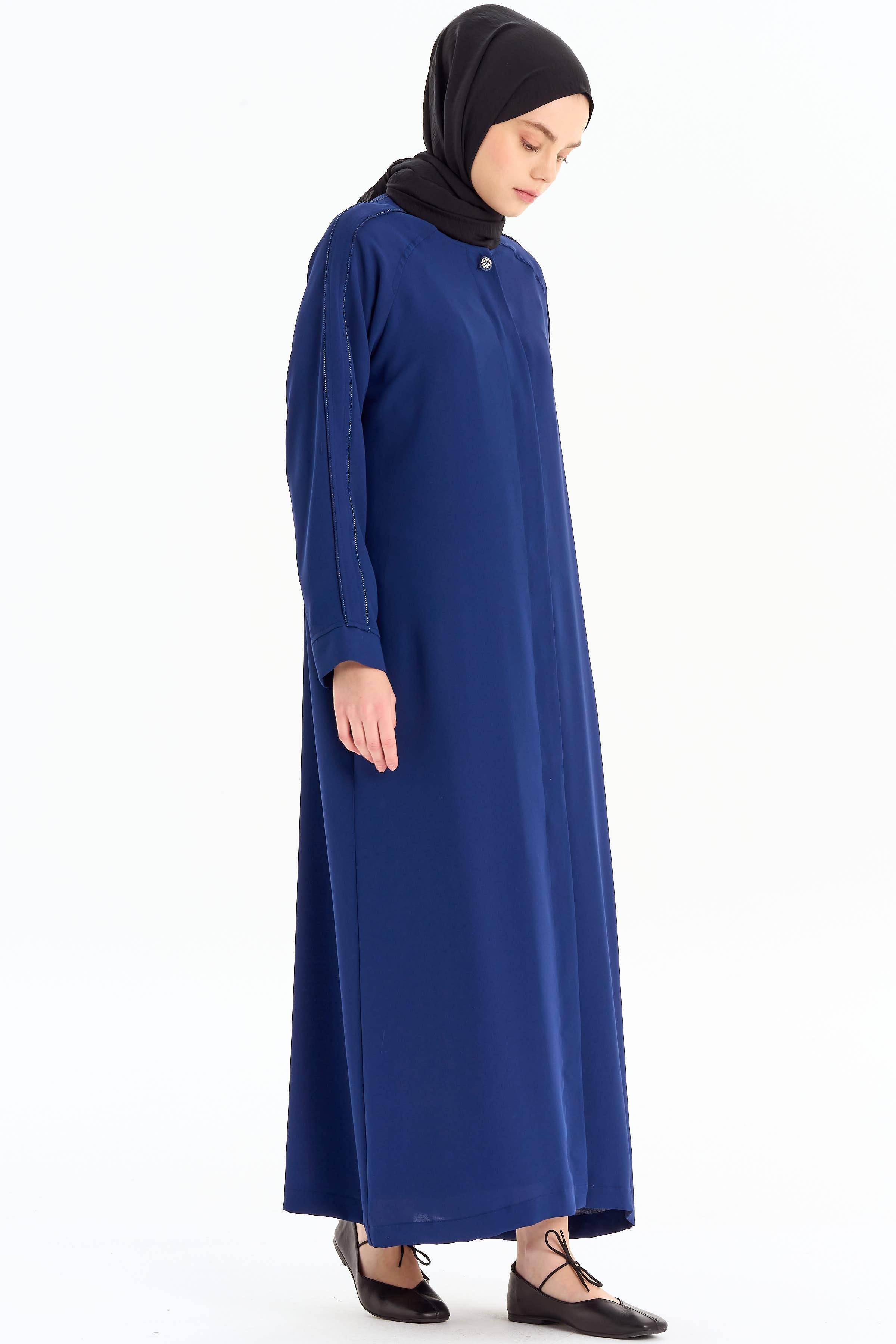 Kolları taş biyeli ferace, zarafeti ve şıklığı bir araya getiriyor. Kol detaylarındaki taş biyeler, feraceye göz alıcı ve sofistike bir dokunuş katarken, geniş kesimi ile rahat bir kullanım sunar.
