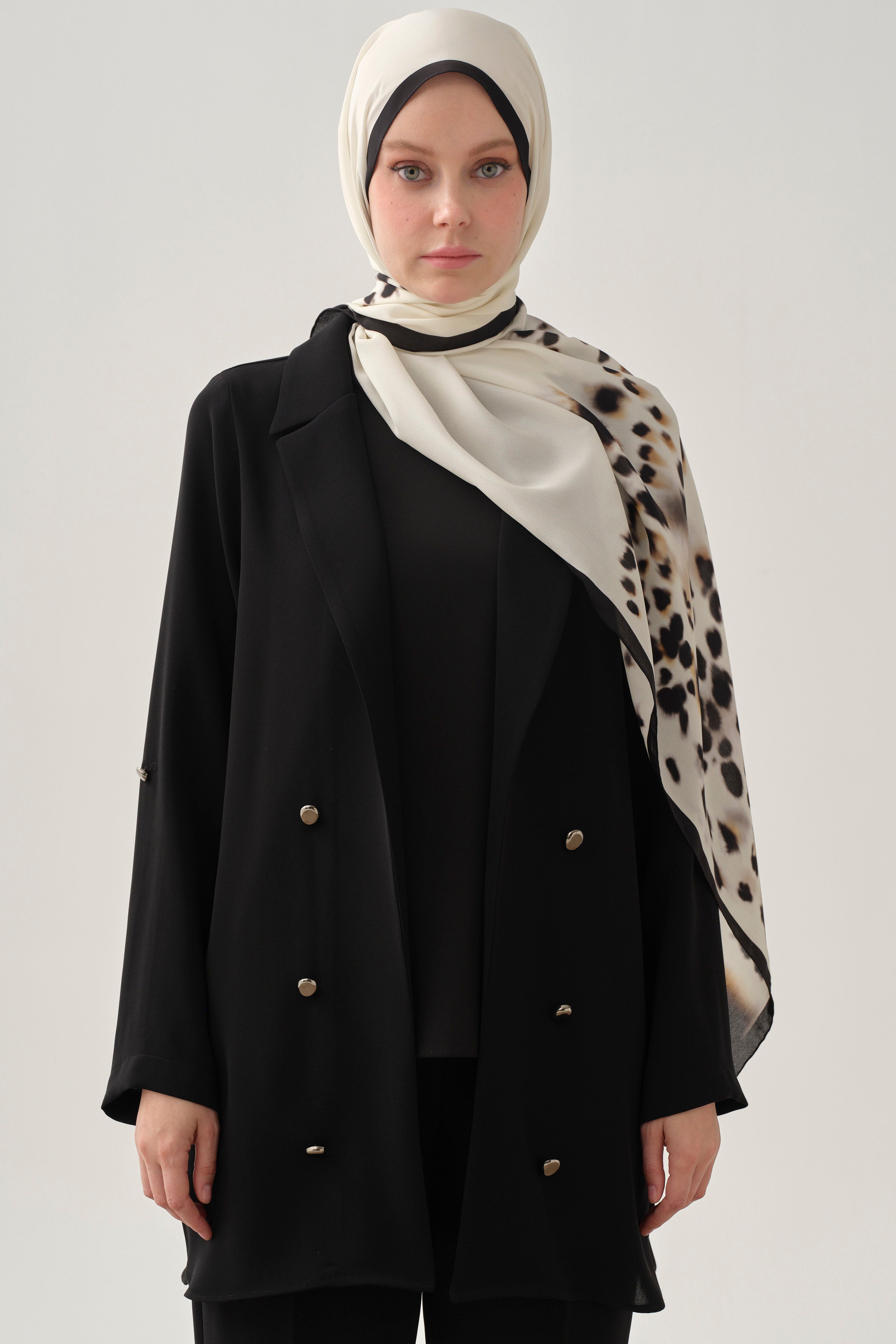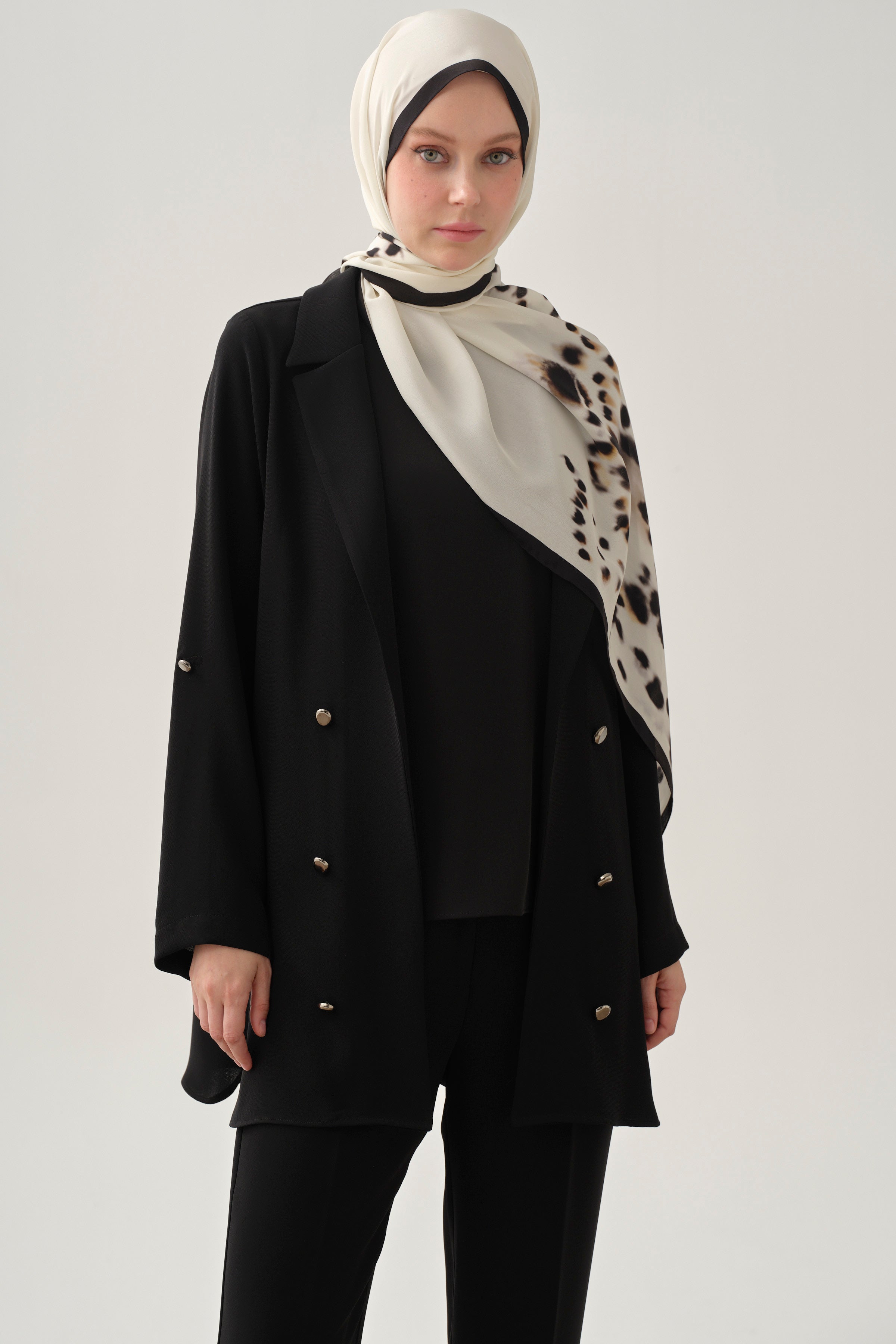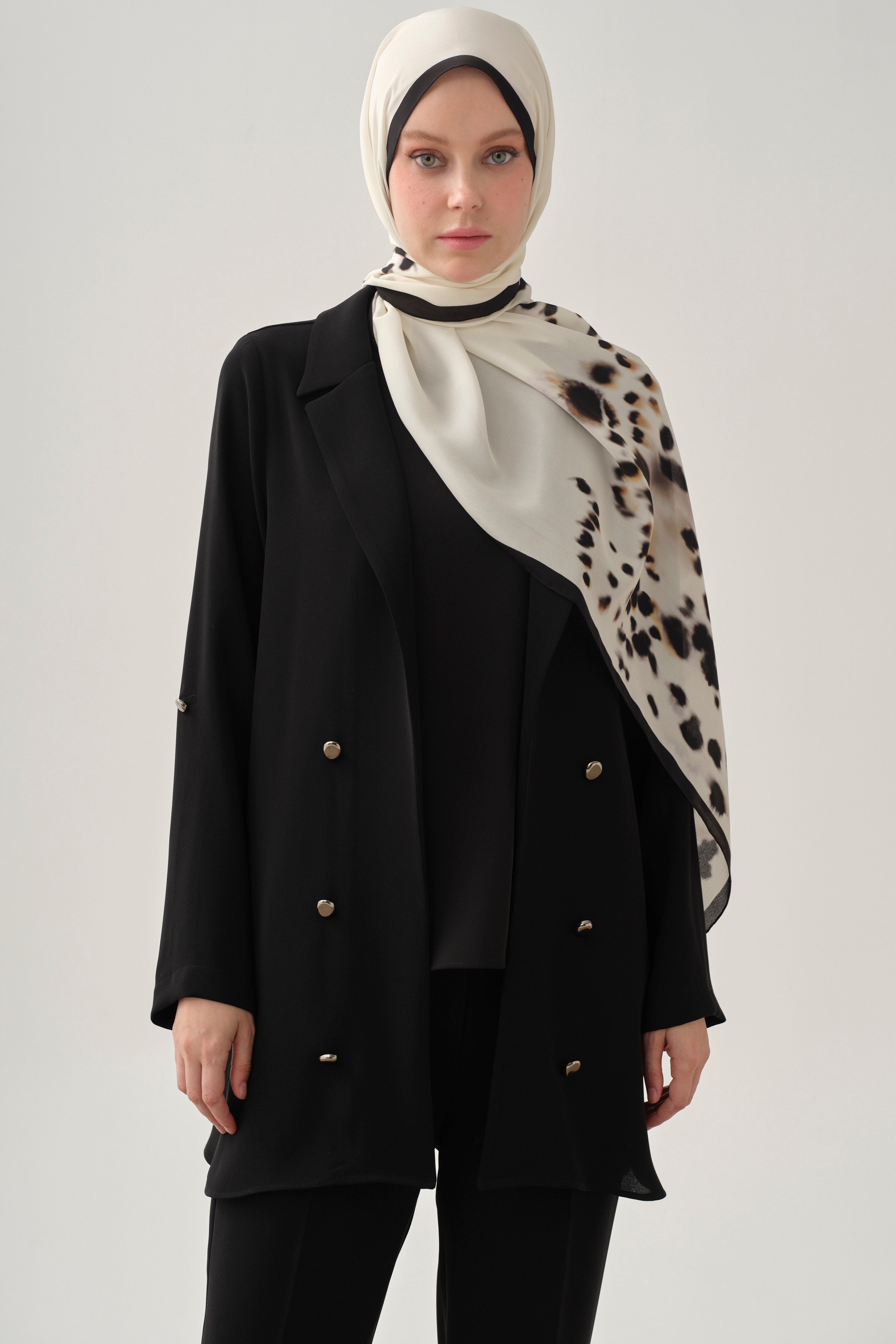 Minimal tasarımı süs düğmelerle zenginleşiyor, kol bant detaylarıyla modern bir siluet kazanıyor.