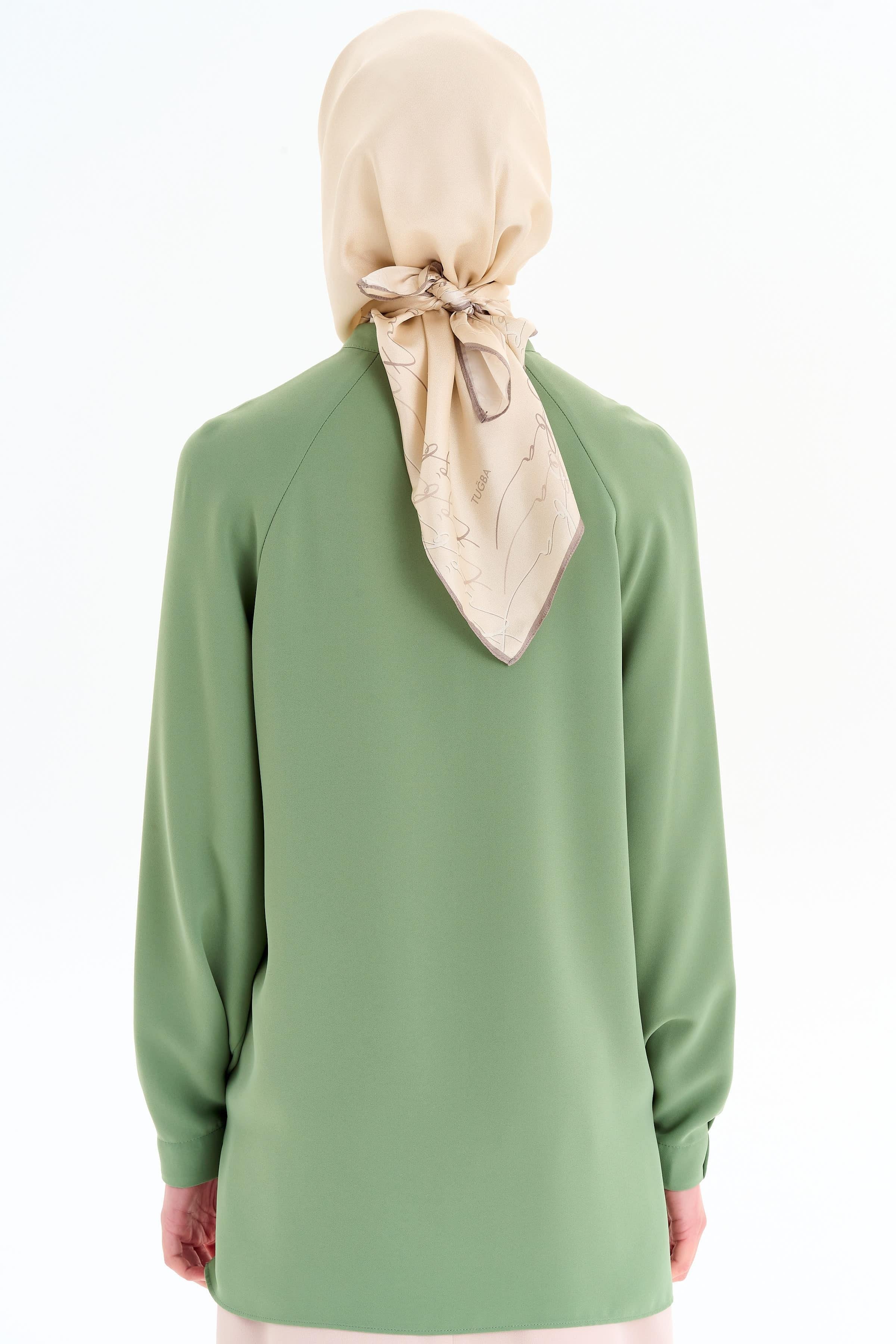 Kolu pile detayıyla öne çıkan bu bluz, zarafeti ve şıklığı bir arada sunar. Pile detayı omuzlarda veya kollarda kullanılarak feminen bir görünüm sağlarken, yumuşak ve rahat bir kumaşla gün boyu konfor sunar.