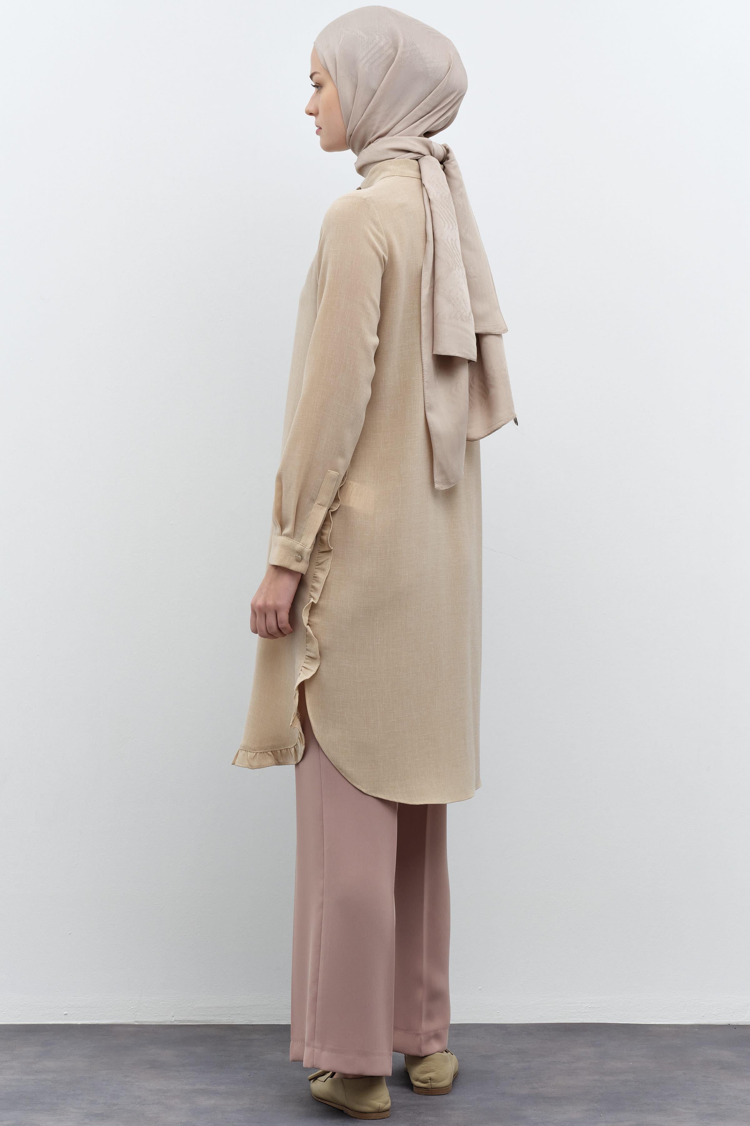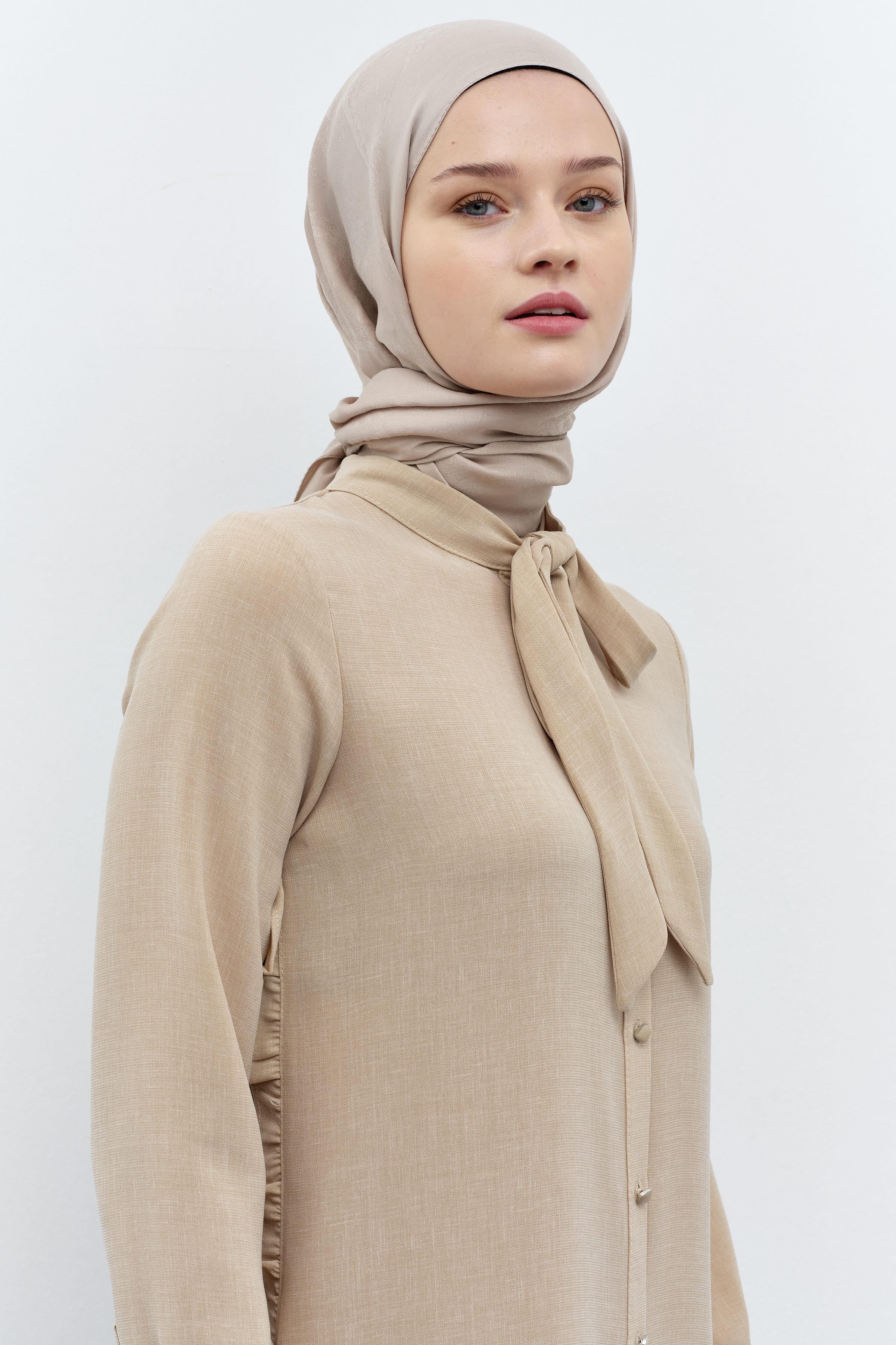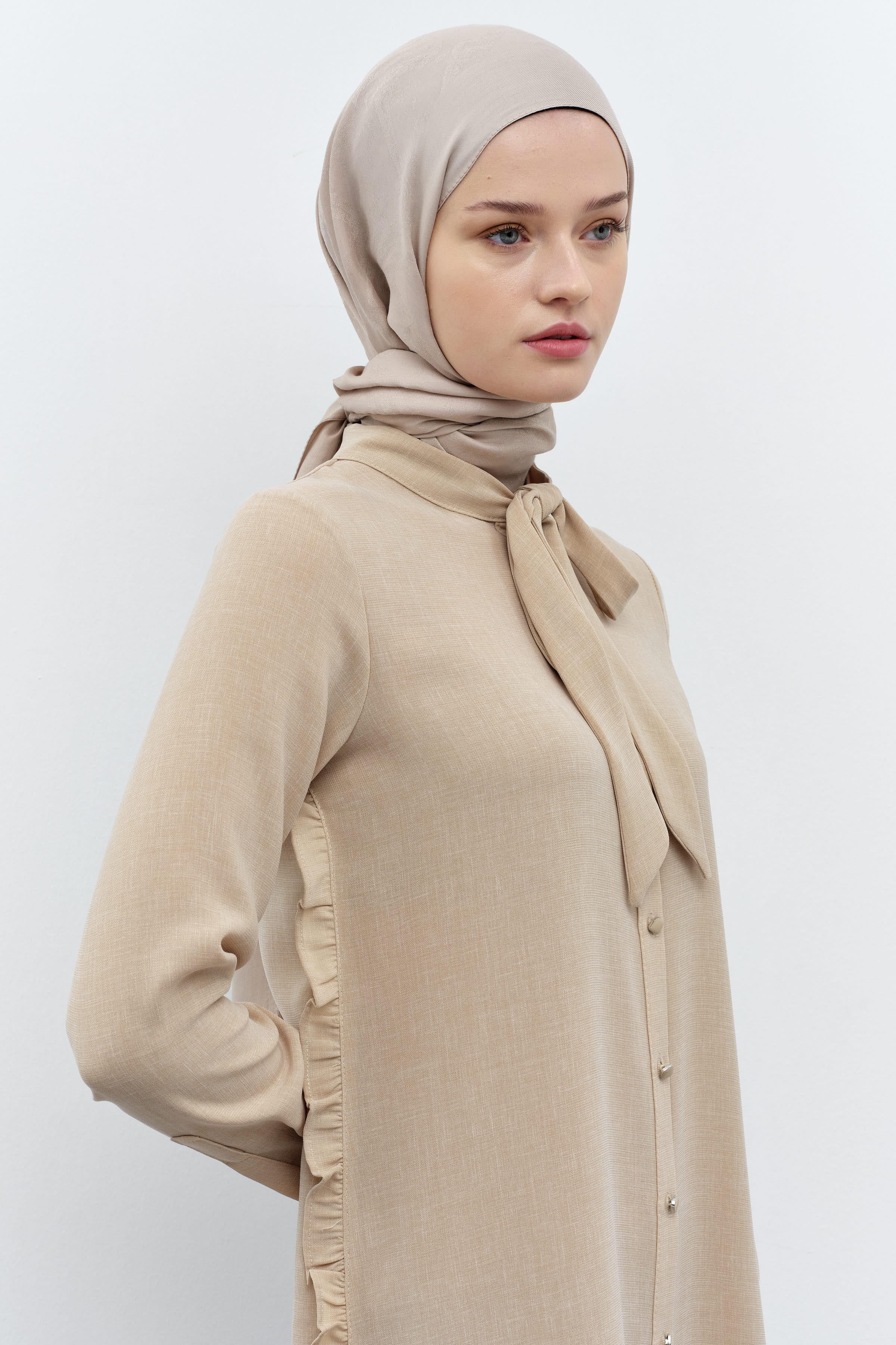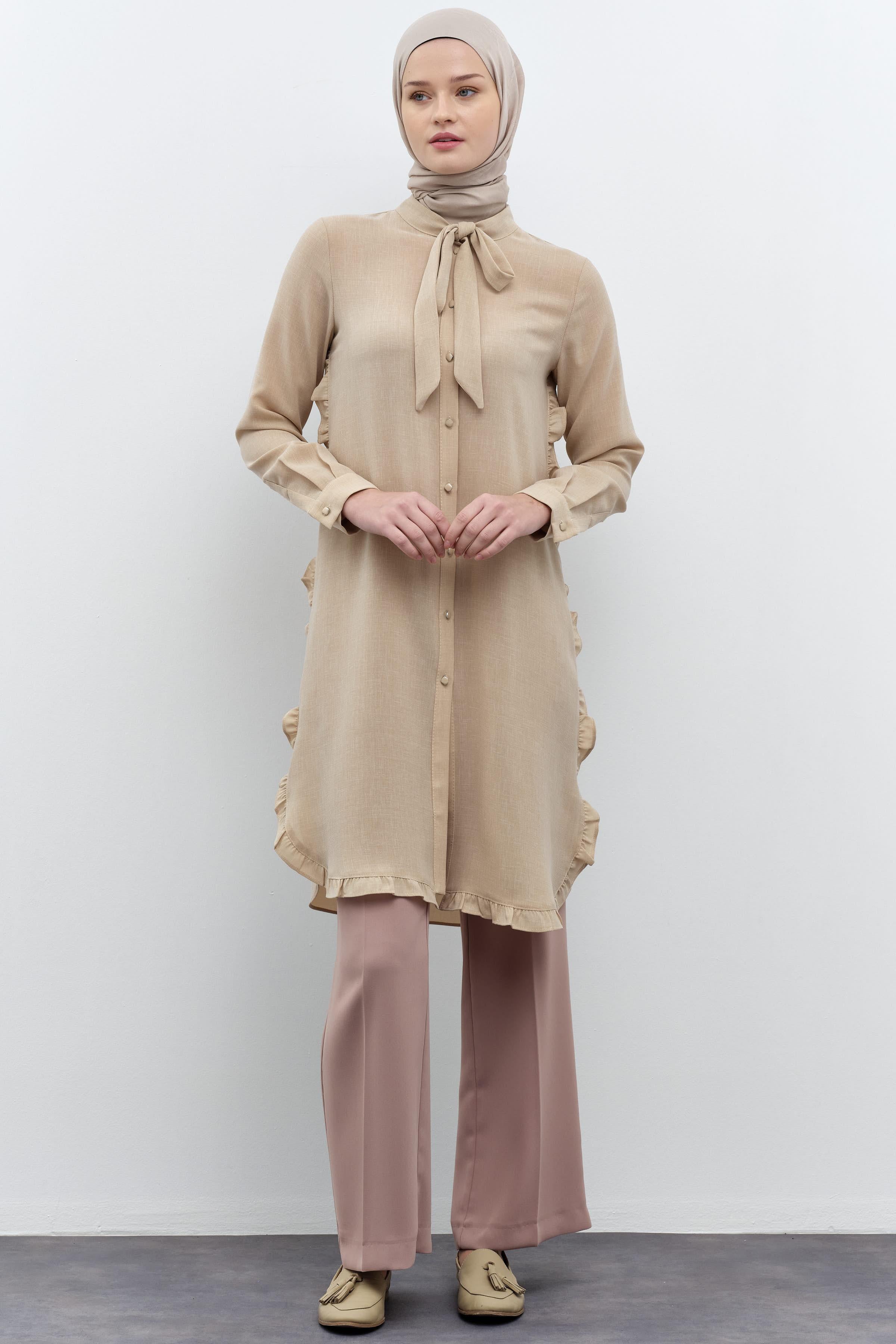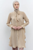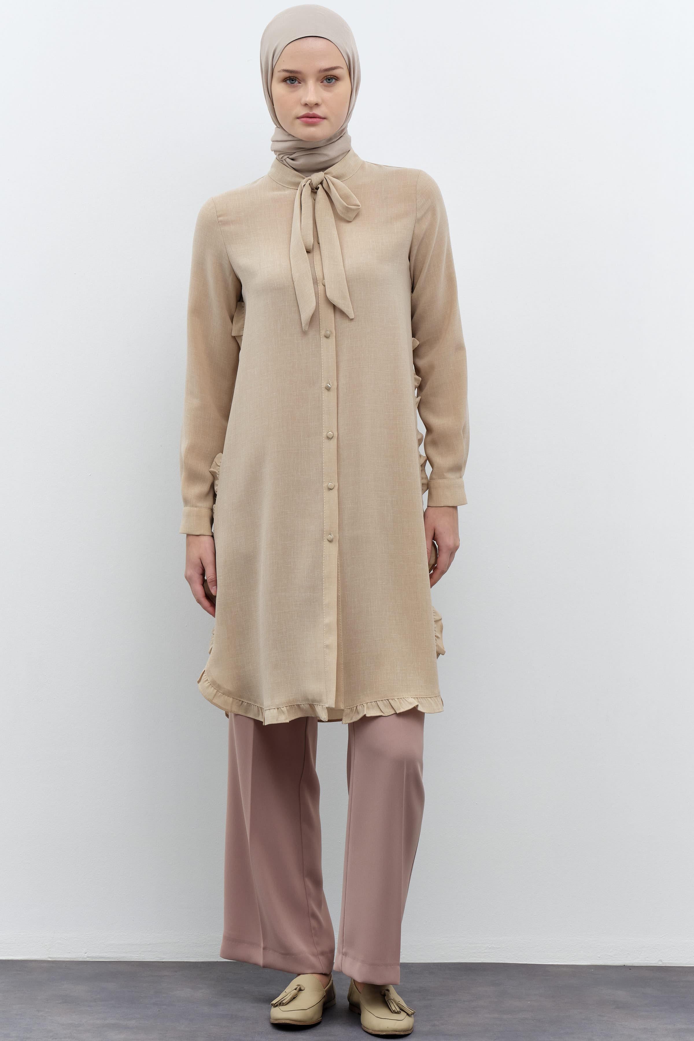 Kravat Yakalı Fırfır Detaylı Tunik - Bej