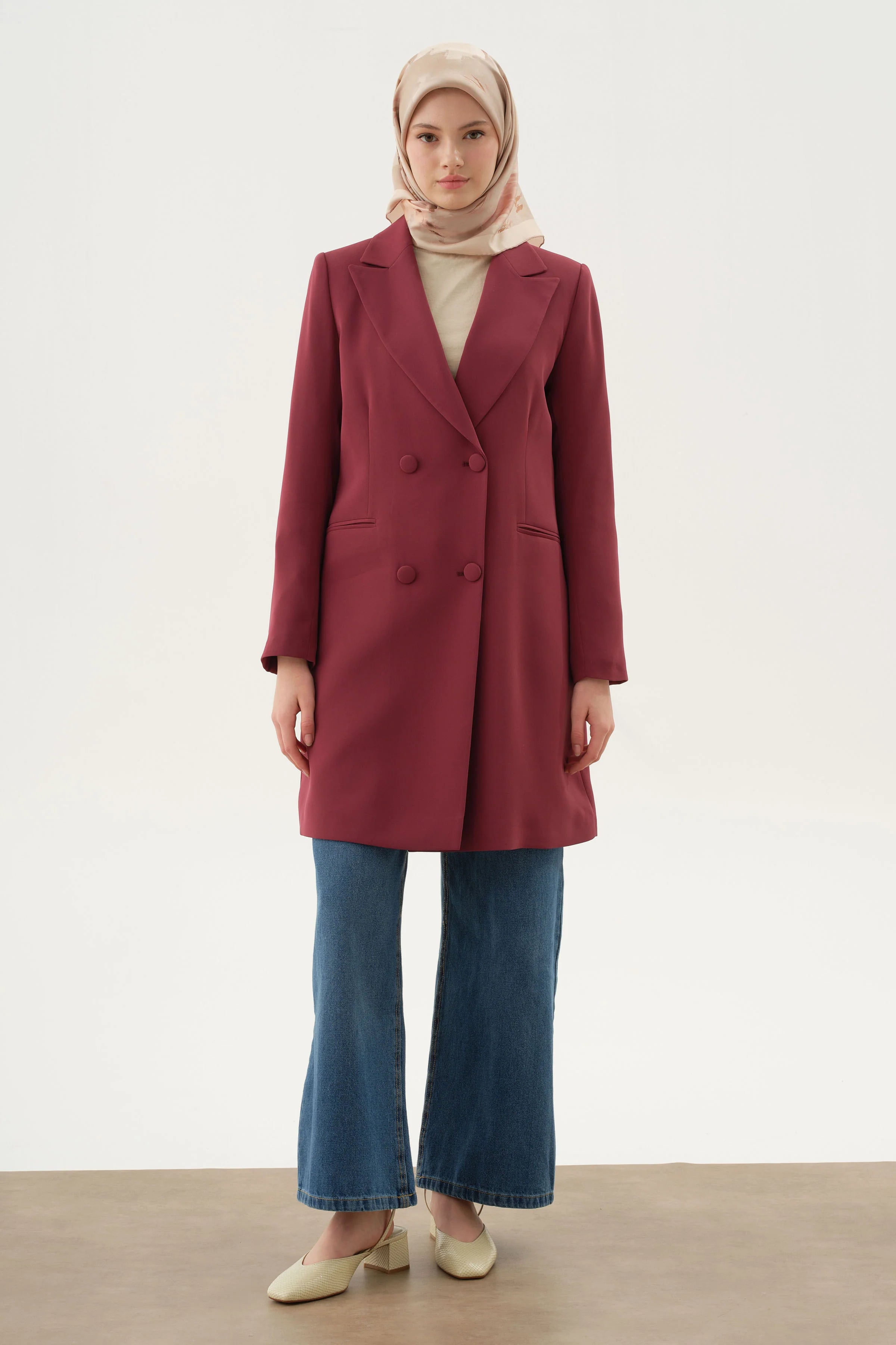 Kruvaze Düğmeli Uzun Basic Ceket - Mürdüm