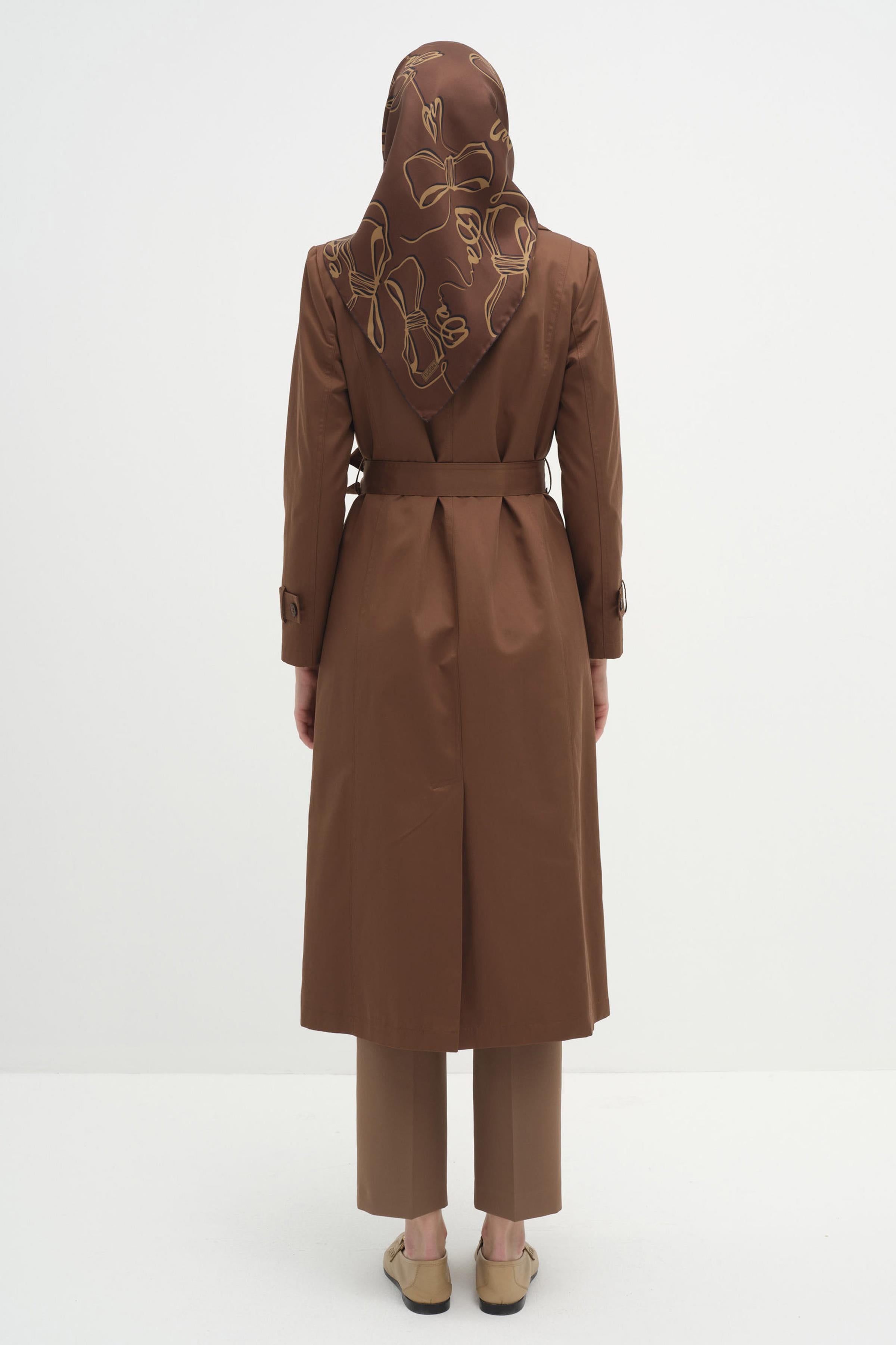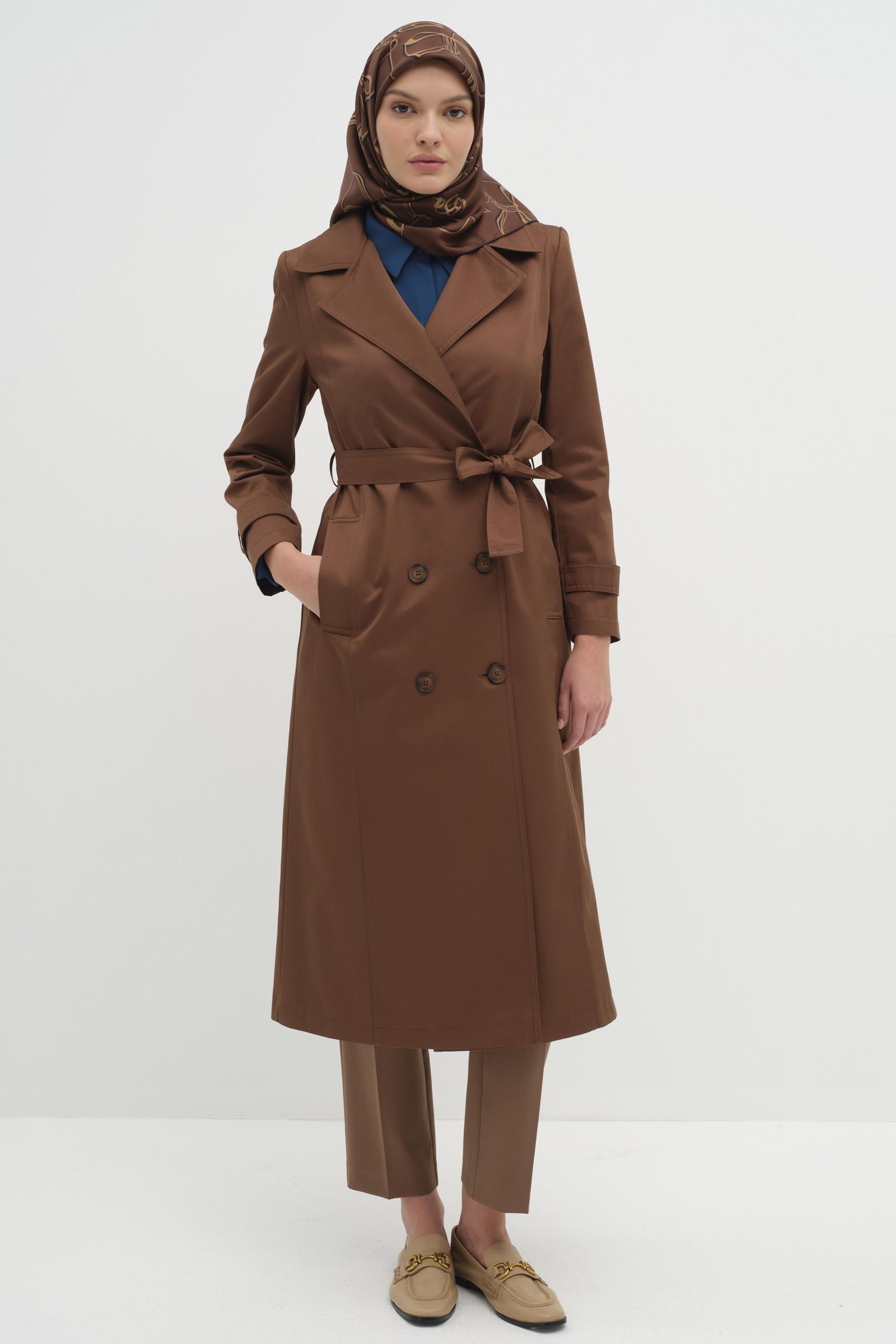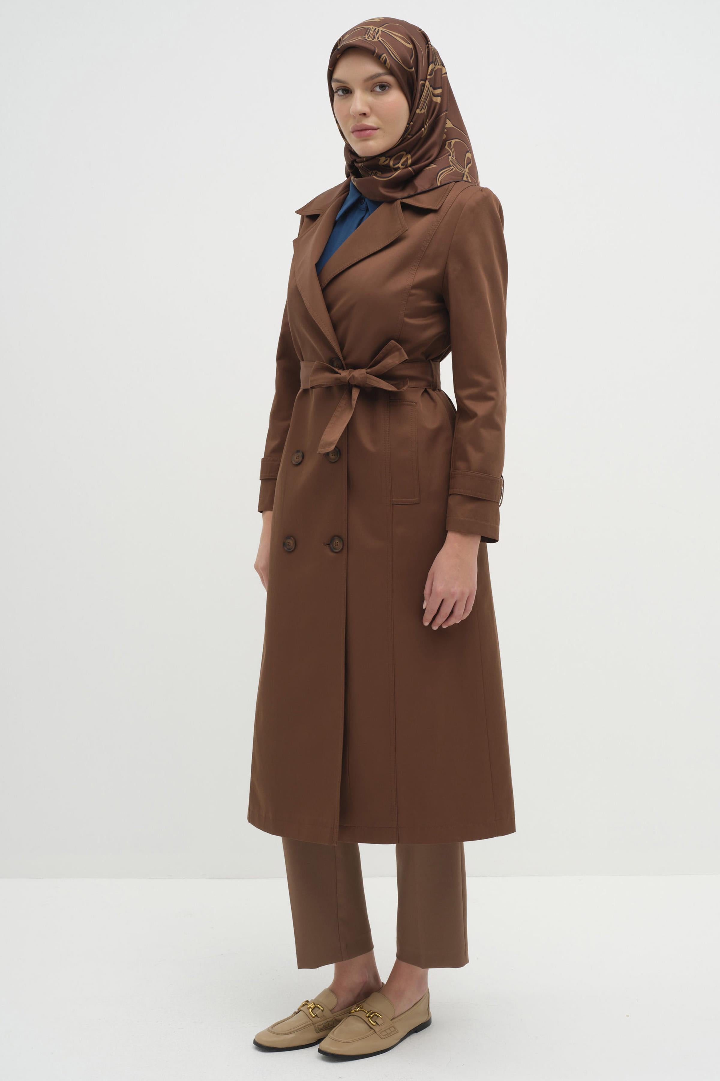 Kruvaze Yaka Düğme Detaylı Trenç - Kahve