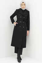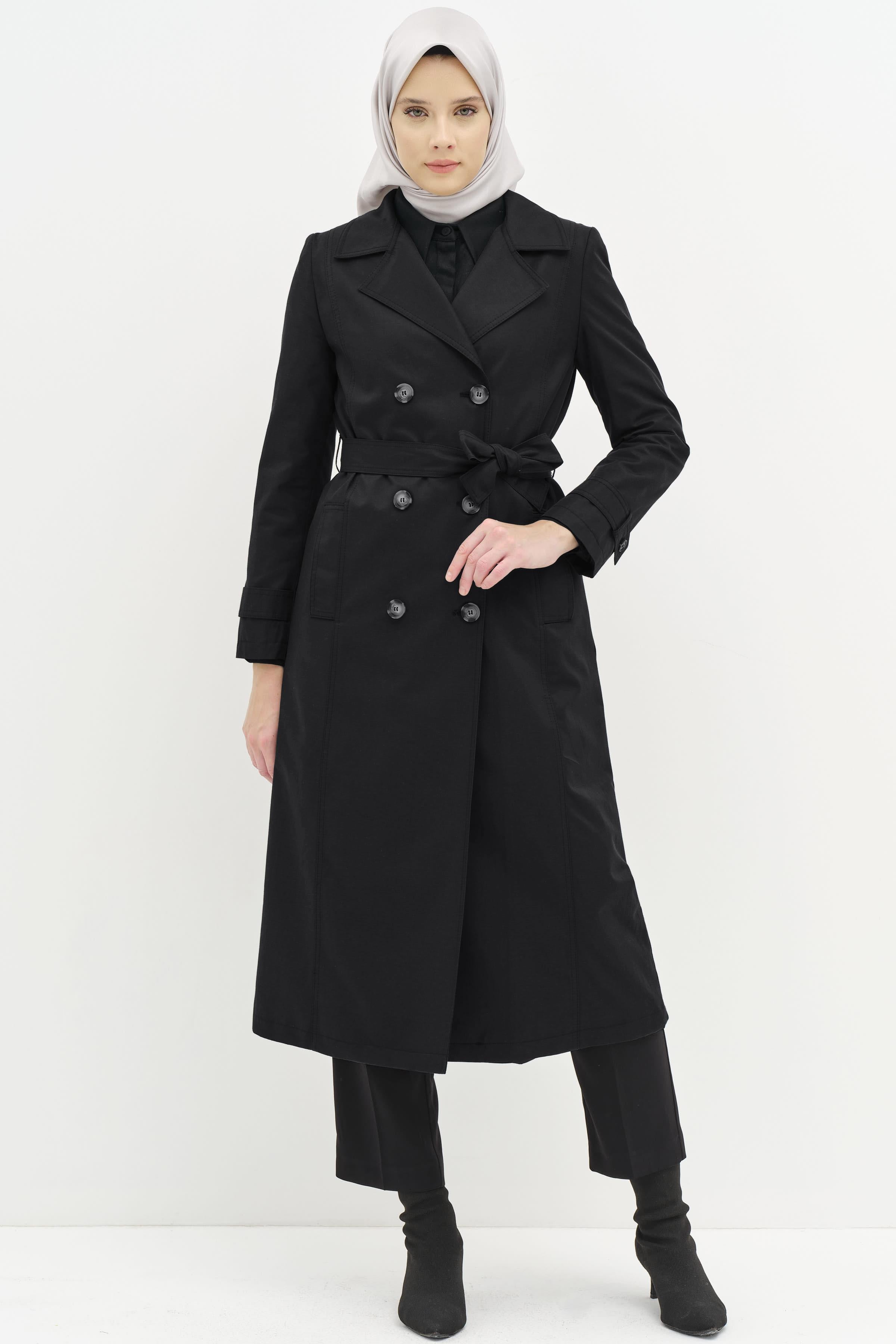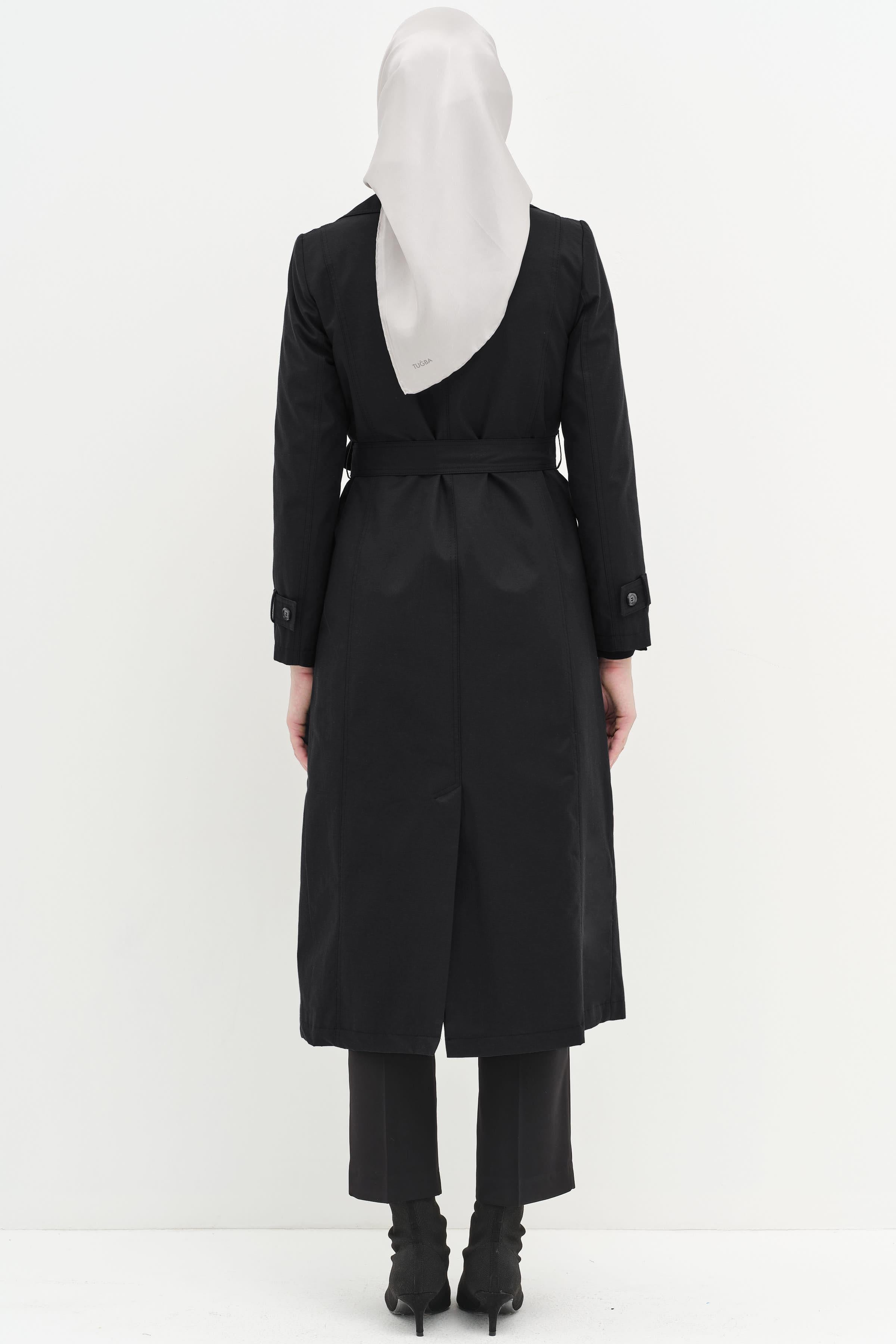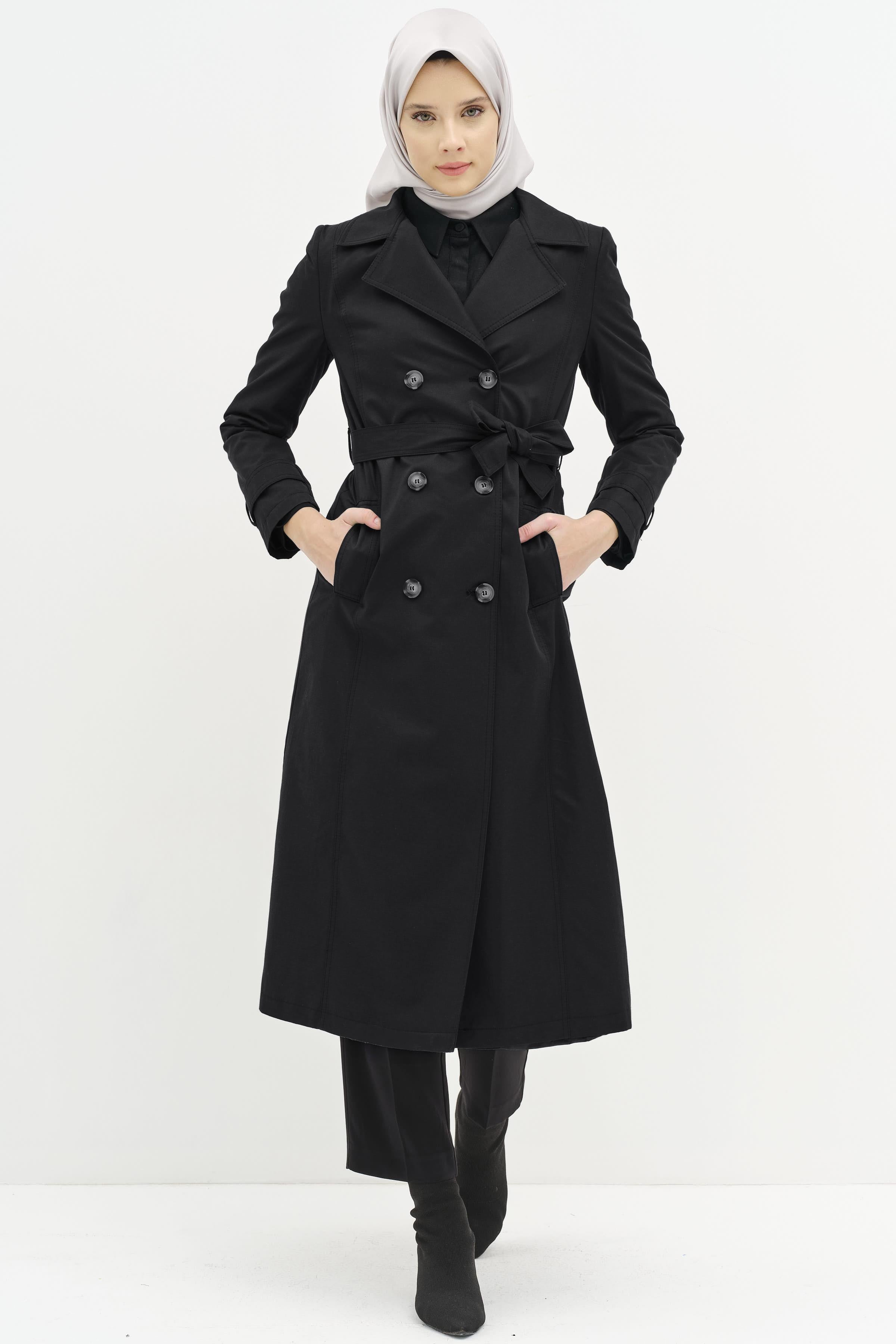 Kruvaze Yaka Düğme Detaylı Trenç - Siyah