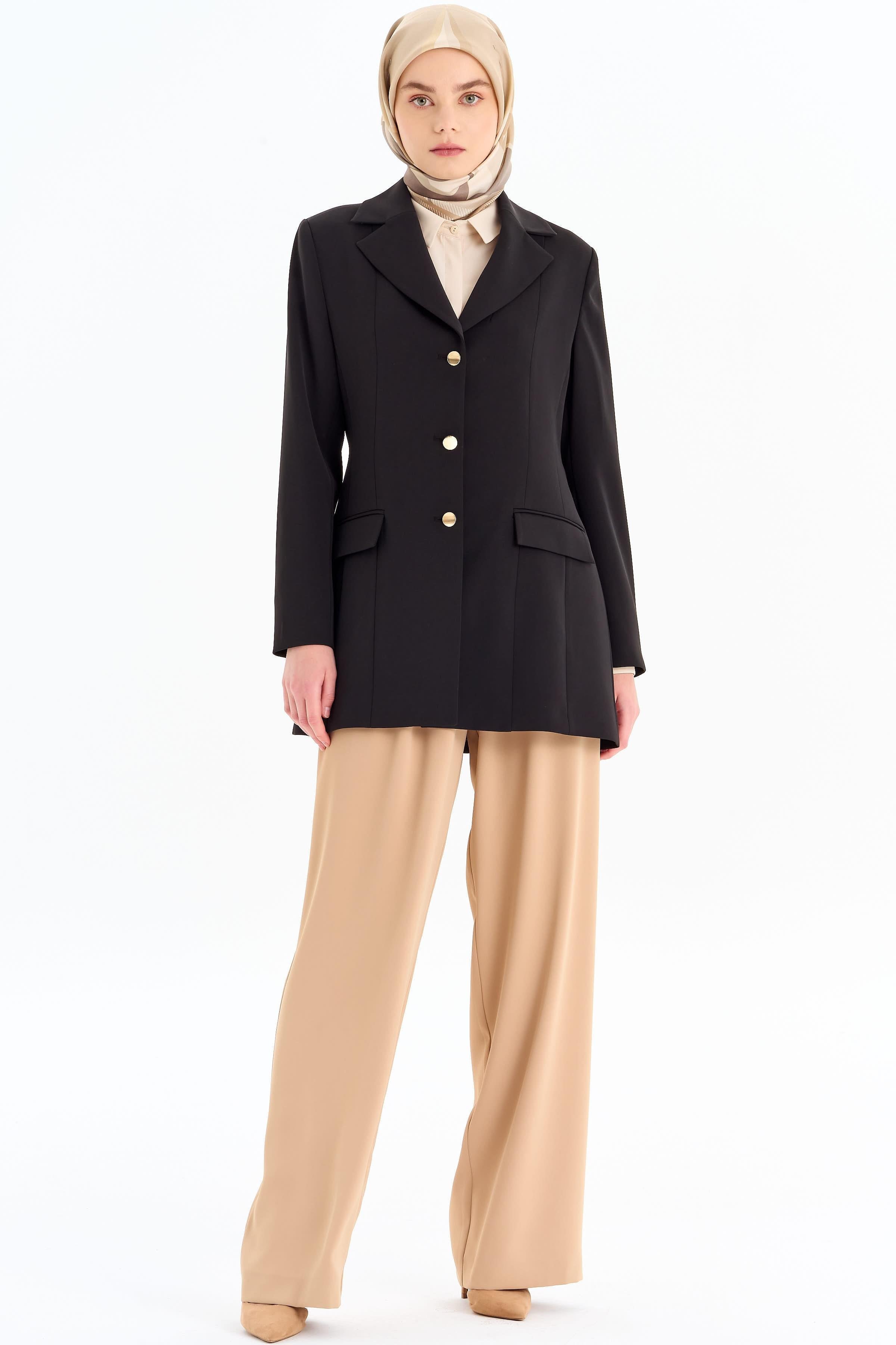 Kuplu blazer ceket, şıklığı ve modernliği bir arada sunan özel bir tasarıma sahiptir. Omuzlardaki kupa detayıyla dikkat çekerken, klasik blazer kesimiyle de profesyonel bir görünüm sağlar